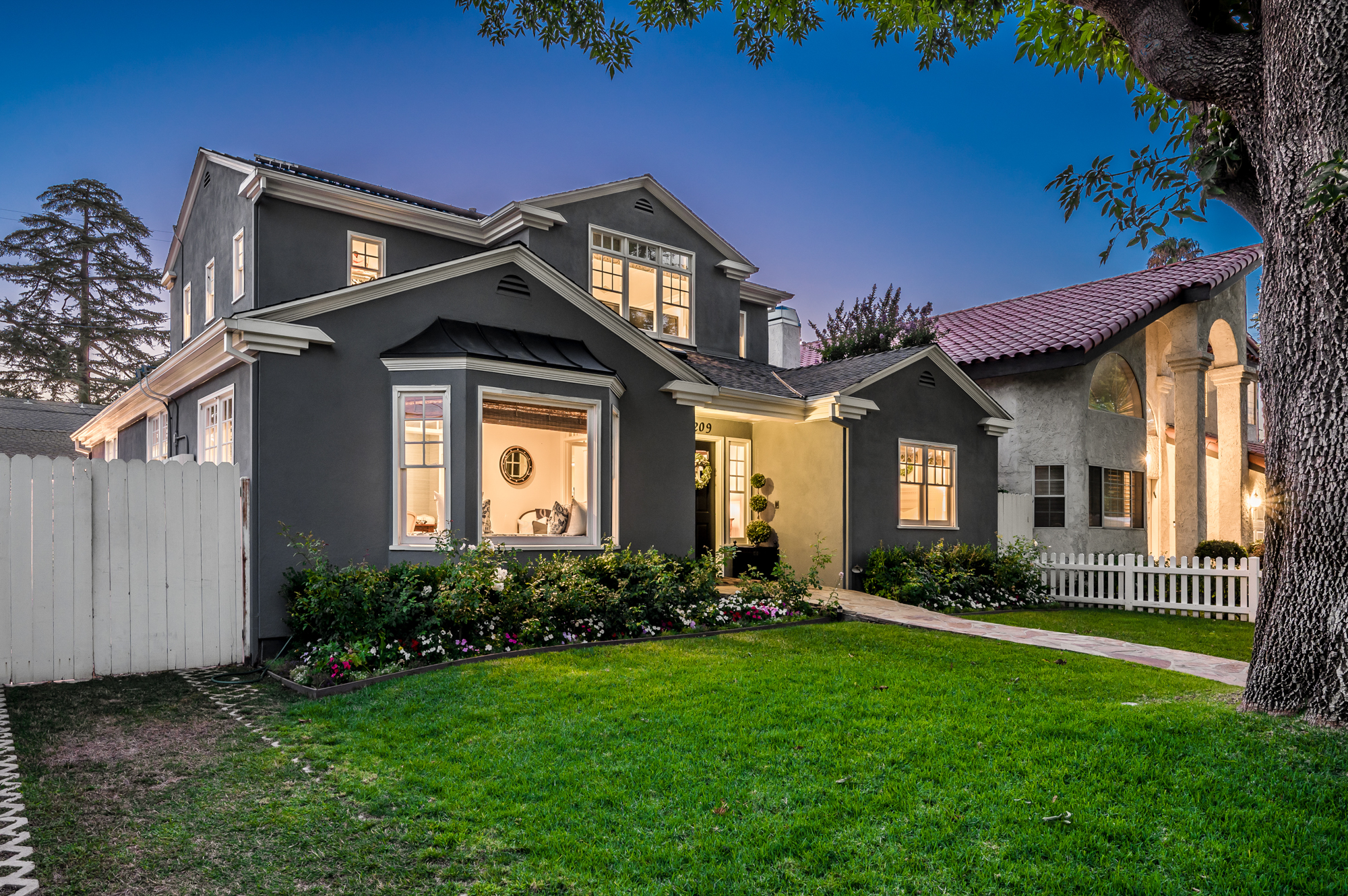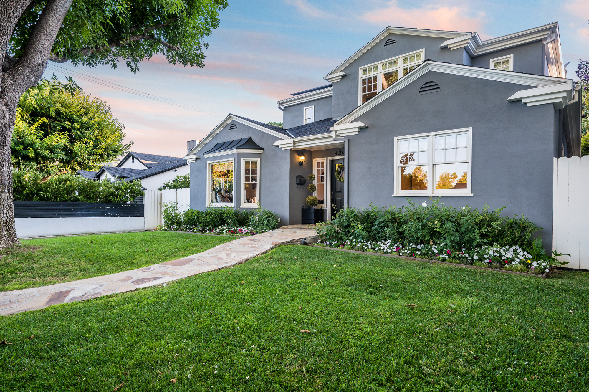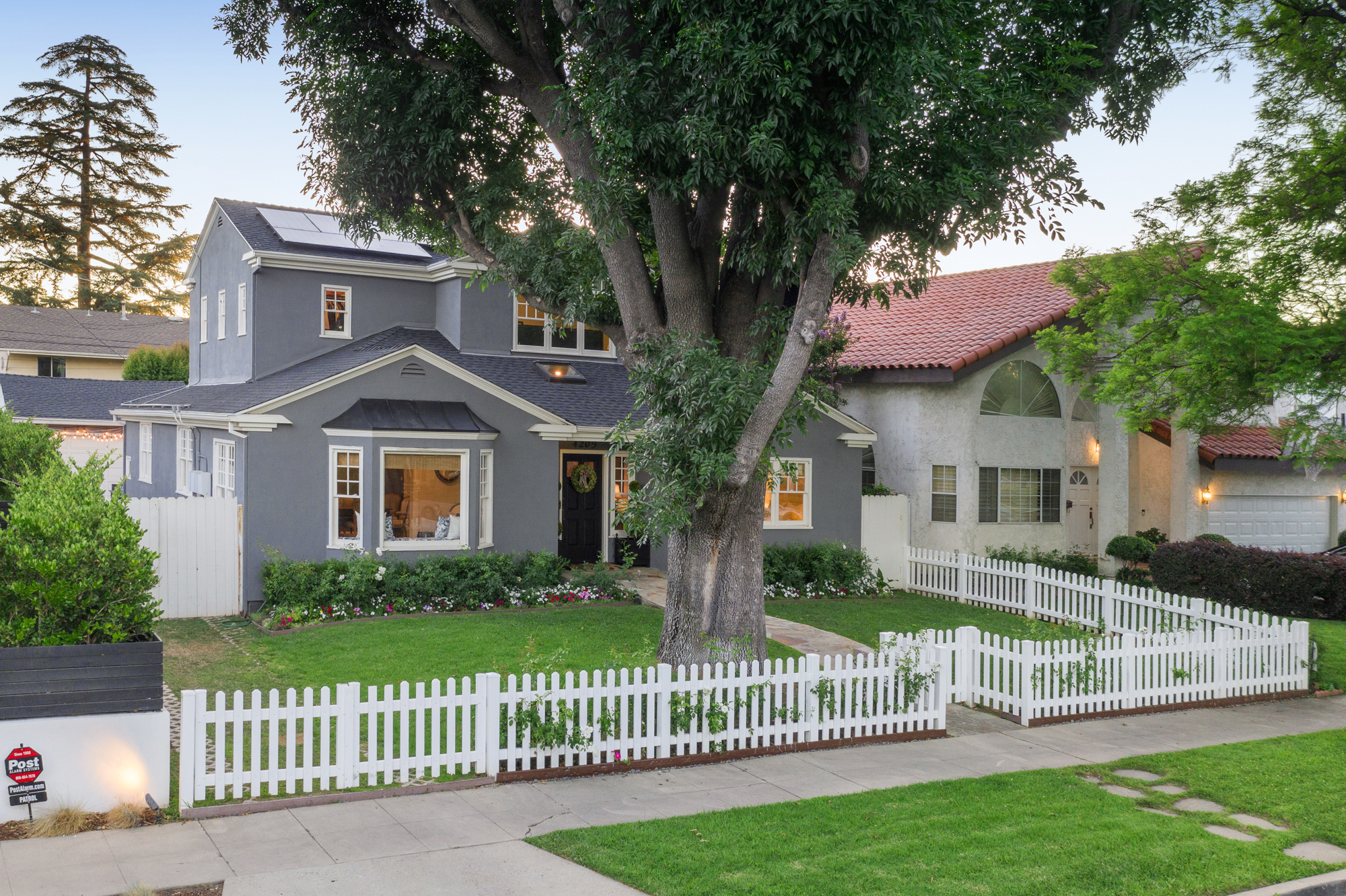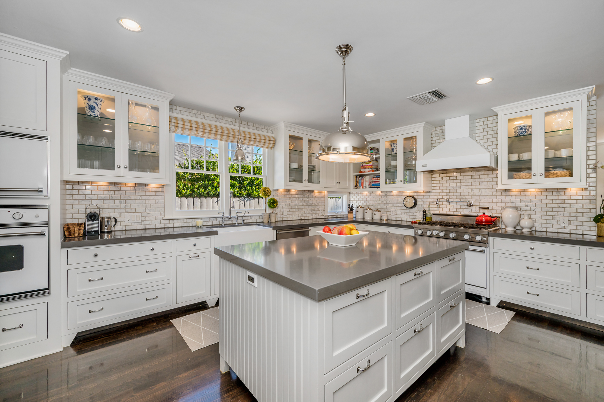 Set behind a charming picket fence on a tree lined street in the highly desirable Footbridge Square pocket of Studio City is this beautiful fully updated 5 bedroom traditional home in Carpenter School District. Down the walkway and past the spacious well manicured front lawn, enter into the light and bright formal entry with skylight. The living room is complete with a large bay window bench seat. Rich wood floors flow into the grand dining room with designer wall paper and built in cabinetry. The gourmet chef’s kitchen features Viking and Miele appliances, large center island, custom tile backsplash, and has a breakfast bar big enough for 5! Perfect for entertaining, the kitchen opens to the family room with floor to ceiling built-ins and double french doors to the backyard. The downstairs bedrooms are well sized and ideally situated as a guest room and playroom, home office, or more. Upstairs, the master retreat is the epitome of luxury with high ceilings, two walk in closets, and a bath with dual sink vanity and large shower with multiple shower heads and bench. The two additional bedrooms are well appointed and share a bath with dual sink vanity and large tub. The backyard offers the best of Southern California living, with ample space for dining, lounging, and playing. Additional features include custom drapery throughout, skylights, SOLAR PANELS, whole house filtration system, and so much more. This home is sure to provide years of happy memories to its new owners.