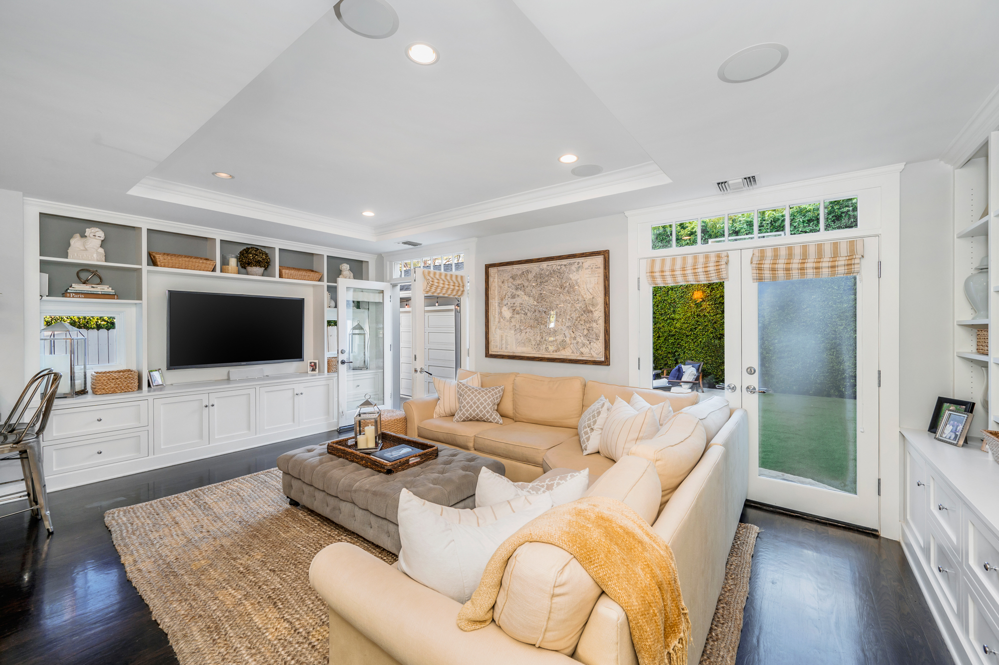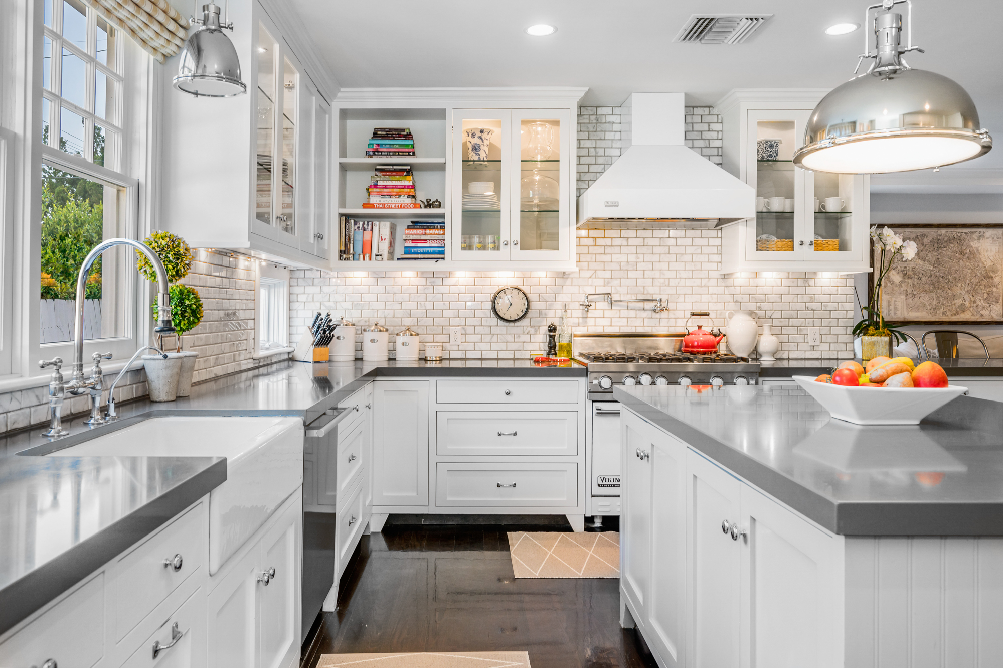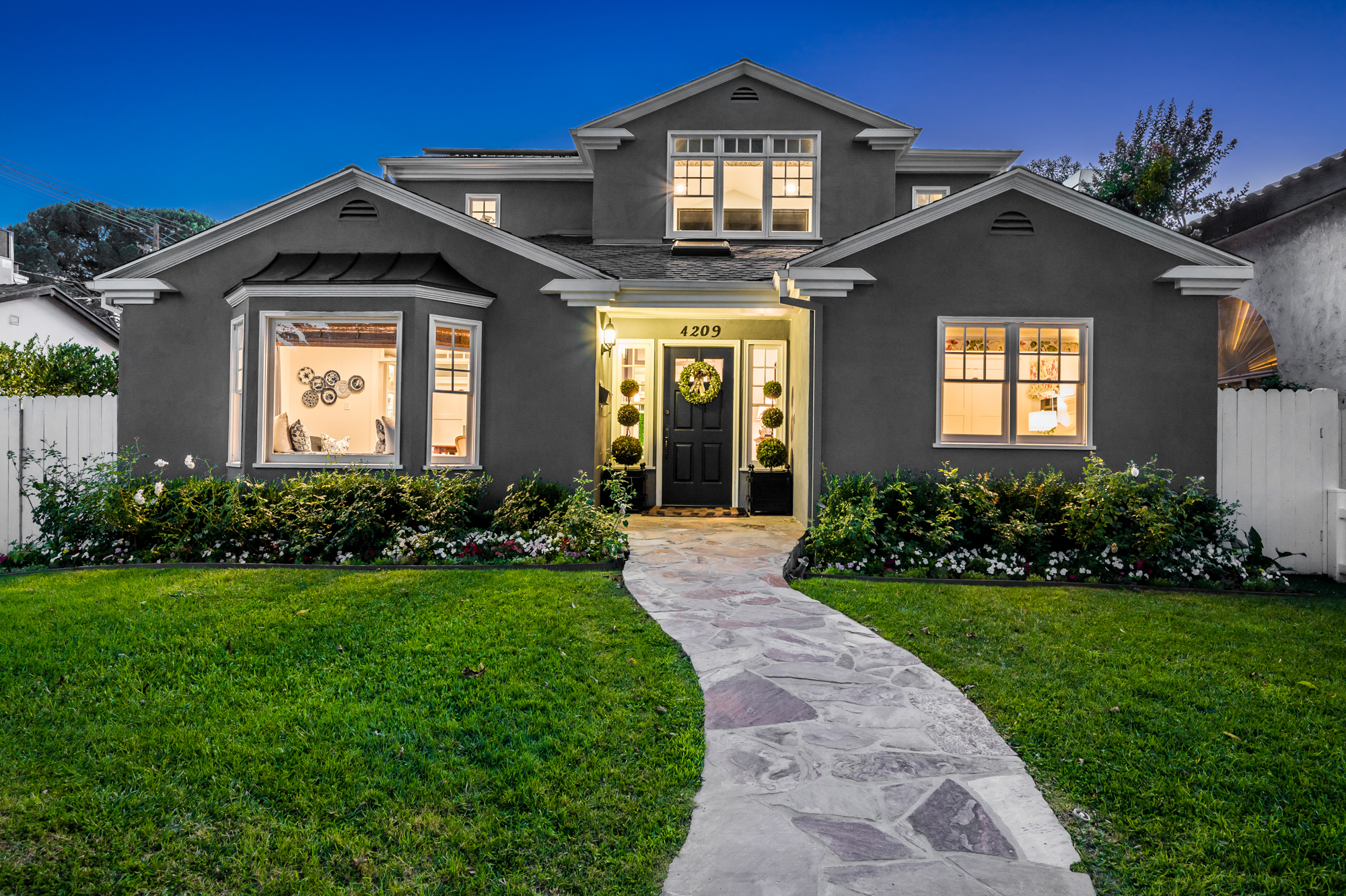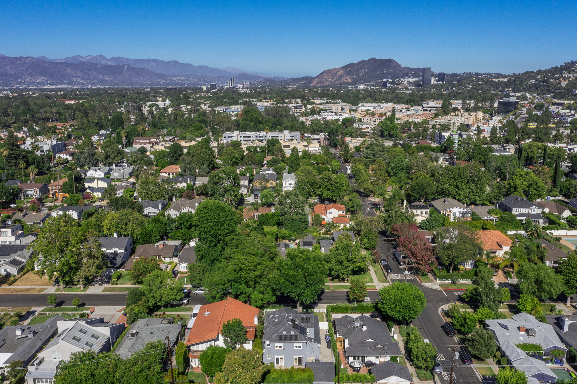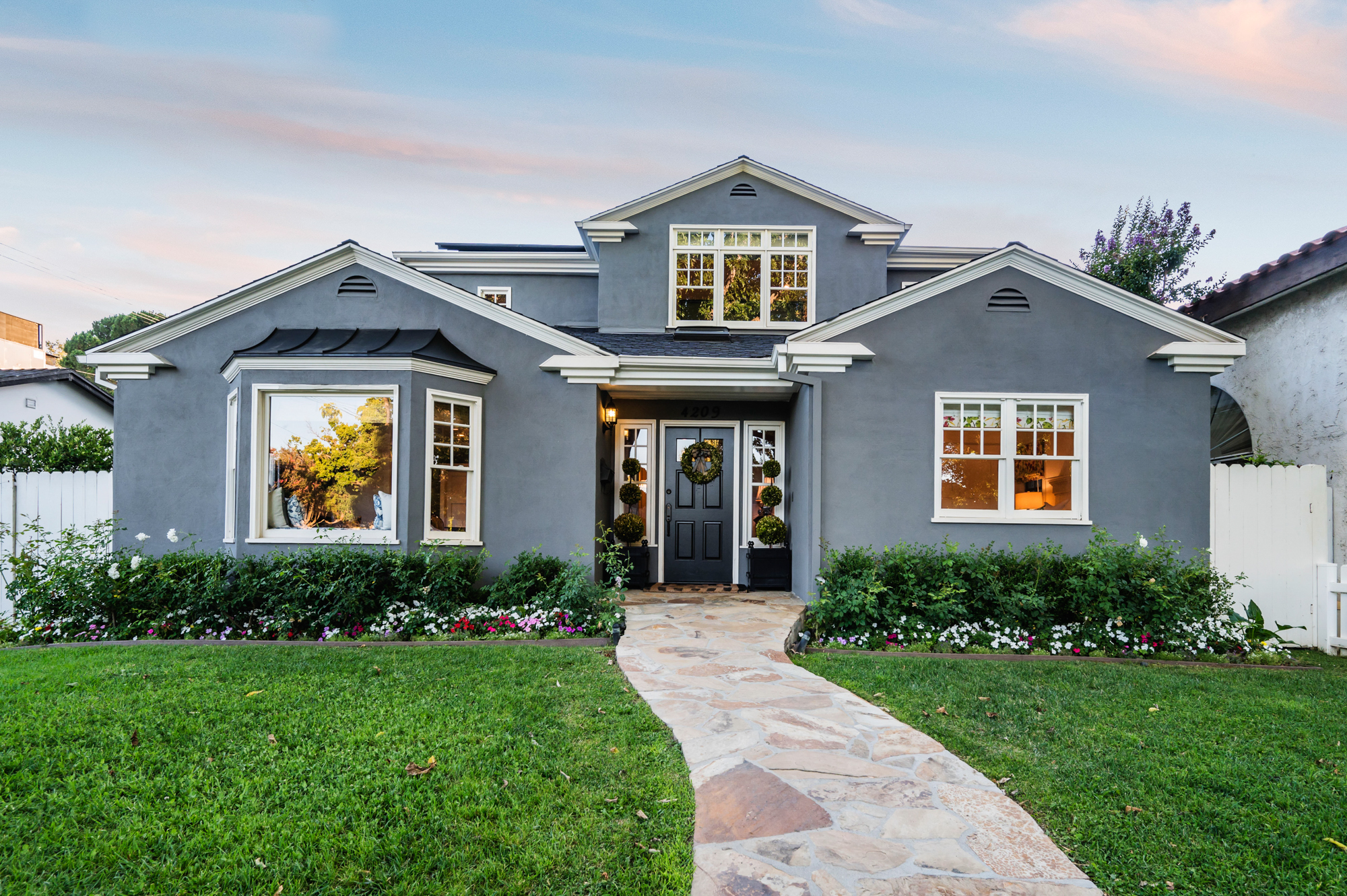 Set behind a charming picket fence on a tree lined street in the highly desirable Footbridge Square pocket of Studio City is this beautiful fully updated 5 bedroom traditional home in Carpenter School District. Down the walkway and past the spacious well manicured front lawn, enter into the light and bright formal entry with skylight. The living room is complete with a large bay window bench seat. Rich wood floors flow into the grand dining room with designer wall paper and built in cabinetry. The gourmet chef’s kitchen features Viking and Miele appliances, large center island, custom tile backsplash, and has a breakfast bar big enough for 5! Perfect for entertaining, the kitchen opens to the family room with floor to ceiling built-ins and double french doors to the backyard. The downstairs bedrooms are well sized and ideally situated as a guest room and playroom, home office, or more. Upstairs, the master retreat is the epitome of luxury with high ceilings, two walk in closets, and a bath with dual sink vanity and large shower with multiple shower heads and bench. The two additional bedrooms are well appointed and share a bath with dual sink vanity and large tub. The backyard offers the best of Southern California living, with ample space for dining, lounging, and playing. Additional features include custom drapery throughout, skylights, SOLAR PANELS, whole house filtration system, and so much more. This home is sure to provide years of happy memories to its new owners.