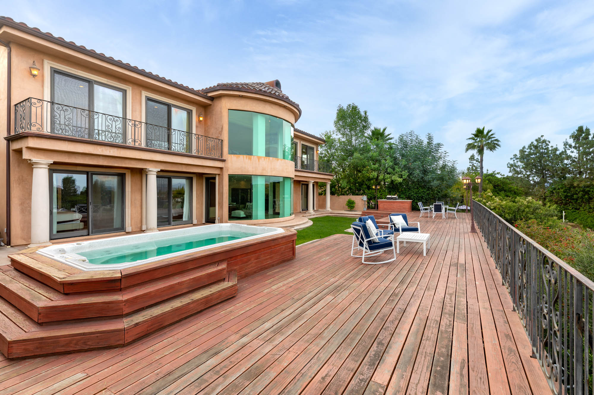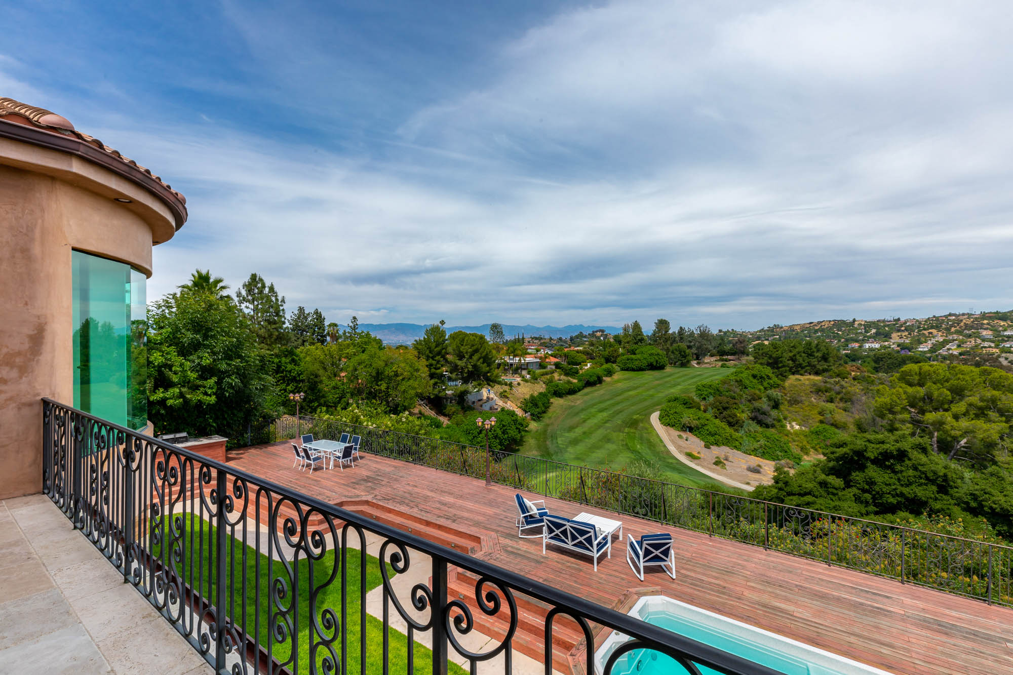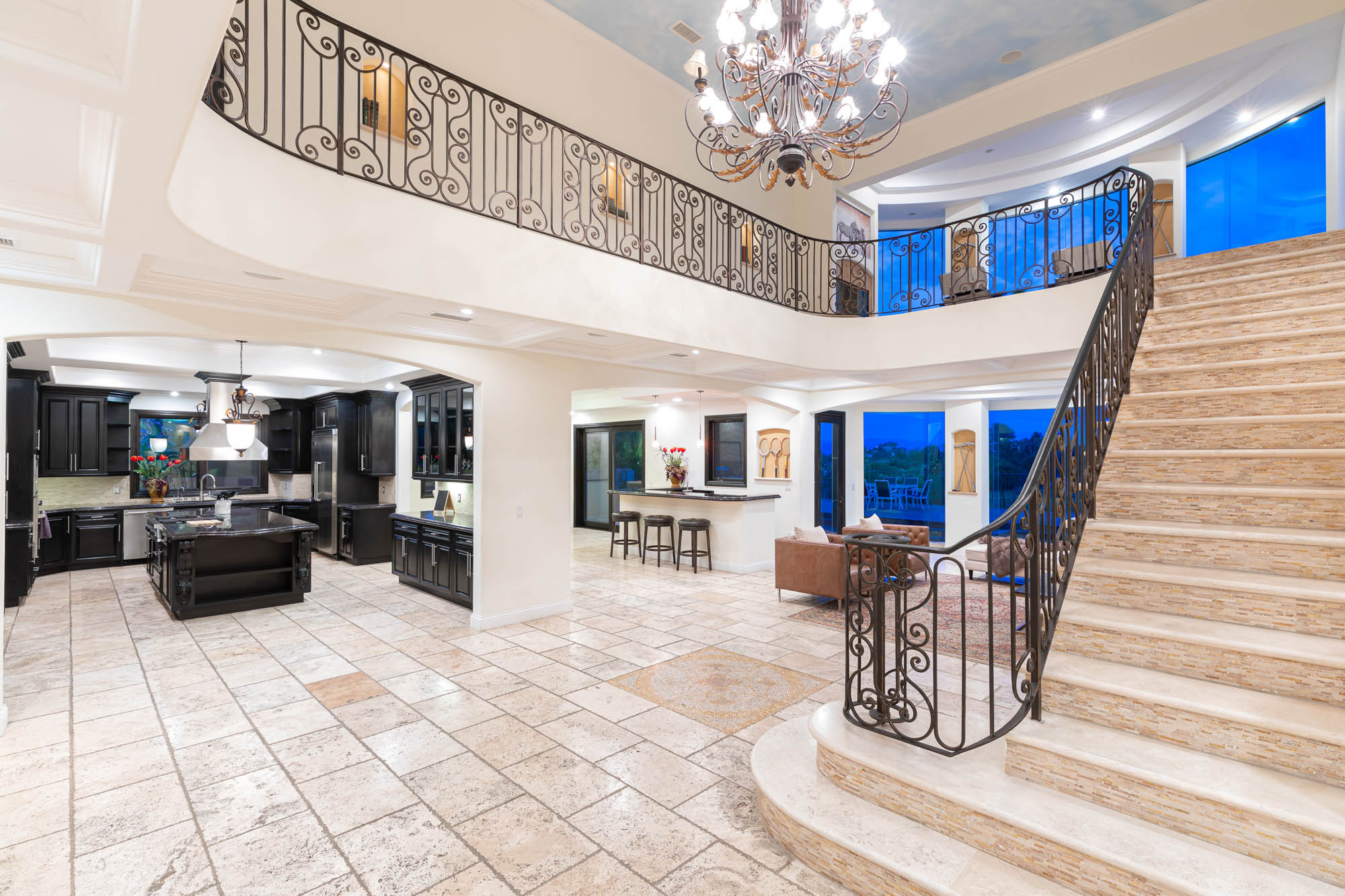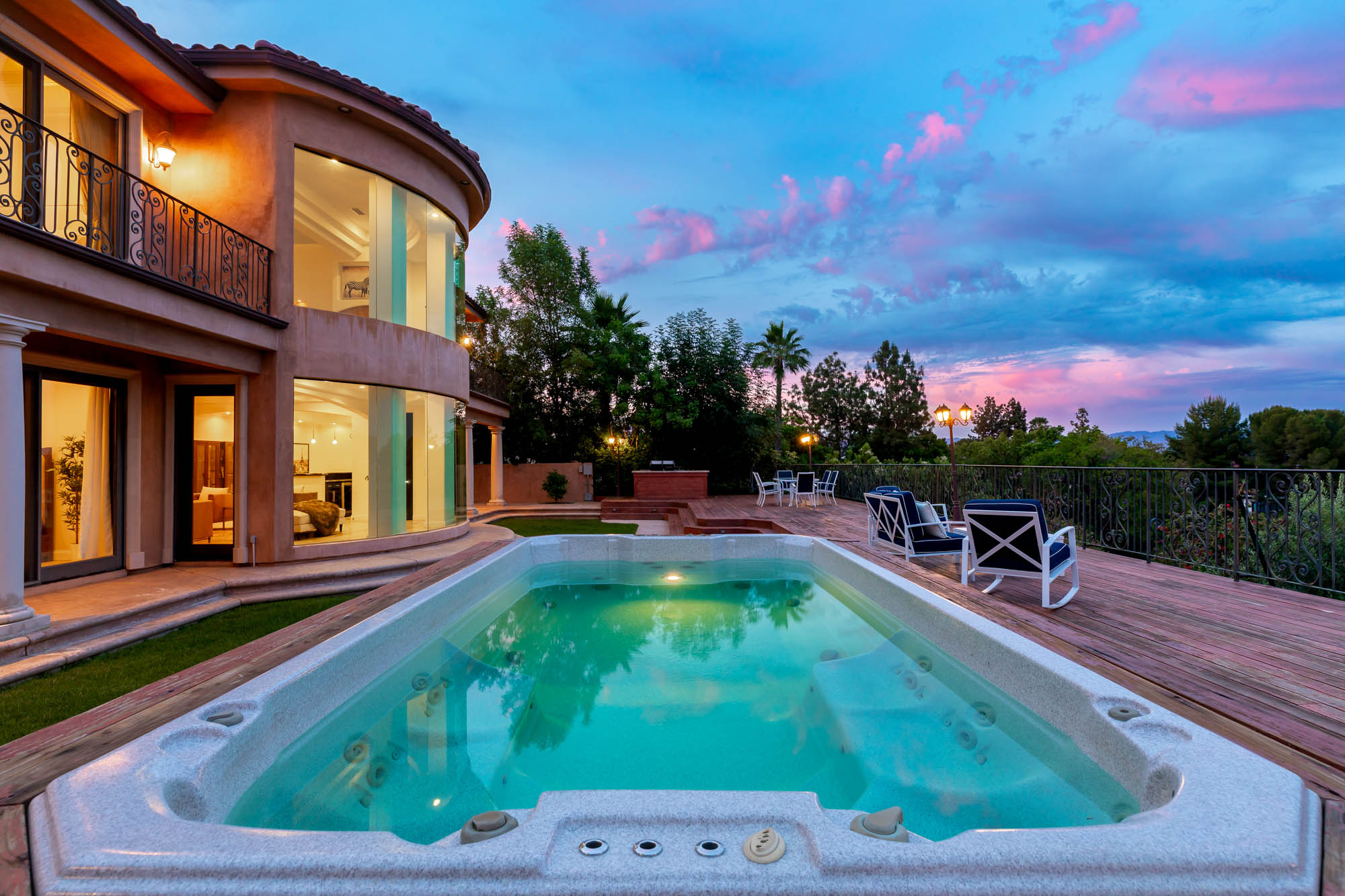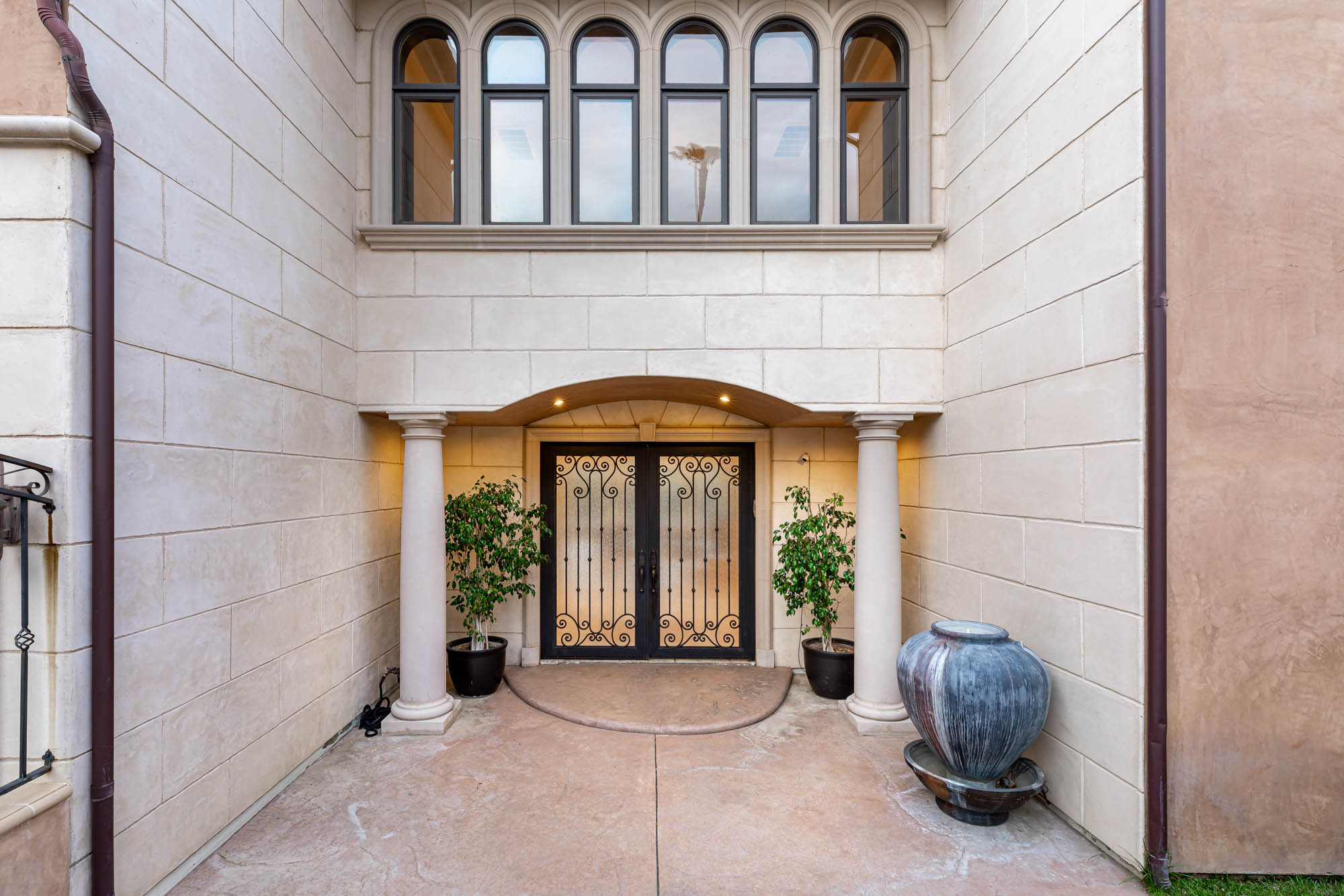 Tranquil & majestic gated estate situated South of the Blvd with panoramic valley views! Double doors lead to a spacious formal entry with high coffered ceilings, stone flooring, chandelier, custom wrought iron staircase, and the gorgeous interior straight ahead. The main level provides a perfect open flow from the kitchen, to the living room with floor to ceiling windows, and to the spacious dining room with a wet bar. The gourmet kitchen showcases rich custom cabinetry, professional-grade appliances & oversized chefs island. The family/media room will be the ultimate space for movie nights, with a cozy fireplace, wet bar, and attached bath. The main level also includes two spacious bedrooms. The second level landing serves as an additional family room that offers a fireplace and showcases the most breathtaking views. 3 generously-sized suites upstairs include a luxurious master retreat with a separate sitting room. The master also includes a private balcony, dual walk-in closets, and spa-like bath with double vanity, oversized glass shower & spa tub. Enjoy the best of outdoor entertaining in the private backyard which overlooks a fairway of the Braemar Country Club golf course, and features a BBQ kitchenette, grass space, spa, and an expansive wood deck ideal for lounging and al fresco dining. Additional features include attached 3-car garage, large upstairs laundry room, and so much more. This special property is truly one of a kind, so close to all the city has to offer, yet cloistered in your own private sanctuary.