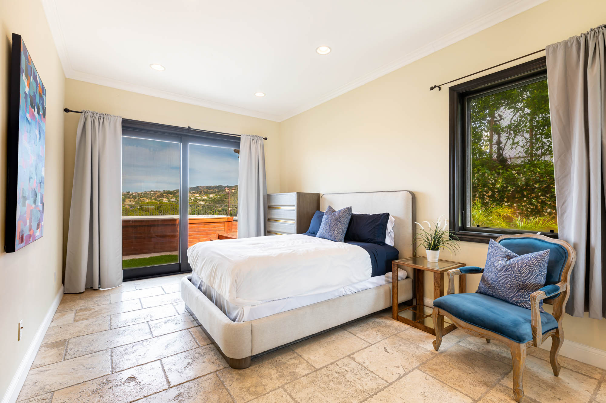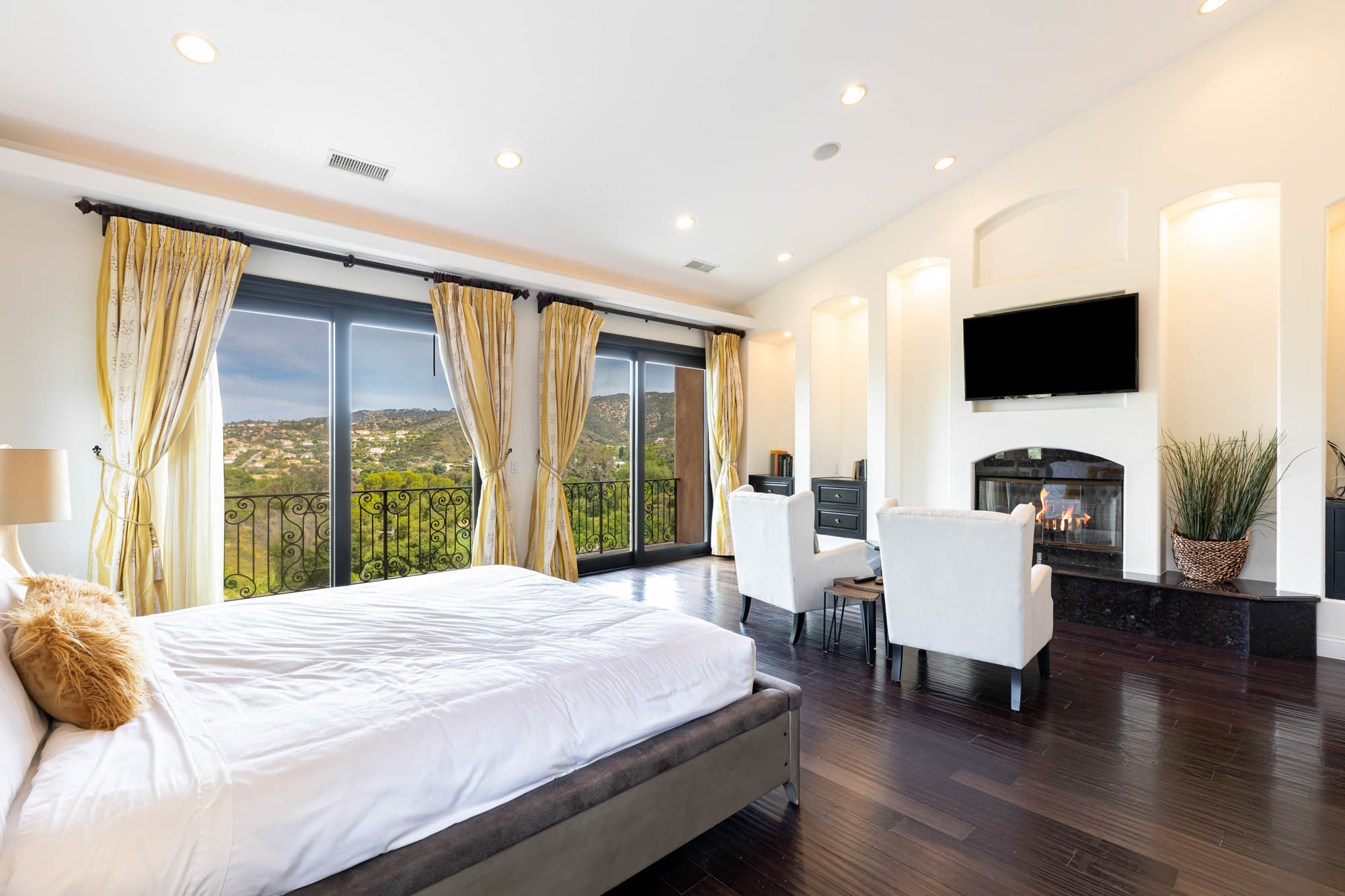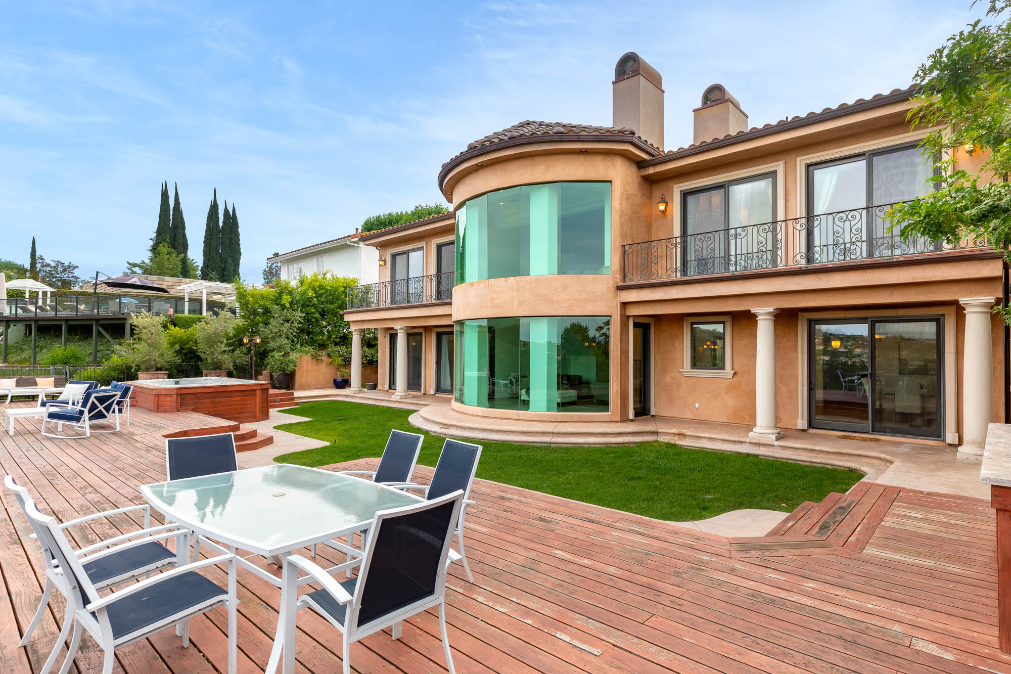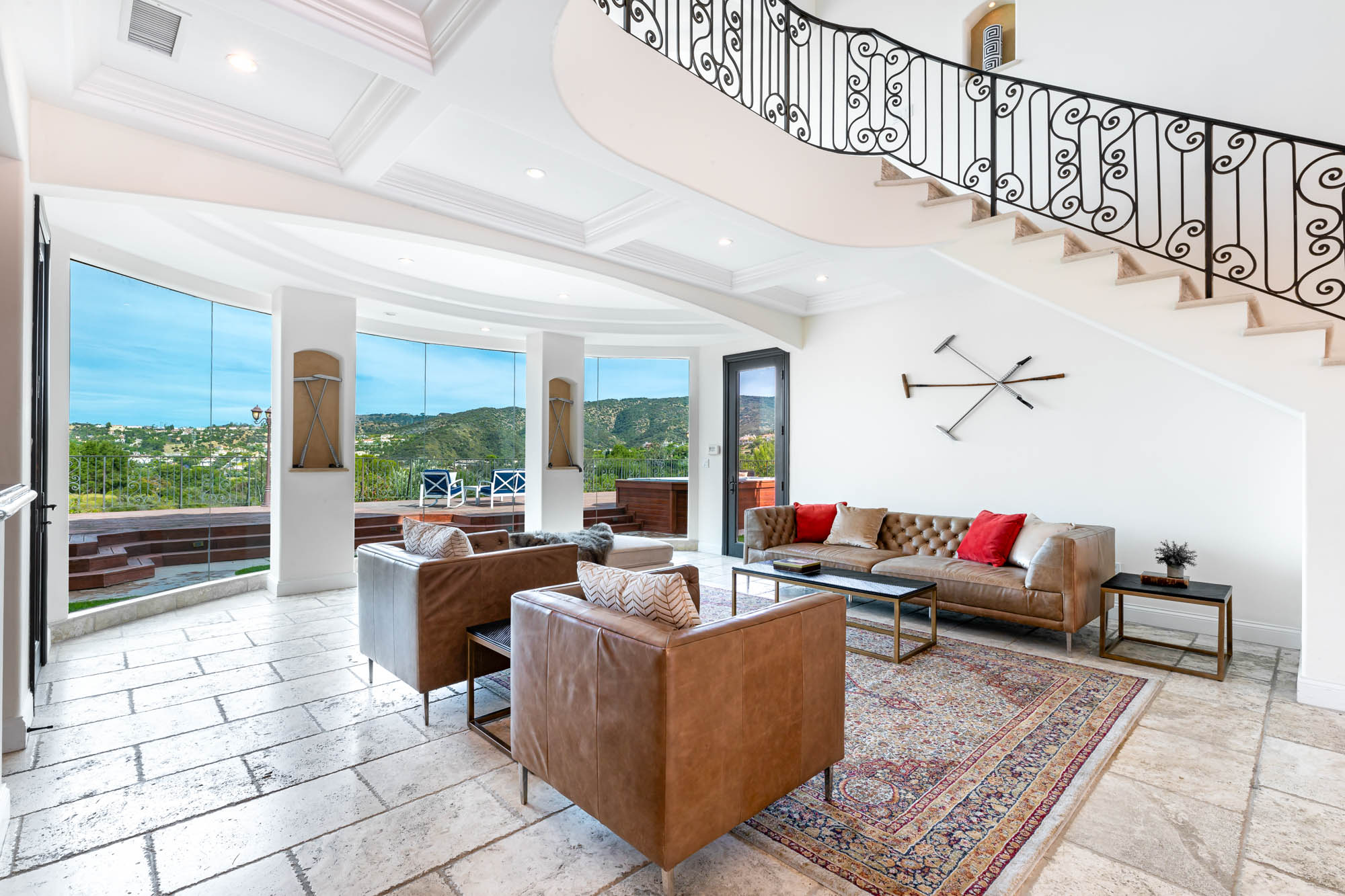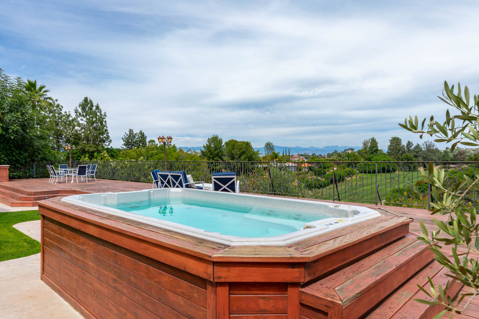 Tranquil & majestic gated estate situated South of the Blvd with panoramic valley views! Double doors lead to a spacious formal entry with high coffered ceilings, stone flooring, chandelier, custom wrought iron staircase, and the gorgeous interior straight ahead. The main level provides a perfect open flow from the kitchen, to the living room with floor to ceiling windows, and to the spacious dining room with a wet bar. The gourmet kitchen showcases rich custom cabinetry, professional-grade appliances & oversized chefs island. The family/media room will be the ultimate space for movie nights, with a cozy fireplace, wet bar, and attached bath. The main level also includes two spacious bedrooms. The second level landing serves as an additional family room that offers a fireplace and showcases the most breathtaking views. 3 generously-sized suites upstairs include a luxurious master retreat with a separate sitting room. The master also includes a private balcony, dual walk-in closets, and spa-like bath with double vanity, oversized glass shower & spa tub. Enjoy the best of outdoor entertaining in the private backyard which overlooks a fairway of the Braemar Country Club golf course, and features a BBQ kitchenette, grass space, spa, and an expansive wood deck ideal for lounging and al fresco dining. Additional features include attached 3-car garage, large upstairs laundry room, and so much more. This special property is truly one of a kind, so close to all the city has to offer, yet cloistered in your own private sanctuary.