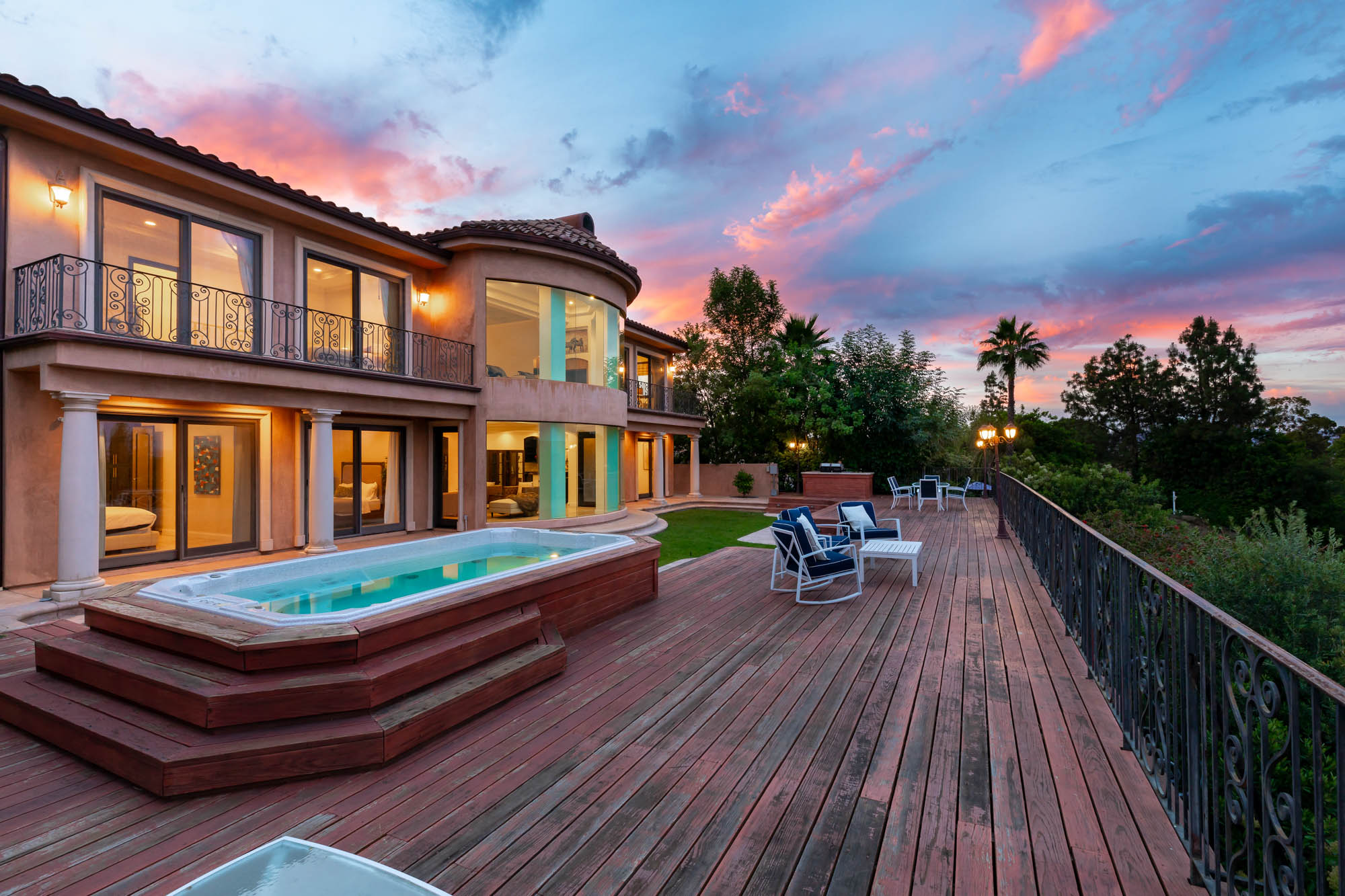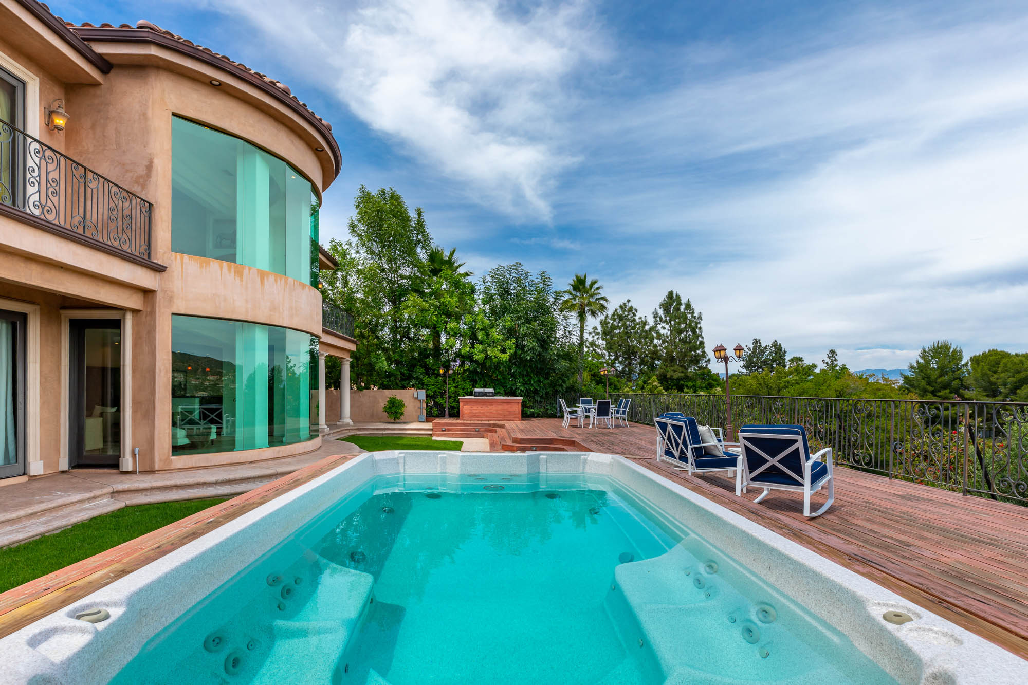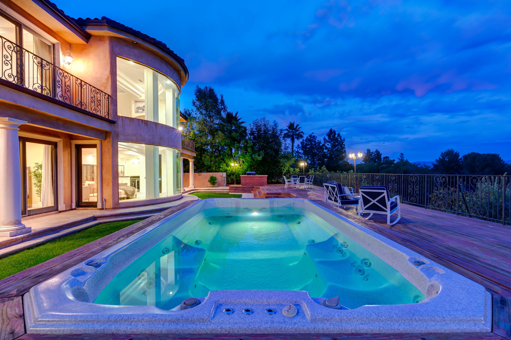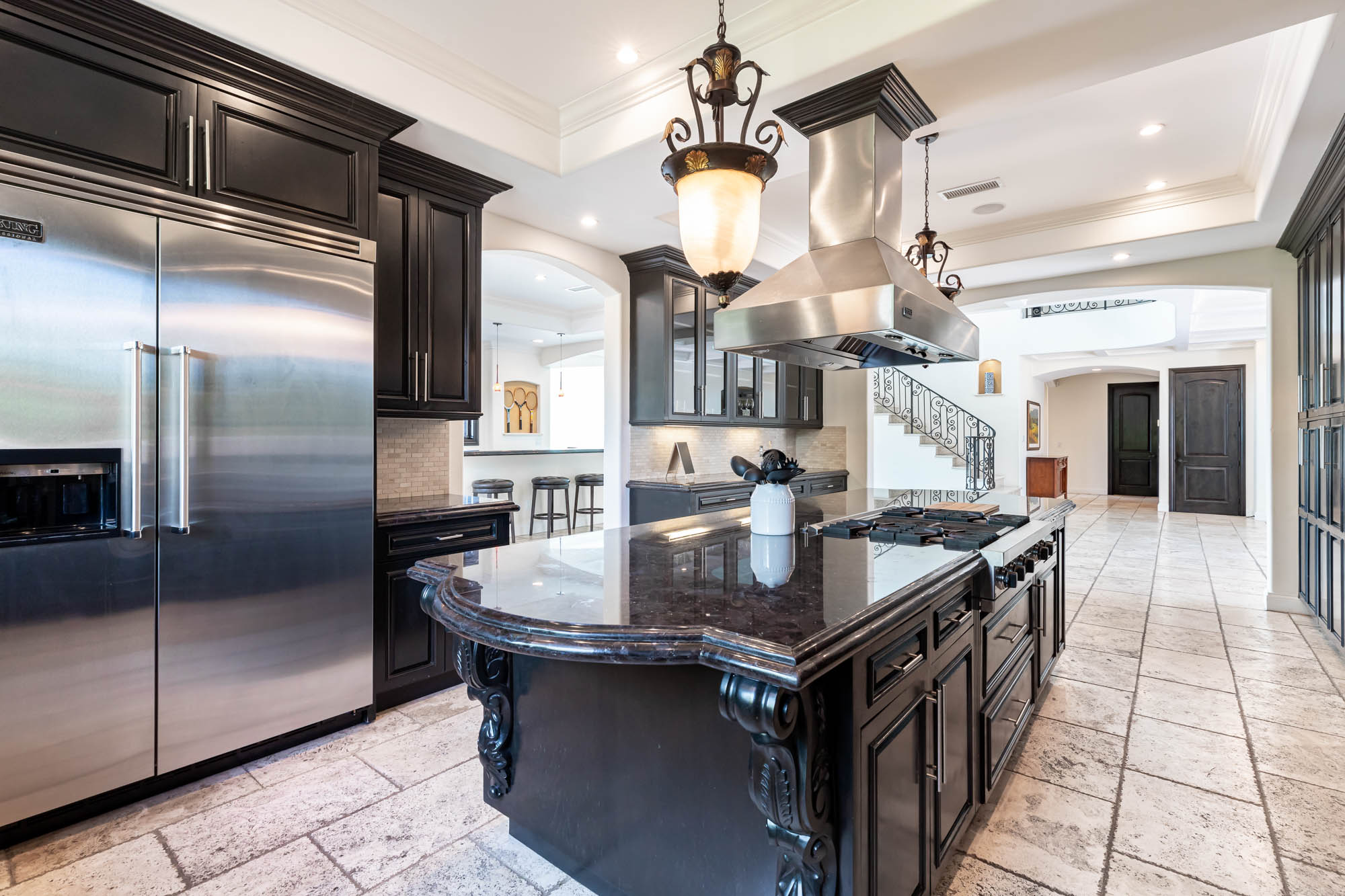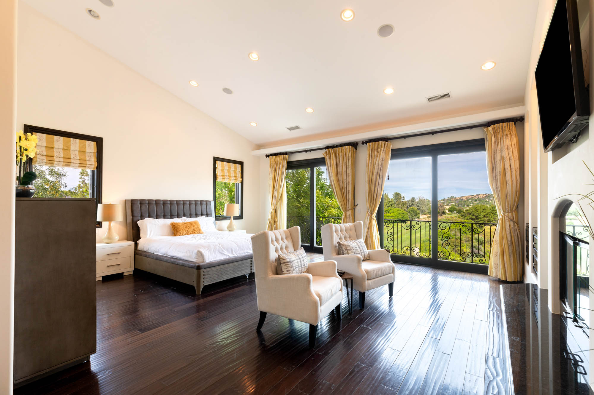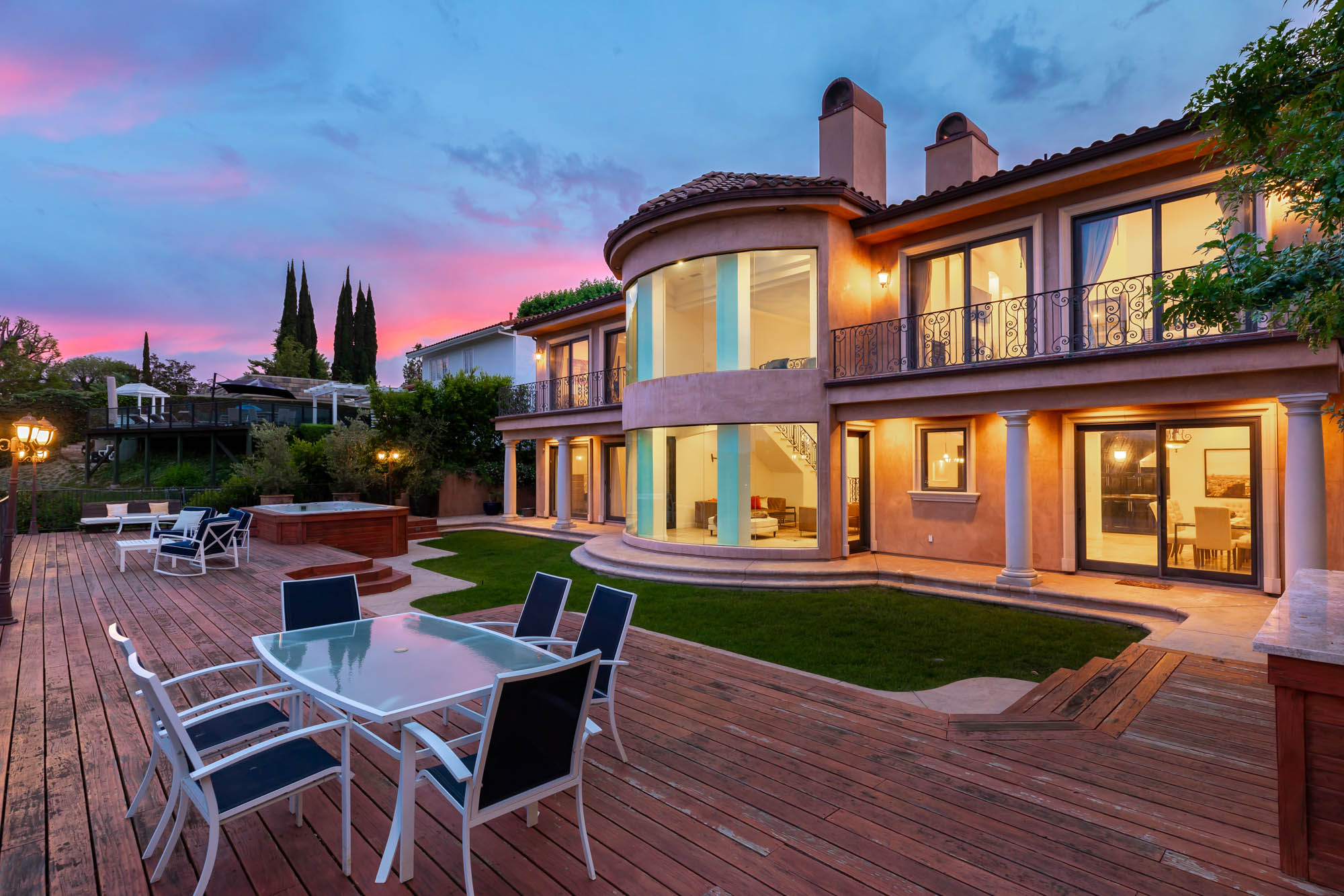 Tranquil & majestic gated estate situated South of the Blvd with panoramic valley views! Double doors lead to a spacious formal entry with high coffered ceilings, stone flooring, chandelier, custom wrought iron staircase, and the gorgeous interior straight ahead. The main level provides a perfect open flow from the kitchen, to the living room with floor to ceiling windows, and to the spacious dining room with a wet bar. The gourmet kitchen showcases rich custom cabinetry, professional-grade appliances & oversized chefs island. The family/media room will be the ultimate space for movie nights, with a cozy fireplace, wet bar, and attached bath. The main level also includes two spacious bedrooms. The second level landing serves as an additional family room that offers a fireplace and showcases the most breathtaking views. 3 generously-sized suites upstairs include a luxurious master retreat with a separate sitting room. The master also includes a private balcony, dual walk-in closets, and spa-like bath with double vanity, oversized glass shower & spa tub. Enjoy the best of outdoor entertaining in the private backyard which overlooks a fairway of the Braemar Country Club golf course, and features a BBQ kitchenette, grass space, spa, and an expansive wood deck ideal for lounging and al fresco dining. Additional features include attached 3-car garage, large upstairs laundry room, and so much more. This special property is truly one of a kind, so close to all the city has to offer, yet cloistered in your own private sanctuary.