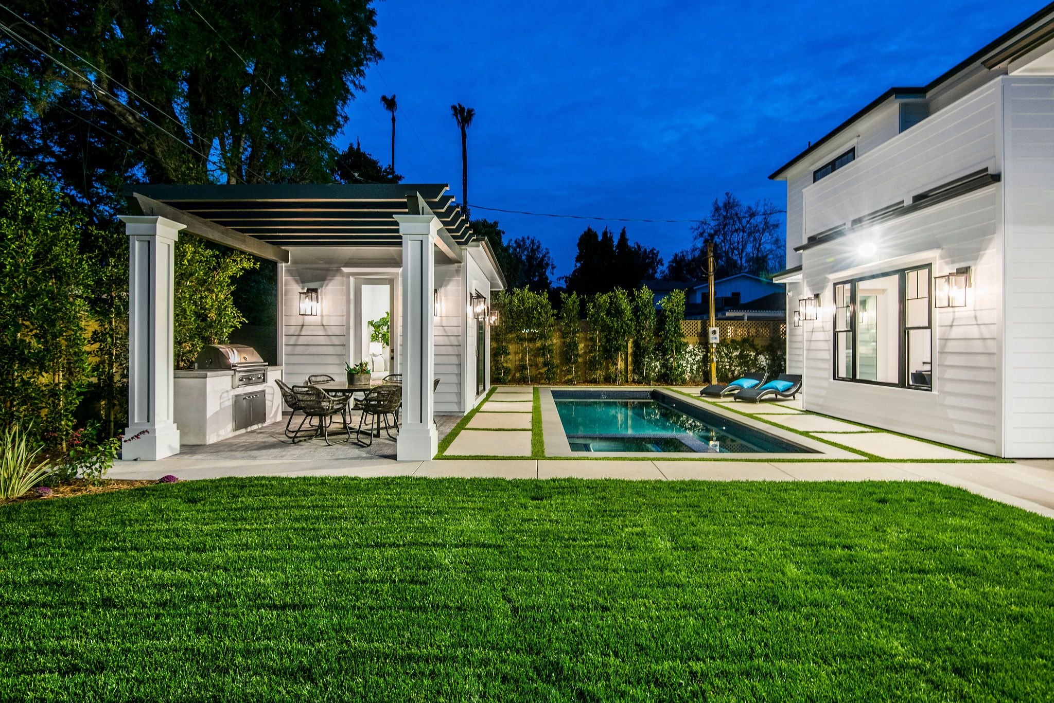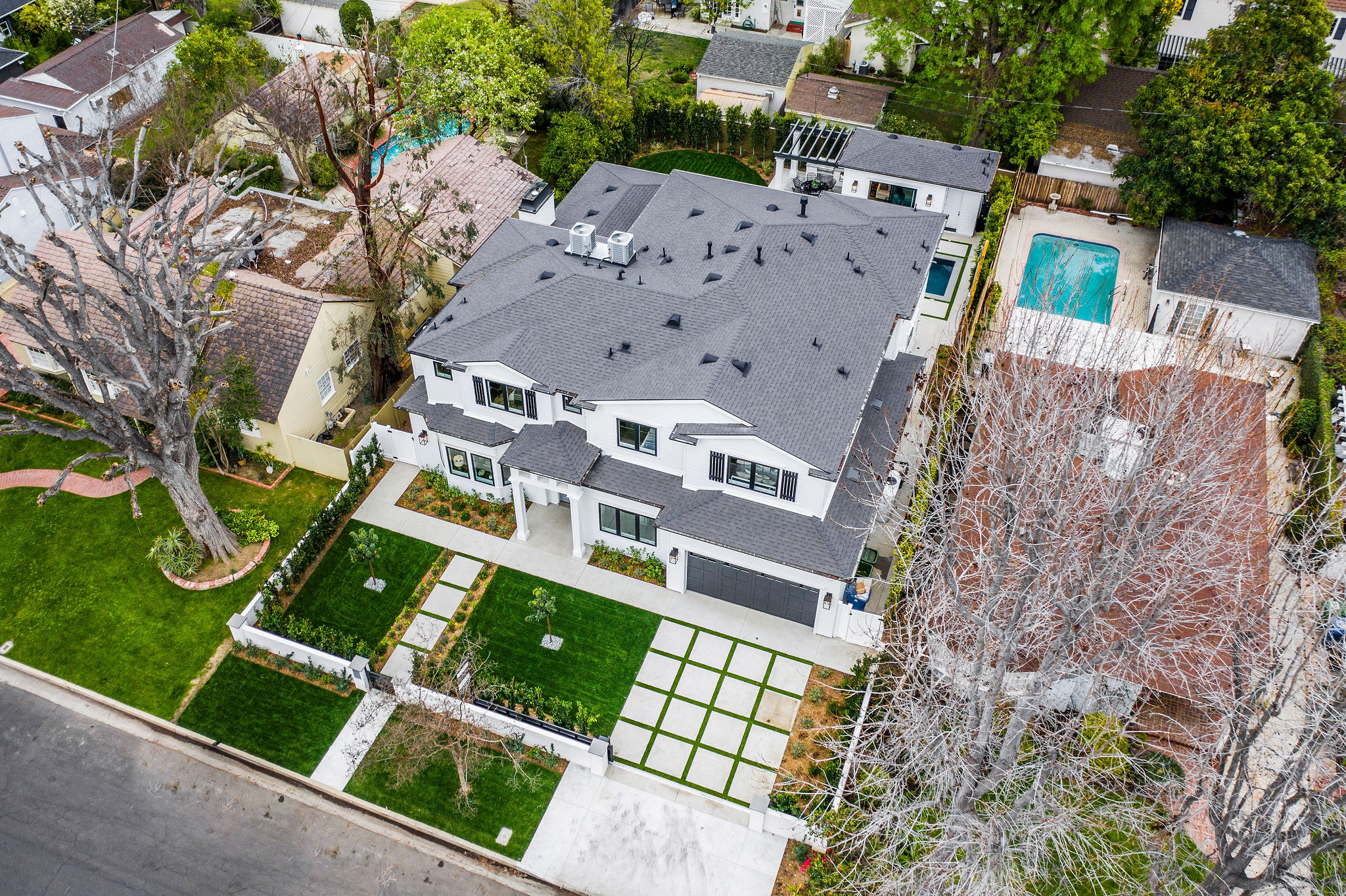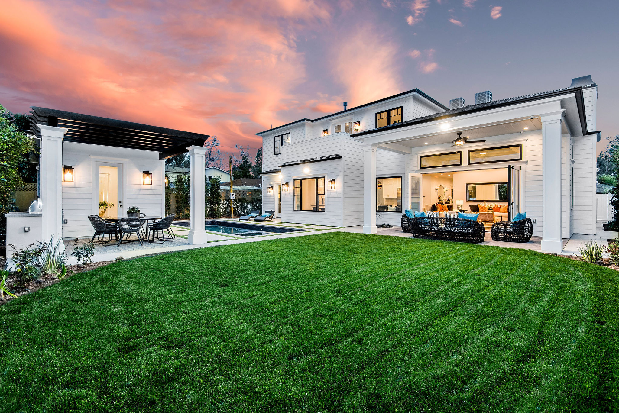 Impressive brand new construction in the heart of Studio City. This home brings striking design and modern living into fruition with gorgeous architecture and attention to detail. Walking through this 5,400 sq ft home you will find exquisite design and elegance. Wide Halls, beamed ceilings, custom lighting, designer fixtures, and amazing natural light from every room. Beautiful glass-encased wine room with back-lit features separates the formal living room and dining into a beautiful vaulted, ceiling entertainers living room with custom cabinetry and a chef’s kitchen with stunning design and unique features. Convenient office and bedroom downstairs offer compatibility to different lifestyles and needs. Grand Staircase leads you to 4 spacious bedrooms and a master suite that brings design a new meaning. Massive his and hers closets, balcony, and a master bathroom with his and her vanities, tub, and large shower. Accent walls, massive windows, beautiful flooring, and blissful design of every bathroom, bedroom, and hallway make this home truly one of a kind. Backyard pulls out all the stops with a gorgeous pool and spa, accompanied by a perfect pool/guest house with a bathroom and space that’s willing to serve however you wish. This house is the meaning of a picture perfect home.