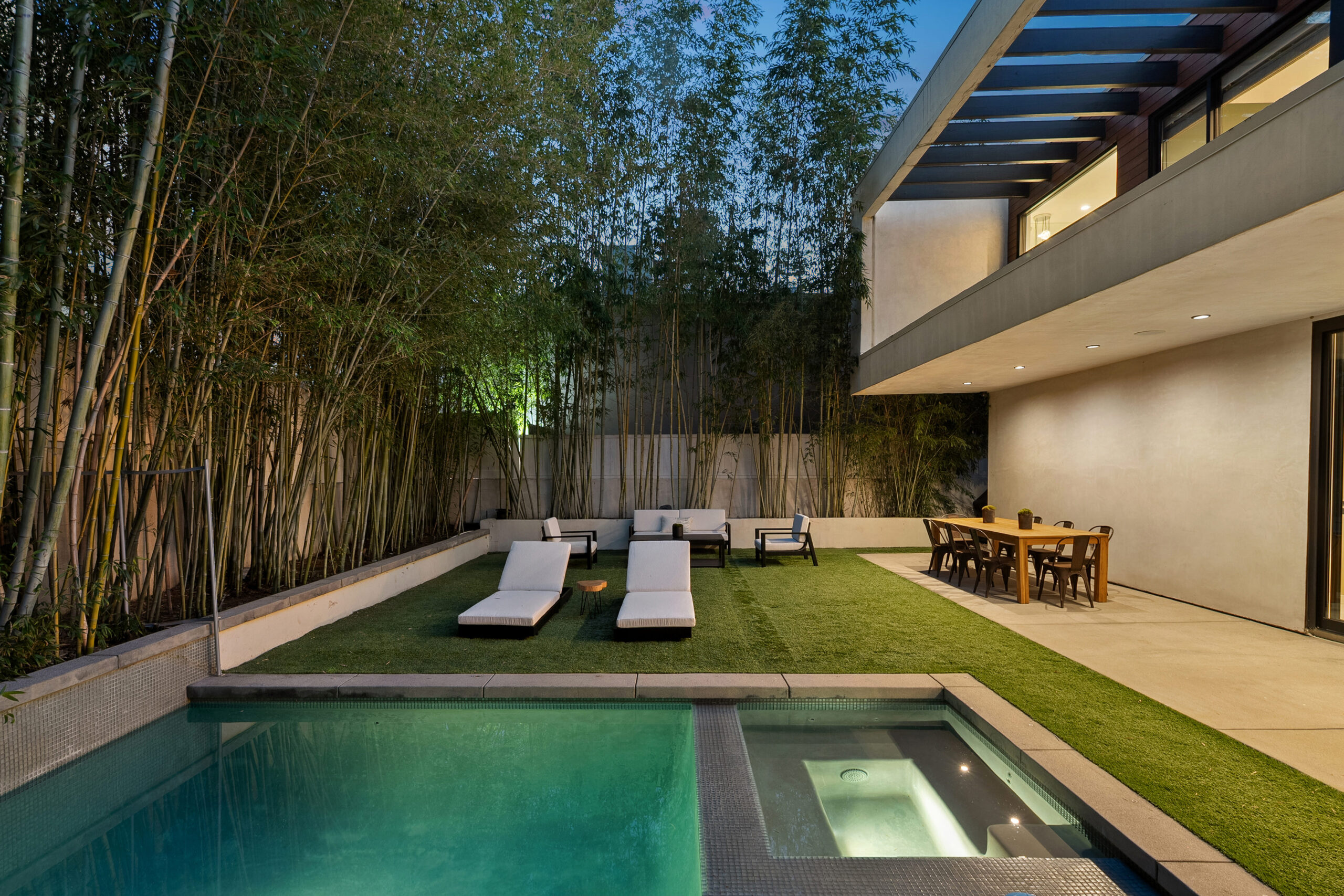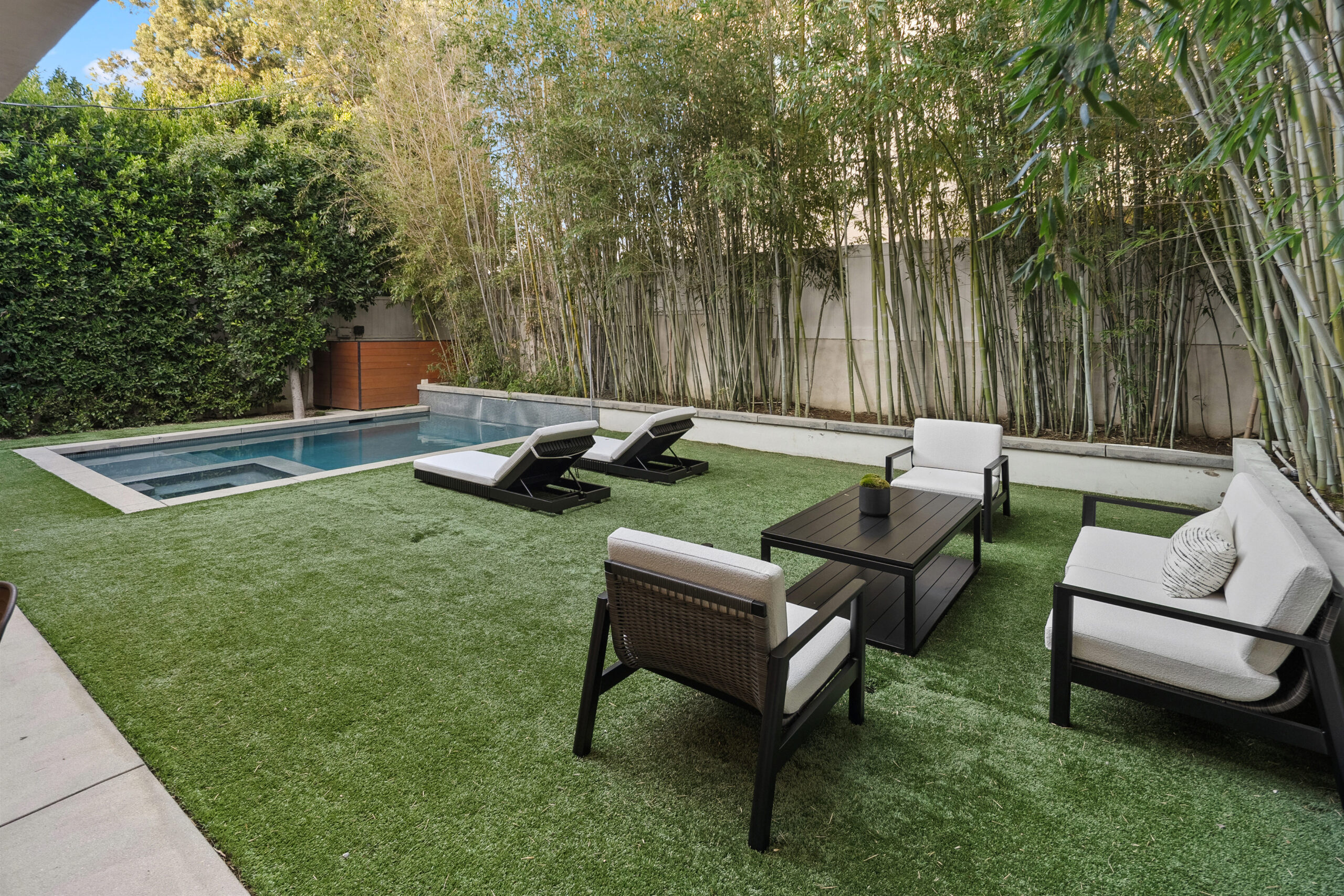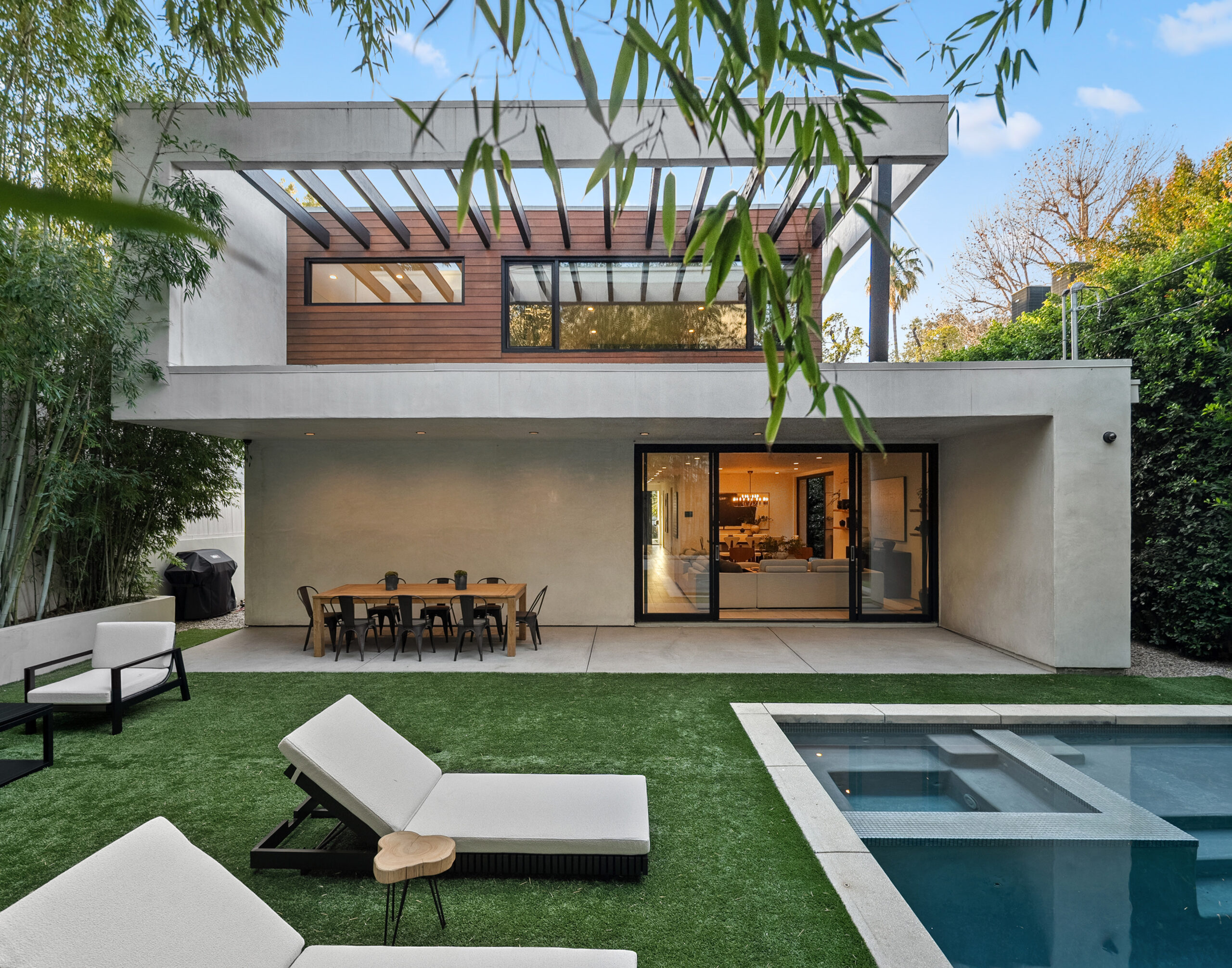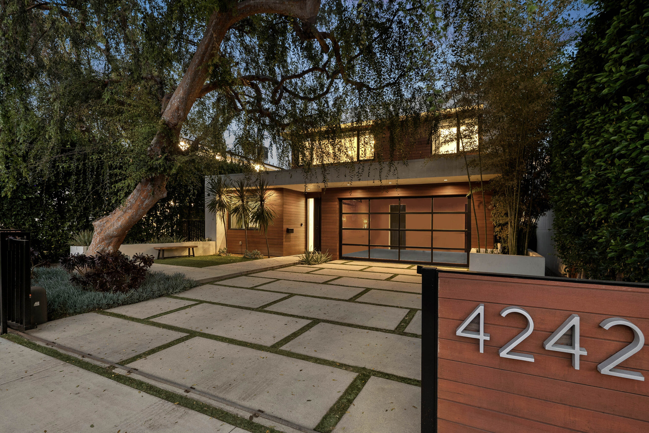 Situated on a gated lot in the desirable Footbridge Square neighborhood of Studio City, this modern architectural gem blends cutting-edge design with impeccable craftsmanship and high-end finishes throughout. Designed for modern living, this open-concept floor plan is highlighted by a gourmet chef’s kitchen equipped with top-of-the-line appliances, dual islands and a large walk-in pantry. The living and formal dining room boast floor-to-ceiling sliding glass doors that flood the space with natural light and open to create a seamless indoor-outdoor flow. Surrounded by mature privacy hedges, the entertainer's backyard offers a sparkling pool/spa with a safety gate, covered patio and low maintenance artificial turf yard. Upstairs, you’ll find three generously sized ensuite bedrooms, each with its own walk-in closet, alongside a spacious loft area. A true sanctuary, the primary suite features a large walk-in closet with custom built-ins and a sumptuous bathroom, complete with a soaking tub, walk-in rainfall shower and double vanity. Additional highlights include two main-level bedrooms (one of which has an ensuite bathroom), a dedicated laundry room, high ceilings throughout, a two-car garage and state-of-the-art Control4 smart home system that controls the built-in speakers, security cameras, thermostat, lighting and more. Live in the heart of Studio City, within the top-rated Carpenter School District and just moments away from trendy restaurants, boutique shops, the Studio City Farmers Market and so much more.