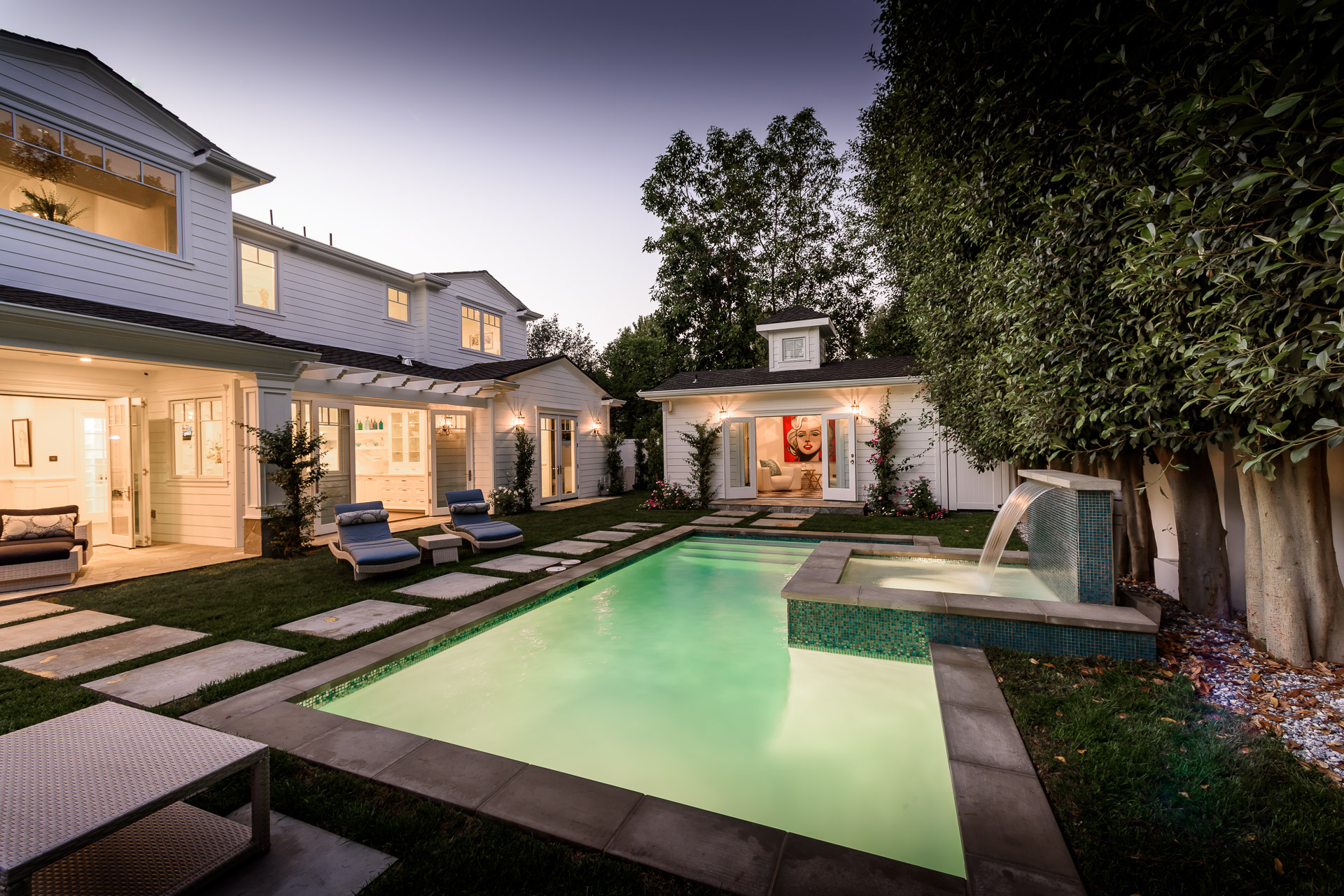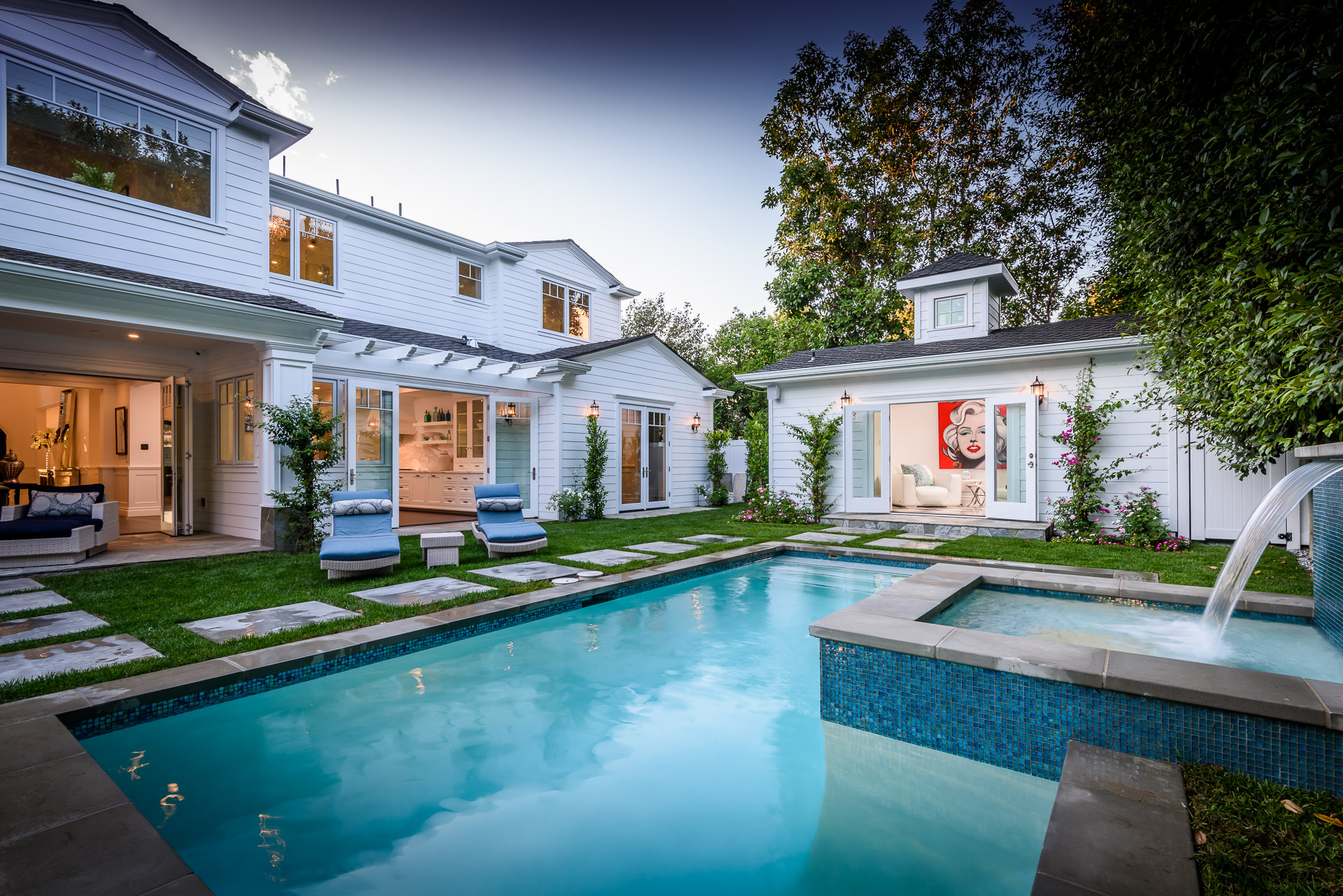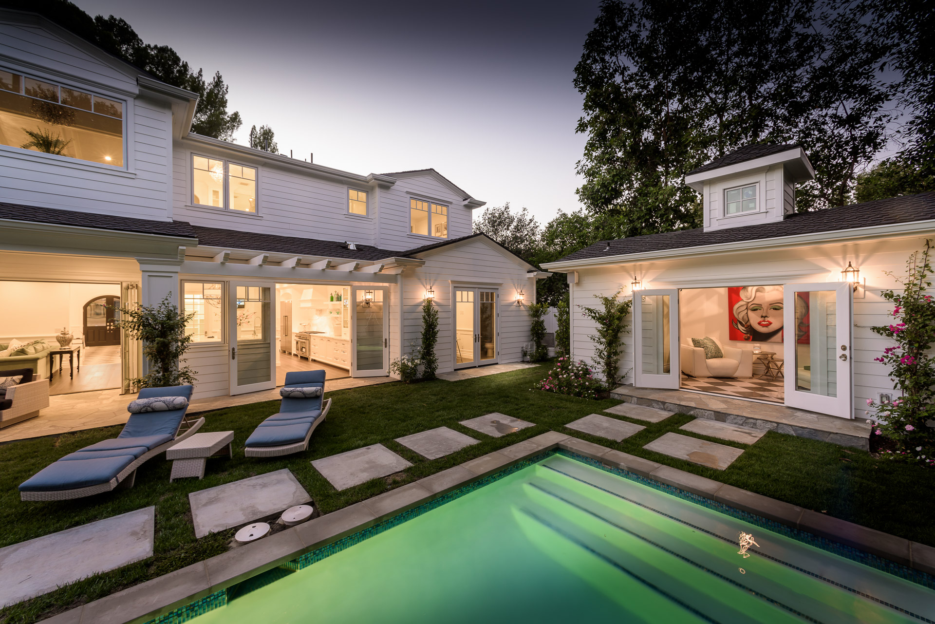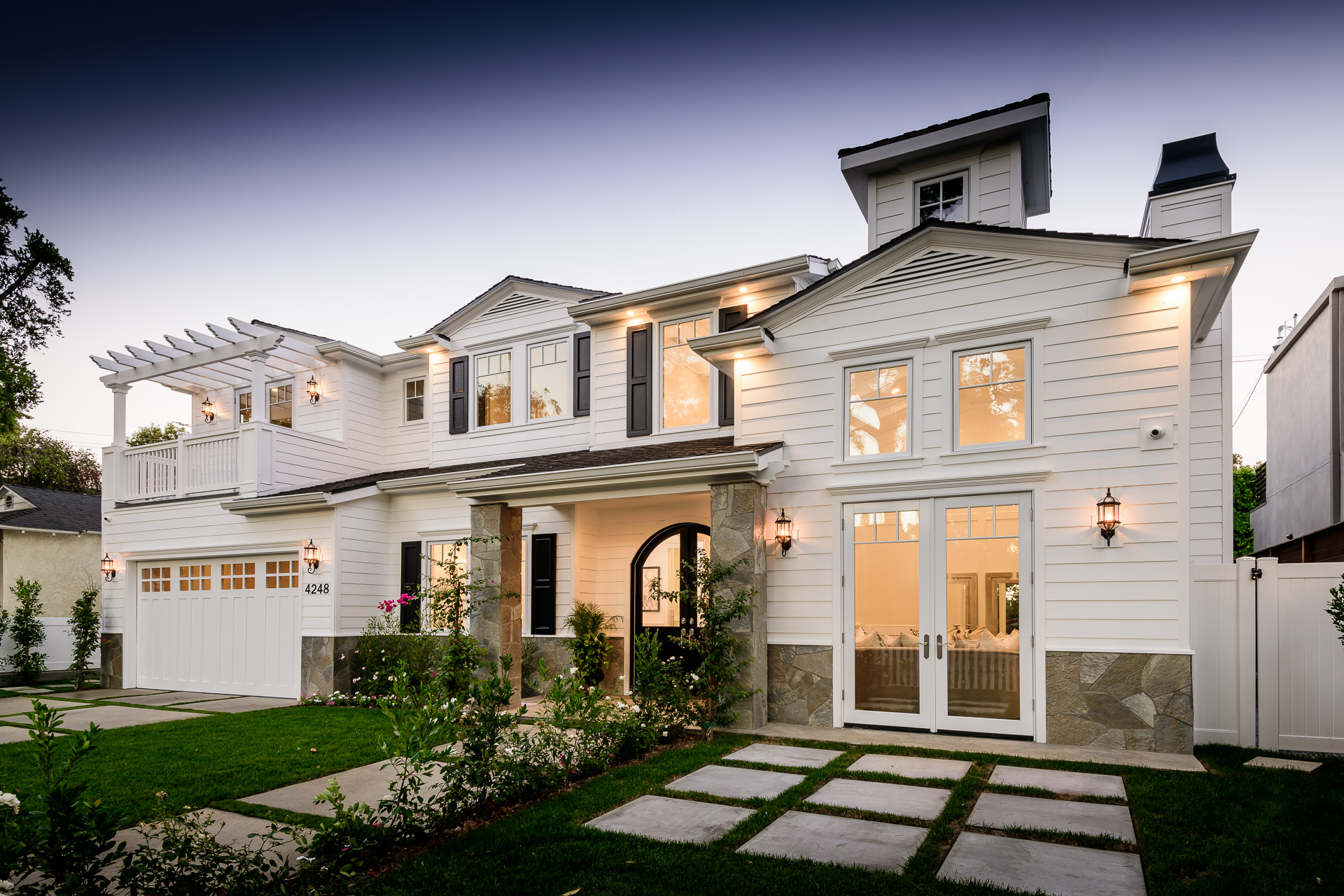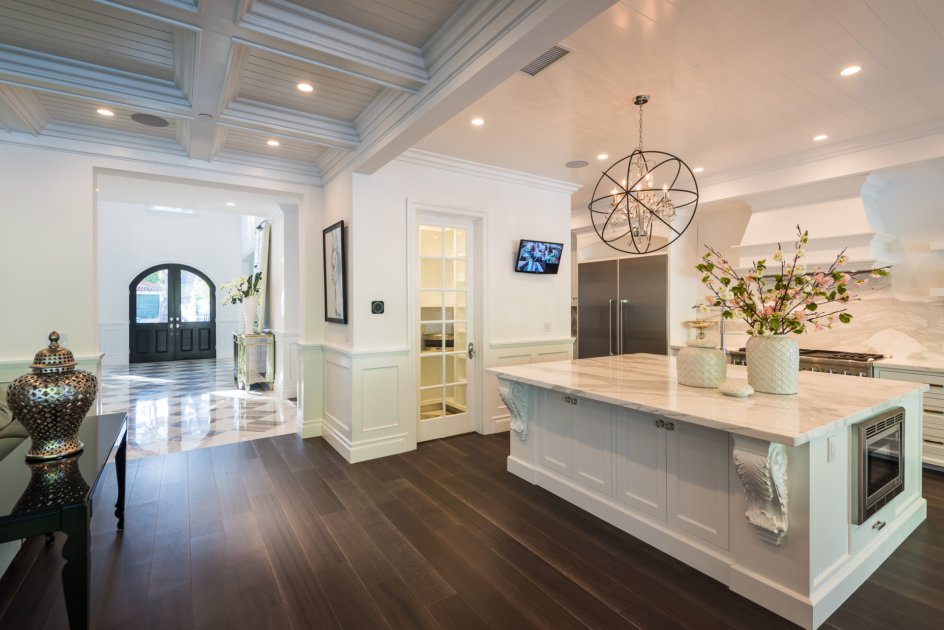 With Weddington Golf Course just down the street this exquisite new construction sits in one of most desirable neighborhood of Studio City. Luxurious features, abundance of a natural light, high end finishes. Beautiful arched double doors lead guests in a stunning foyer with soaring ceilings and Calcutta marble flooring. A formal living room showcases a Calcutta Gold marble around the fireplace, vaulted ceilings, and French doors looking out over the front yard. An elegant formal dining room boasts luxurious hardwood floors and paneled walls, with glamorous wine closet behind a glass door perfectly displaying your future finest vintage collection. A butler’s pantry offers direct access to an incredible gourmet chef’s kitchen with Calcutta Gold marble countertops, Thermador appliances, walk-in pantry, built-in breakfast nook, an oversized center island with dual Viking refrigerator drawers and two dishwashers accented beautifully by a custom chandelier. A fine open space flow into the spacious family room with coffered ceilings, fireplace, and a wall of doors that can be fully opened to provide seamless indoor/outdoor entertaining. An adjacent powder room is that of a luxury hotel, with seating area, marble vanity, back-lit sink, and privacy wall. Grand screening room features sophisticated technology and plush finishes, including an 80” television, surround sound, AV closet, and upholstered paneled walls. Private downstairs office provides a secluded space for concentration and focus includes attached bath and french doors to the backyard. Gorgeous master suite upstairs boasts soaring beamed ceilings, a private balcony, seating area, 2 walk-in closets, and a dual sided fireplace to the spa-like master bath with massive dual vanity, soaking tub, and Calcutta Gold marble shower. Spacious guest rooms feature custom closets and stunning bathrooms. Truly incredible backyard offers great entertainer’s area with covered outdoor living space, sparkling pool & spa with glass mosaic tile, water features, and built-in BBQ with refrigerator leading into capacious guest house features beamed ceilings, Calcutta marble flooring, and beautiful bath. Additional conveniences include an attached two-car garage, enormous upstairs laundry room, dual zone temperature, smart system and whole-house entertainment system.