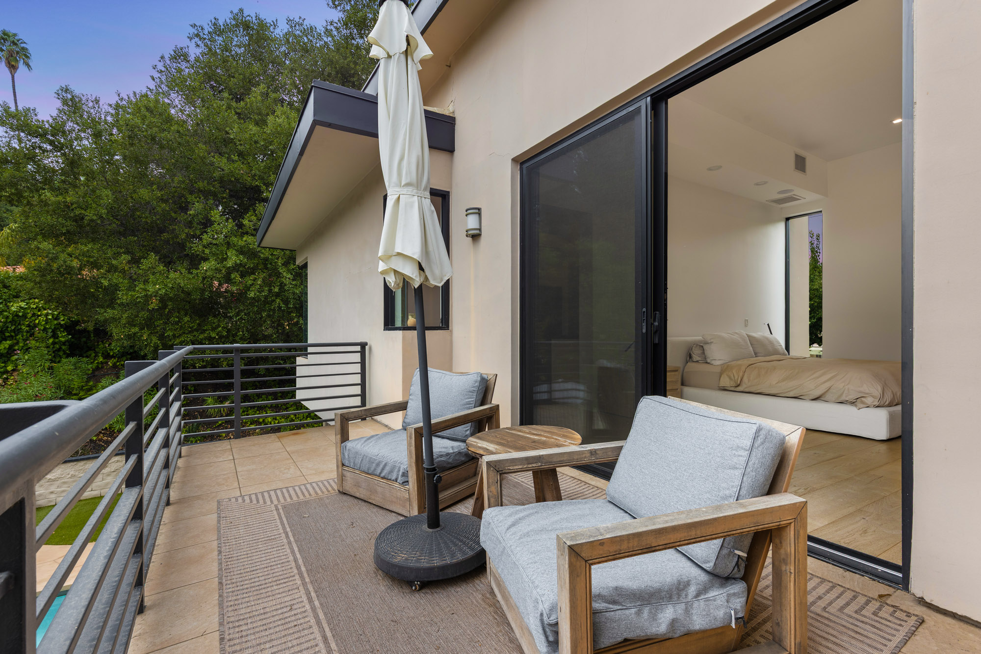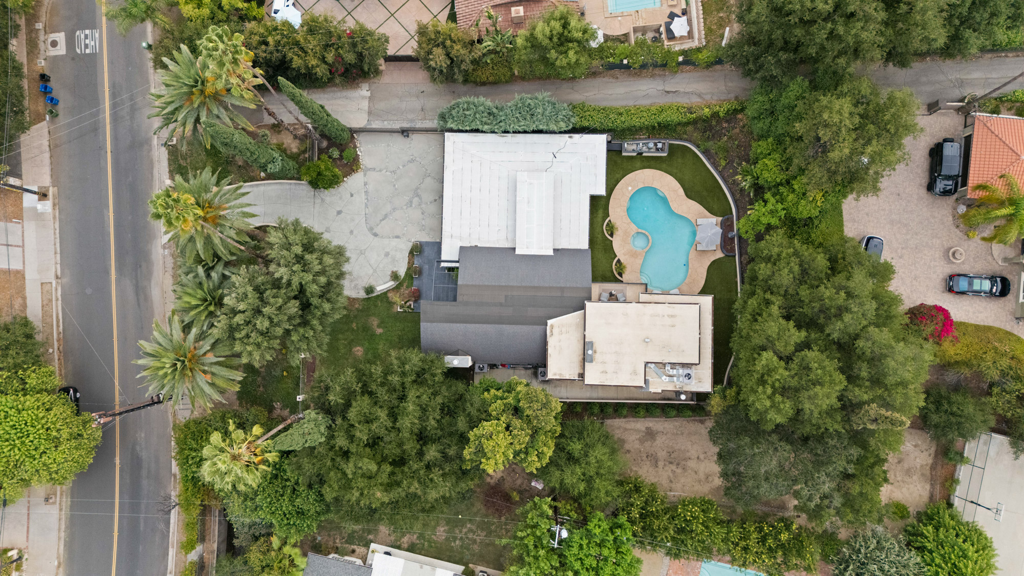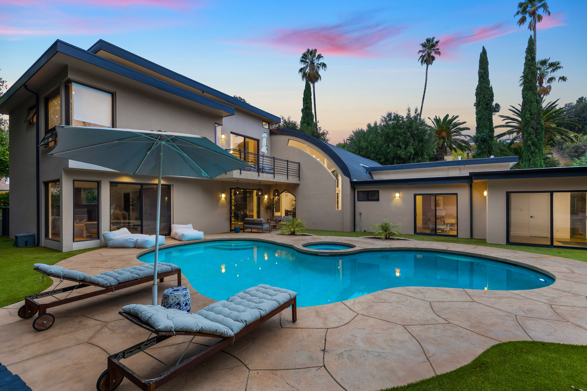 Nestled in the hills of Tarzana on a sprawling 18,000+ sf gated lot, this custom-built residence showcases striking architectural elements and is strategically set back from the street to create a private retreat. Enter through bespoke double doors into a grand foyer that flows seamlessly into the spacious formal living and dining room. Lofty 20 ft ceilings and expansive walls of glass that stretch from floor to ceiling flood the space with warm natural light, making the space feel bright and airy. Through the butler’s pantry lies a gourmet chef’s kitchen, outfitted with commercial-grade Viking appliances, a walk-in pantry and center island with an integrated dining table. A sliding glass door in the family room leads out to the secluded backyard sanctuary, which is surrounded by mature landscaping and boasts a heated pool and spa. There are four generously sized ensuite bedrooms spread throughout the home, each with a walk-in closet. The expansive primary suite features a versatile bonus space, private balcony, custom walk-in closet and sumptuous bathroom, complete with a soaking tub, steam shower, double vanity and separate makeup vanity. Additional highlights include a dedicated laundry room, security system, countless upgrades (newer roof, wide plank oak floors, dual pane windows, built-in speakers and so much more), a two-car garage with an EV charger and gated driveway with ample space to park multiple vehicles. Located south of the Boulevard in a top-rated school district, this property is just moments away from everything the Valley has to offer.