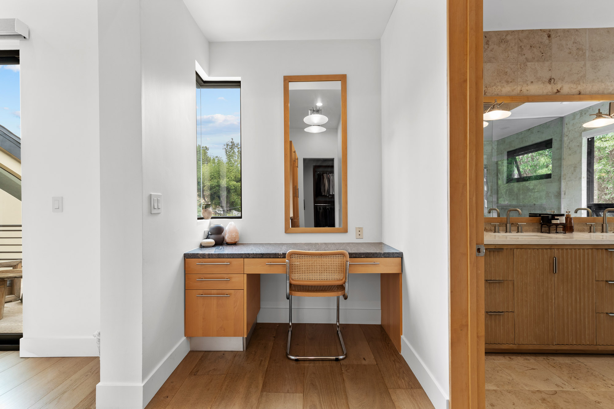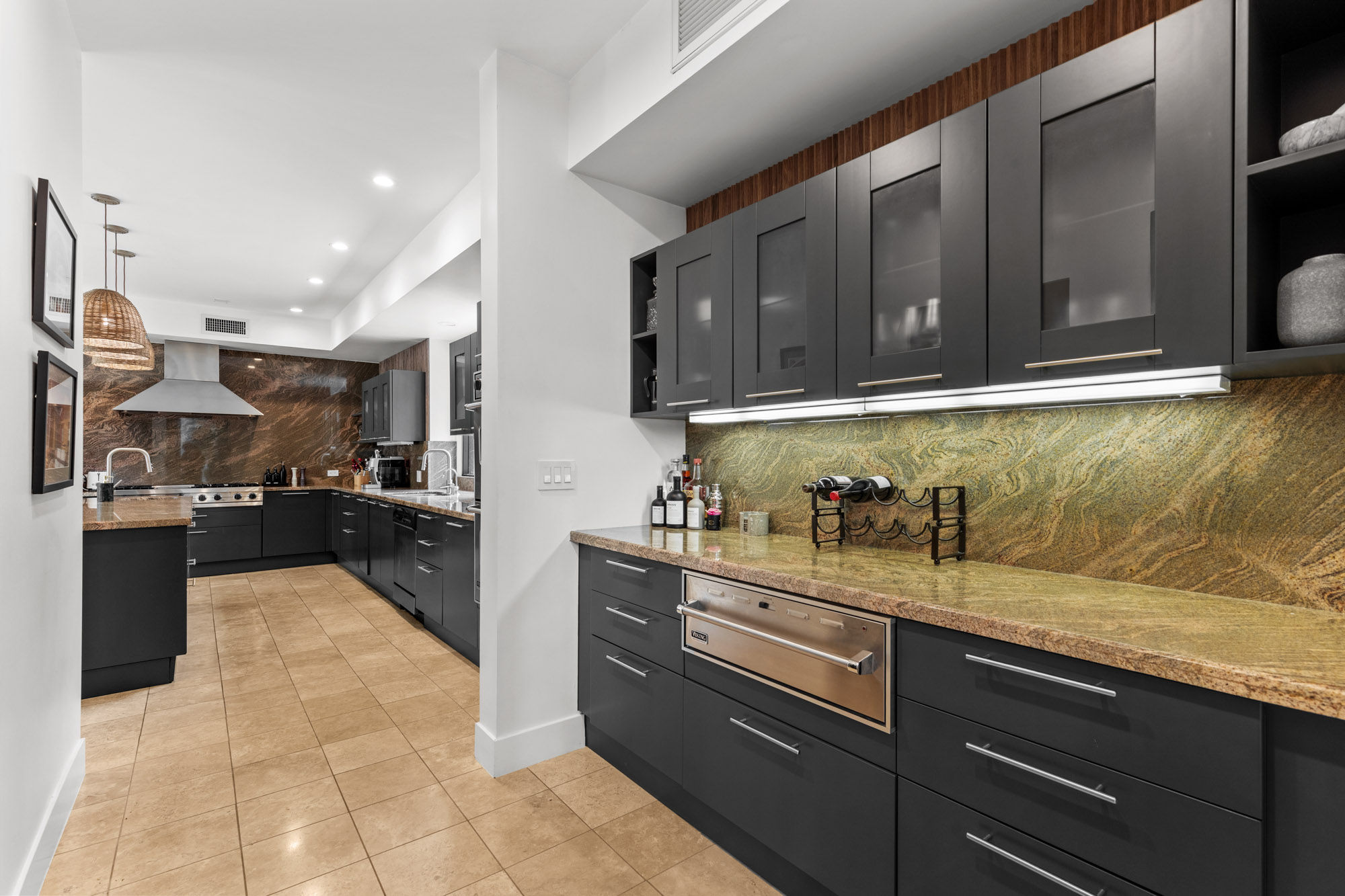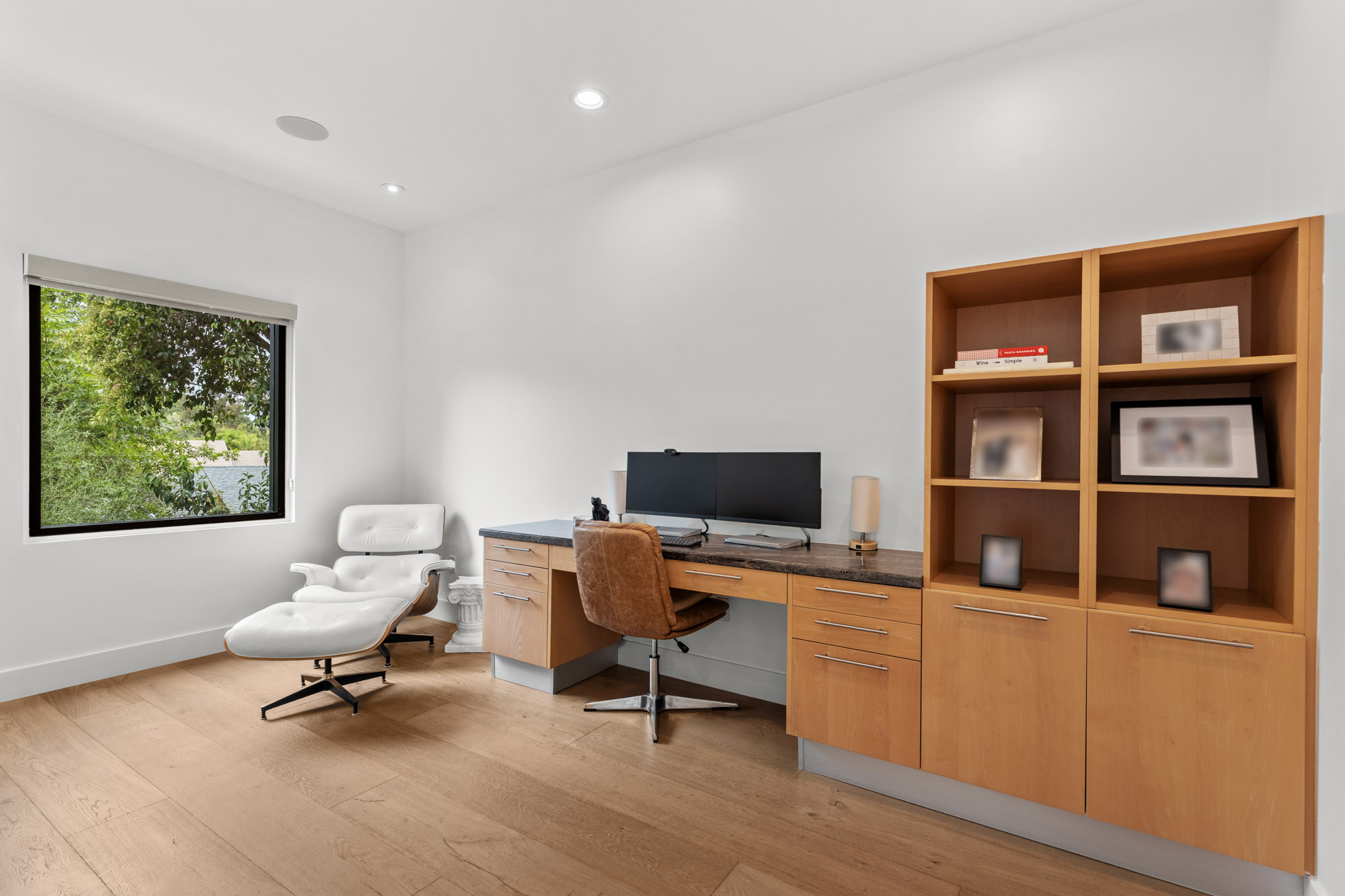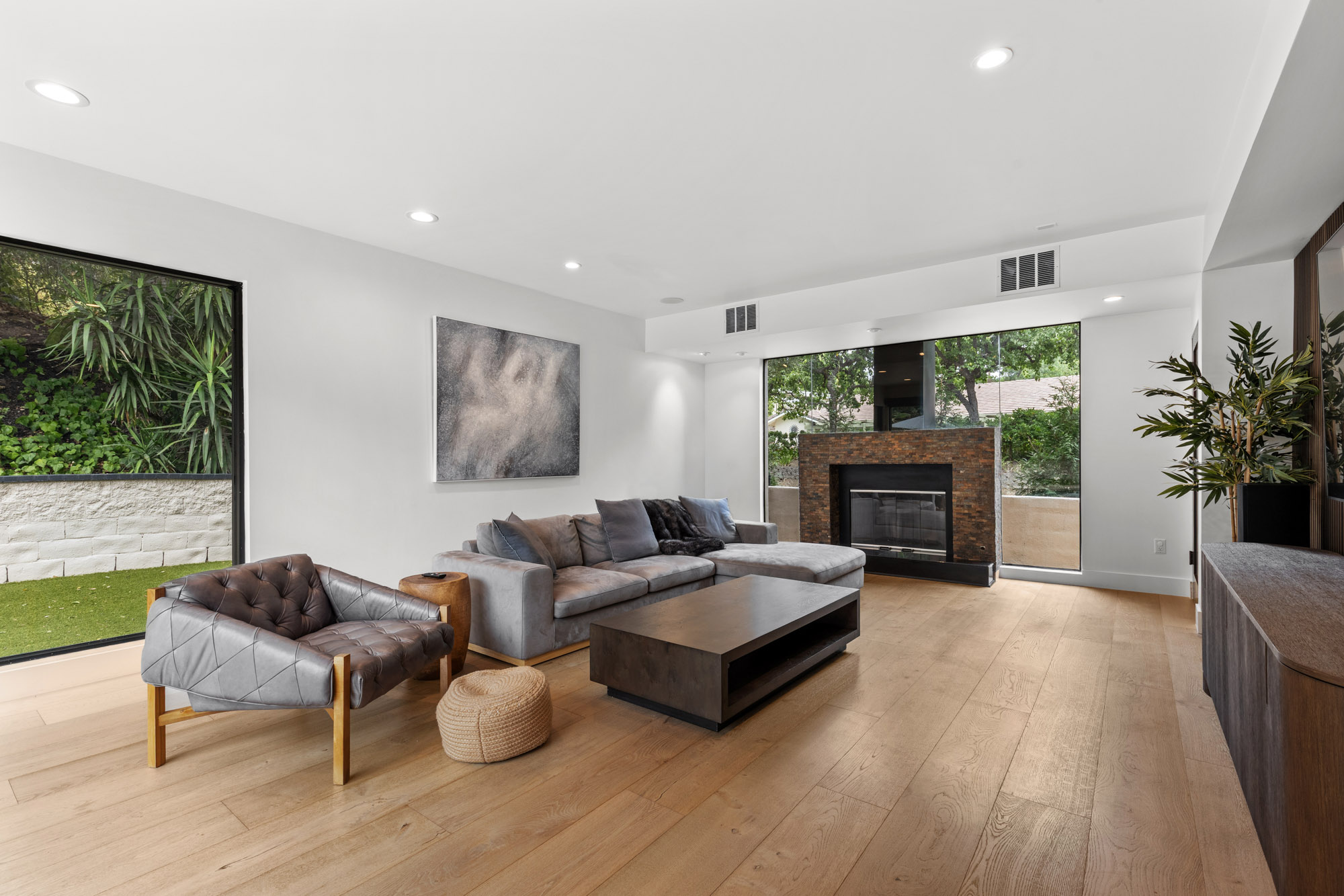 Nestled in the hills of Tarzana on a sprawling 18,000+ sf gated lot, this custom-built residence showcases striking architectural elements and is strategically set back from the street to create a private retreat. Enter through bespoke double doors into a grand foyer that flows seamlessly into the spacious formal living and dining room. Lofty 20 ft ceilings and expansive walls of glass that stretch from floor to ceiling flood the space with warm natural light, making the space feel bright and airy. Through the butler’s pantry lies a gourmet chef’s kitchen, outfitted with commercial-grade Viking appliances, a walk-in pantry and center island with an integrated dining table. A sliding glass door in the family room leads out to the secluded backyard sanctuary, which is surrounded by mature landscaping and boasts a heated pool and spa. There are four generously sized ensuite bedrooms spread throughout the home, each with a walk-in closet. The expansive primary suite features a versatile bonus space, private balcony, custom walk-in closet and sumptuous bathroom, complete with a soaking tub, steam shower, double vanity and separate makeup vanity. Additional highlights include a dedicated laundry room, security system, countless upgrades (newer roof, wide plank oak floors, dual pane windows, built-in speakers and so much more), a two-car garage with an EV charger and gated driveway with ample space to park multiple vehicles. Located south of the Boulevard in a top-rated school district, this property is just moments away from everything the Valley has to offer.