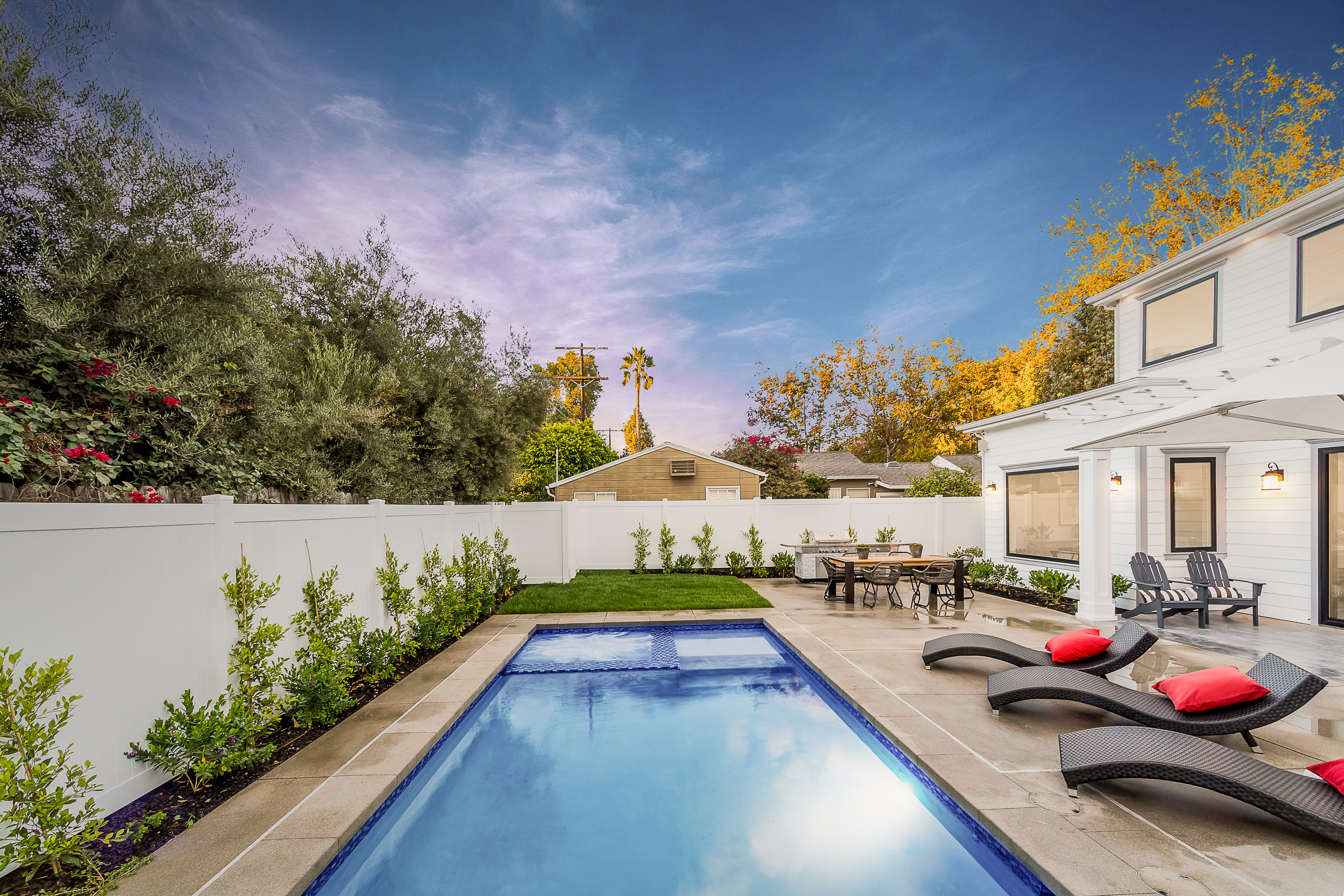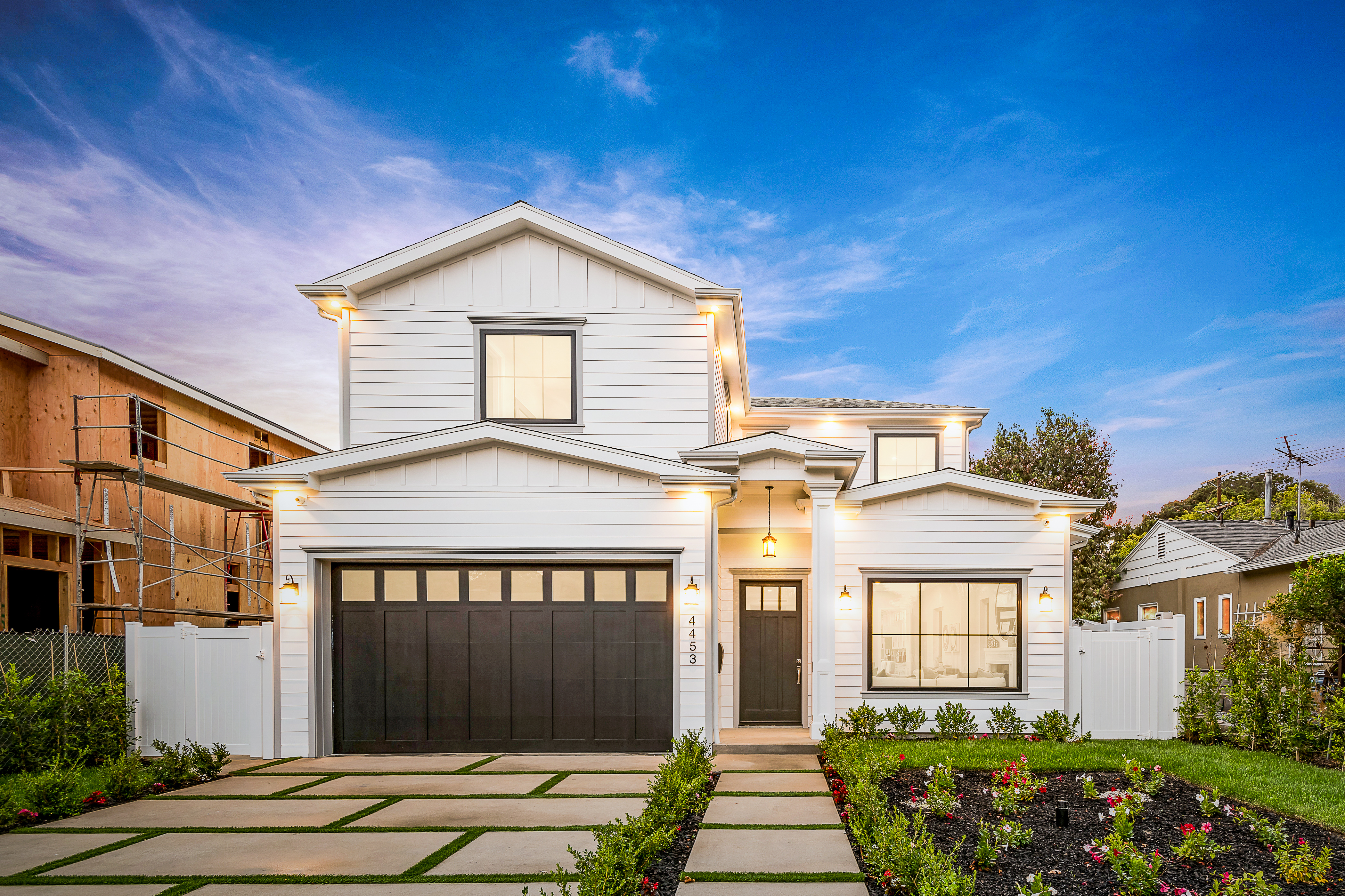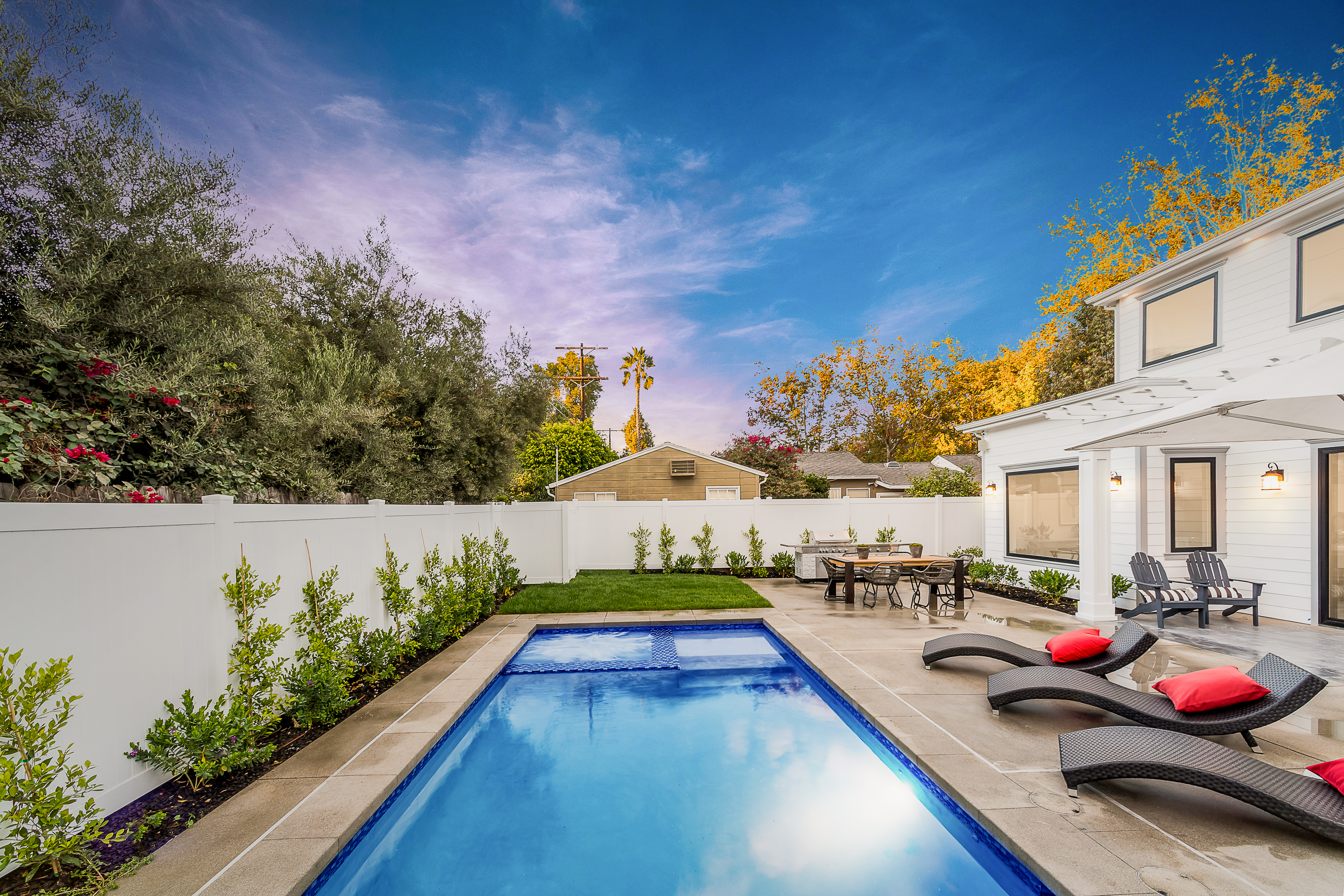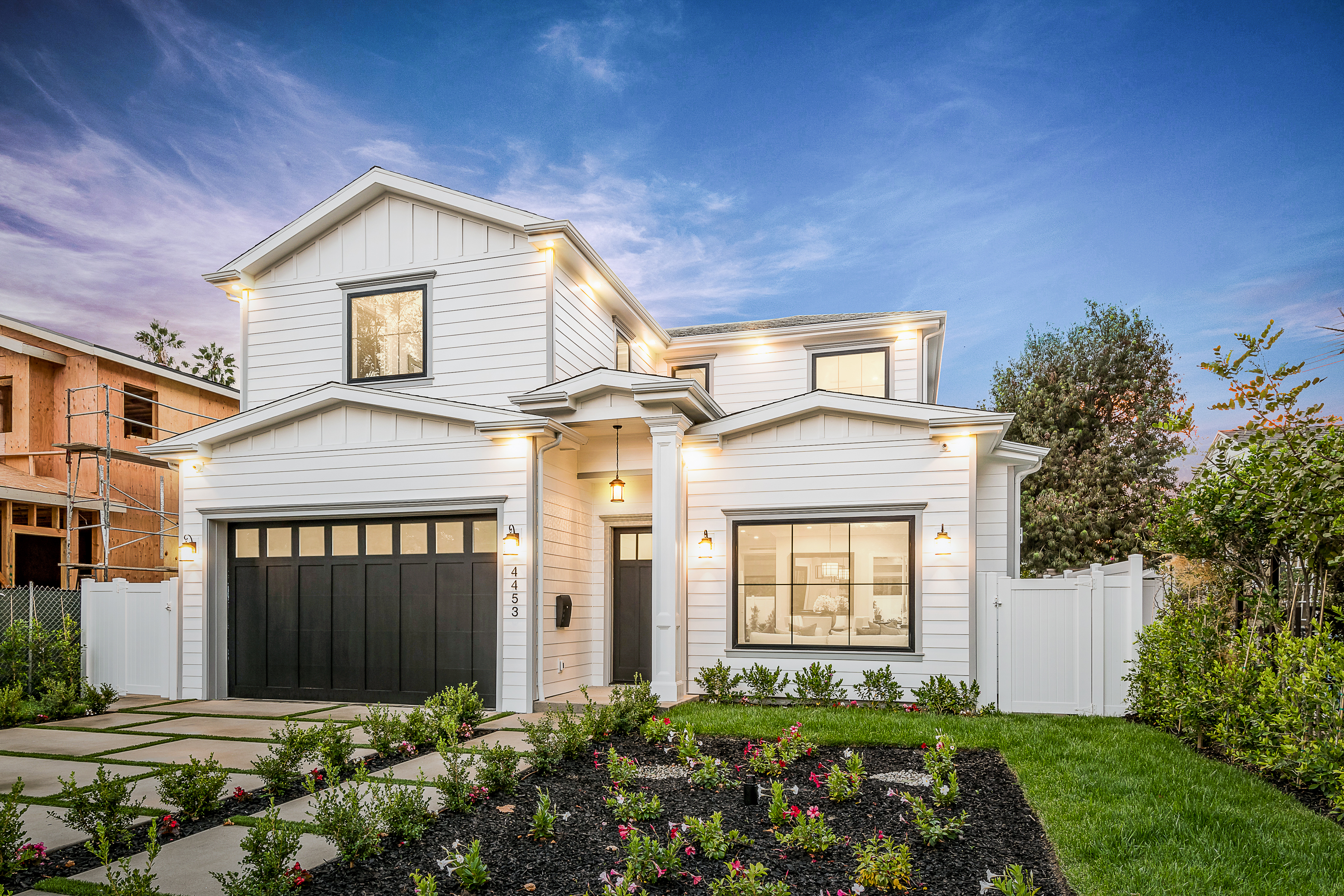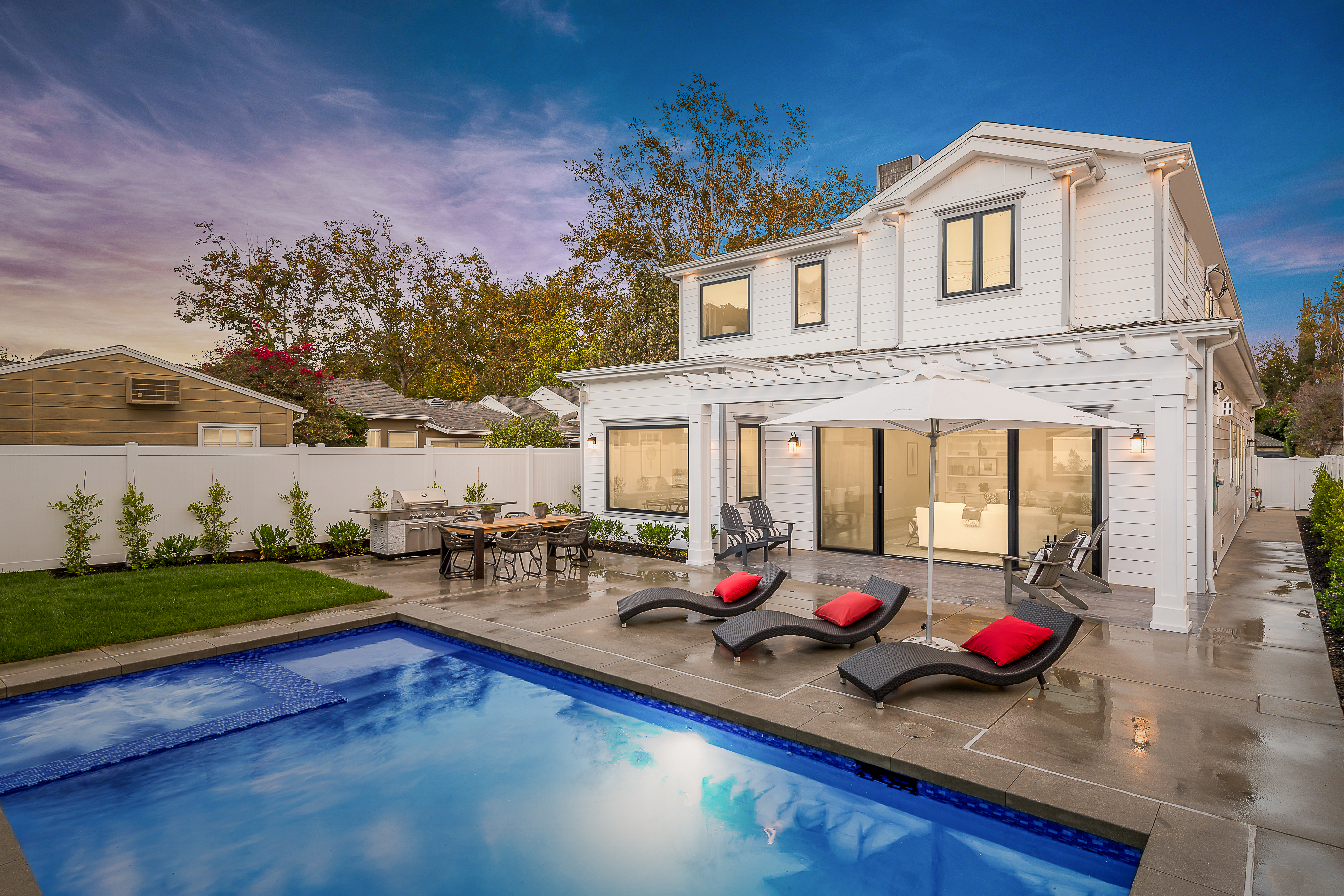 Cape Cod inspired New Construction home on tree-lined street in highly desirable neighborhood of Studio City, and within easy walking distance to the famed Tujunga Village with its quaint shops & restaurants. Exterior grounds feature lushly landscaped flower beds, brand new Magnolia tree, large pool and spa, seven Eyemax security cameras, and a custom 9’ wooden garage door with smartphone control. Interior boasts high 10’4” ceilings; high-end Anderson and Fleetwood brand windows that drench the home in natural light and frame pretty views of the greenery outside; 8.5” plank European White Oak engineered hardwood floors; 8’ interior doors; Built-in ceiling speakers that fill the home with your favorite music. The spacious master suite features a large, luxurious, ensuite and walk-in closet. 5 bedrooms and 5.5 bathrooms offer everyone plenty of space for privacy, while the open concept family room connects to the kitchen for family gathering. A Gourmet kitchen features top of the line Thermador stainless steel appliances, 10’ Caesarstone center island, food pantry, secondary prep sink, and wine cooler. Other features include: Lutron Smart light switches, controllable from phone/tablet, integrated alarm system, truly-custom “built-onsite” cabinetry and much more. The garage and outdoor patio are not included in the square footage. Don’t miss this wonderful home.