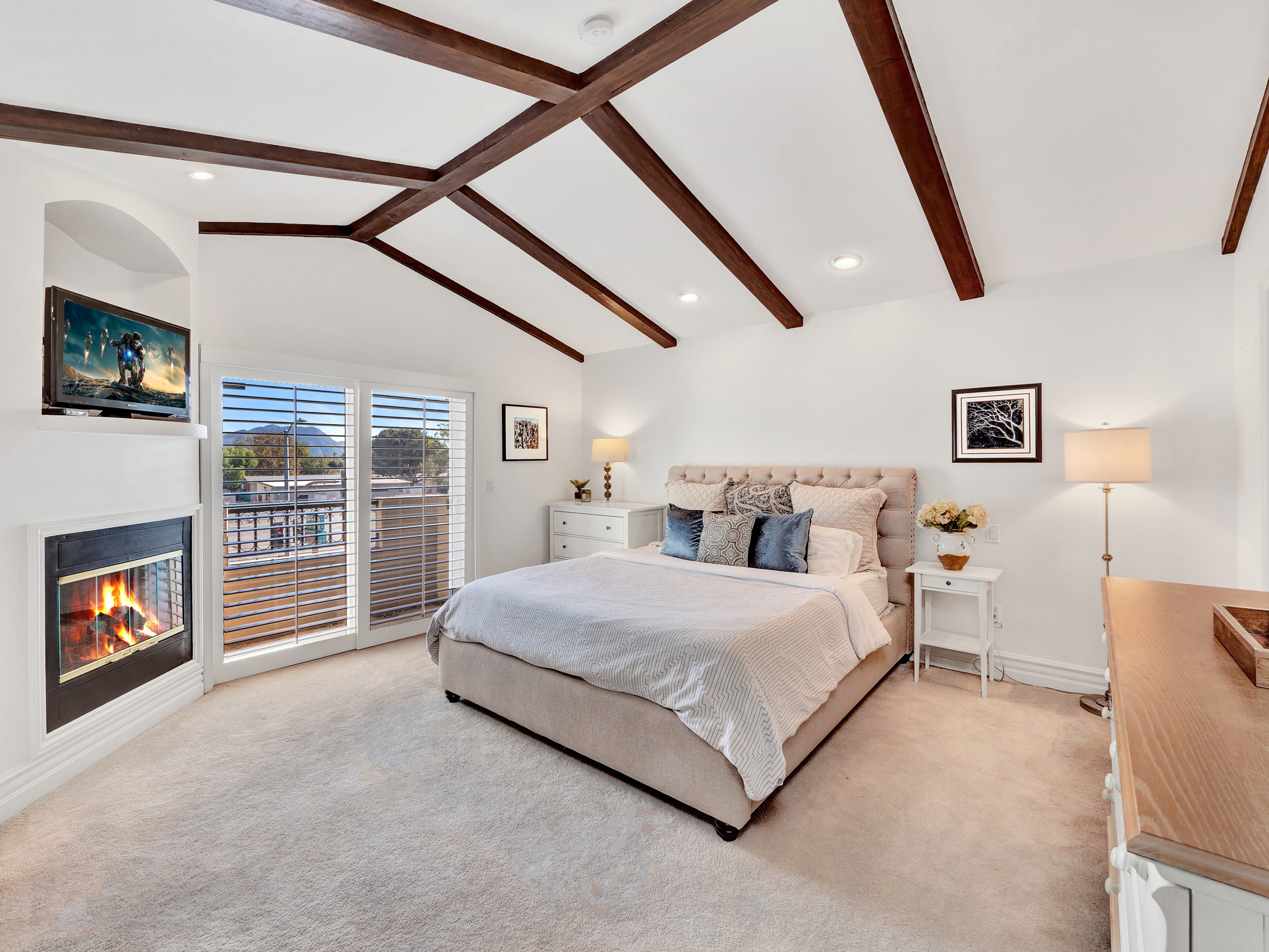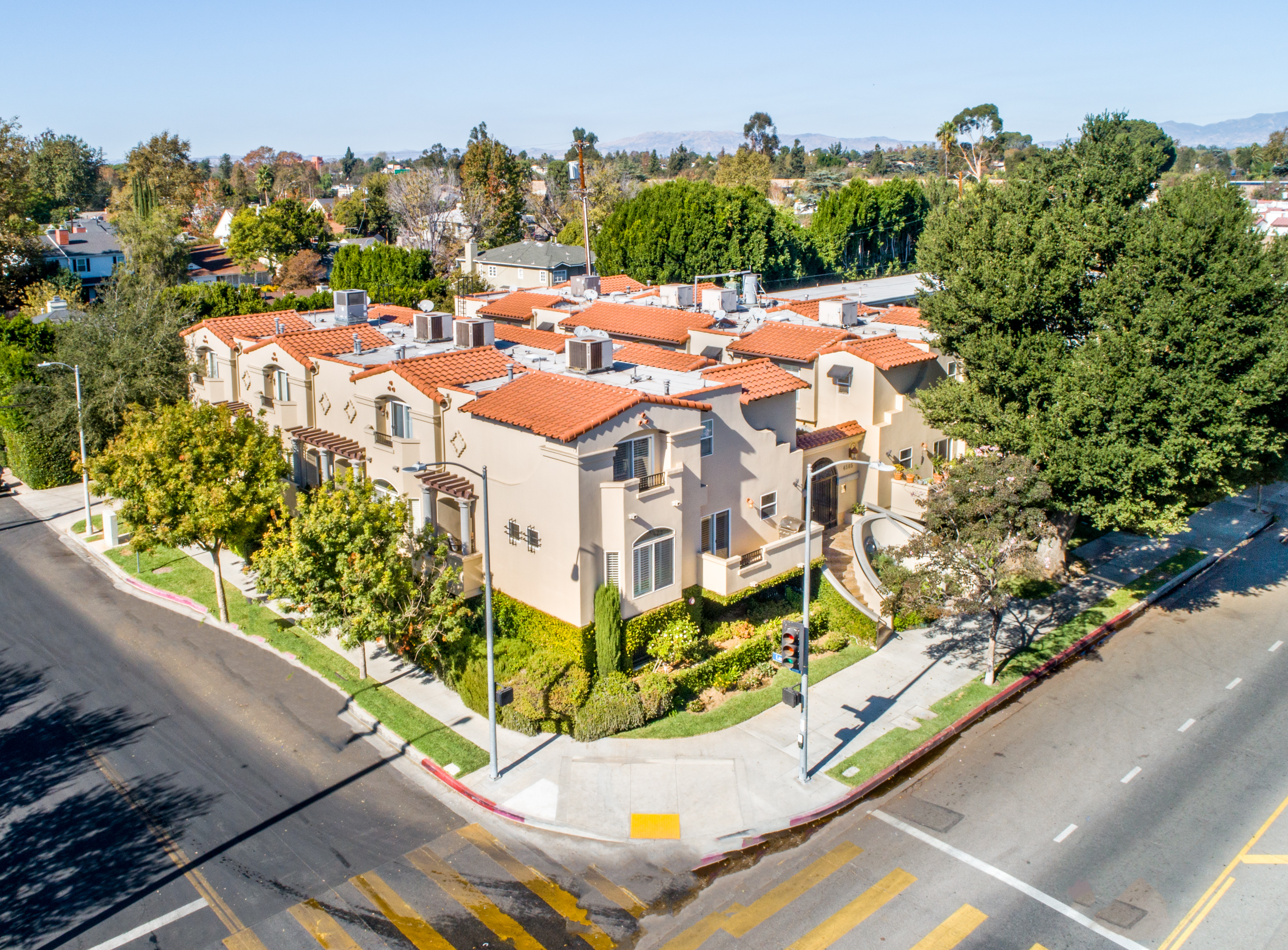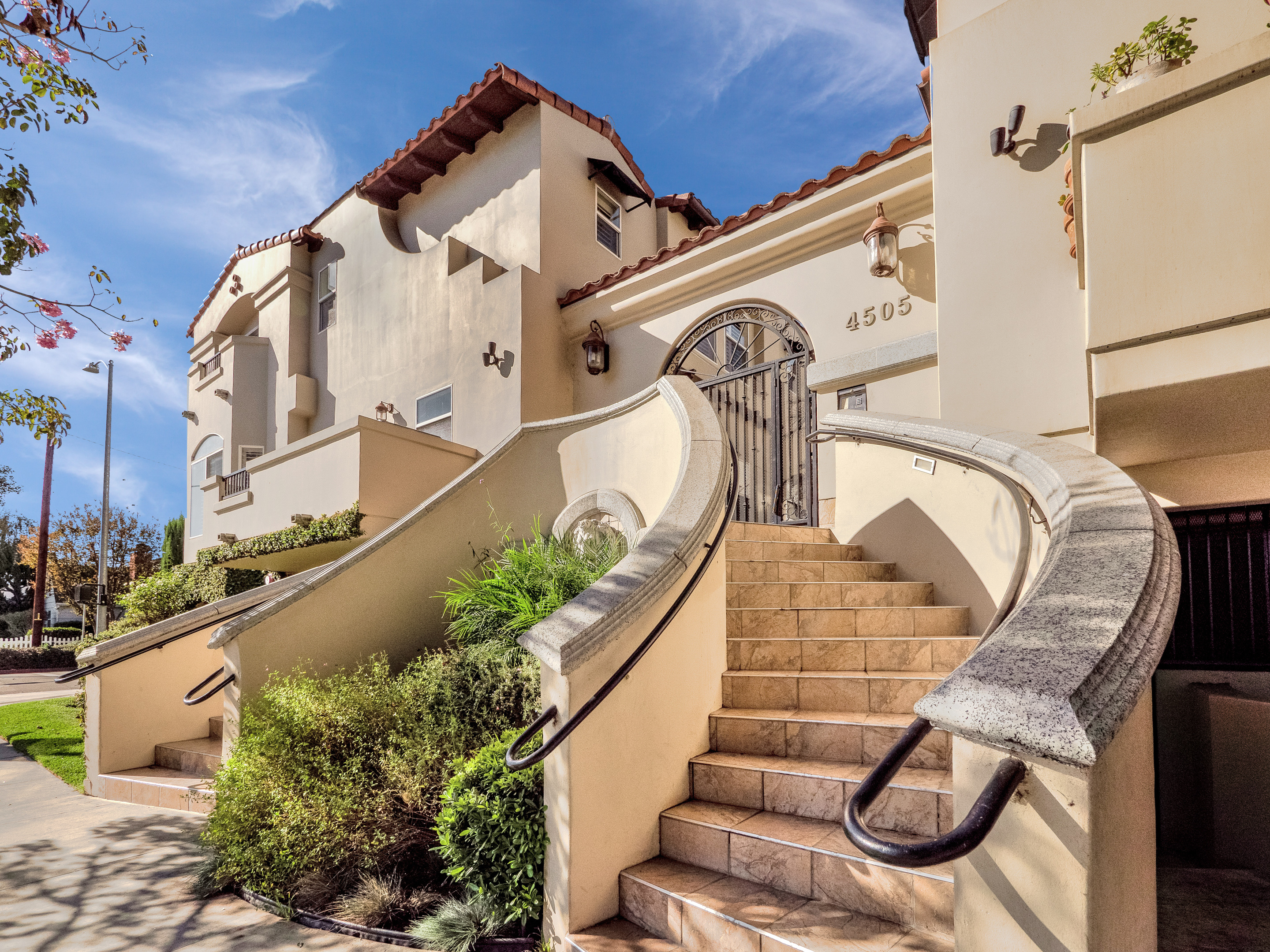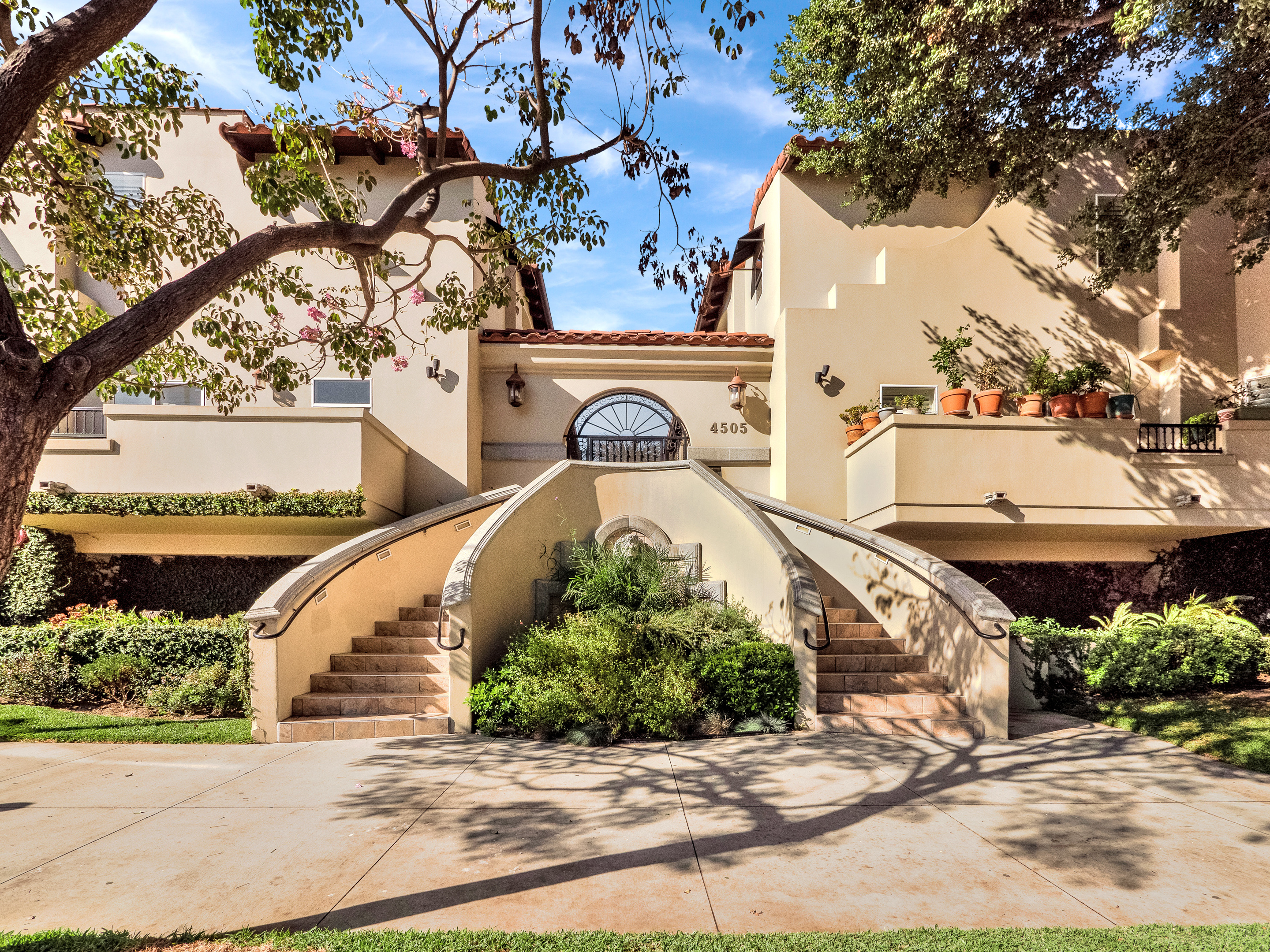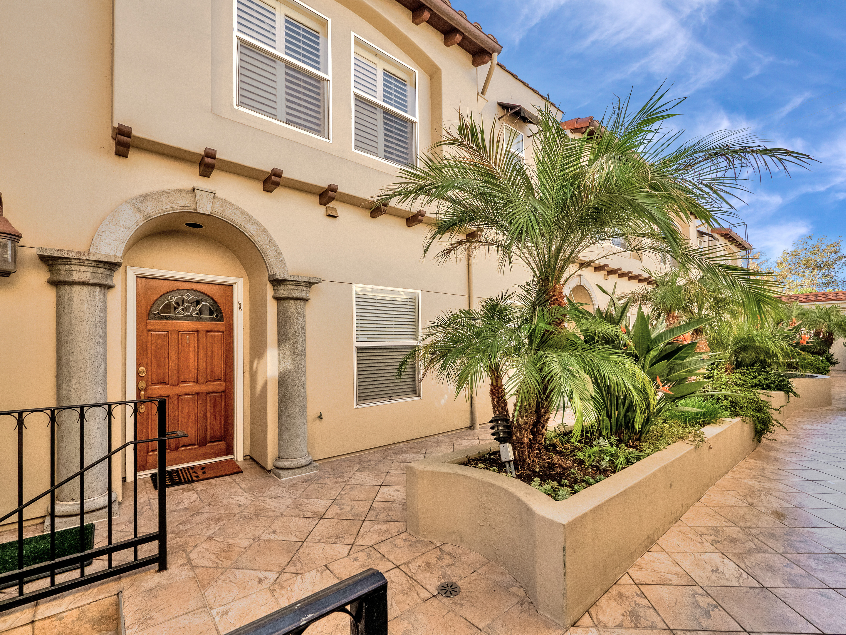 Mediterranean style townhome located in the highly desirable Colfax Elementary school district in Studio City. The buildings secured entry opens to a lush courtyard with palm trees and tranquil fountain. The home's main level has an open floor plan with wood floors, high ceilings, and an abundance of windows with plantation shutters, flooding the space with natural light. The kitchen features granite countertops, stainless steel appliances, and a breakfast bar that opens to the spacious dining area and living room. The living space has a sophisticated fireplace, crown molding, and 2 balconies, perfect for cool breezes and outdoor dining. Also on the main level is one of the three bedrooms, ideal for an office space or guest room, and a ¾ bath. Upstairs there are 2 master suites, both with walk-in closets and high ceilings. The main master bedroom boasts striking beamed ceiling, an additional fireplace and a balcony, making it truly luxurious. Other features include private, attached 2-car garage, washer/dryer in unit, and separate guest parking. Moments from the charming shops and restaurants of Tujunga Village, and conveniently located to the Studios and Ventura Blvd, don't miss this amazing home!
