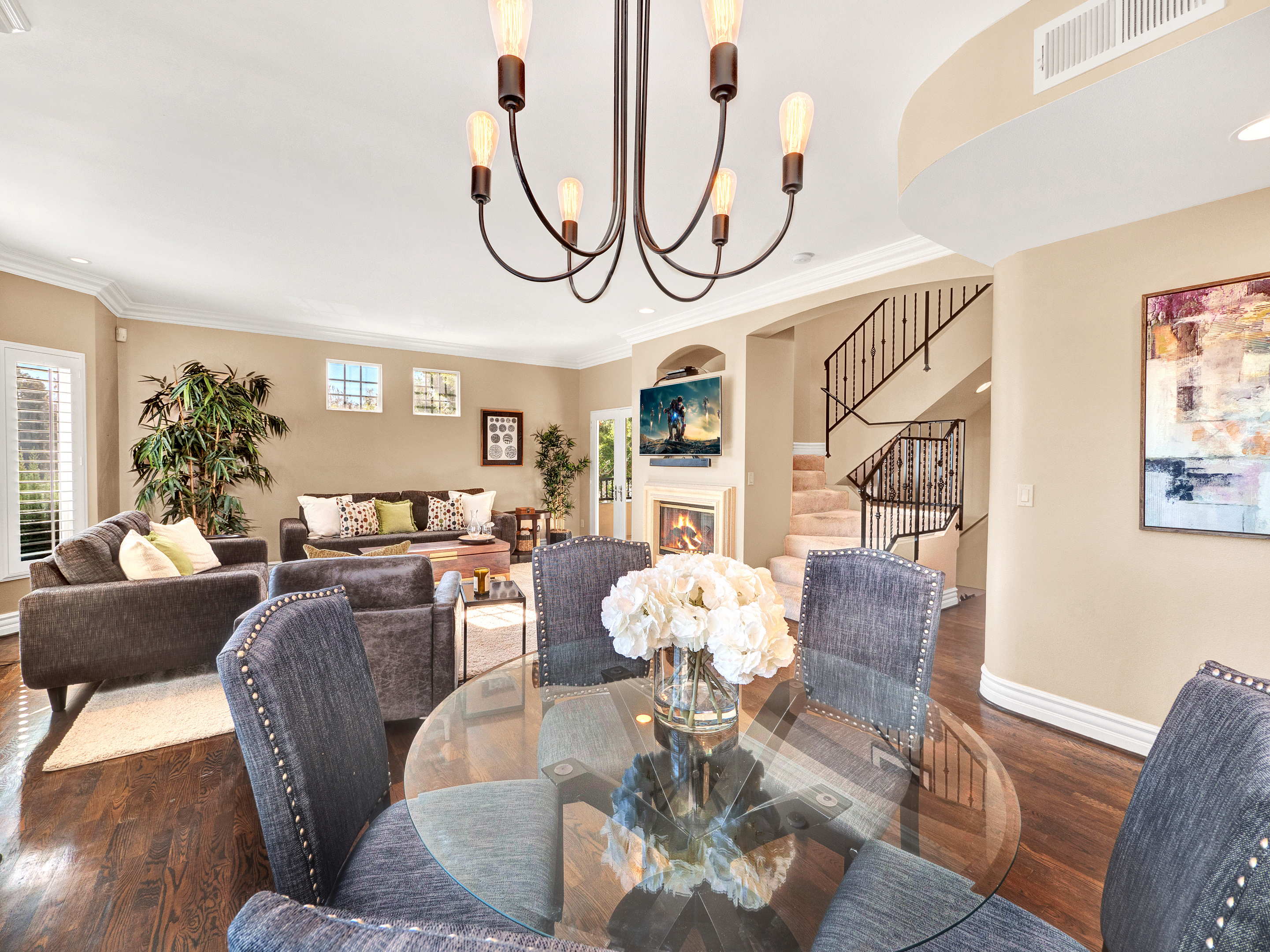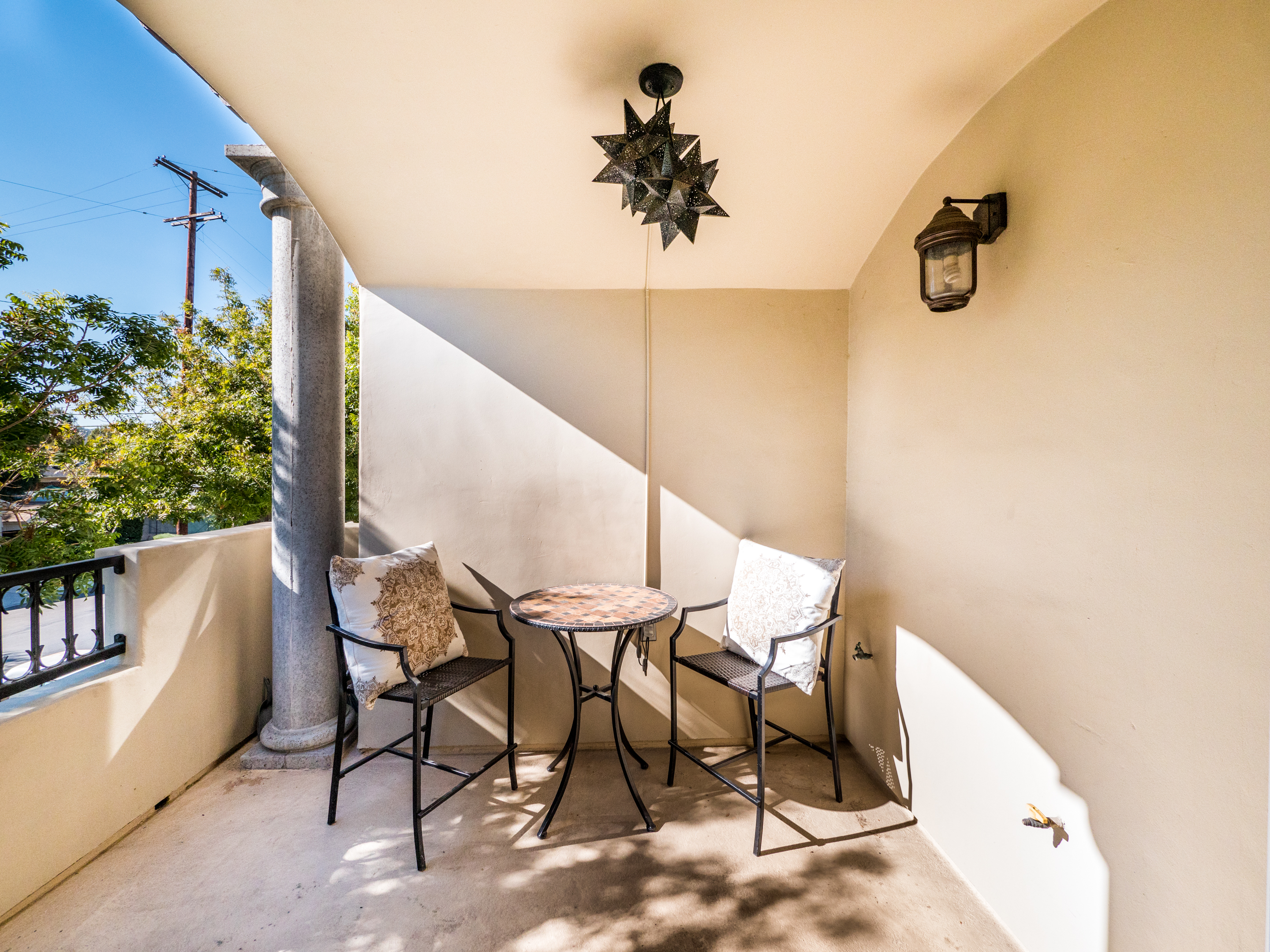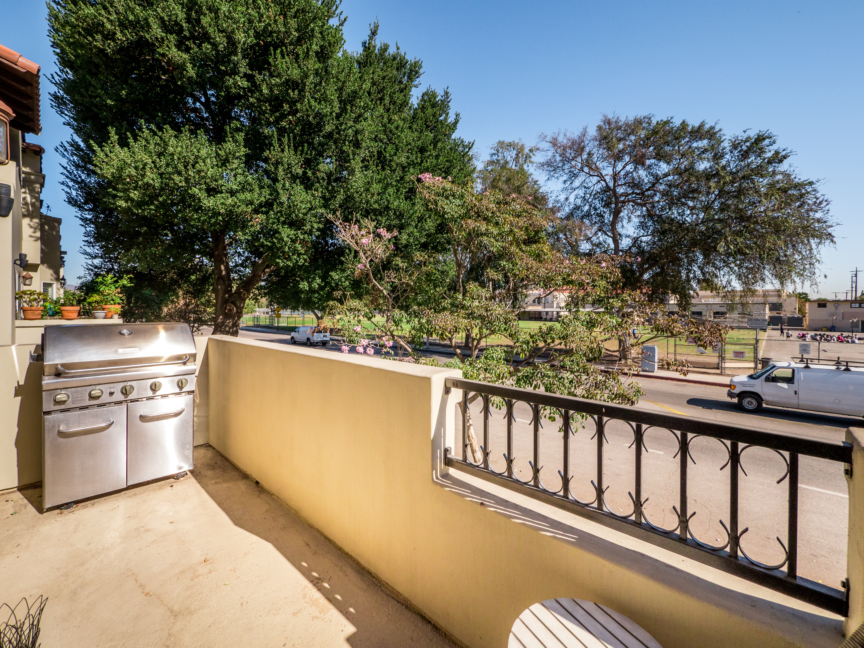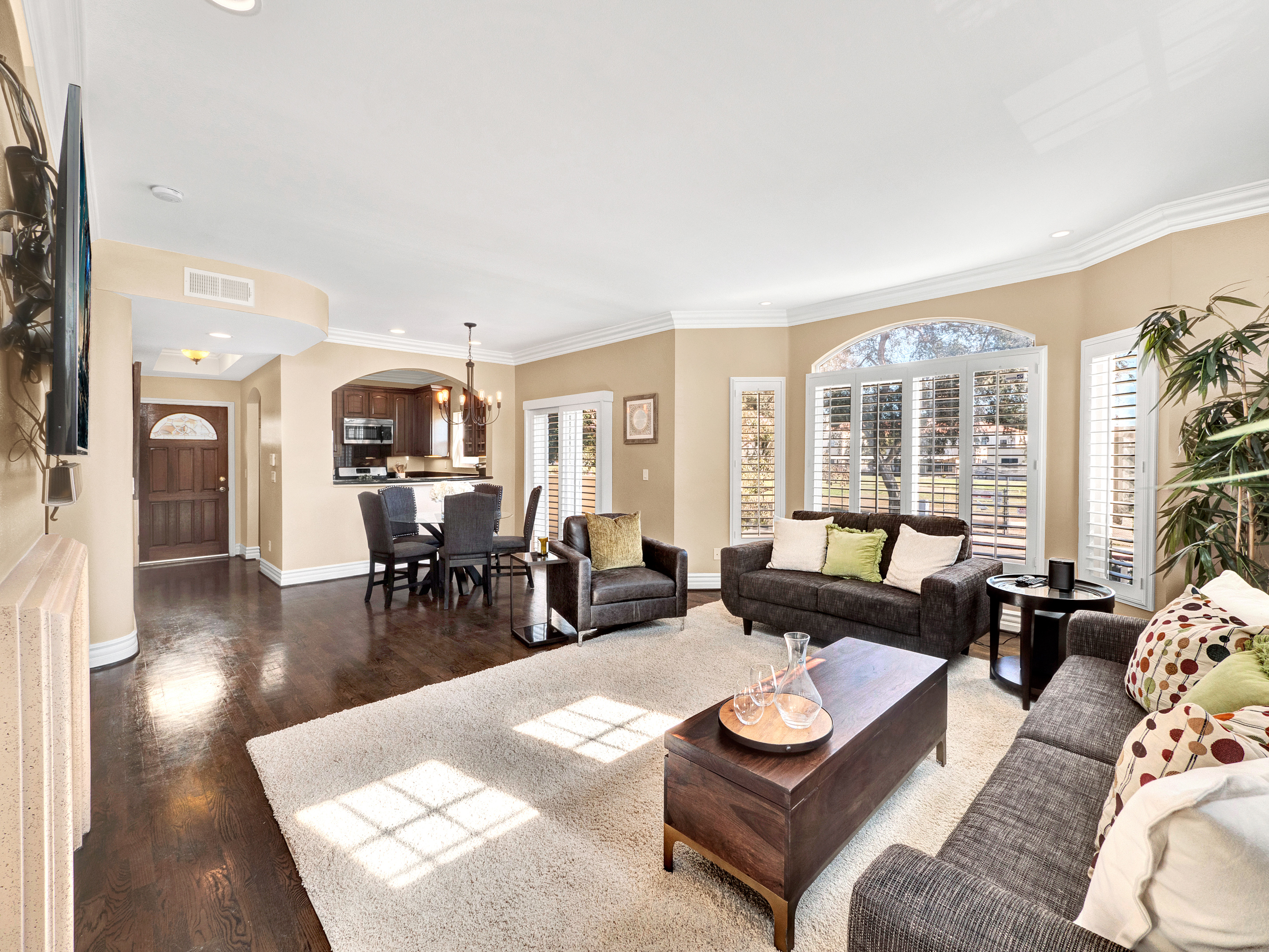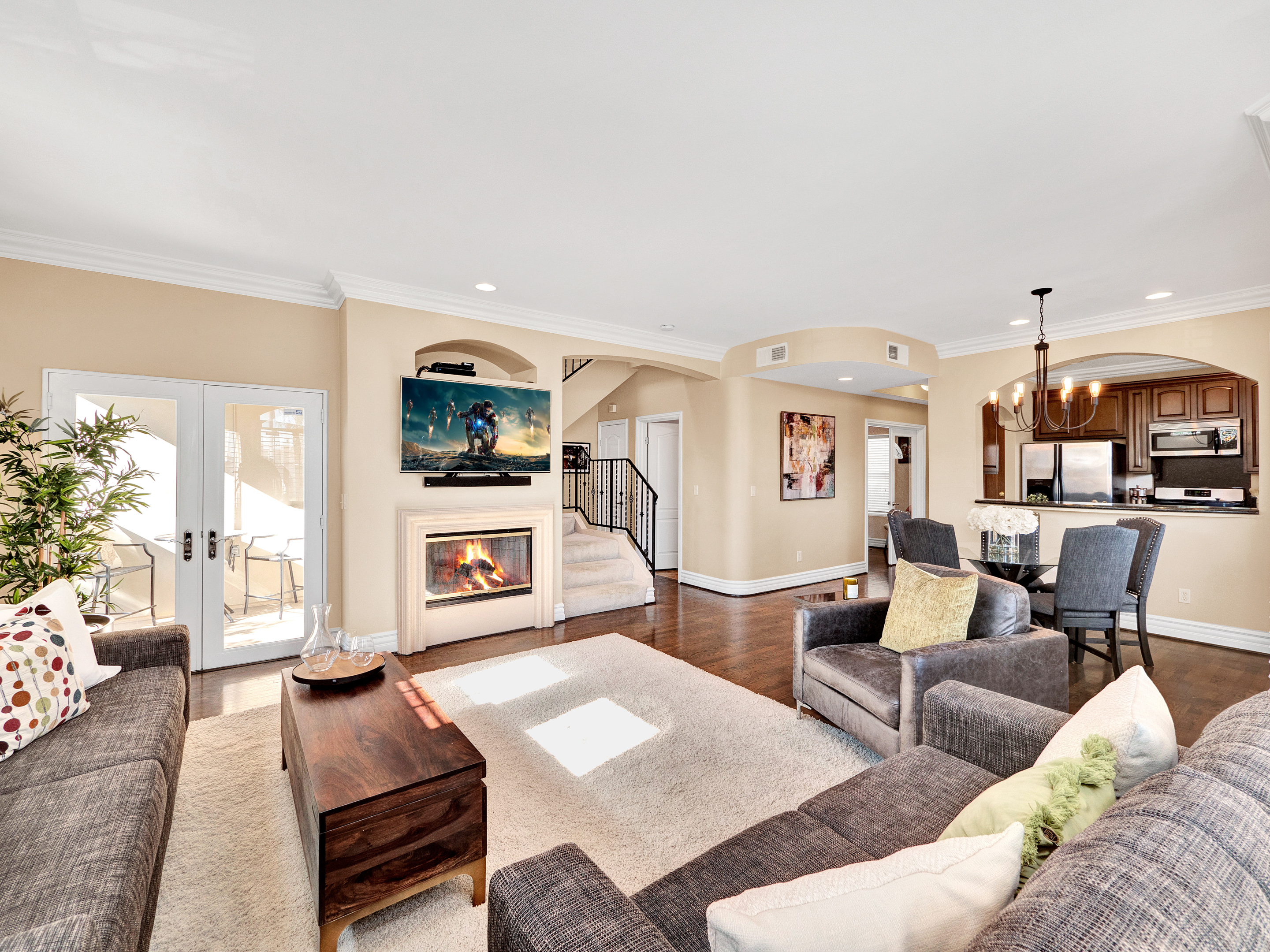 Mediterranean style townhome located in the highly desirable Colfax Elementary school district in Studio City. The buildings secured entry opens to a lush courtyard with palm trees and tranquil fountain. The home's main level has an open floor plan with wood floors, high ceilings, and an abundance of windows with plantation shutters, flooding the space with natural light. The kitchen features granite countertops, stainless steel appliances, and a breakfast bar that opens to the spacious dining area and living room. The living space has a sophisticated fireplace, crown molding, and 2 balconies, perfect for cool breezes and outdoor dining. Also on the main level is one of the three bedrooms, ideal for an office space or guest room, and a ¾ bath. Upstairs there are 2 master suites, both with walk-in closets and high ceilings. The main master bedroom boasts striking beamed ceiling, an additional fireplace and a balcony, making it truly luxurious. Other features include private, attached 2-car garage, washer/dryer in unit, and separate guest parking. Moments from the charming shops and restaurants of Tujunga Village, and conveniently located to the Studios and Ventura Blvd, don't miss this amazing home!