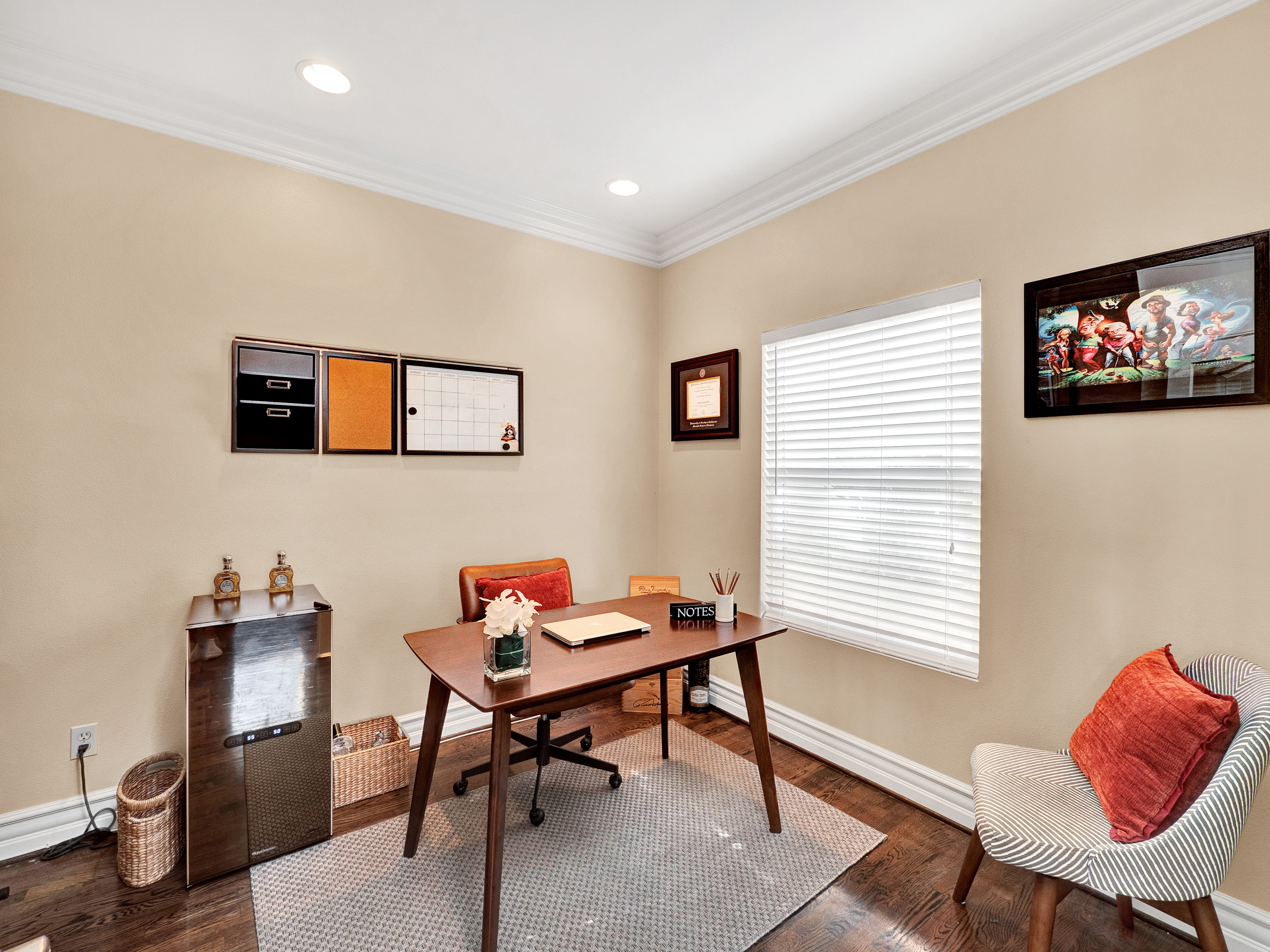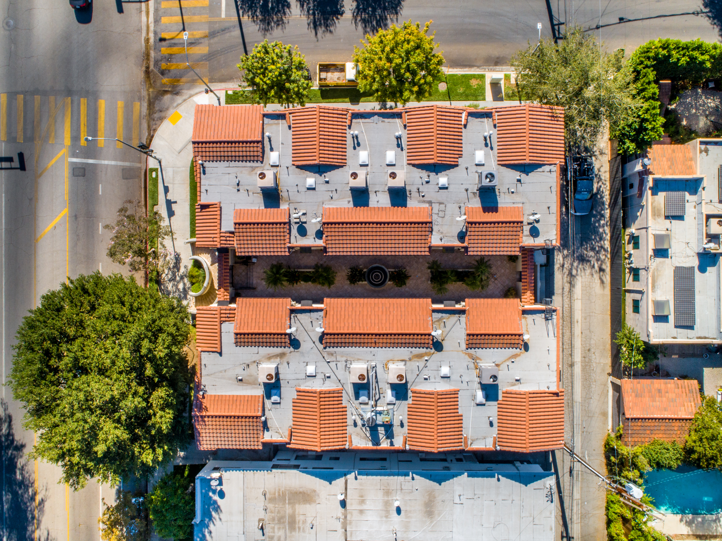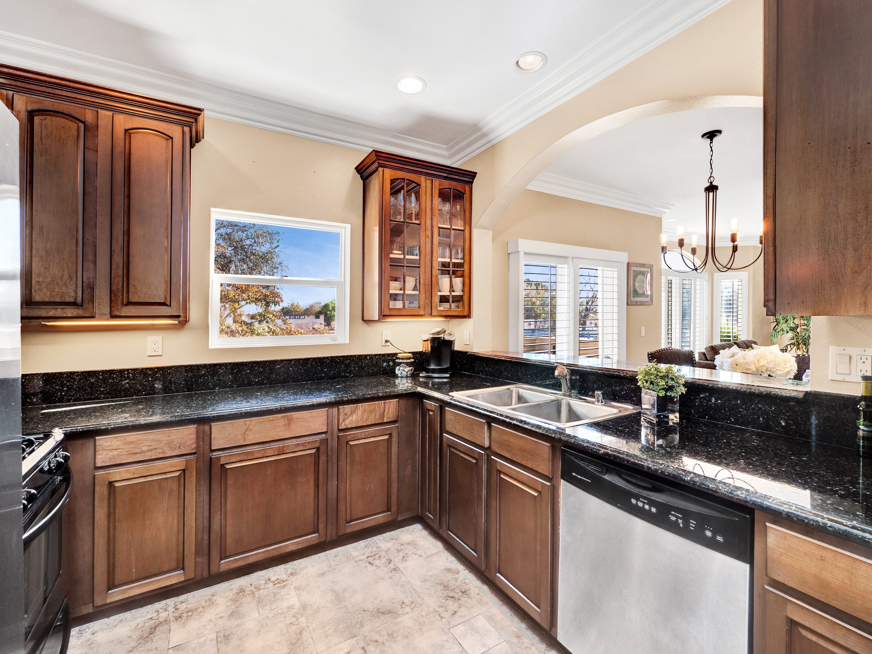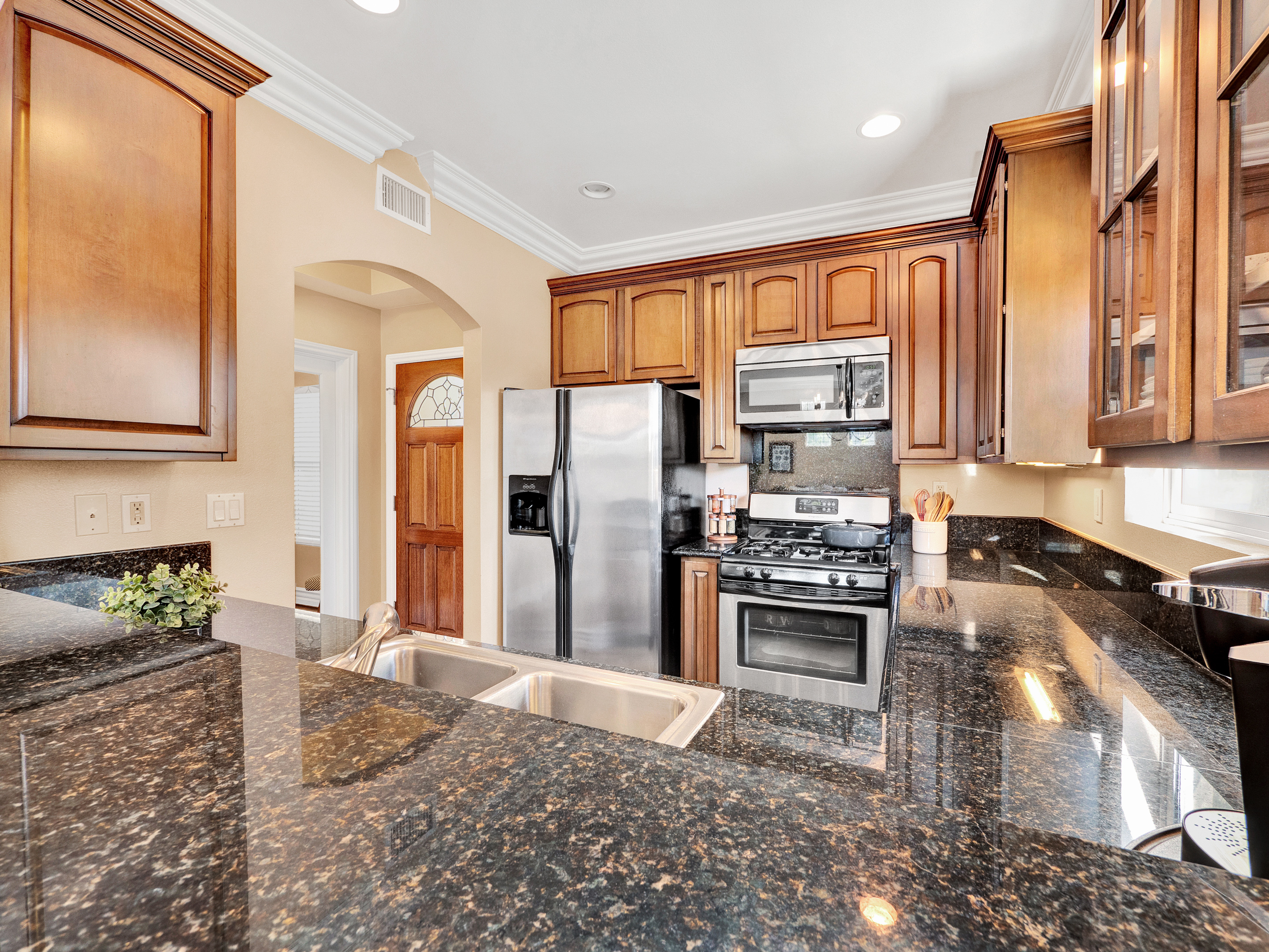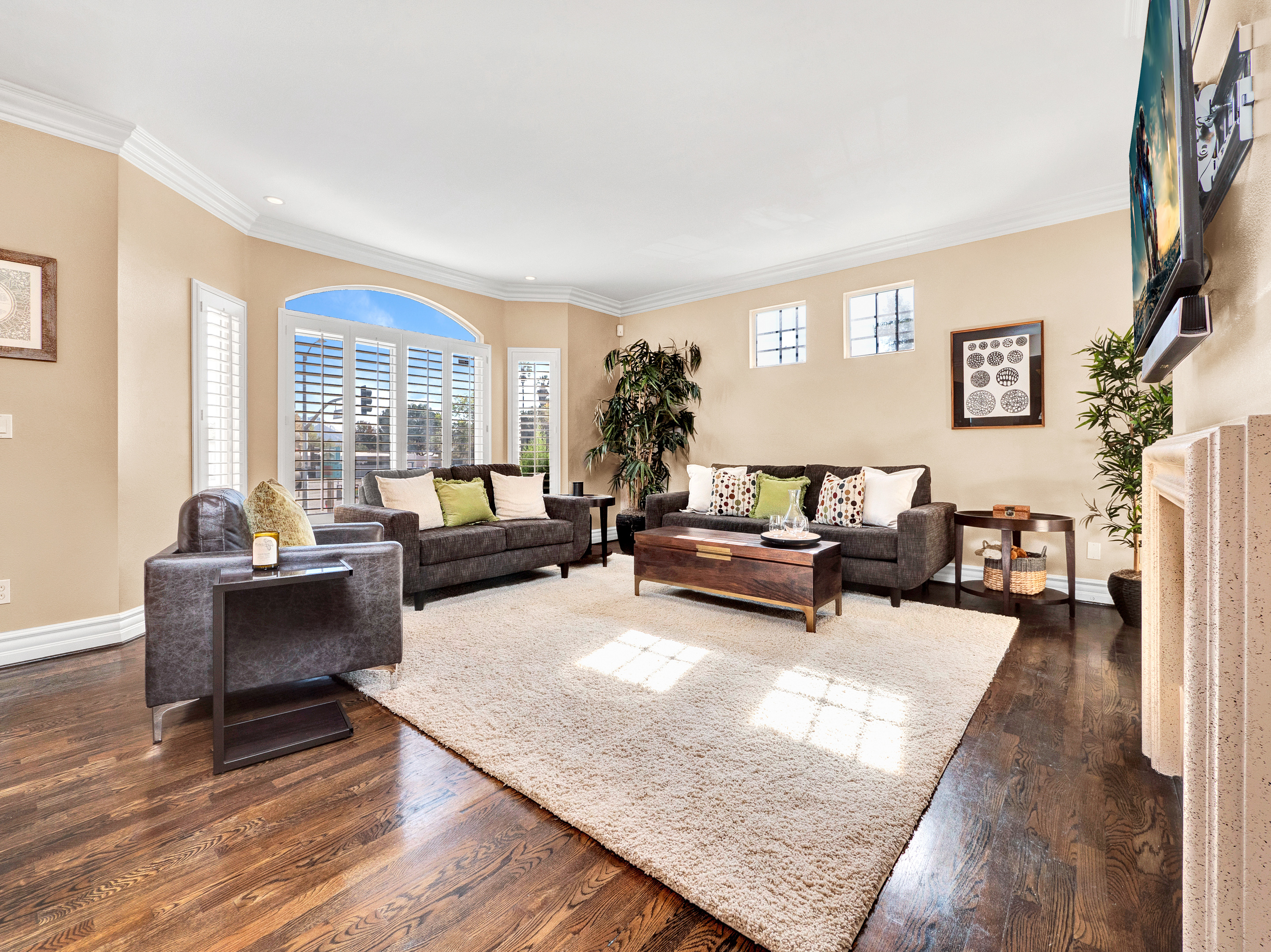Mediterranean style townhome located in the highly desirable Colfax Elementary school district in Studio City. The buildings secured entry opens to a lush courtyard with palm trees and tranquil fountain. The home's main level has an open floor plan with wood floors, high ceilings, and an abundance of windows with plantation shutters, flooding the space with natural light. The kitchen features granite countertops, stainless steel appliances, and a breakfast bar that opens to the spacious dining area and living room. The living space has a sophisticated fireplace, crown molding, and 2 balconies, perfect for cool breezes and outdoor dining. Also on the main level is one of the three bedrooms, ideal for an office space or guest room, and a ¾ bath. Upstairs there are 2 master suites, both with walk-in closets and high ceilings. The main master bedroom boasts striking beamed ceiling, an additional fireplace and a balcony, making it truly luxurious. Other features include private, attached 2-car garage, washer/dryer in unit, and separate guest parking. Moments from the charming shops and restaurants of Tujunga Village, and conveniently located to the Studios and Ventura Blvd, don't miss this amazing home!