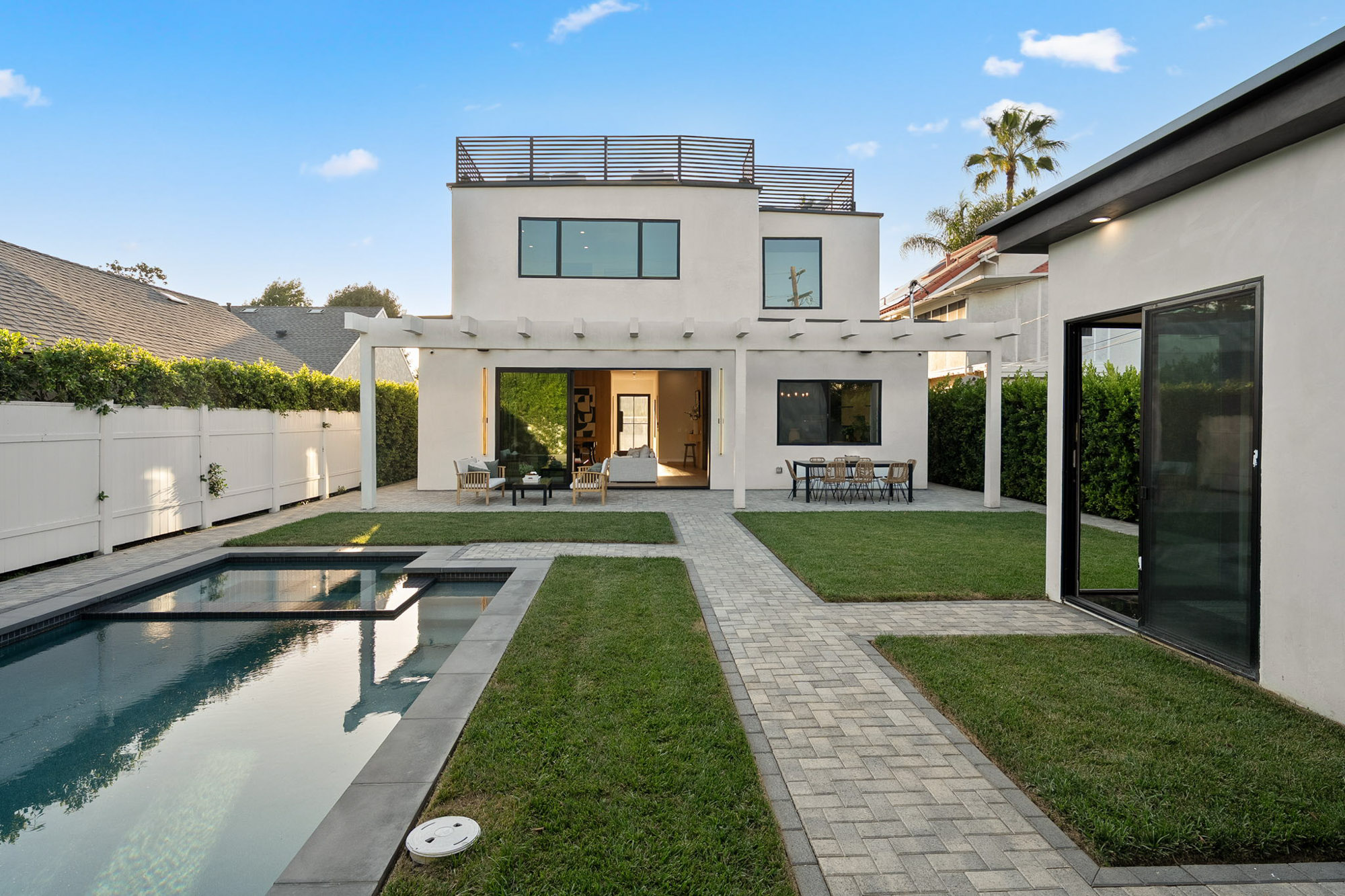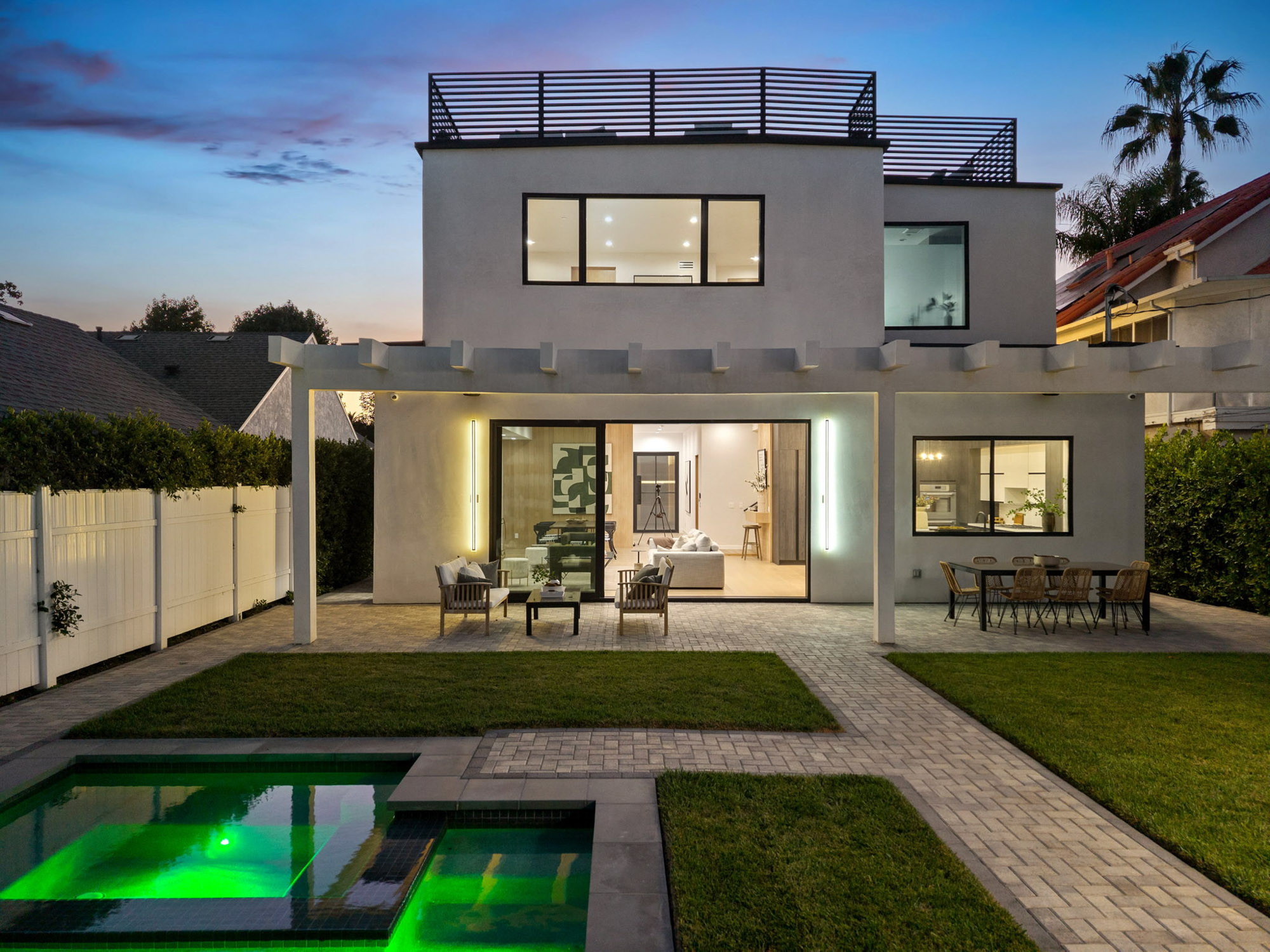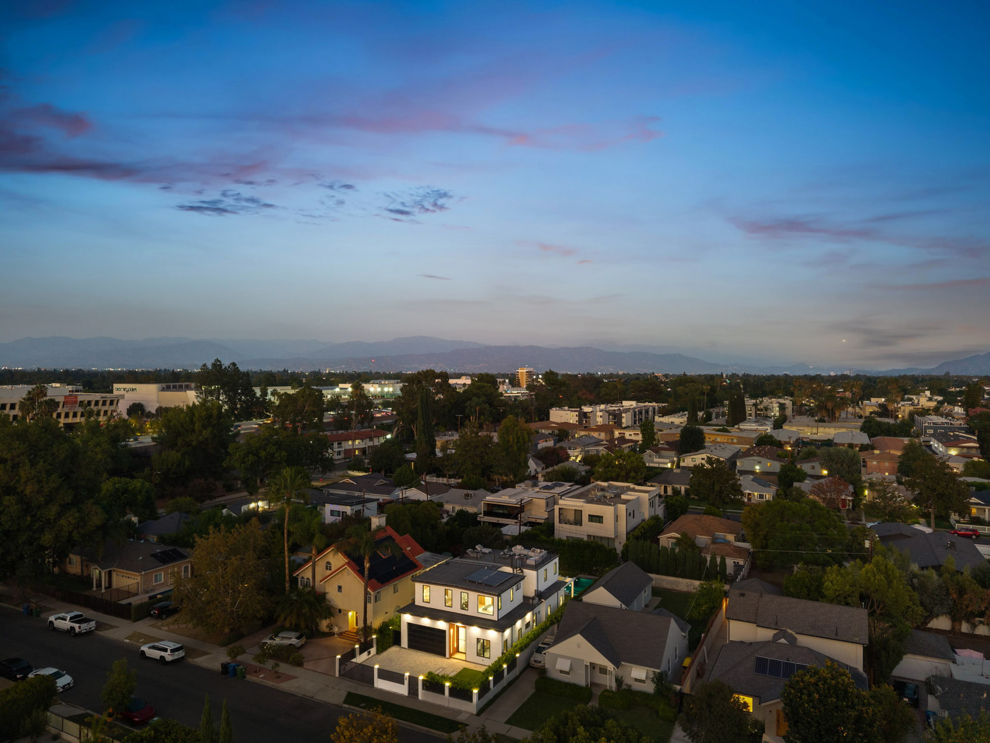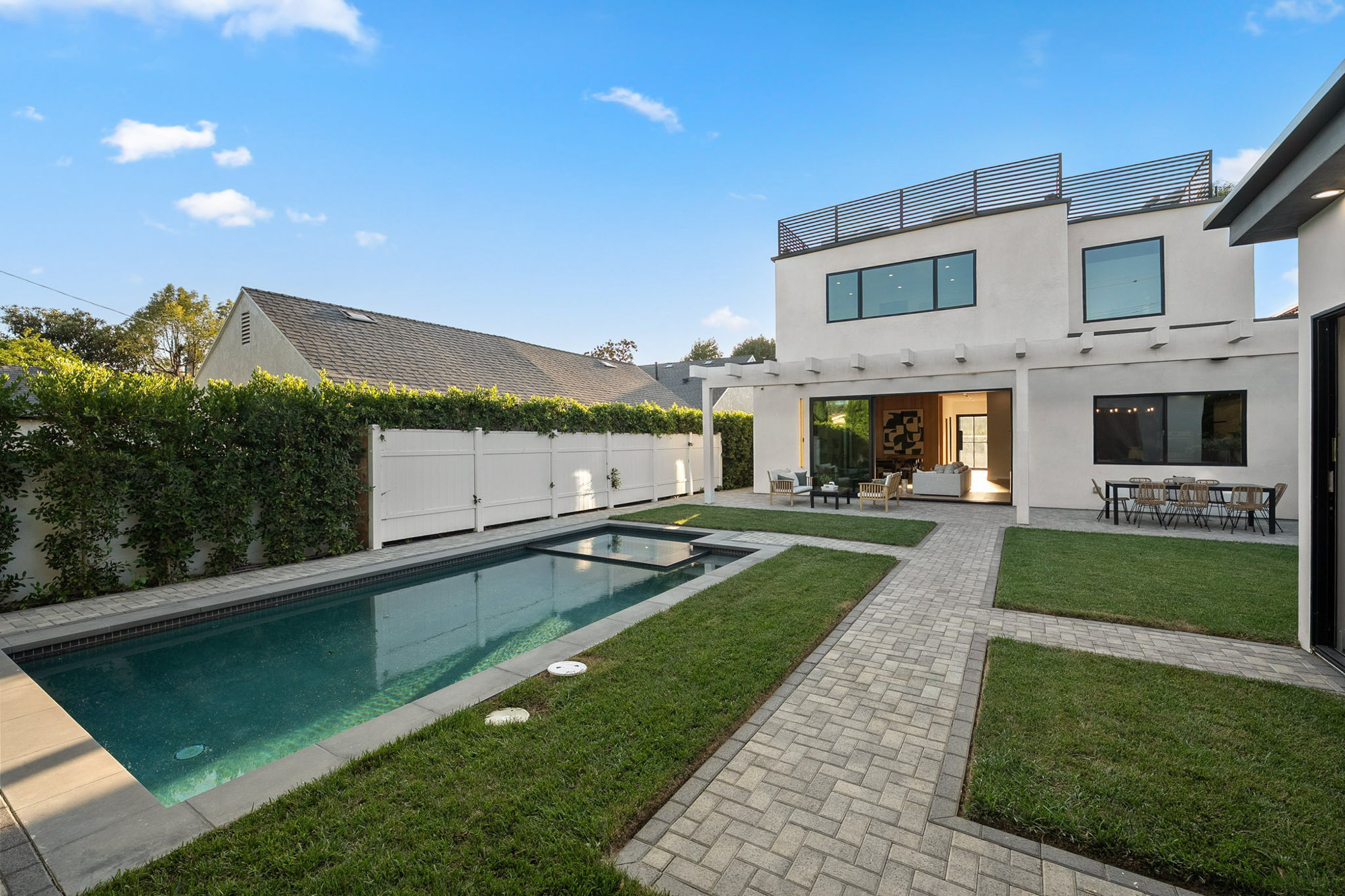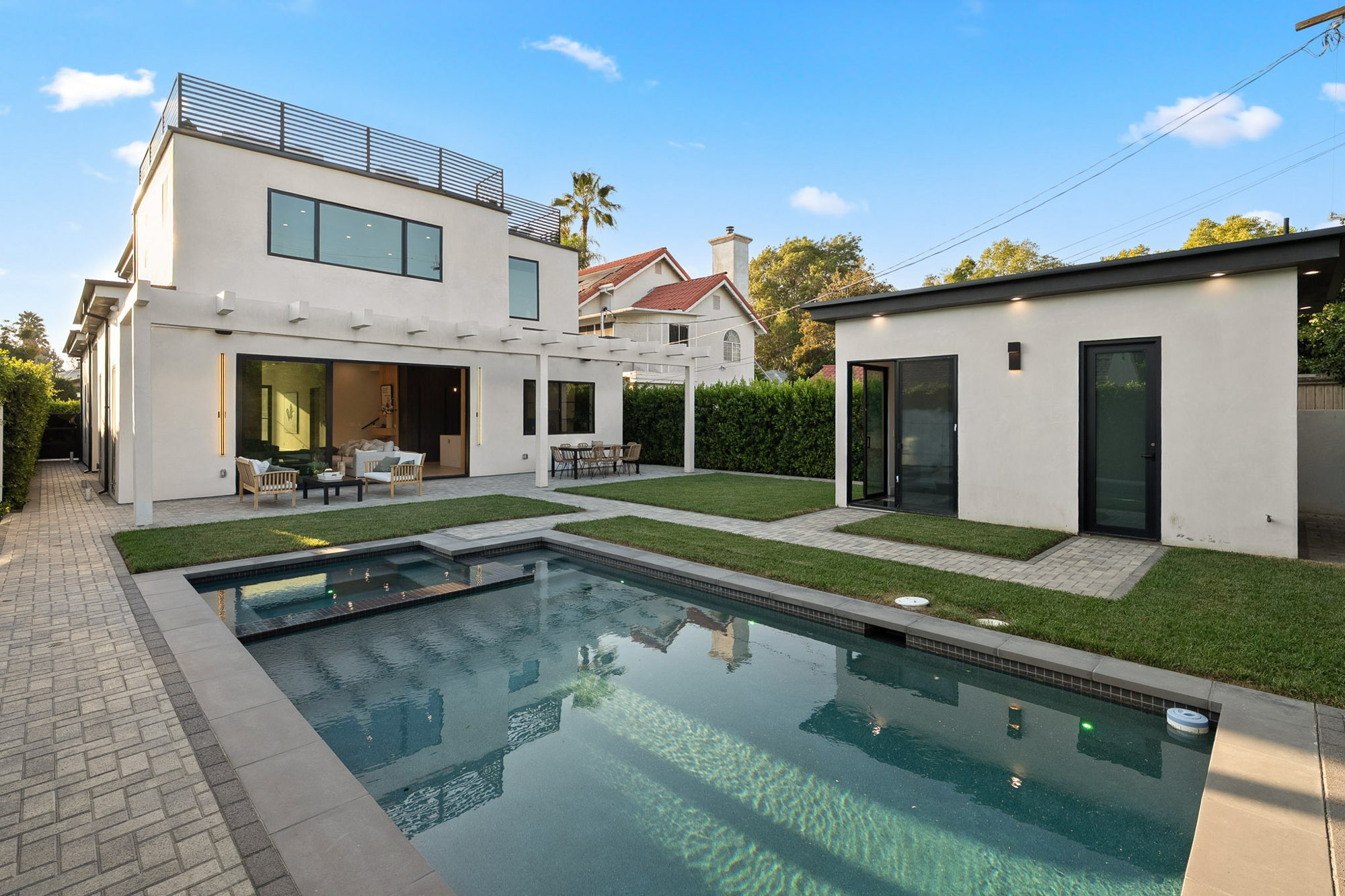 Newly constructed in 2024 this gated home sits behind hedges in the coveted and convenient Library Square area of Sherman Oaks. Fresh wide plank white oak hardwood floors look stylish and contemporary, From the impressive entrance with oversized pivot door to the smart home system that controls lighting, speakers and cameras, to the micro cement paint this contemporary home feels well built. The first floor features a custom kitchen with new Thermador appliances, wood paneling, an open floor plan with a living room fireplace and bifold glass doors that create an indoor-outdoor experience with the backyard and pool. The first floor has an office with an ensuite full bath and laundry room. On the second floor are 3 spacious, light-filled bedrooms, The ensuite washrooms finished with the most stylish materials currently available and to a very high standard. Double paned windows, high efficiency central heat and air conditioning, and solar panels create a comfortable and energy efficient home. A pool house with a full bath is the perfect place for kids to play or to rinse off after a swim. Finally, the rooftop deck offers jaw dropping views of the friendly neighborhood.
