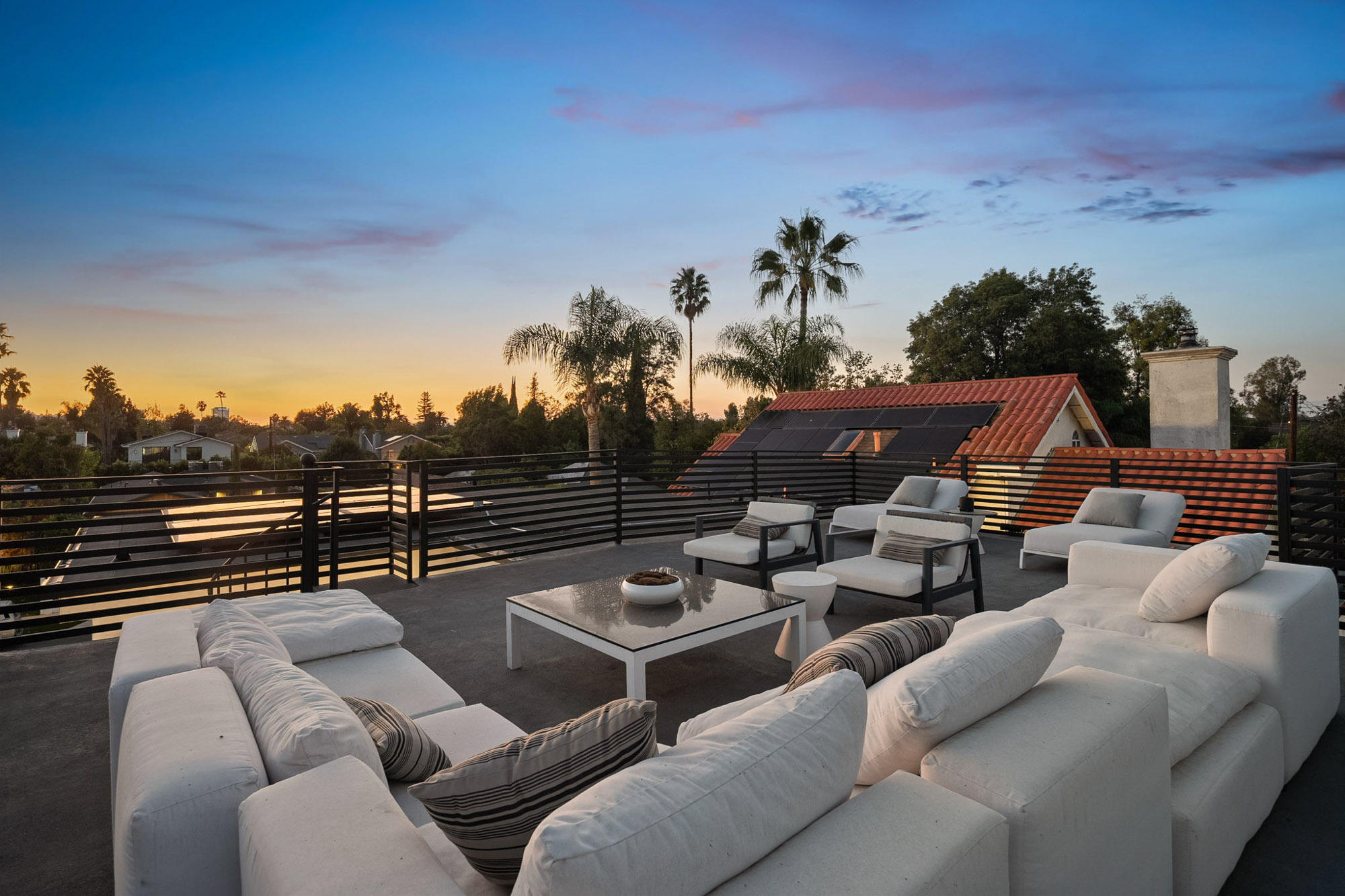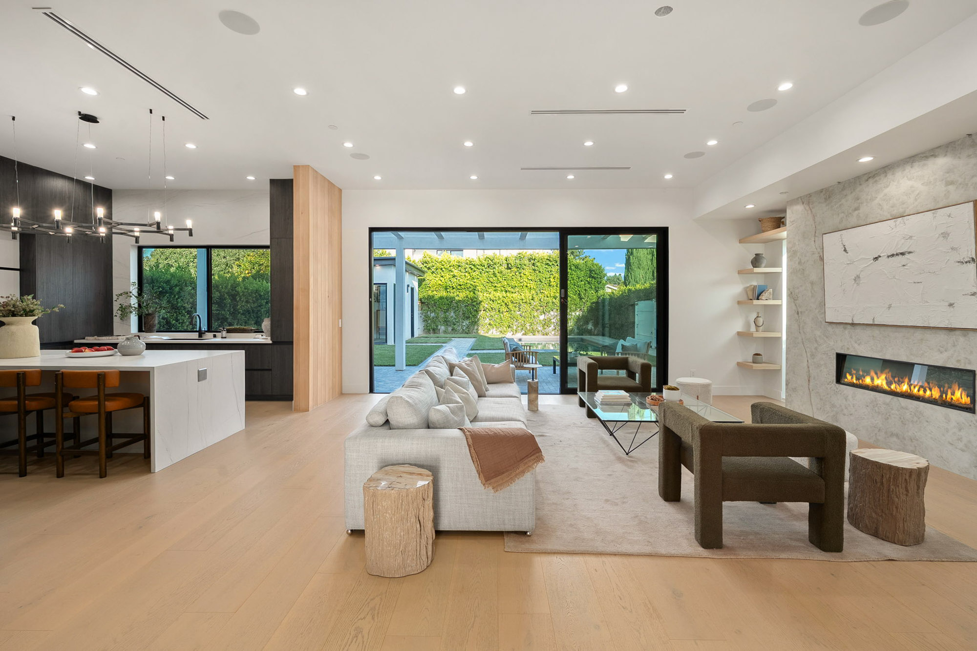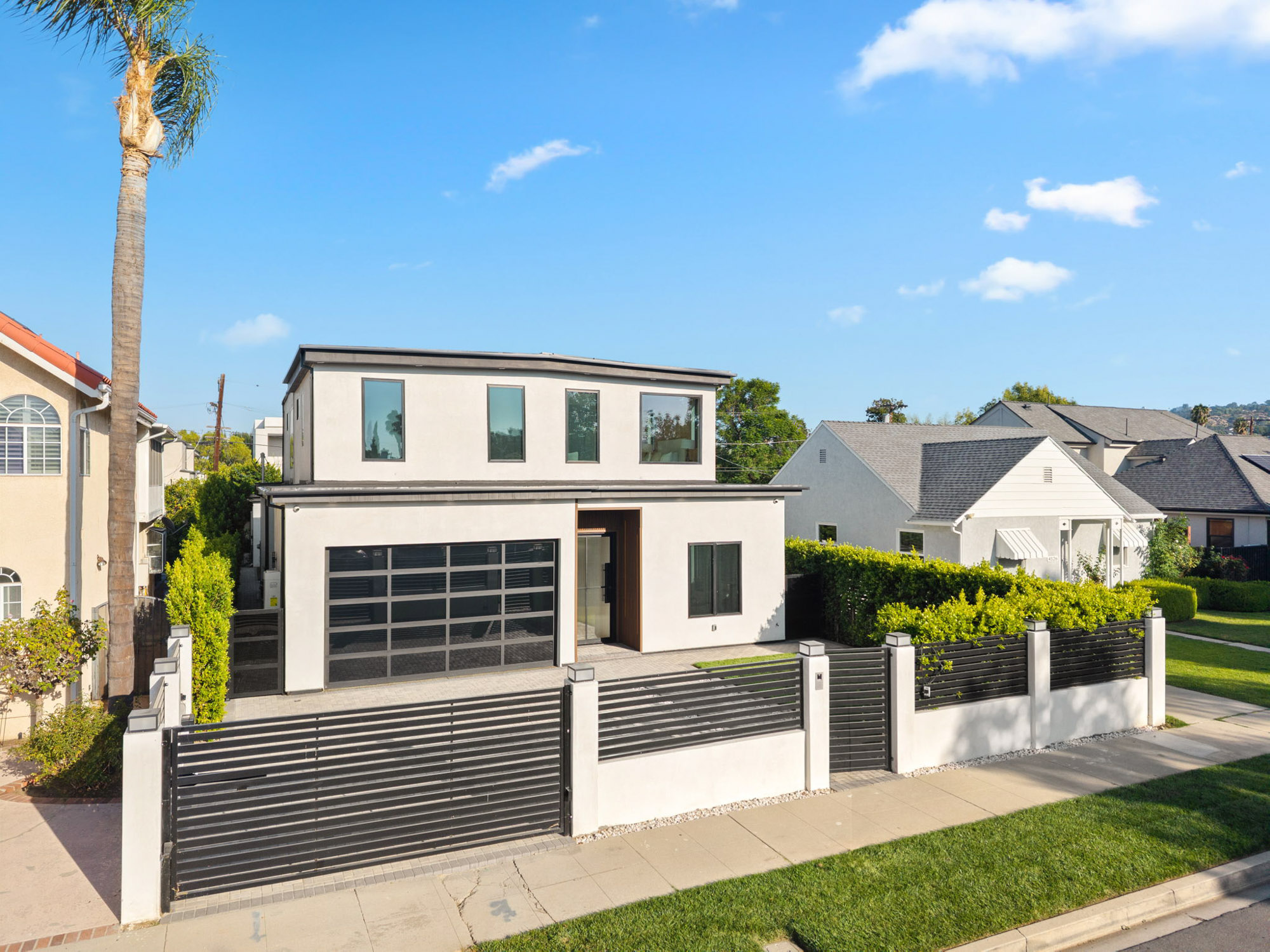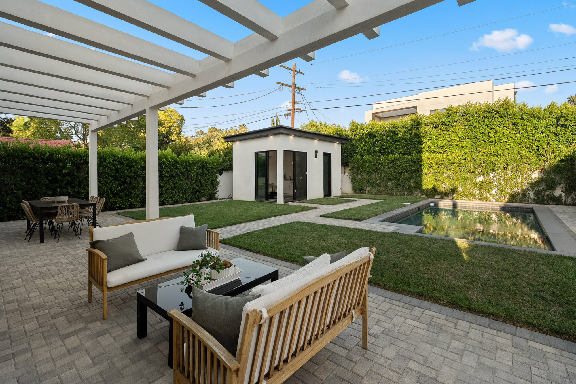 Newly constructed in 2024 this gated home sits behind hedges in the coveted and convenient Library Square area of Sherman Oaks. Fresh wide plank white oak hardwood floors look stylish and contemporary, From the impressive entrance with oversized pivot door to the smart home system that controls lighting, speakers and cameras, to the micro cement paint this contemporary home feels well built. The first floor features a custom kitchen with new Thermador appliances, wood paneling, an open floor plan with a living room fireplace and bifold glass doors that create an indoor-outdoor experience with the backyard and pool. The first floor has an office with an ensuite full bath and laundry room. On the second floor are 3 spacious, light-filled bedrooms, The ensuite washrooms finished with the most stylish materials currently available and to a very high standard. Double paned windows, high efficiency central heat and air conditioning, and solar panels create a comfortable and energy efficient home. A pool house with a full bath is the perfect place for kids to play or to rinse off after a swim. Finally, the rooftop deck offers jaw dropping views of the friendly neighborhood.