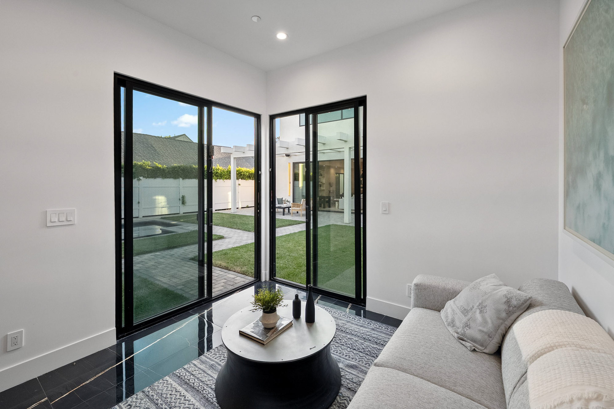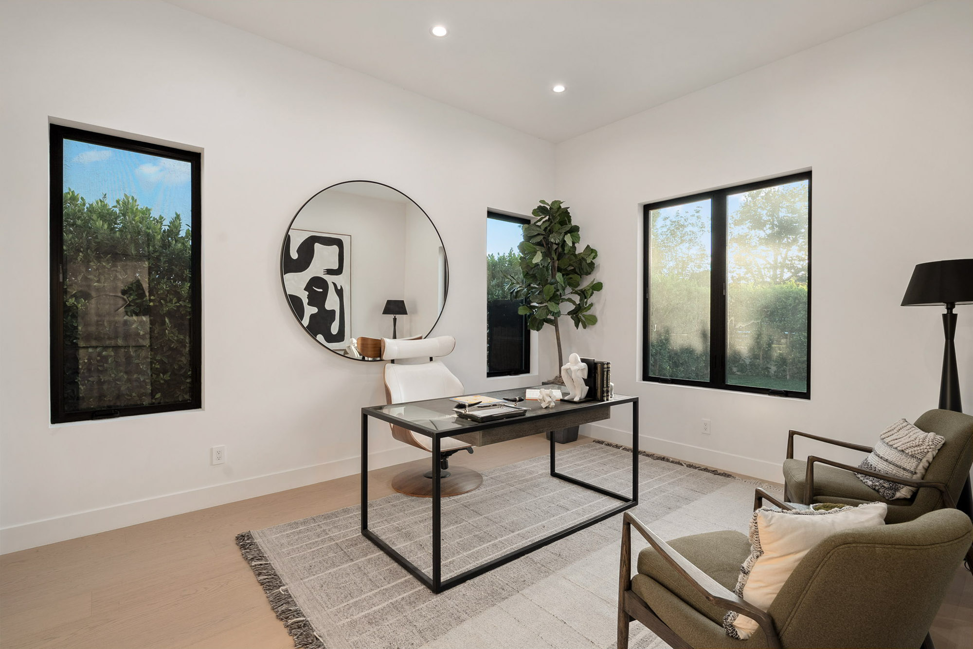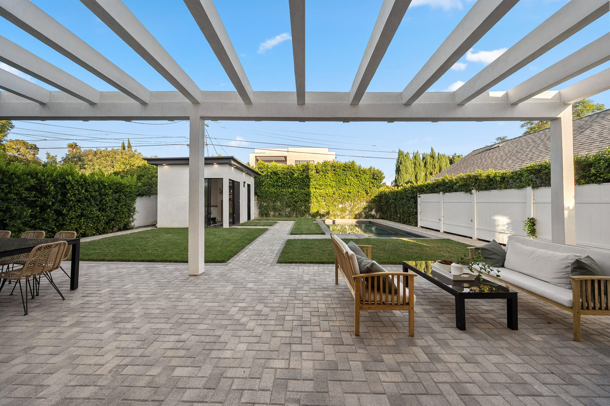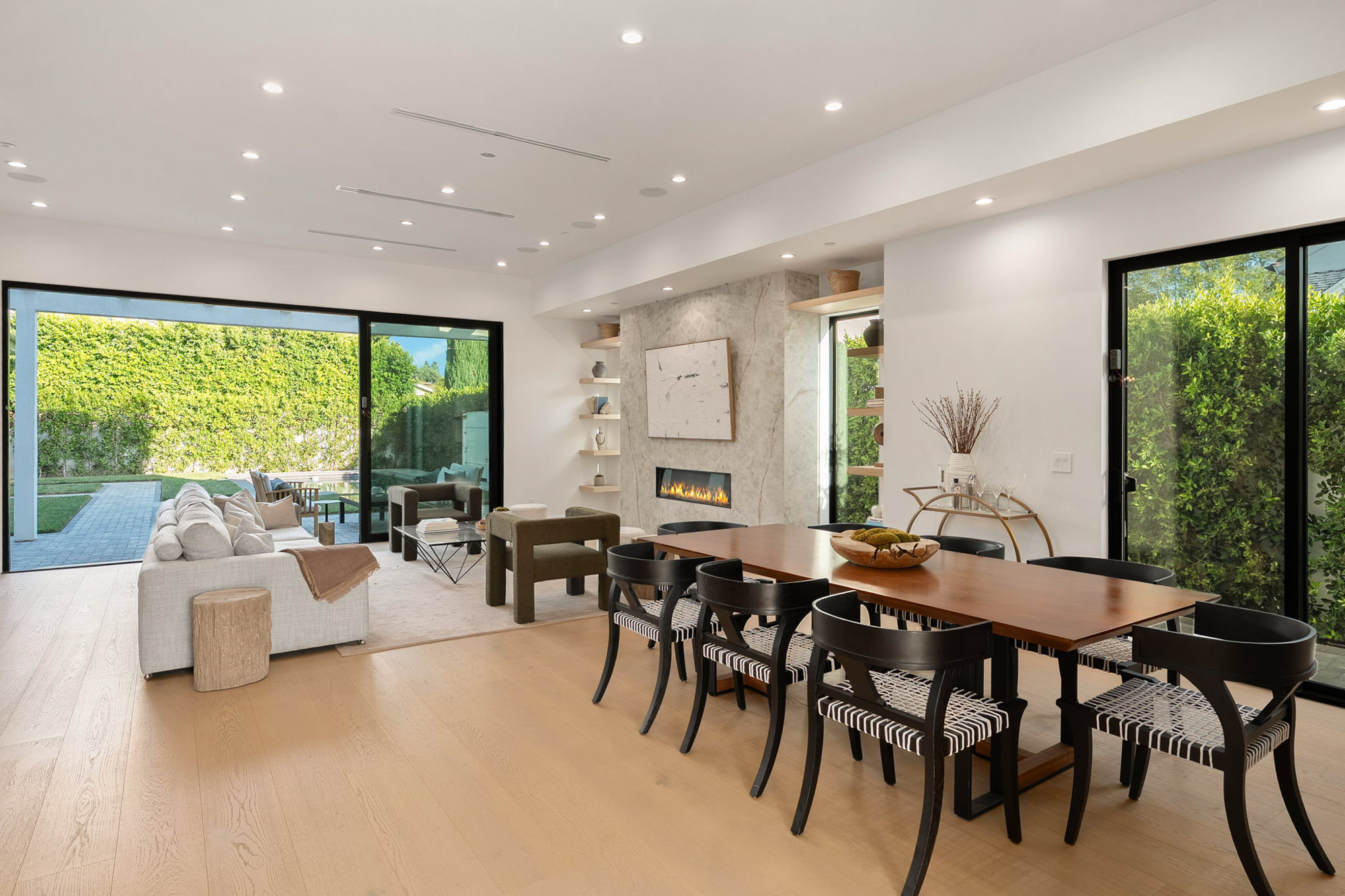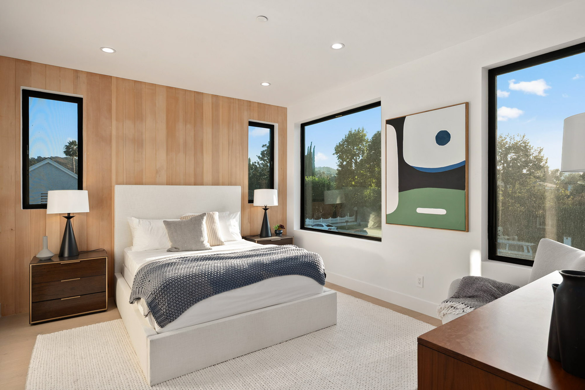 Newly constructed in 2024 this gated home sits behind hedges in the coveted and convenient Library Square area of Sherman Oaks. Fresh wide plank white oak hardwood floors look stylish and contemporary, From the impressive entrance with oversized pivot door to the smart home system that controls lighting, speakers and cameras, to the micro cement paint this contemporary home feels well built. The first floor features a custom kitchen with new Thermador appliances, wood paneling, an open floor plan with a living room fireplace and bifold glass doors that create an indoor-outdoor experience with the backyard and pool. The first floor has an office with an ensuite full bath and laundry room. On the second floor are 3 spacious, light-filled bedrooms, The ensuite washrooms finished with the most stylish materials currently available and to a very high standard. Double paned windows, high efficiency central heat and air conditioning, and solar panels create a comfortable and energy efficient home. A pool house with a full bath is the perfect place for kids to play or to rinse off after a swim. Finally, the rooftop deck offers jaw dropping views of the friendly neighborhood.