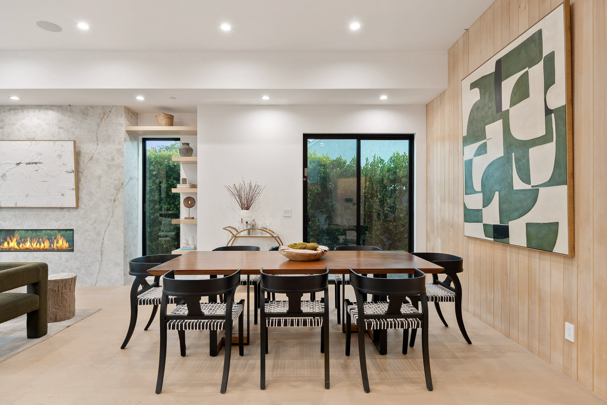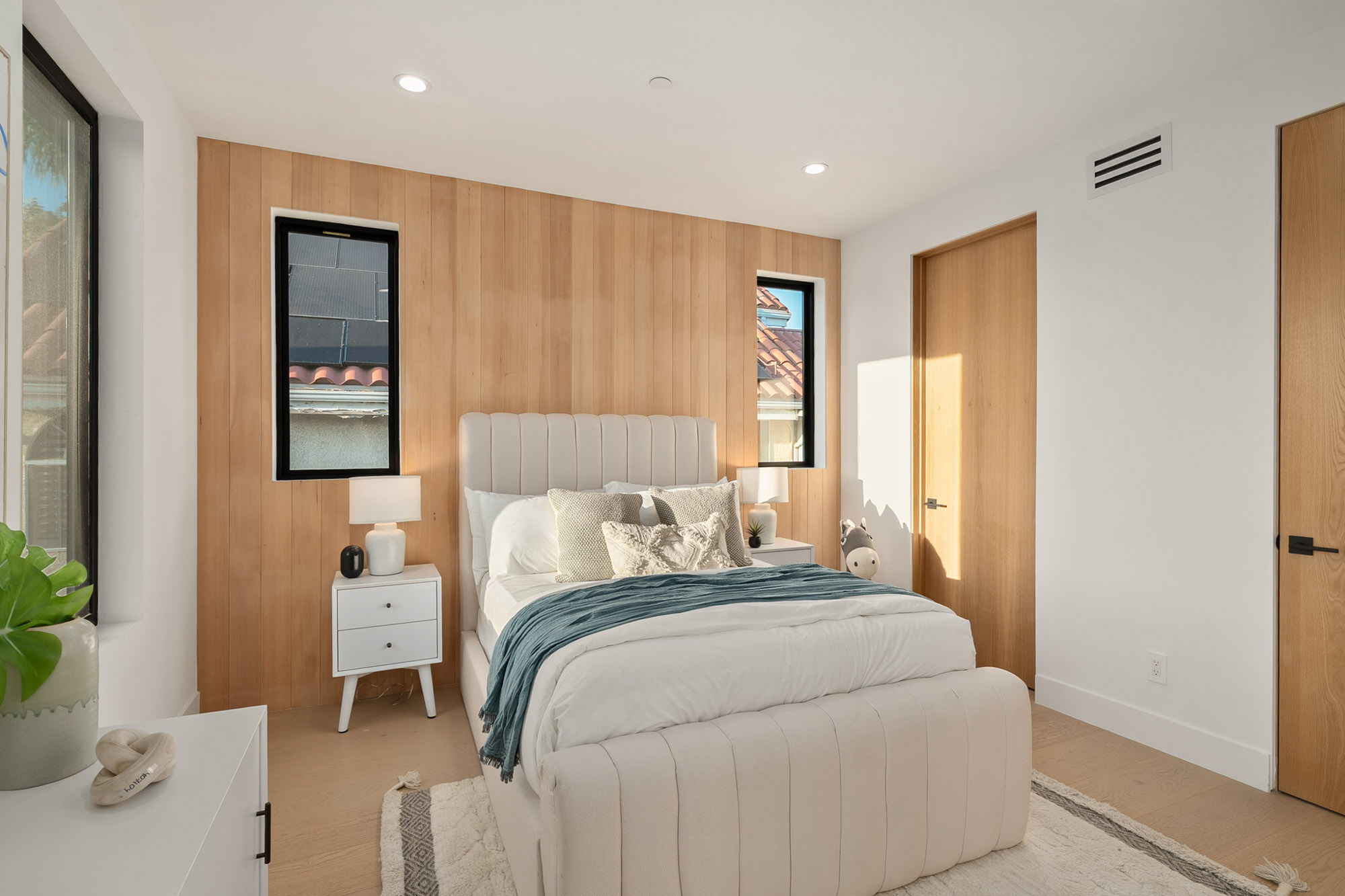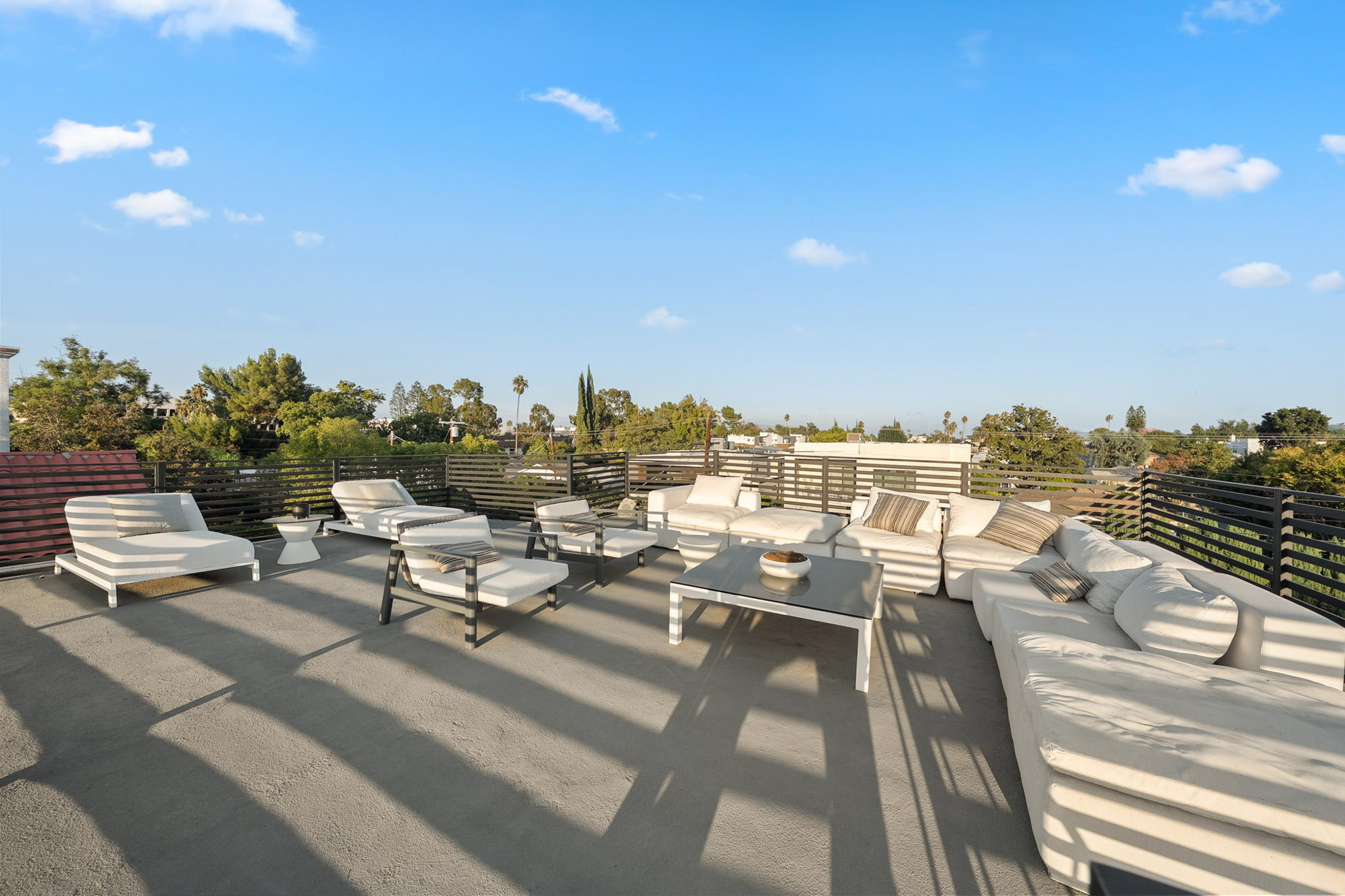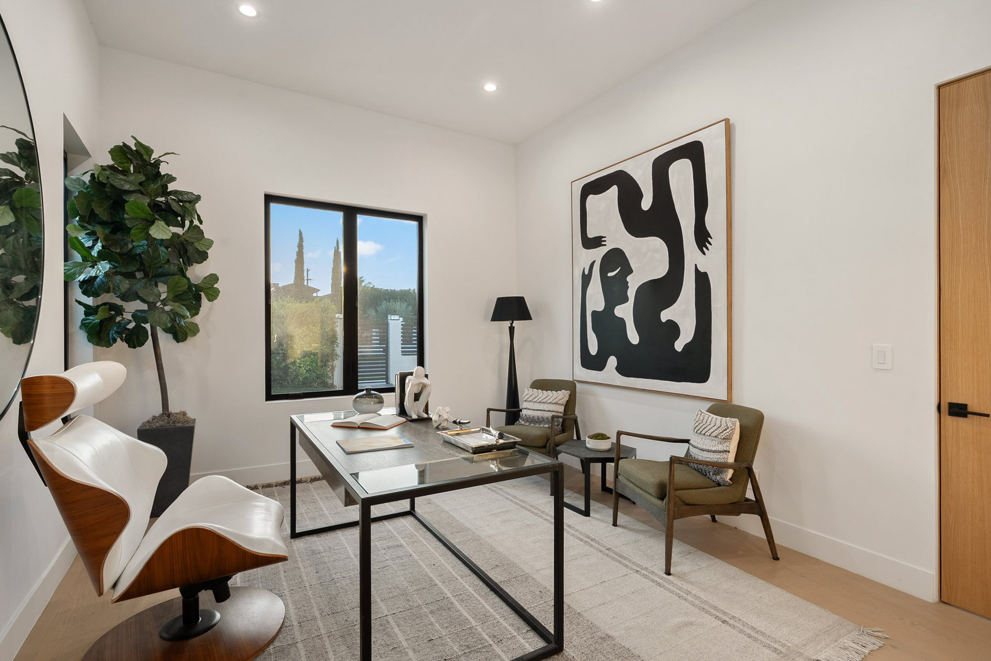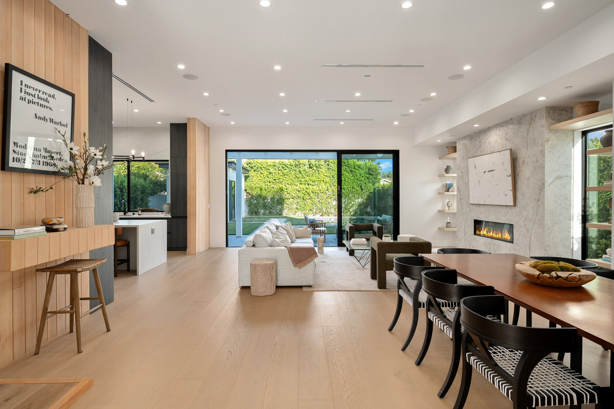 Newly constructed in 2024 this gated home sits behind hedges in the coveted and convenient Library Square area of Sherman Oaks. Fresh wide plank white oak hardwood floors look stylish and contemporary, From the impressive entrance with oversized pivot door to the smart home system that controls lighting, speakers and cameras, to the micro cement paint this contemporary home feels well built. The first floor features a custom kitchen with new Thermador appliances, wood paneling, an open floor plan with a living room fireplace and bifold glass doors that create an indoor-outdoor experience with the backyard and pool. The first floor has an office with an ensuite full bath and laundry room. On the second floor are 3 spacious, light-filled bedrooms, The ensuite washrooms finished with the most stylish materials currently available and to a very high standard. Double paned windows, high efficiency central heat and air conditioning, and solar panels create a comfortable and energy efficient home. A pool house with a full bath is the perfect place for kids to play or to rinse off after a swim. Finally, the rooftop deck offers jaw dropping views of the friendly neighborhood.