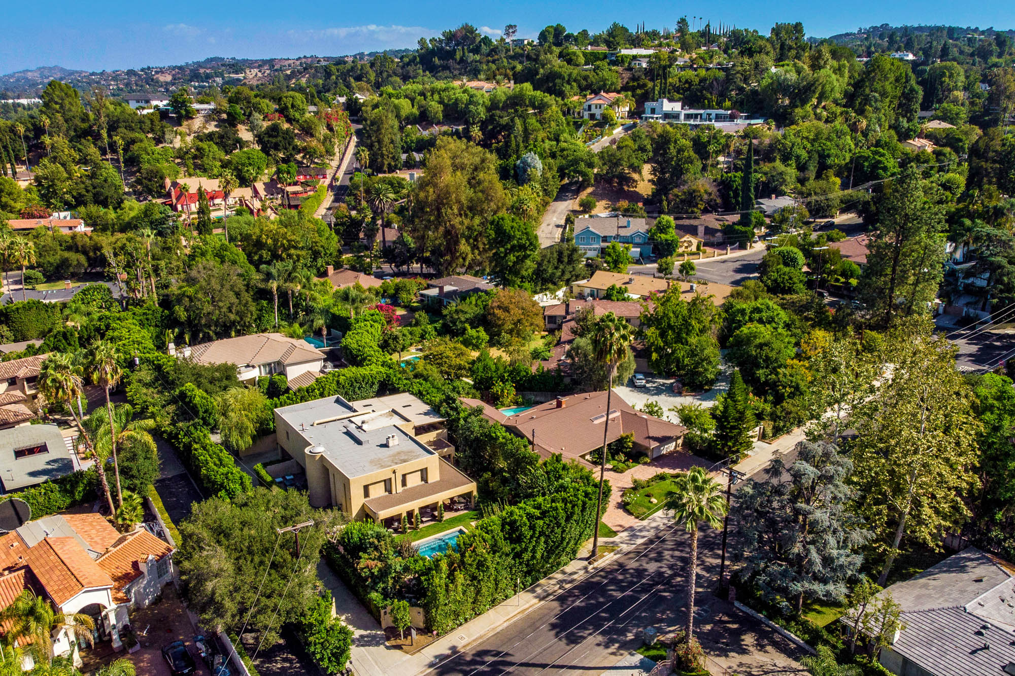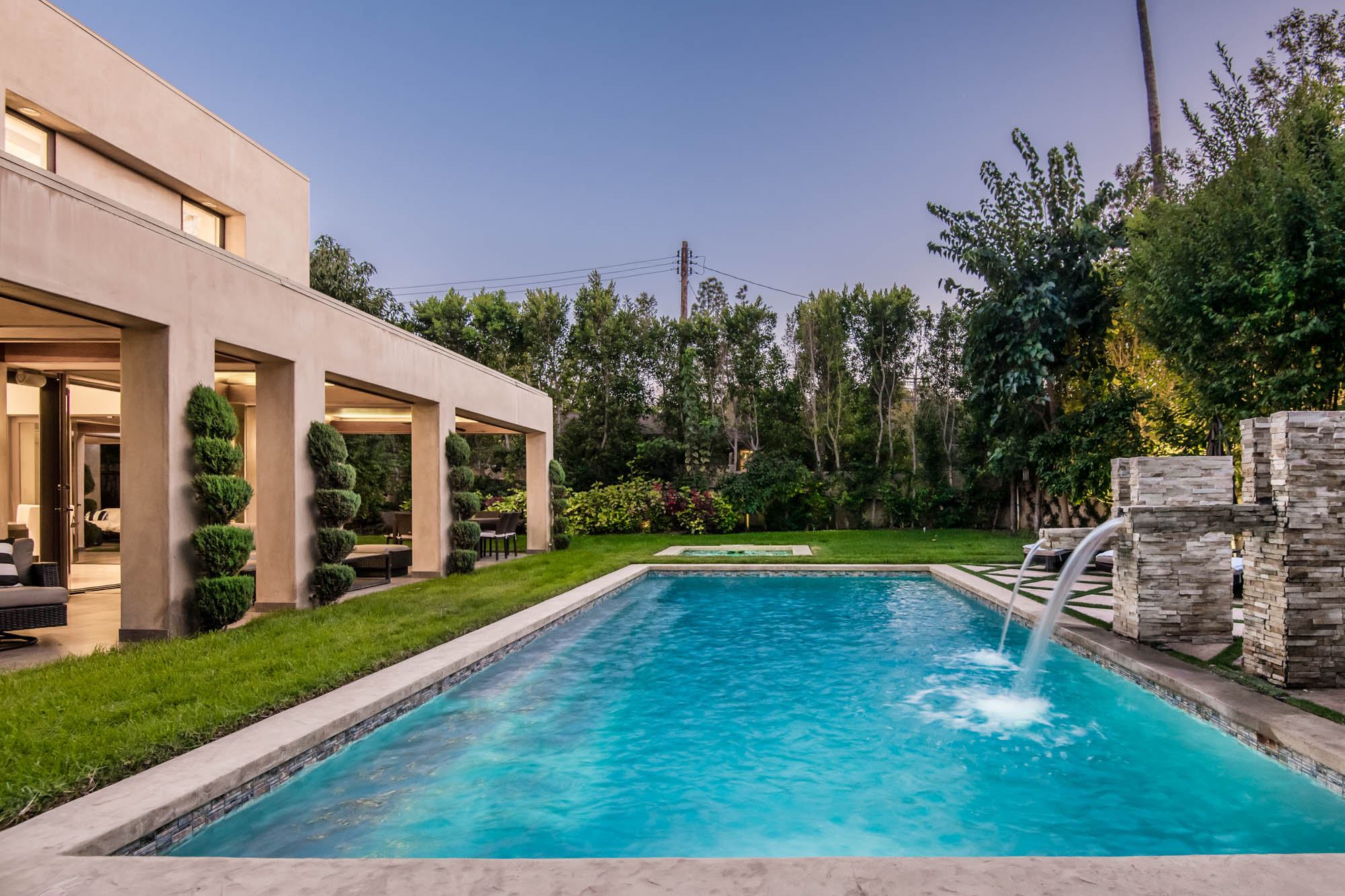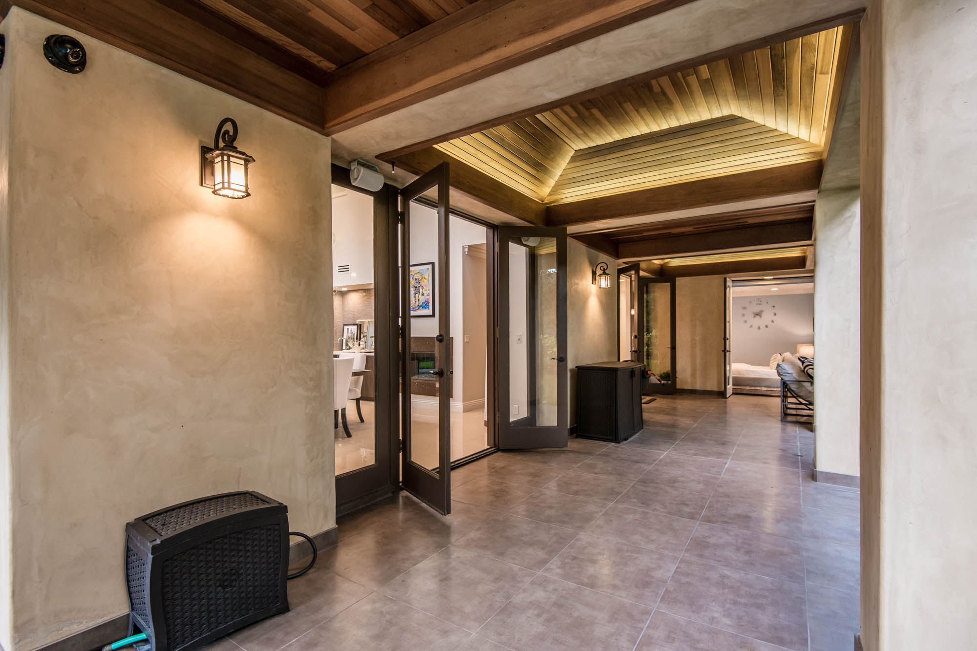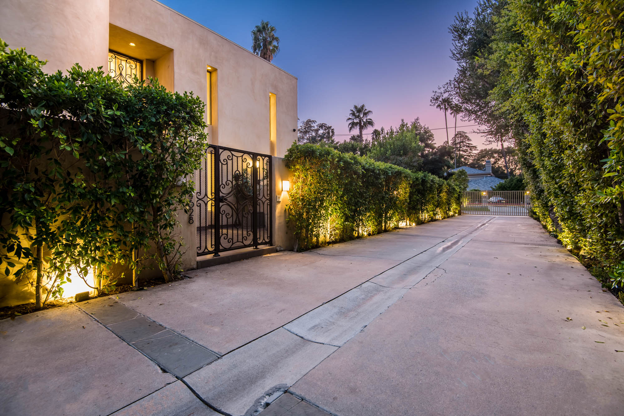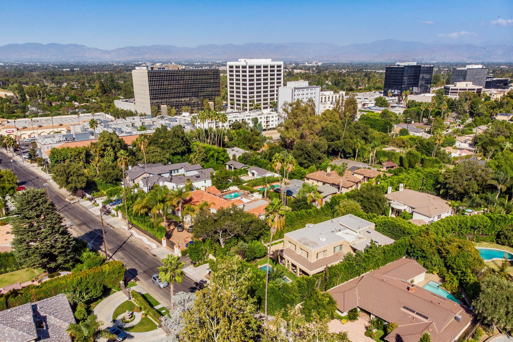 Dramatic Willis Fagan A.I.A. architectural set amongst lush, private grounds in prime Encino. Set behind a secure gated entrance this home features a 2 story living/dining room w/ wet bar & fireplace, chef's dream kitchen, equipped with Viking appliances, large island w/ prep sink, & ample cabinetry. Adjacent to the kitchen is a family room w/ fireplace, ideal for movie nights. The main level continues w/ 4 bd, 2.5 ba, & laundry room. Upstairs, the master suite has a formal sitting area w/ fireplace & built-in entertainment center, a generously sized bedroom, spa style bathroom w/ Mr. Steam sauna shower, jacuzzi tub & 2 massive walk-in closets. The suite opens to a huge private covered patio. The 2nd upstairs bedroom includes built in storage, & ensuite bath. Outside, the backyard has plenty of covered patio space w/ hand crafted wood ceilings. Pool w/ fountains & separate spa are framed by grassy yards & verdant landscape including a variety of fruit trees. Lanai Rd School district.