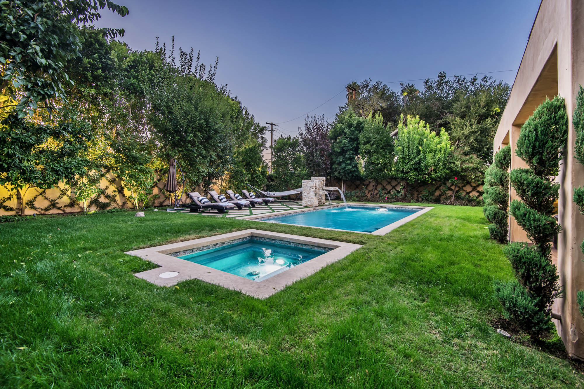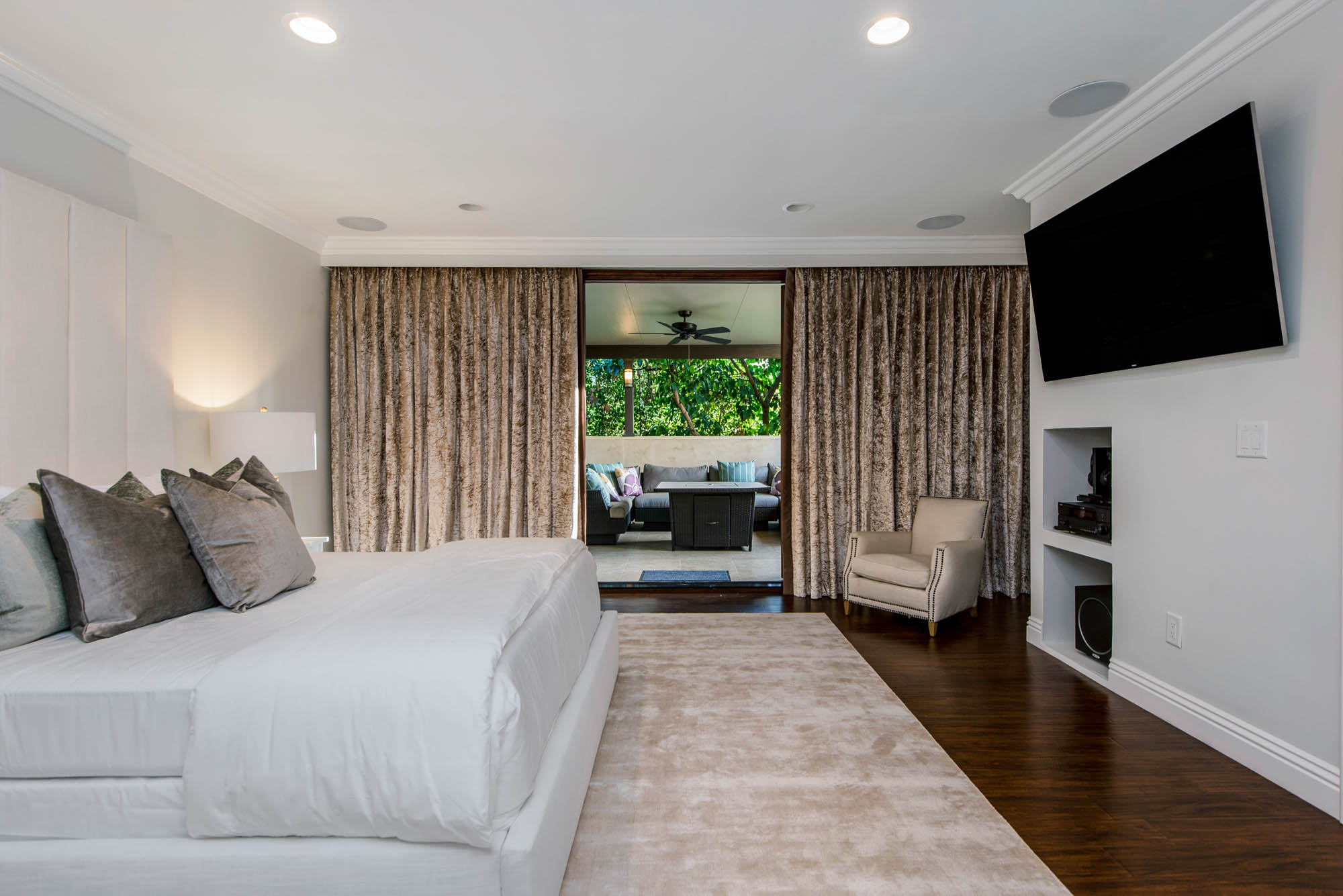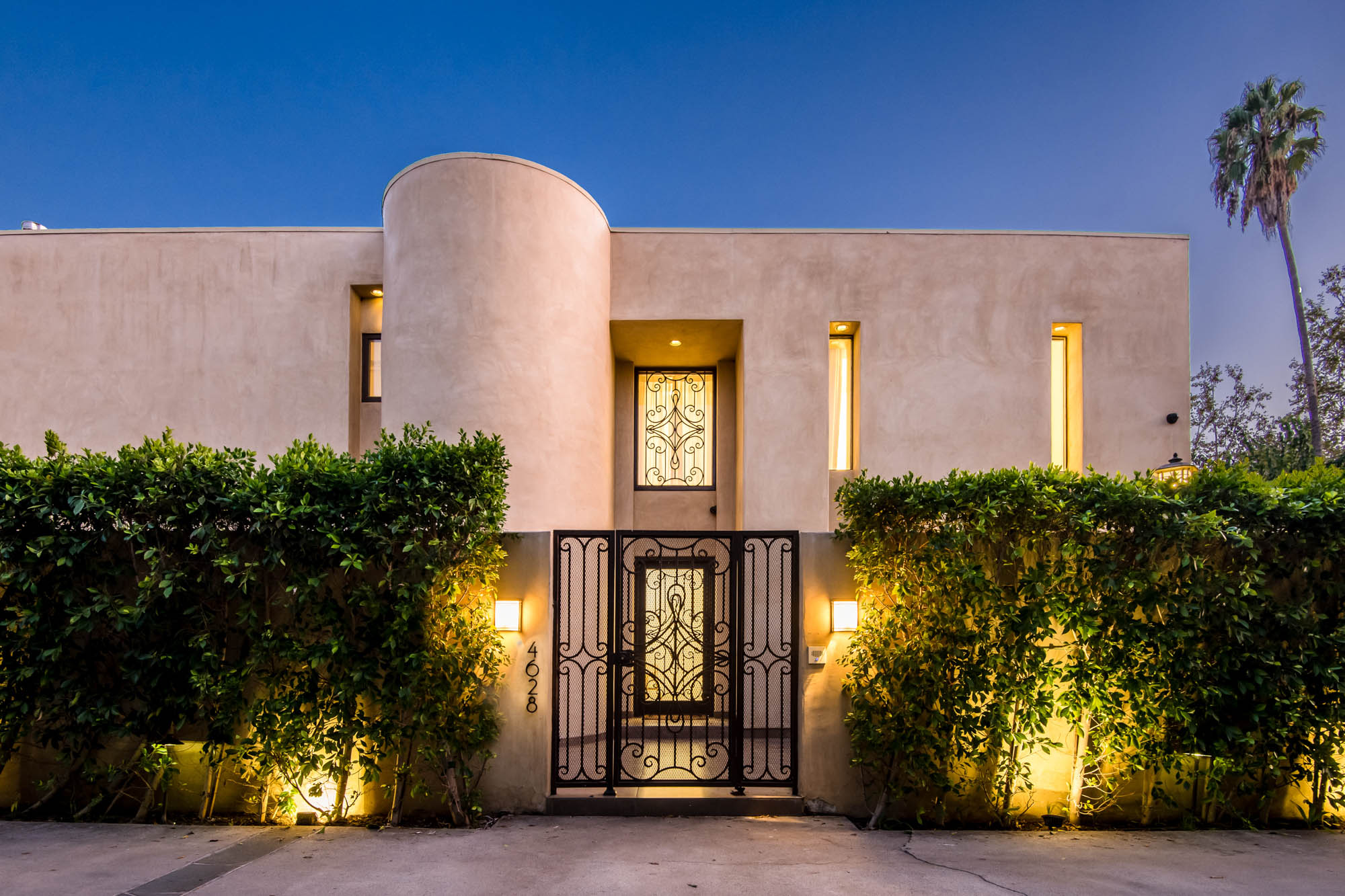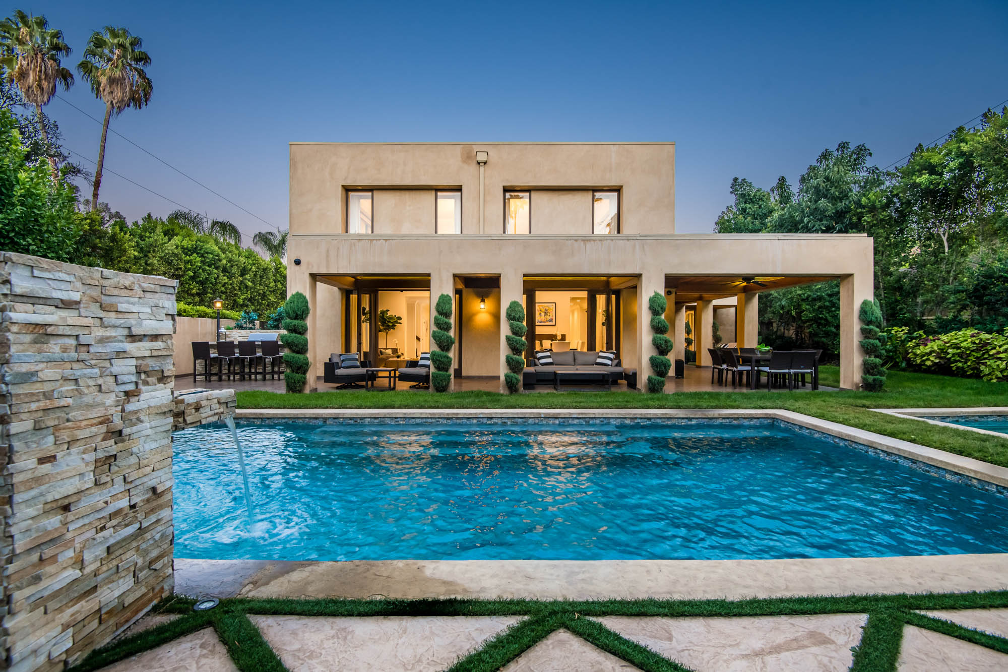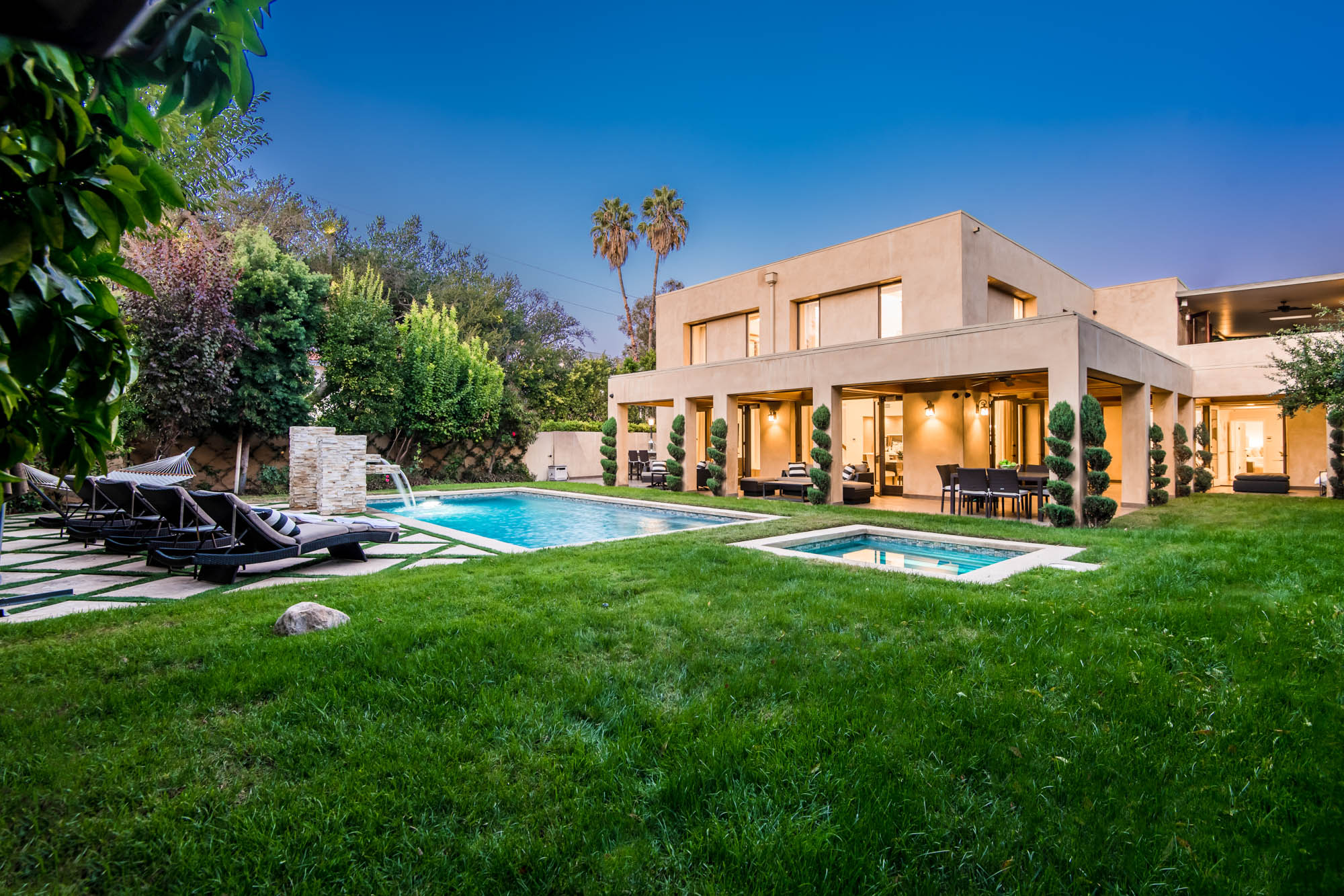 Dramatic Willis Fagan A.I.A. architectural set amongst lush, private grounds in prime Encino. Set behind a secure gated entrance this home features a 2 story living/dining room w/ wet bar & fireplace, chef's dream kitchen, equipped with Viking appliances, large island w/ prep sink, & ample cabinetry. Adjacent to the kitchen is a family room w/ fireplace, ideal for movie nights. The main level continues w/ 4 bd, 2.5 ba, & laundry room. Upstairs, the master suite has a formal sitting area w/ fireplace & built-in entertainment center, a generously sized bedroom, spa style bathroom w/ Mr. Steam sauna shower, jacuzzi tub & 2 massive walk-in closets. The suite opens to a huge private covered patio. The 2nd upstairs bedroom includes built in storage, & ensuite bath. Outside, the backyard has plenty of covered patio space w/ hand crafted wood ceilings. Pool w/ fountains & separate spa are framed by grassy yards & verdant landscape including a variety of fruit trees. Lanai Rd School district.