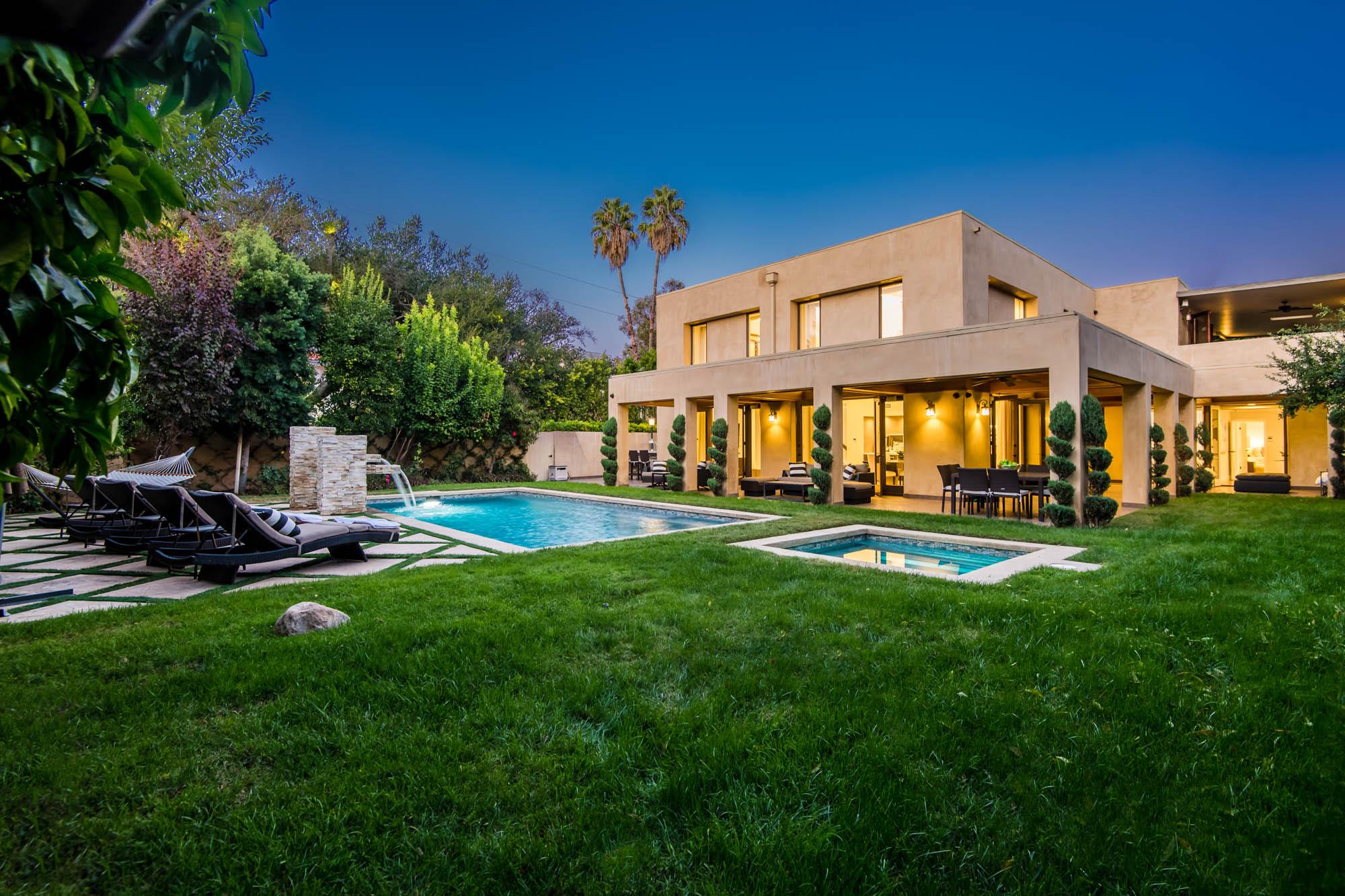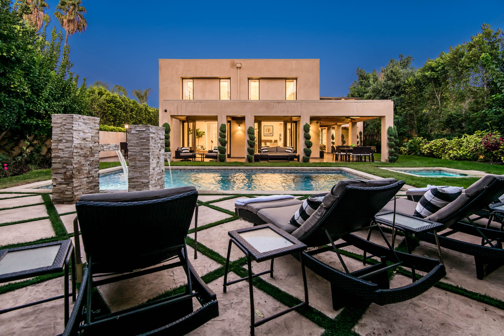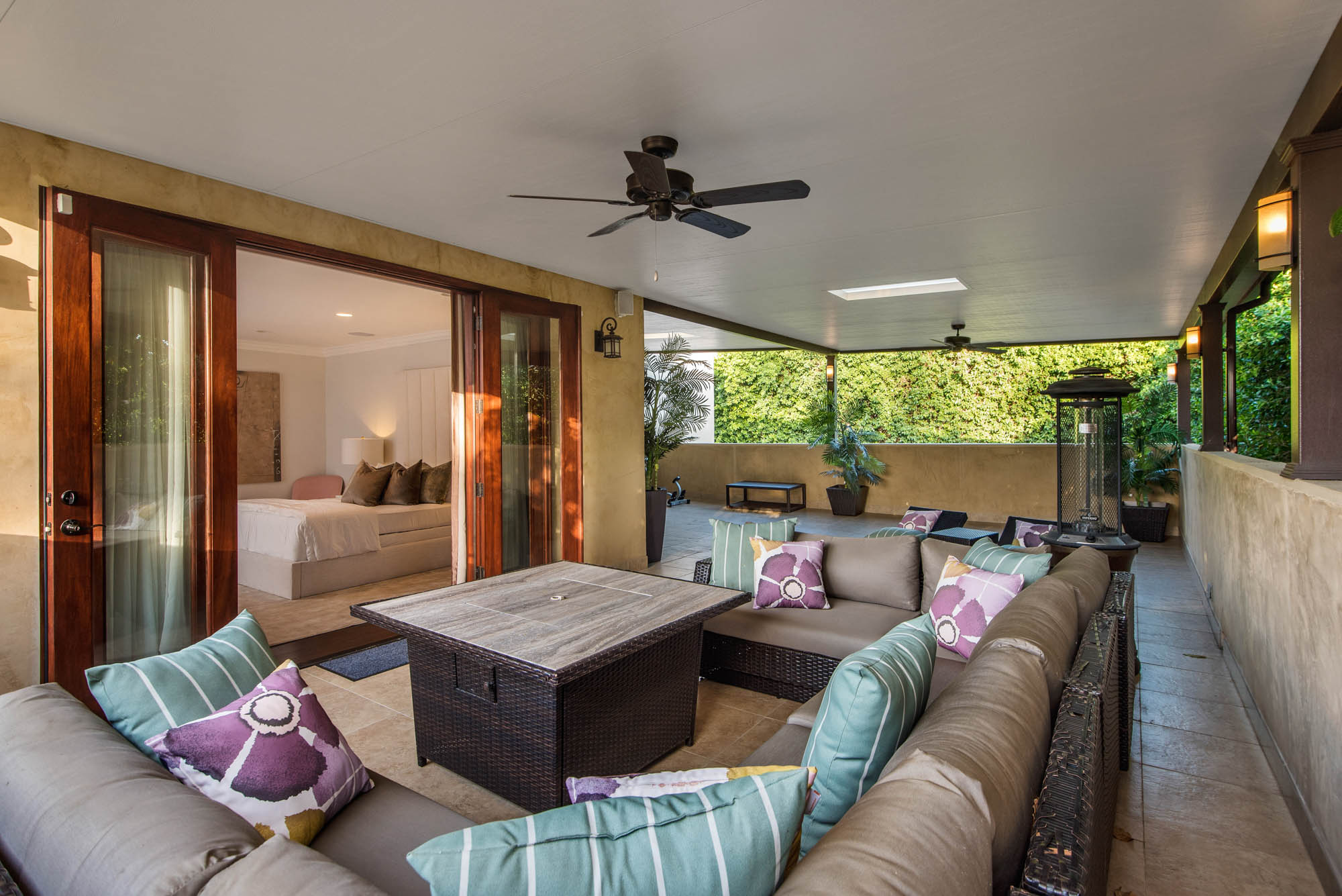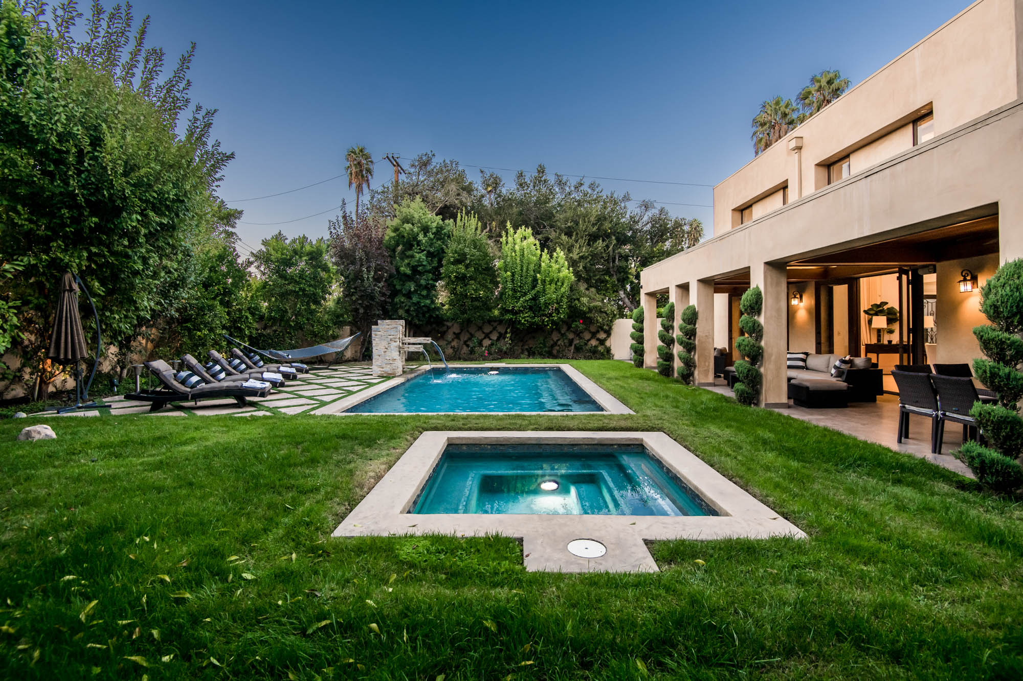Dramatic Willis Fagan A.I.A. architectural set amongst lush, private grounds in prime Encino. Set behind a secure gated entrance this home features a 2 story living/dining room w/ wet bar & fireplace, chef's dream kitchen, equipped with Viking appliances, large island w/ prep sink, & ample cabinetry. Adjacent to the kitchen is a family room w/ fireplace, ideal for movie nights. The main level continues w/ 4 bd, 2.5 ba, & laundry room. Upstairs, the master suite has a formal sitting area w/ fireplace & built-in entertainment center, a generously sized bedroom, spa style bathroom w/ Mr. Steam sauna shower, jacuzzi tub & 2 massive walk-in closets. The suite opens to a huge private covered patio. The 2nd upstairs bedroom includes built in storage, & ensuite bath. Outside, the backyard has plenty of covered patio space w/ hand crafted wood ceilings. Pool w/ fountains & separate spa are framed by grassy yards & verdant landscape including a variety of fruit trees. Lanai Rd School district.