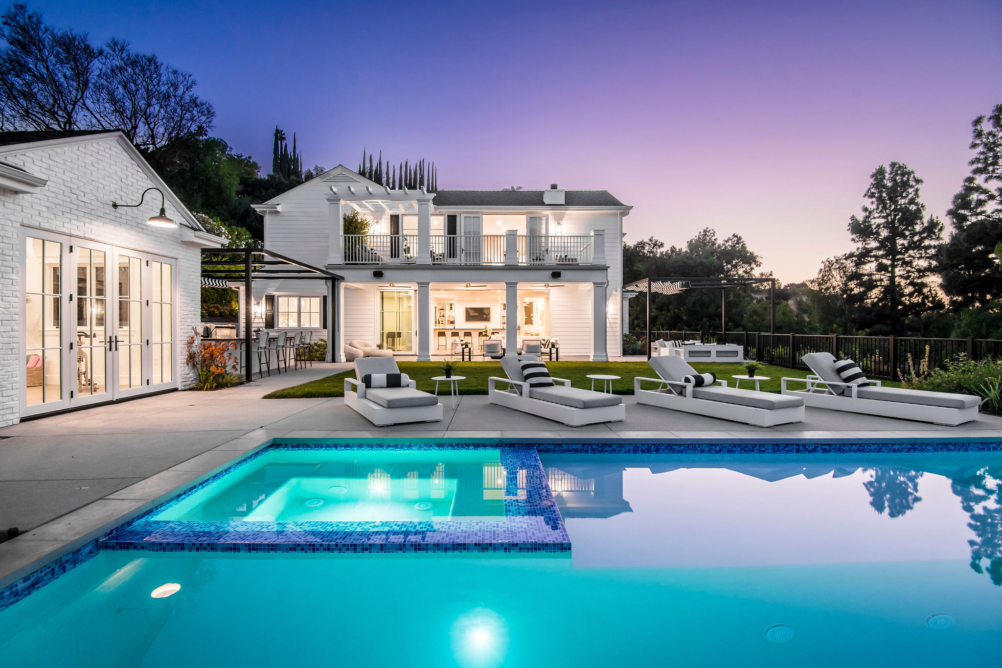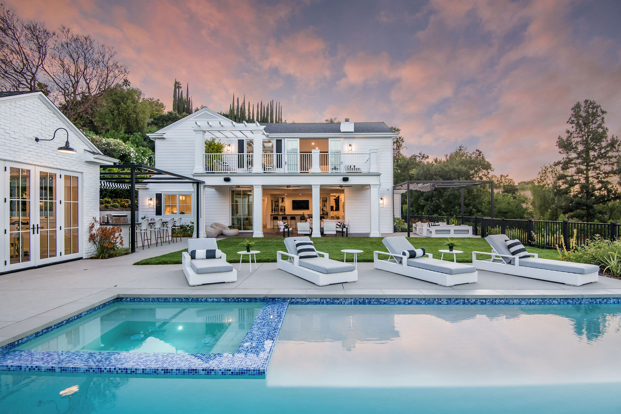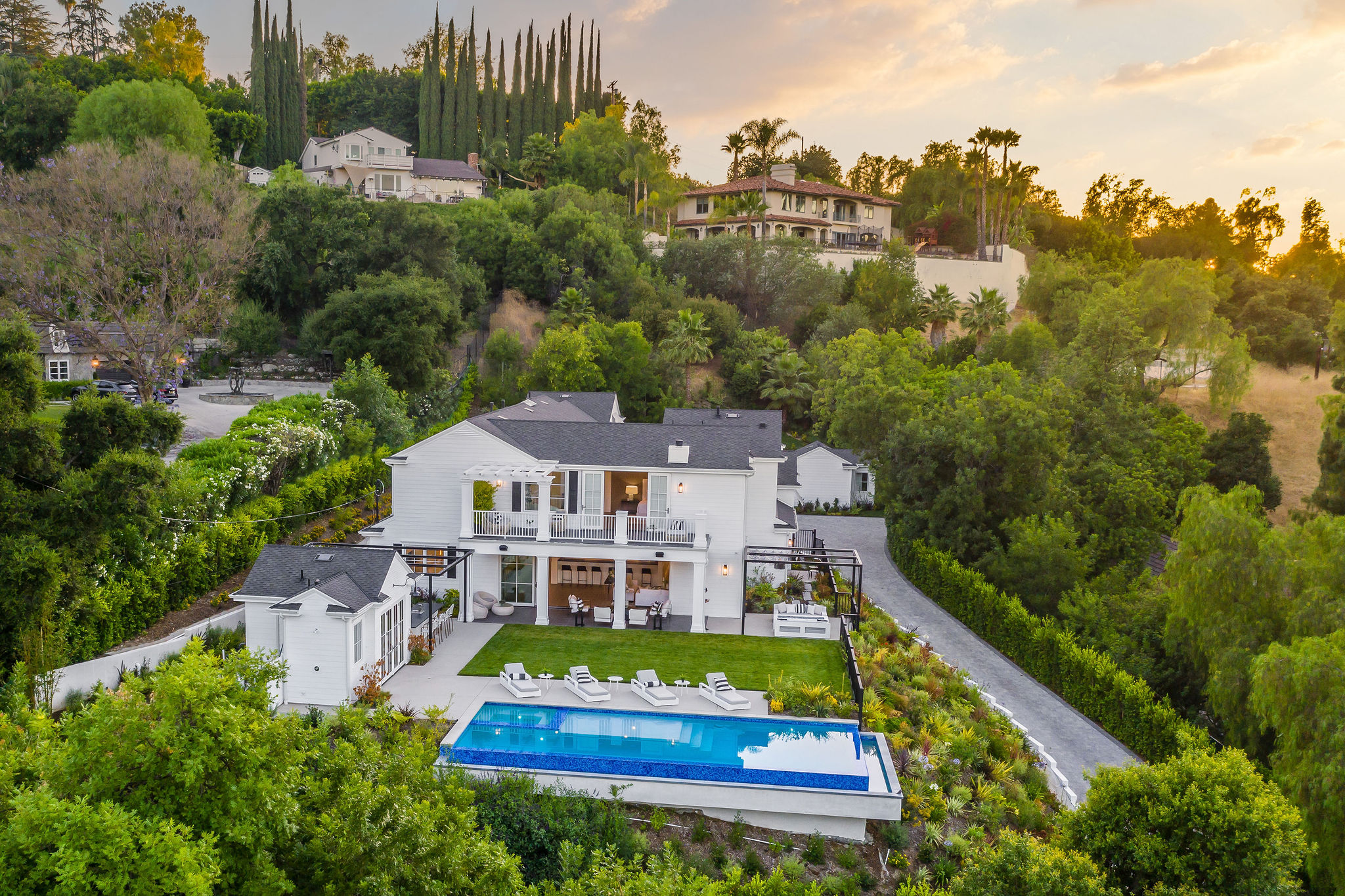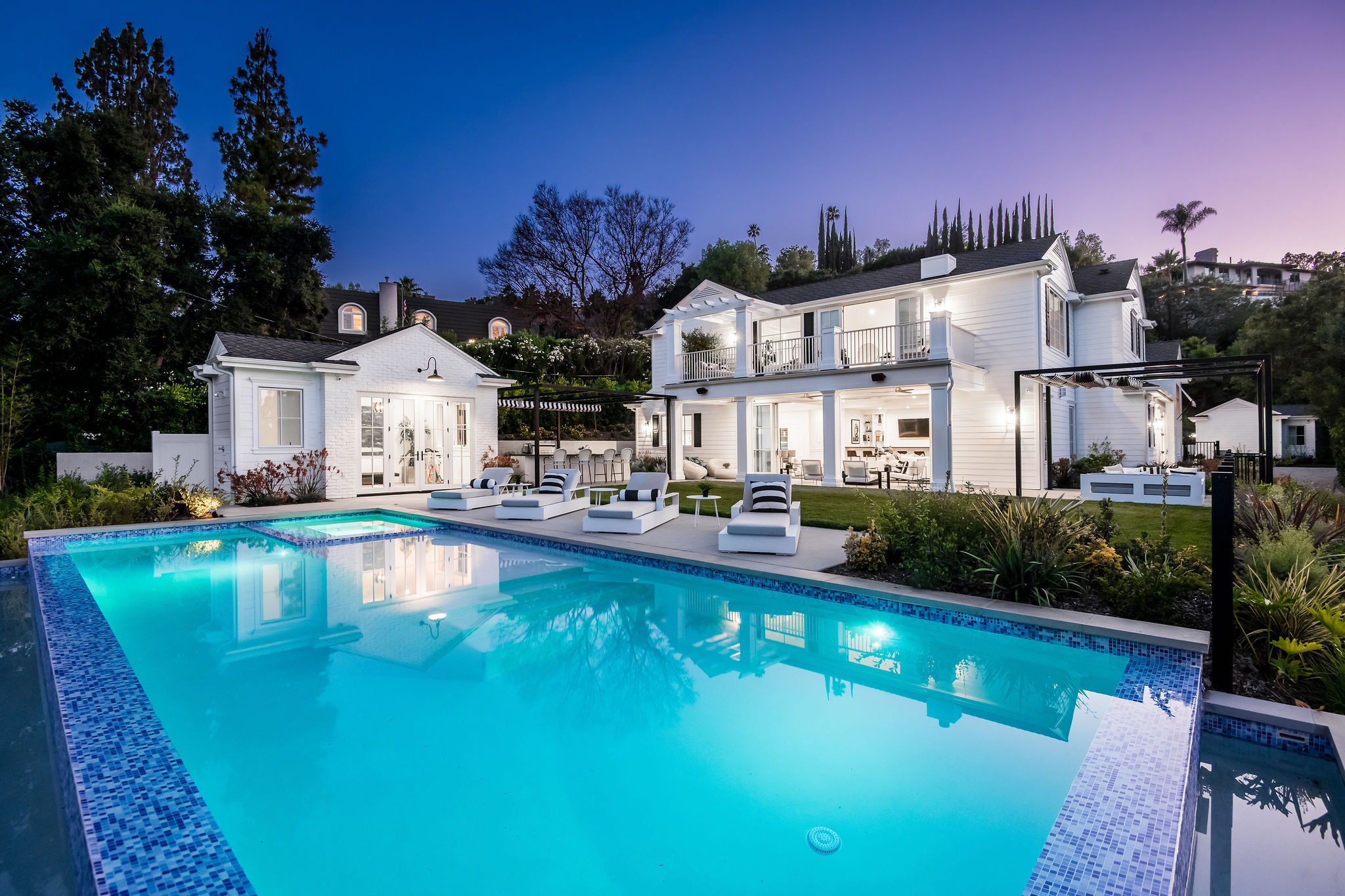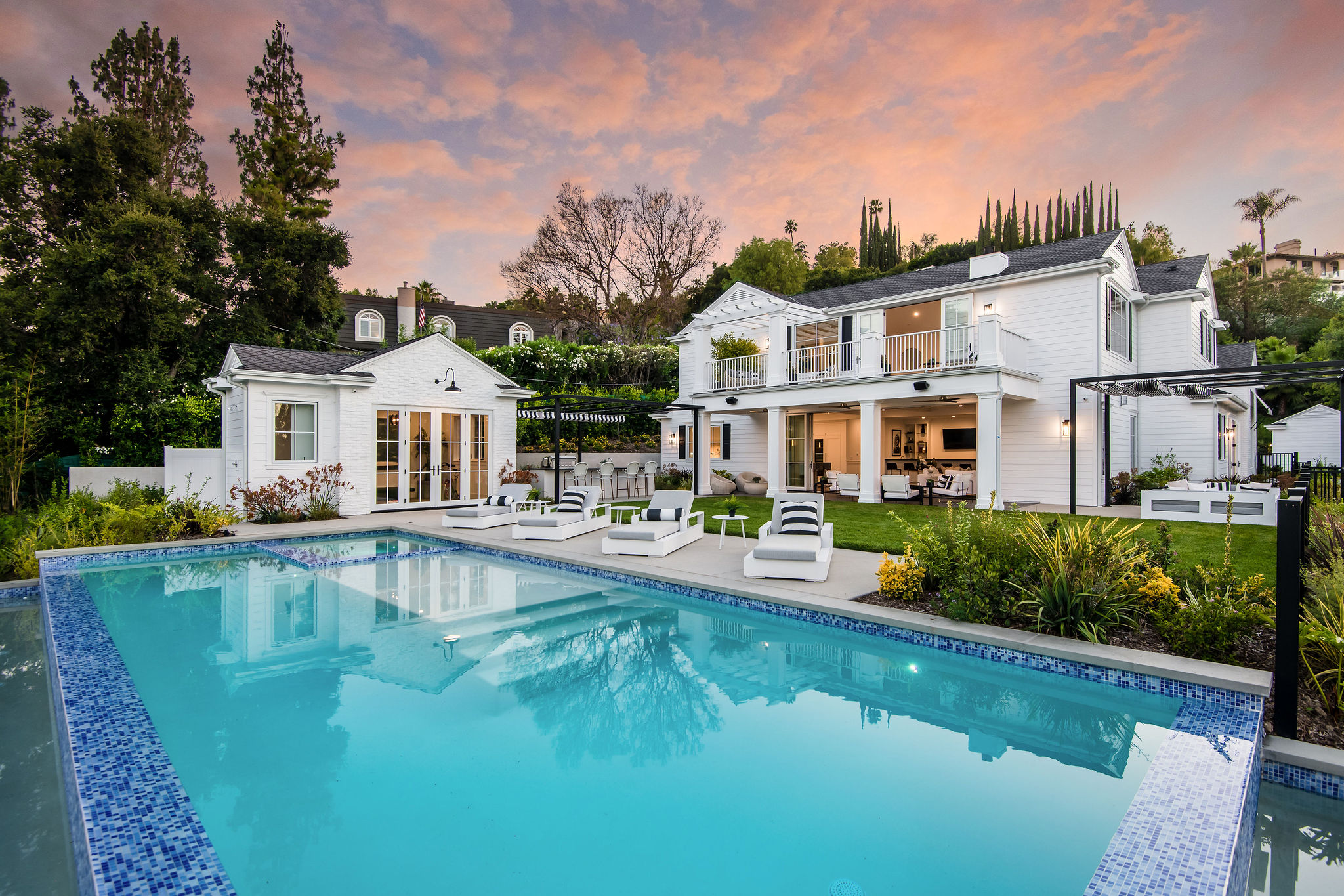 Tucked behind private gates & surrounded by an incredibly lush English garden, this modern cape cod estate presents its own luxurious oasis. Excellent location w/ easy access to 101, 405 freeways & back route access to the westside. Impressive entry beholds the magnificent open layout, soaring ceilings, & flooding natural light. Inviting formal living room w/ a sleek fireplace keeps a cozy yet grand feel. Stunning wood floors lead you through to the light & bright dining room encompassed by large french doors & a gorgeous interior courtyard. Gourmet kitchen features state of the art appliances, double island w/ plenty of room for informal dining, butlers pantry, & ample cabinetry & storage space. Adjacent, the large, striking bar sweeps through to the expansive family room. Open up your massive pocket doors to live the ultimate entertainers dream w/ a smooth indoor/outdoor entertaining flow. The backyard sanctuary w/ incredible views features infinity zero edge pool & spa, pool house, patio space, firepit, plenty of grass space, covered alfresco dining w/ outdoor bbq, cooking area & fridge. Upstairs, the boasting master suite showcases panoramic views, lovely sitting area & deck, his & her walk in closets, bathroom w/ his & hers smart toilets, extra large steam shower & a soaking tub. Oversized bedrooms feature en suite bathrooms & walk in closets. Additional amenities include home theater, balconies, fruit trees- citrus, avocado, loquat, apricot & more, second multipurpose unit can be used as gym, game room, mother in law, etc. 3 car garage, laundry room, & so much more.