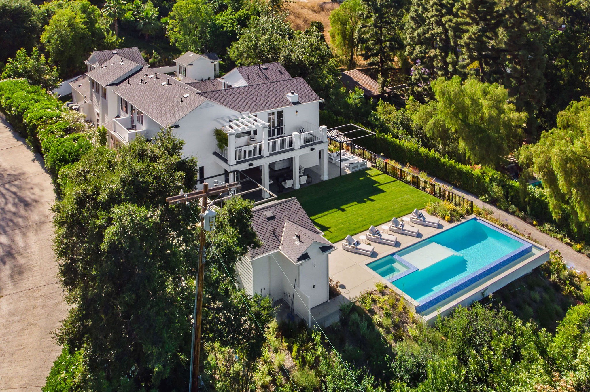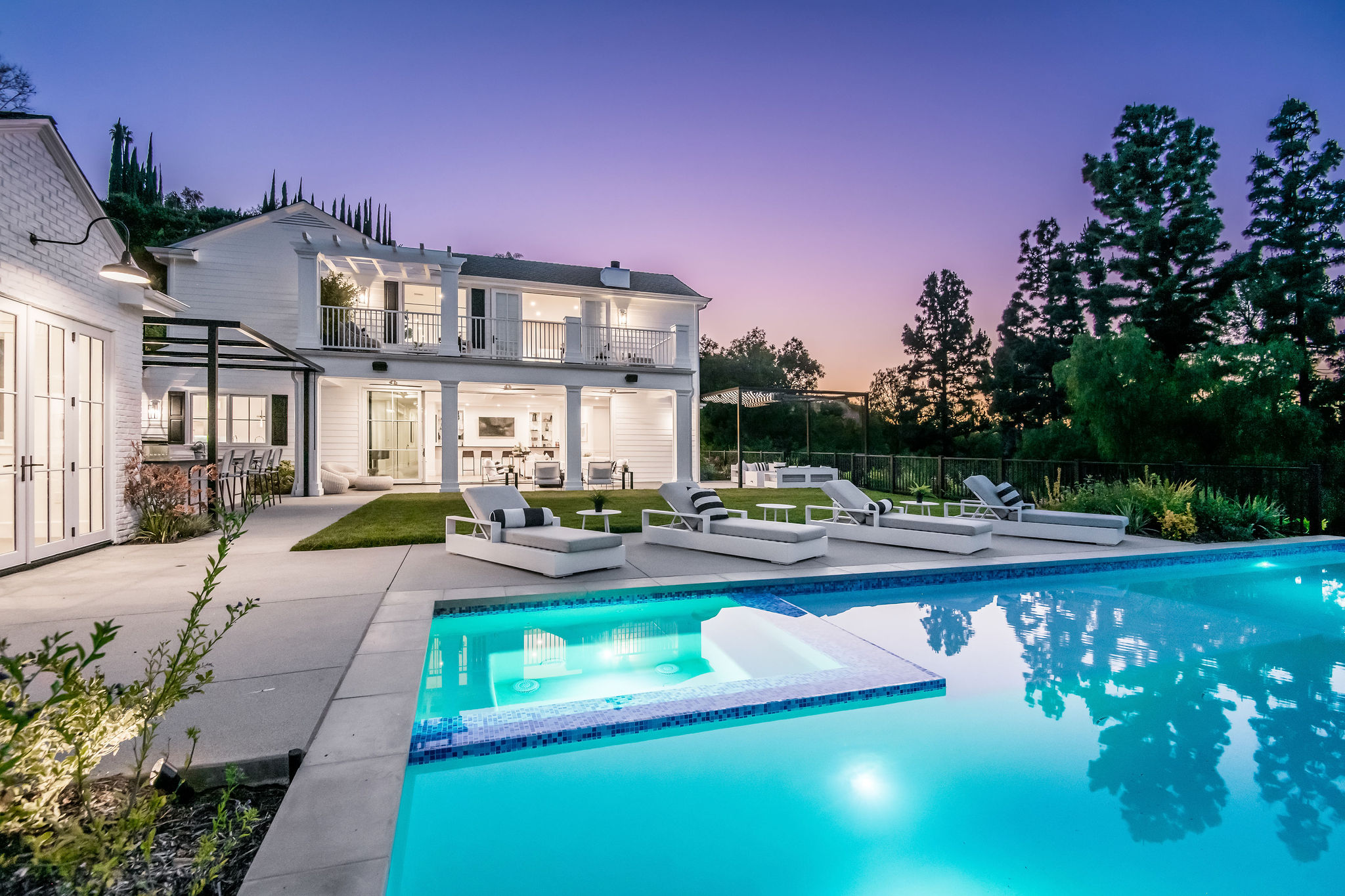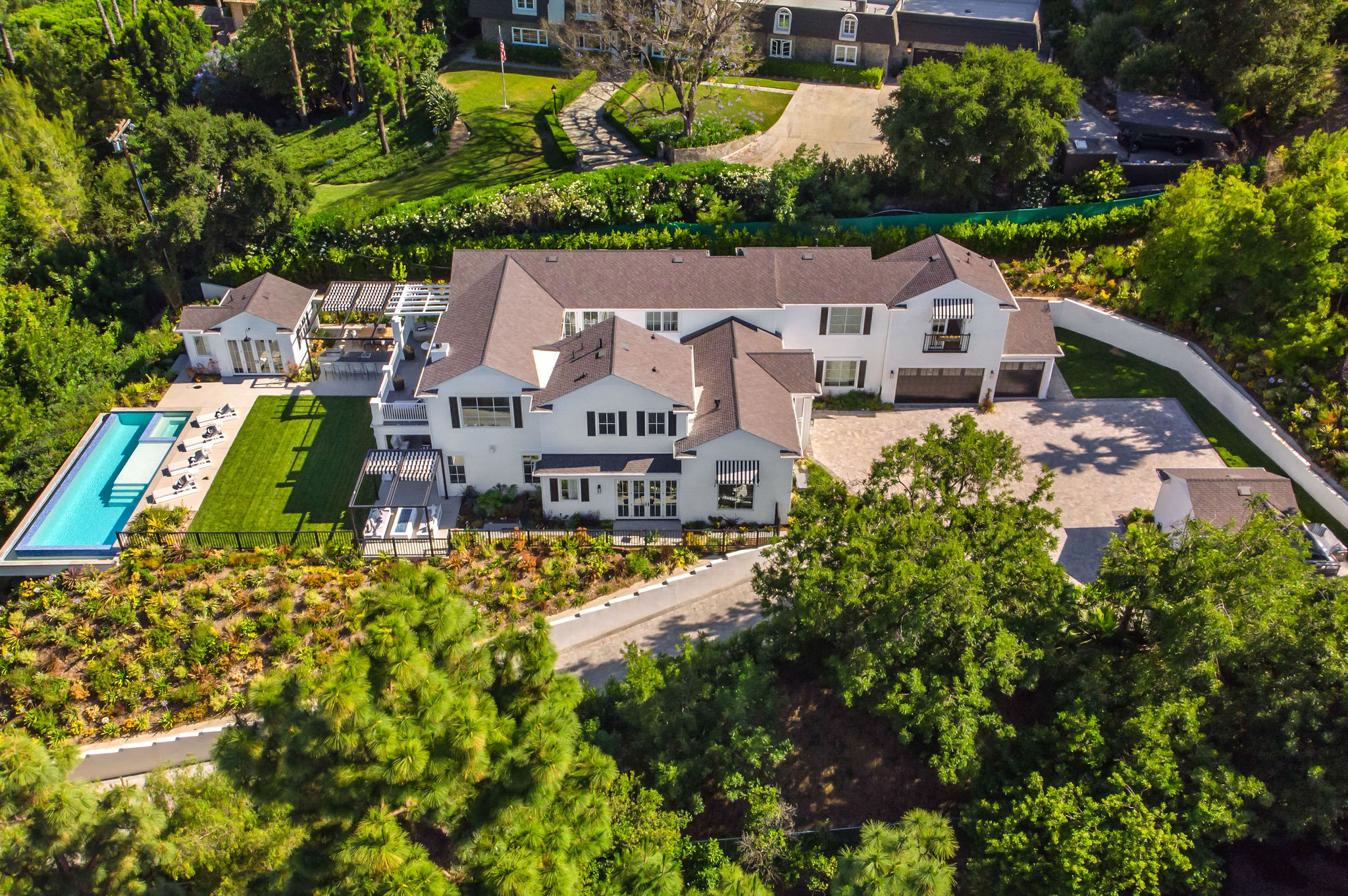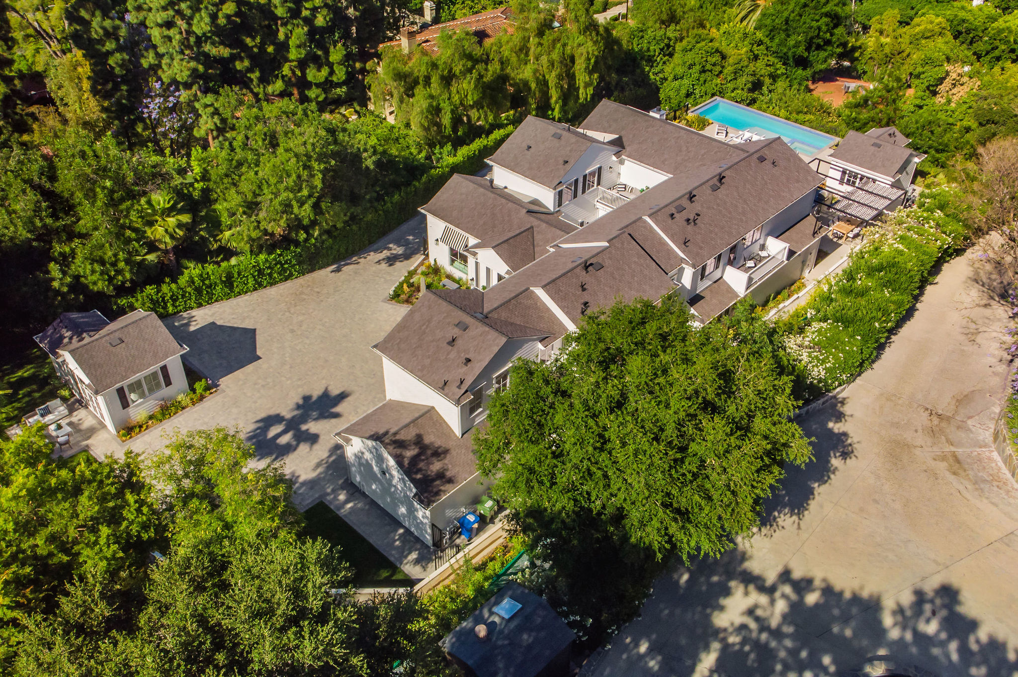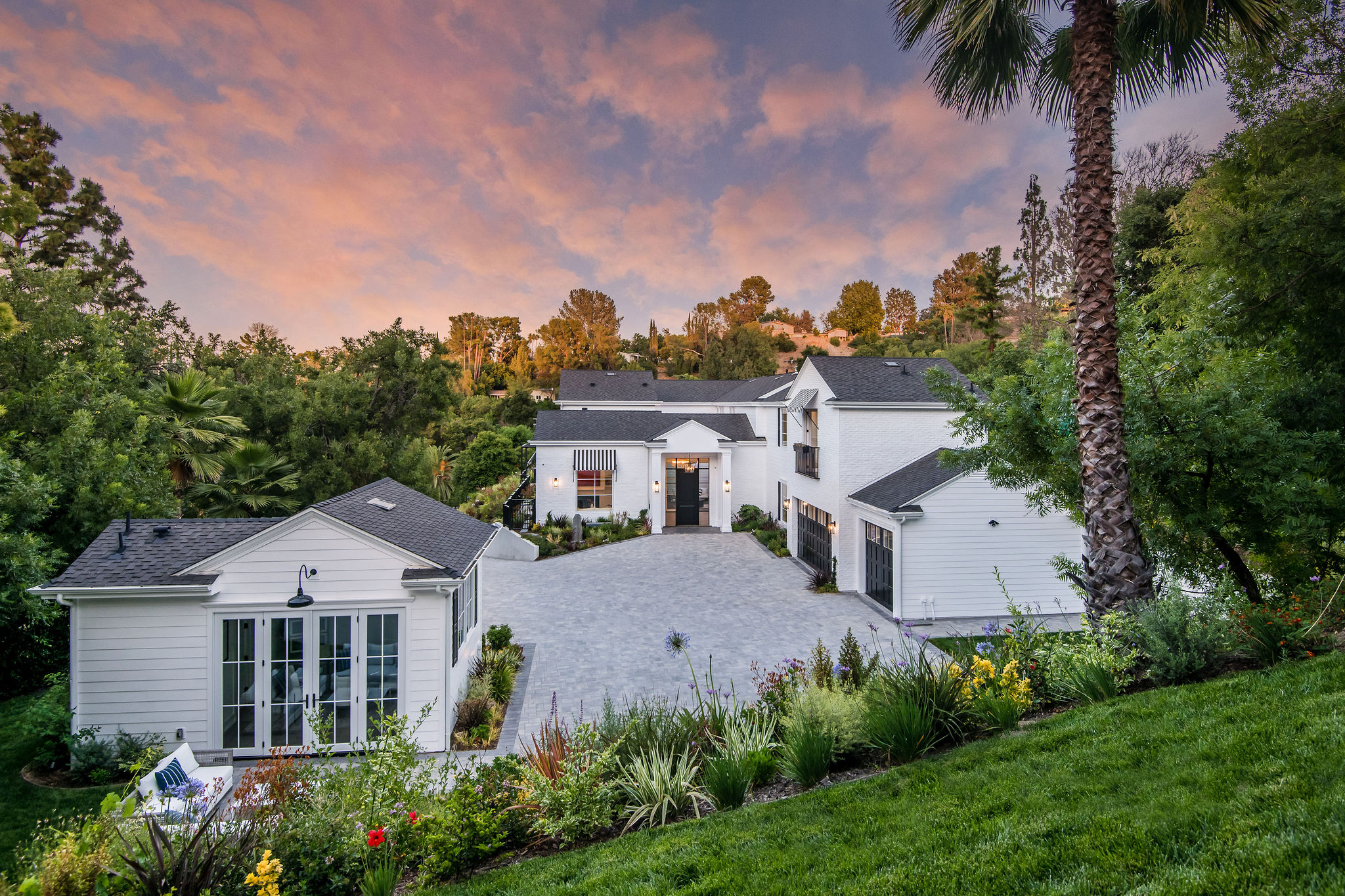 Tucked behind private gates & surrounded by an incredibly lush English garden, this modern cape cod estate presents its own luxurious oasis. Excellent location w/ easy access to 101, 405 freeways & back route access to the westside. Impressive entry beholds the magnificent open layout, soaring ceilings, & flooding natural light. Inviting formal living room w/ a sleek fireplace keeps a cozy yet grand feel. Stunning wood floors lead you through to the light & bright dining room encompassed by large french doors & a gorgeous interior courtyard. Gourmet kitchen features state of the art appliances, double island w/ plenty of room for informal dining, butlers pantry, & ample cabinetry & storage space. Adjacent, the large, striking bar sweeps through to the expansive family room. Open up your massive pocket doors to live the ultimate entertainers dream w/ a smooth indoor/outdoor entertaining flow. The backyard sanctuary w/ incredible views features infinity zero edge pool & spa, pool house, patio space, firepit, plenty of grass space, covered alfresco dining w/ outdoor bbq, cooking area & fridge. Upstairs, the boasting master suite showcases panoramic views, lovely sitting area & deck, his & her walk in closets, bathroom w/ his & hers smart toilets, extra large steam shower & a soaking tub. Oversized bedrooms feature en suite bathrooms & walk in closets. Additional amenities include home theater, balconies, fruit trees- citrus, avocado, loquat, apricot & more, second multipurpose unit can be used as gym, game room, mother in law, etc. 3 car garage, laundry room, & so much more.