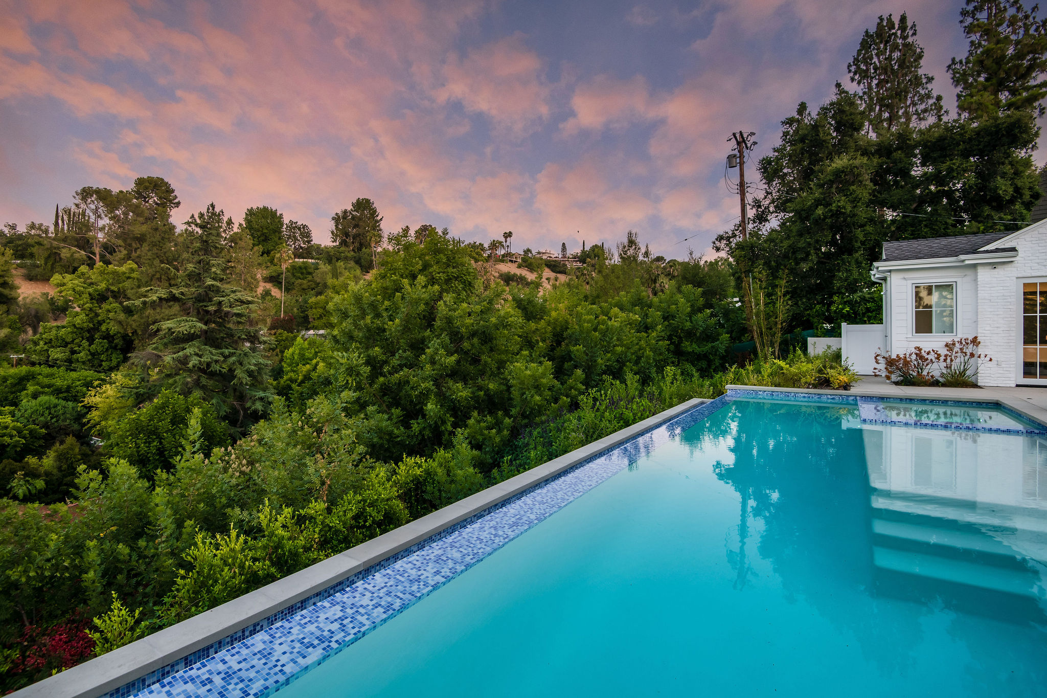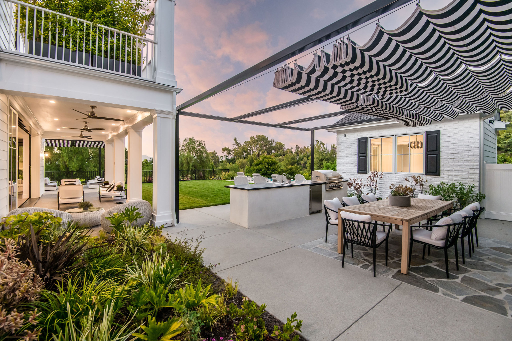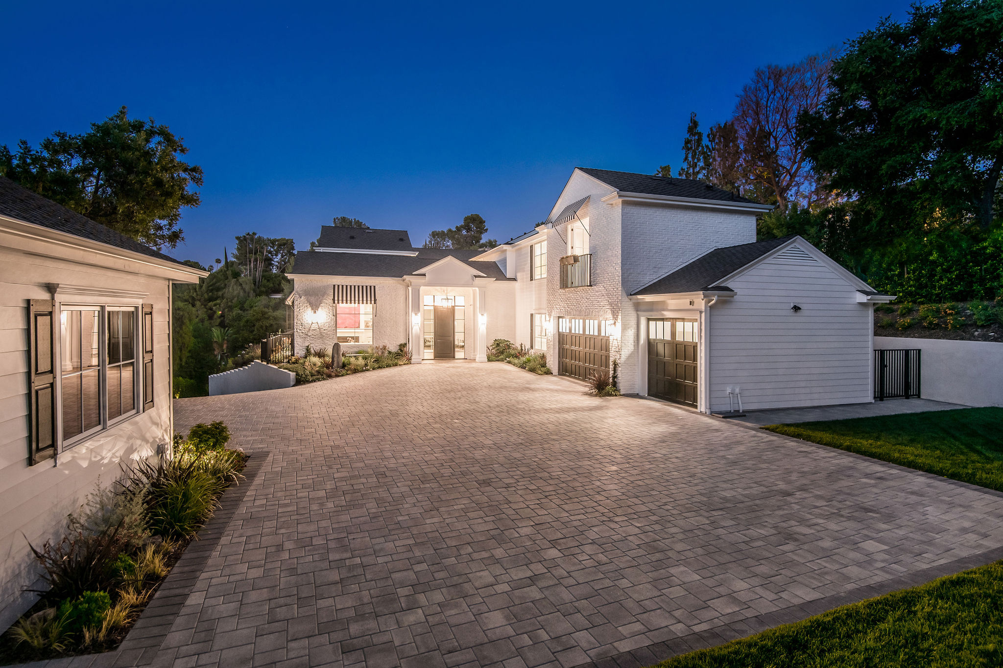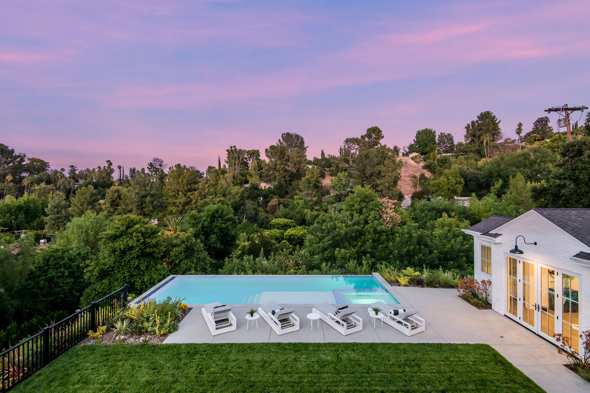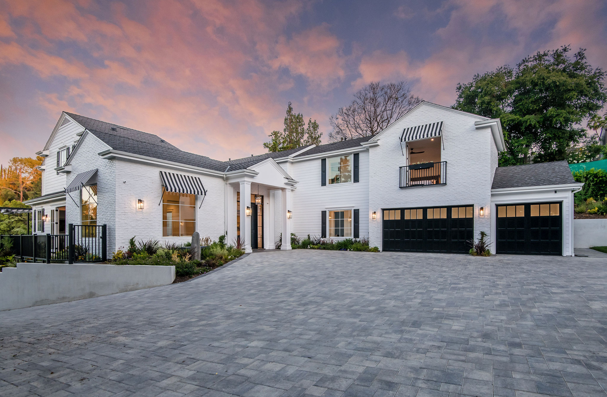 Tucked behind private gates & surrounded by an incredibly lush English garden, this modern cape cod estate presents its own luxurious oasis. Excellent location w/ easy access to 101, 405 freeways & back route access to the westside. Impressive entry beholds the magnificent open layout, soaring ceilings, & flooding natural light. Inviting formal living room w/ a sleek fireplace keeps a cozy yet grand feel. Stunning wood floors lead you through to the light & bright dining room encompassed by large french doors & a gorgeous interior courtyard. Gourmet kitchen features state of the art appliances, double island w/ plenty of room for informal dining, butlers pantry, & ample cabinetry & storage space. Adjacent, the large, striking bar sweeps through to the expansive family room. Open up your massive pocket doors to live the ultimate entertainers dream w/ a smooth indoor/outdoor entertaining flow. The backyard sanctuary w/ incredible views features infinity zero edge pool & spa, pool house, patio space, firepit, plenty of grass space, covered alfresco dining w/ outdoor bbq, cooking area & fridge. Upstairs, the boasting master suite showcases panoramic views, lovely sitting area & deck, his & her walk in closets, bathroom w/ his & hers smart toilets, extra large steam shower & a soaking tub. Oversized bedrooms feature en suite bathrooms & walk in closets. Additional amenities include home theater, balconies, fruit trees- citrus, avocado, loquat, apricot & more, second multipurpose unit can be used as gym, game room, mother in law, etc. 3 car garage, laundry room, & so much more.