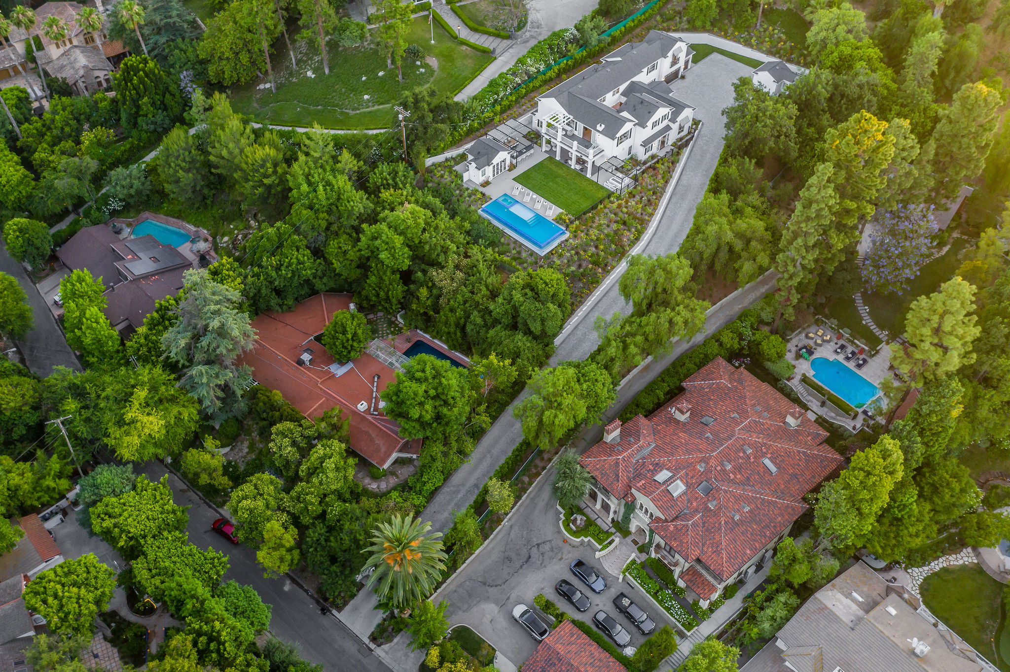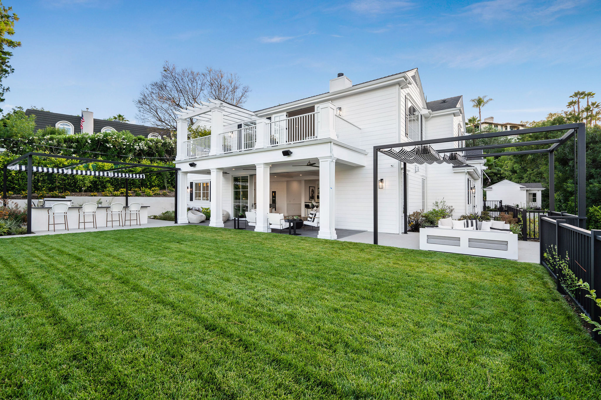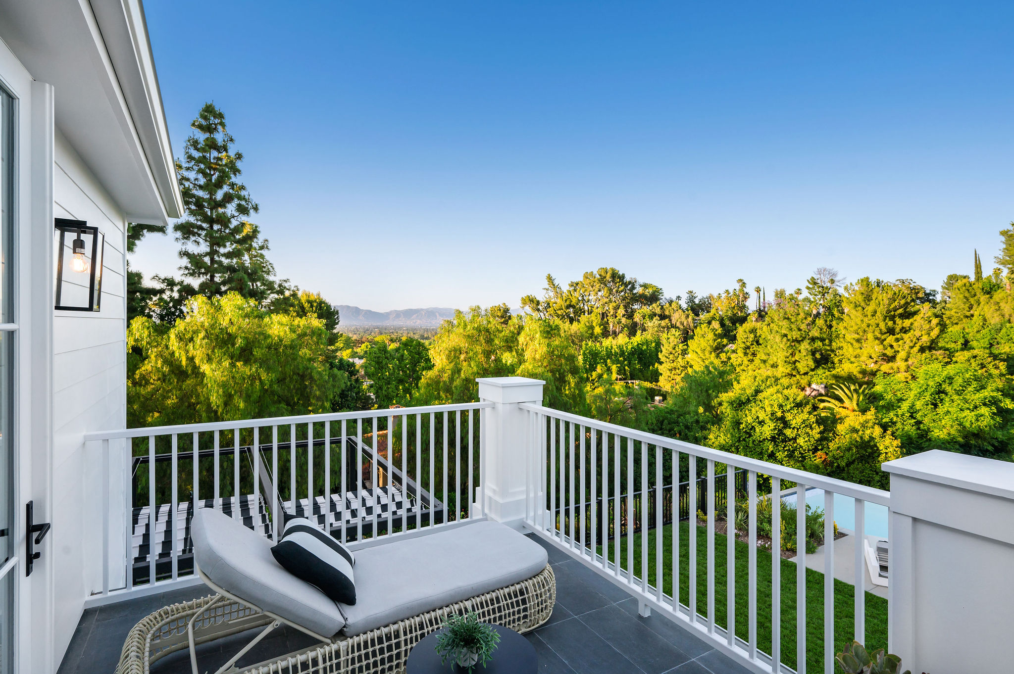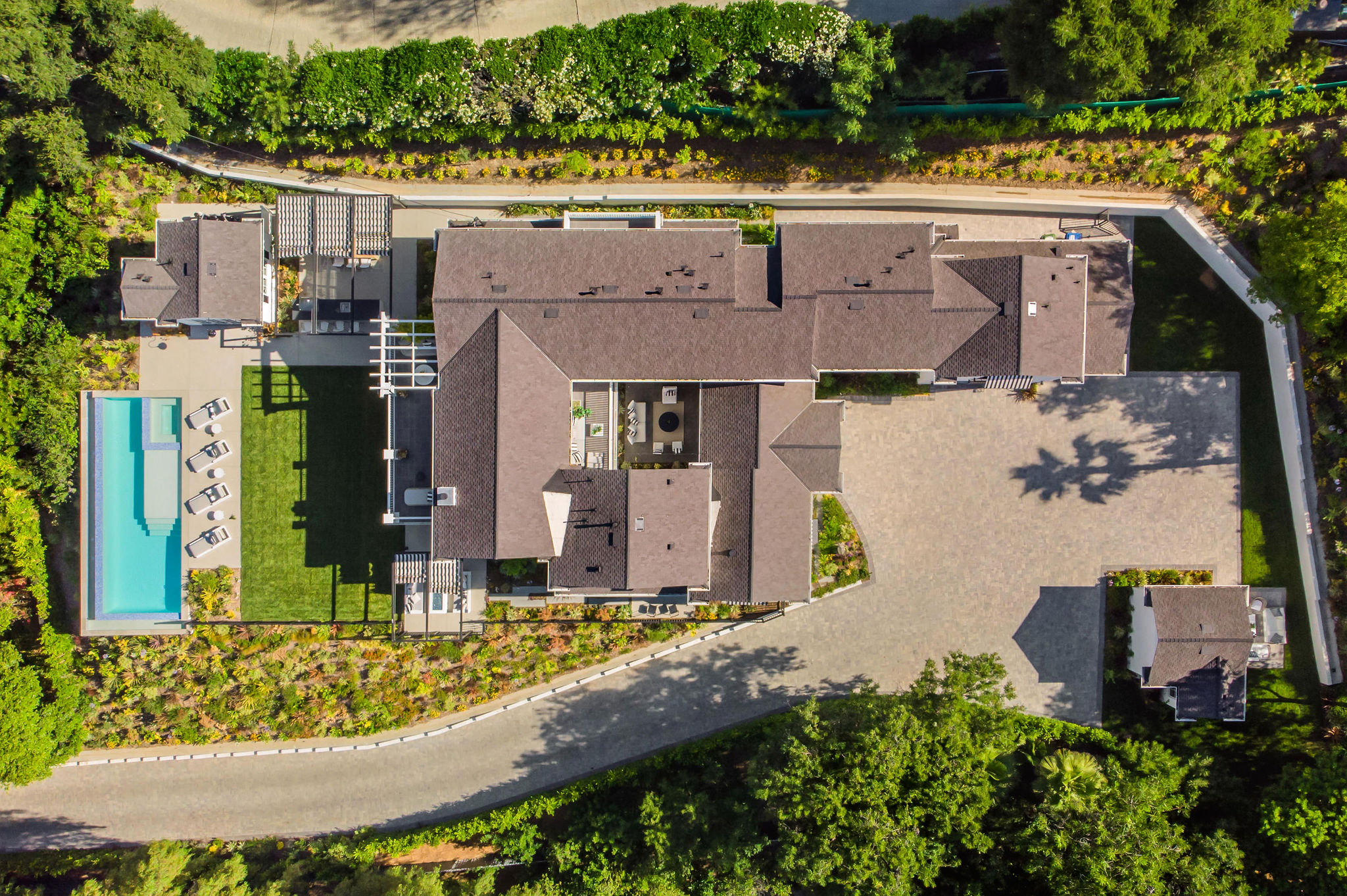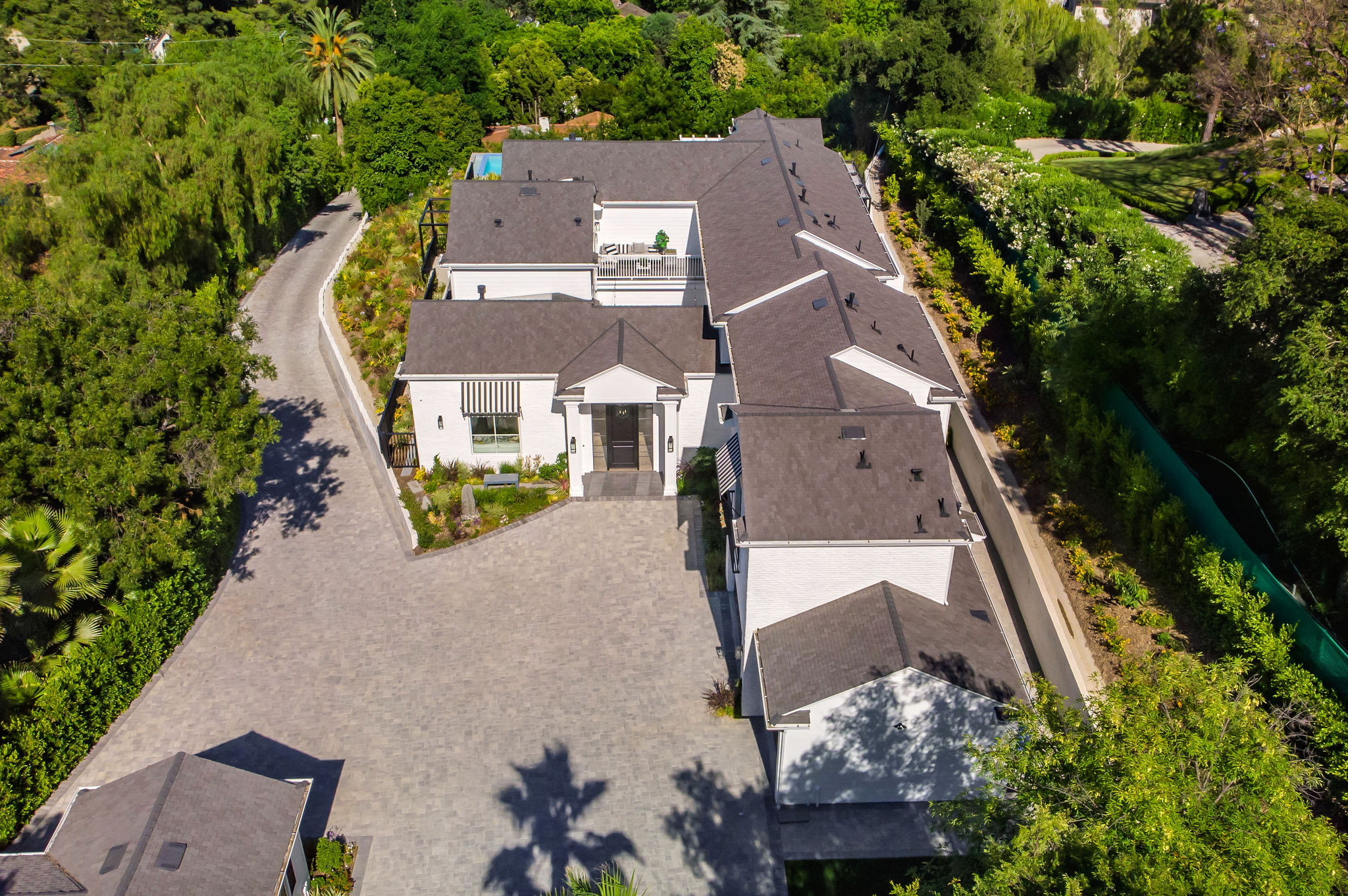 Tucked behind private gates & surrounded by an incredibly lush English garden, this modern cape cod estate presents its own luxurious oasis. Excellent location w/ easy access to 101, 405 freeways & back route access to the westside. Impressive entry beholds the magnificent open layout, soaring ceilings, & flooding natural light. Inviting formal living room w/ a sleek fireplace keeps a cozy yet grand feel. Stunning wood floors lead you through to the light & bright dining room encompassed by large french doors & a gorgeous interior courtyard. Gourmet kitchen features state of the art appliances, double island w/ plenty of room for informal dining, butlers pantry, & ample cabinetry & storage space. Adjacent, the large, striking bar sweeps through to the expansive family room. Open up your massive pocket doors to live the ultimate entertainers dream w/ a smooth indoor/outdoor entertaining flow. The backyard sanctuary w/ incredible views features infinity zero edge pool & spa, pool house, patio space, firepit, plenty of grass space, covered alfresco dining w/ outdoor bbq, cooking area & fridge. Upstairs, the boasting master suite showcases panoramic views, lovely sitting area & deck, his & her walk in closets, bathroom w/ his & hers smart toilets, extra large steam shower & a soaking tub. Oversized bedrooms feature en suite bathrooms & walk in closets. Additional amenities include home theater, balconies, fruit trees- citrus, avocado, loquat, apricot & more, second multipurpose unit can be used as gym, game room, mother in law, etc. 3 car garage, laundry room, & so much more.