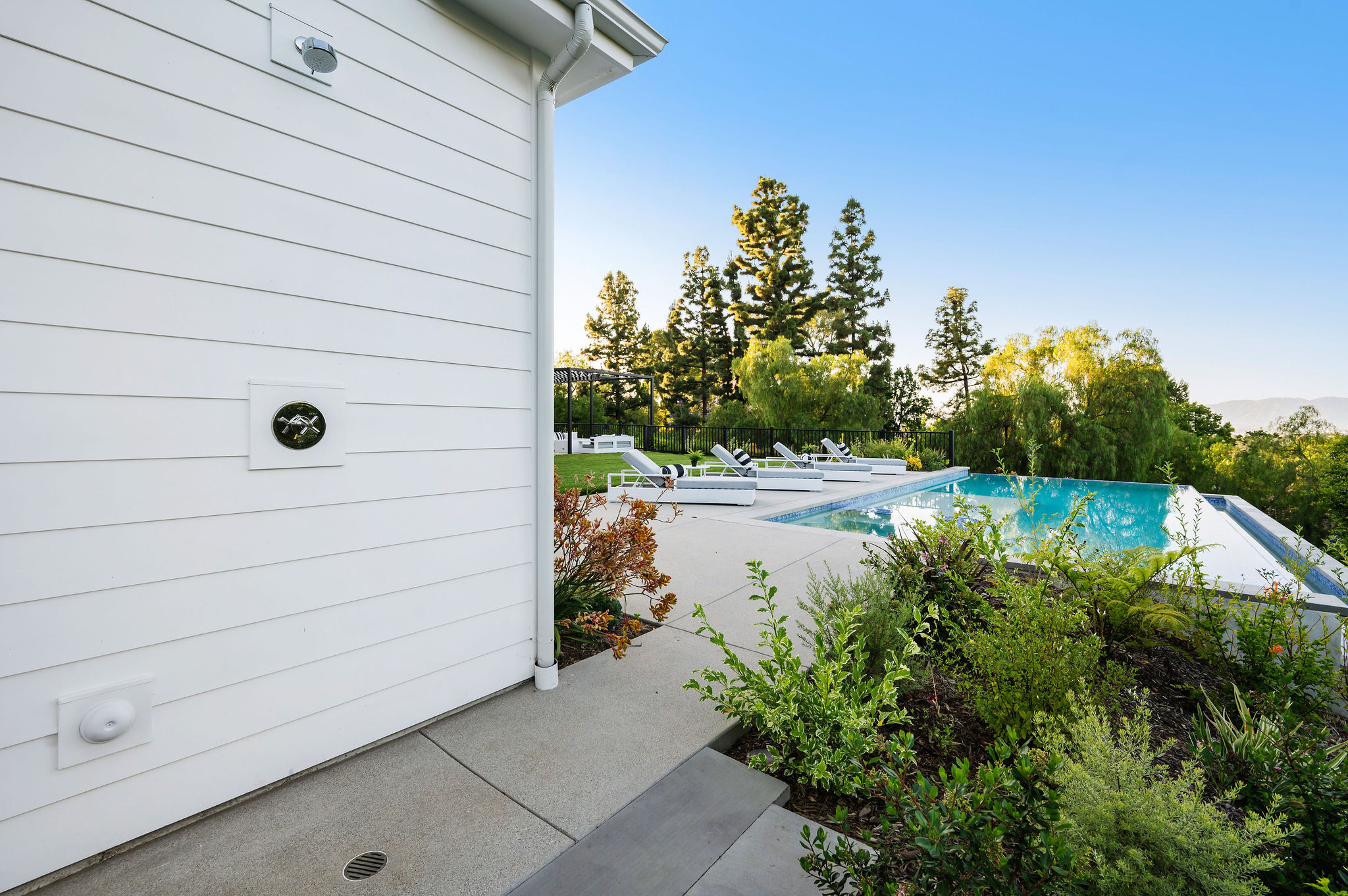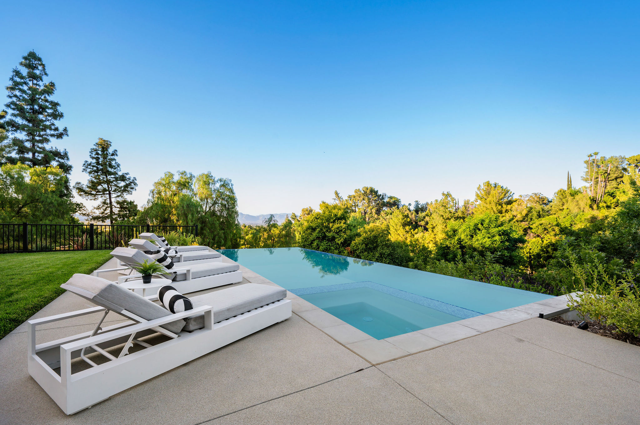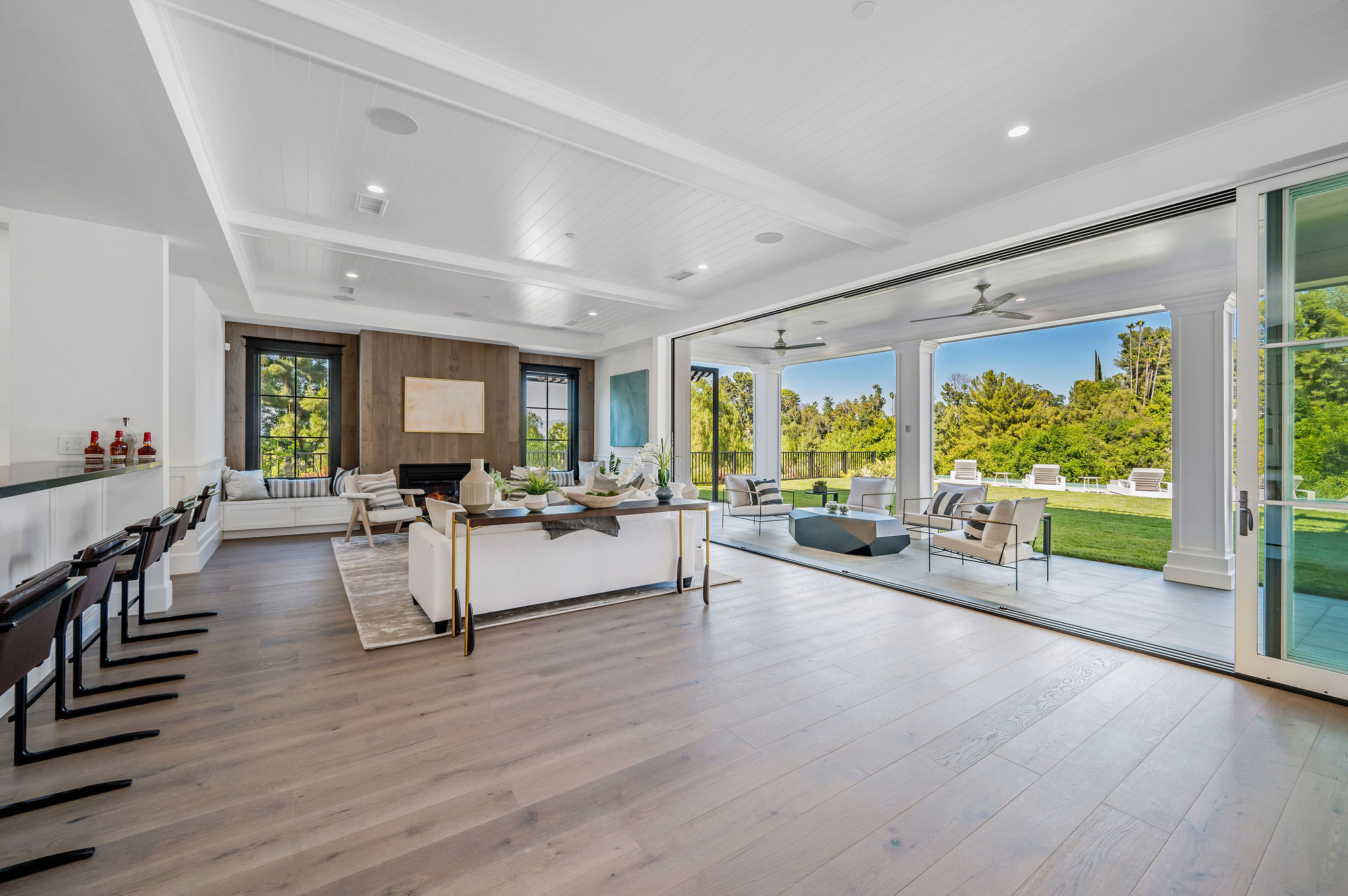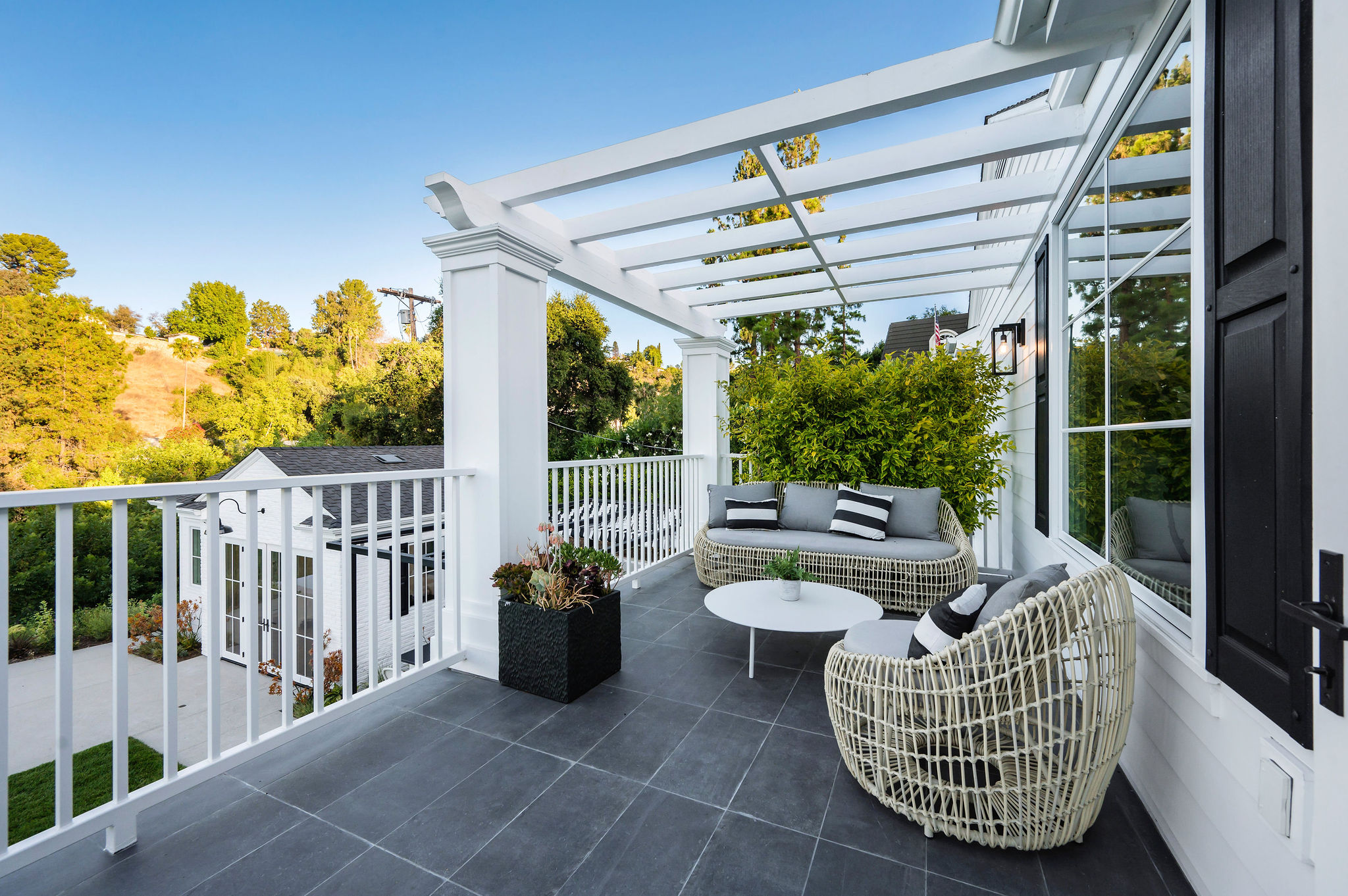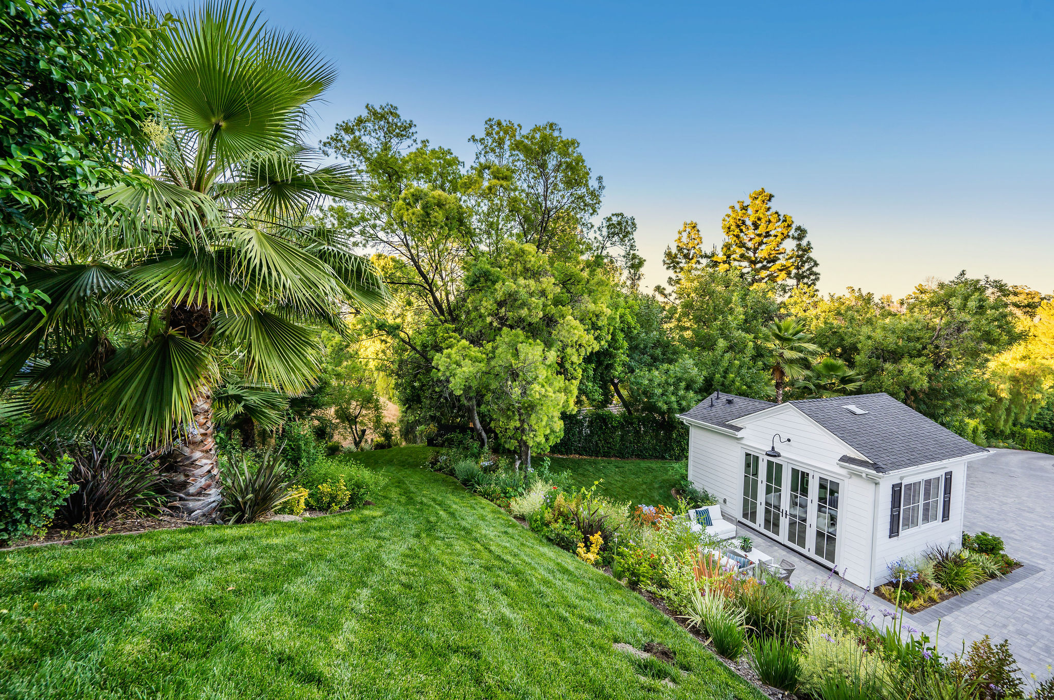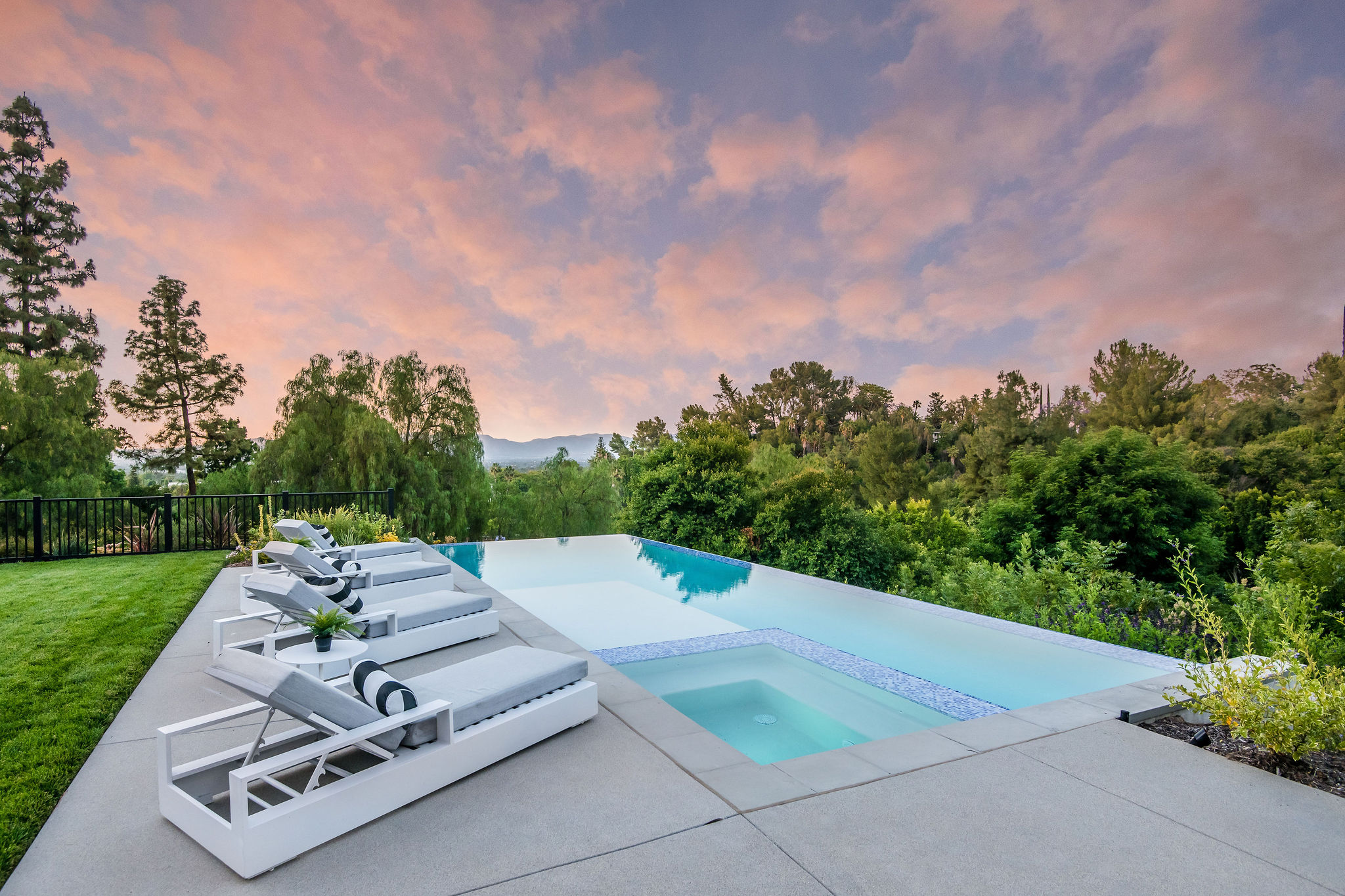 Tucked behind private gates & surrounded by an incredibly lush English garden, this modern cape cod estate presents its own luxurious oasis. Excellent location w/ easy access to 101, 405 freeways & back route access to the westside. Impressive entry beholds the magnificent open layout, soaring ceilings, & flooding natural light. Inviting formal living room w/ a sleek fireplace keeps a cozy yet grand feel. Stunning wood floors lead you through to the light & bright dining room encompassed by large french doors & a gorgeous interior courtyard. Gourmet kitchen features state of the art appliances, double island w/ plenty of room for informal dining, butlers pantry, & ample cabinetry & storage space. Adjacent, the large, striking bar sweeps through to the expansive family room. Open up your massive pocket doors to live the ultimate entertainers dream w/ a smooth indoor/outdoor entertaining flow. The backyard sanctuary w/ incredible views features infinity zero edge pool & spa, pool house, patio space, firepit, plenty of grass space, covered alfresco dining w/ outdoor bbq, cooking area & fridge. Upstairs, the boasting master suite showcases panoramic views, lovely sitting area & deck, his & her walk in closets, bathroom w/ his & hers smart toilets, extra large steam shower & a soaking tub. Oversized bedrooms feature en suite bathrooms & walk in closets. Additional amenities include home theater, balconies, fruit trees- citrus, avocado, loquat, apricot & more, second multipurpose unit can be used as gym, game room, mother in law, etc. 3 car garage, laundry room, & so much more.