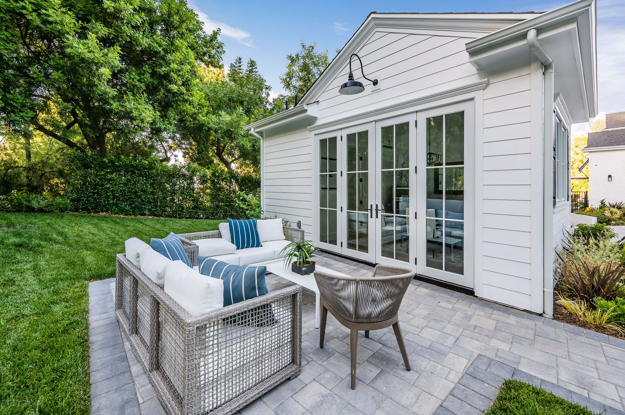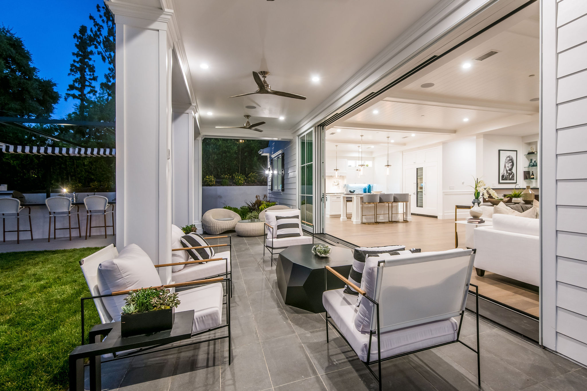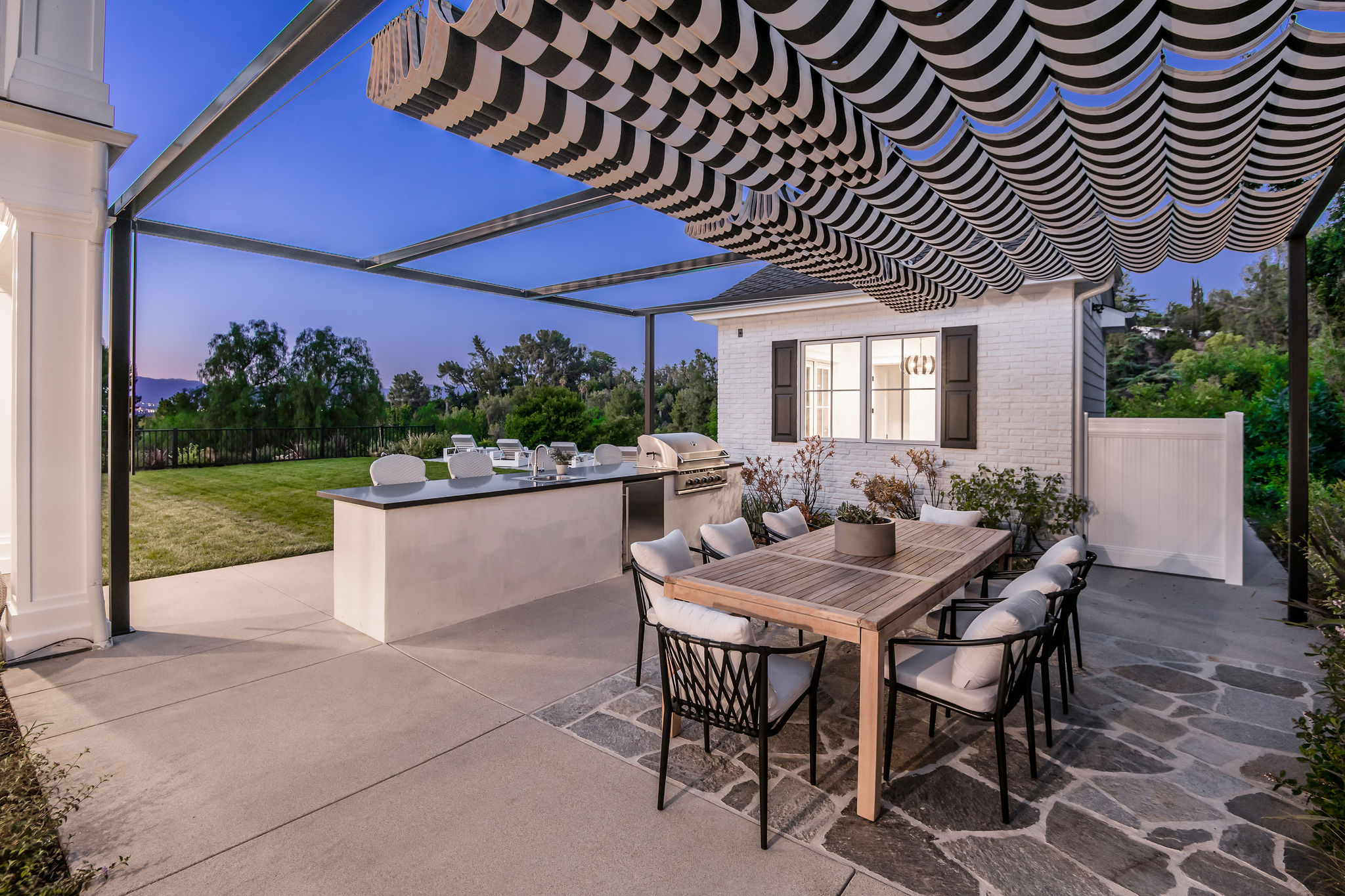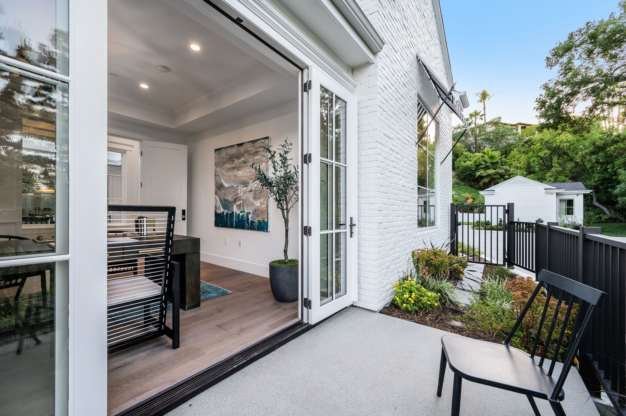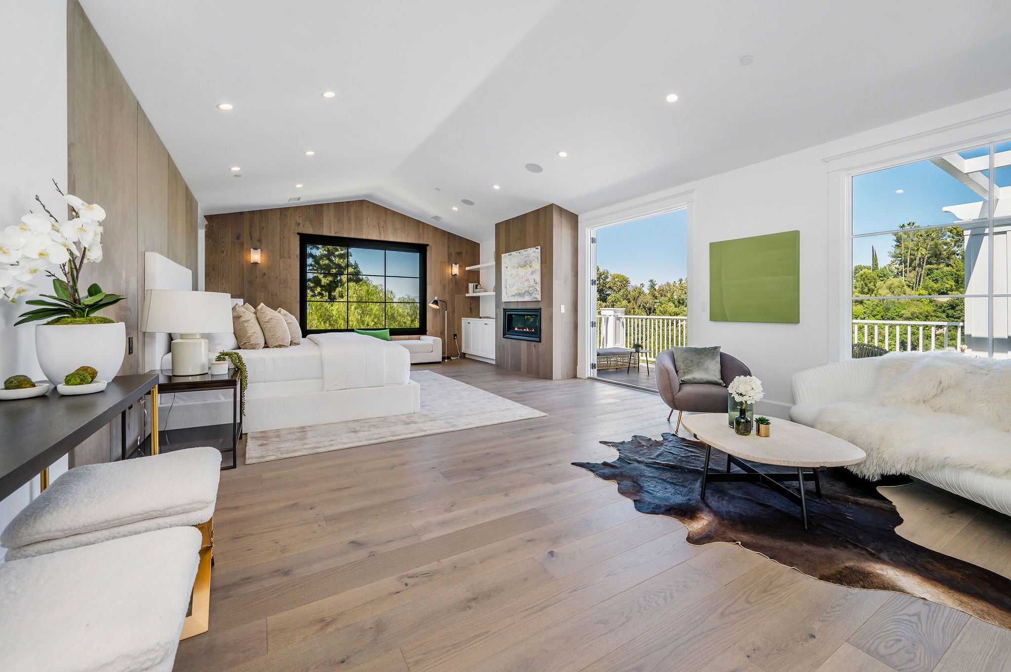 Tucked behind private gates & surrounded by an incredibly lush English garden, this modern cape cod estate presents its own luxurious oasis. Excellent location w/ easy access to 101, 405 freeways & back route access to the westside. Impressive entry beholds the magnificent open layout, soaring ceilings, & flooding natural light. Inviting formal living room w/ a sleek fireplace keeps a cozy yet grand feel. Stunning wood floors lead you through to the light & bright dining room encompassed by large french doors & a gorgeous interior courtyard. Gourmet kitchen features state of the art appliances, double island w/ plenty of room for informal dining, butlers pantry, & ample cabinetry & storage space. Adjacent, the large, striking bar sweeps through to the expansive family room. Open up your massive pocket doors to live the ultimate entertainers dream w/ a smooth indoor/outdoor entertaining flow. The backyard sanctuary w/ incredible views features infinity zero edge pool & spa, pool house, patio space, firepit, plenty of grass space, covered alfresco dining w/ outdoor bbq, cooking area & fridge. Upstairs, the boasting master suite showcases panoramic views, lovely sitting area & deck, his & her walk in closets, bathroom w/ his & hers smart toilets, extra large steam shower & a soaking tub. Oversized bedrooms feature en suite bathrooms & walk in closets. Additional amenities include home theater, balconies, fruit trees- citrus, avocado, loquat, apricot & more, second multipurpose unit can be used as gym, game room, mother in law, etc. 3 car garage, laundry room, & so much more.