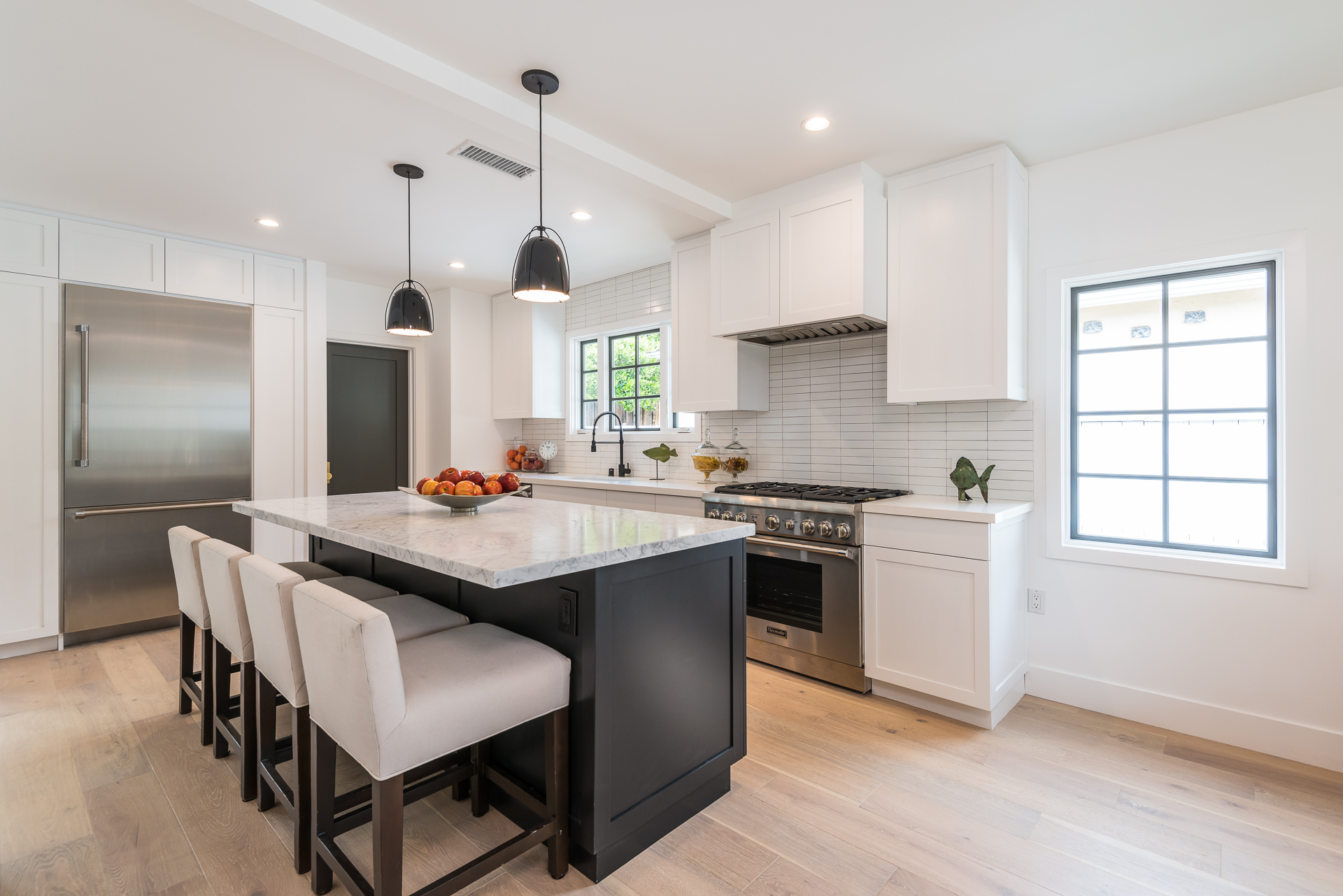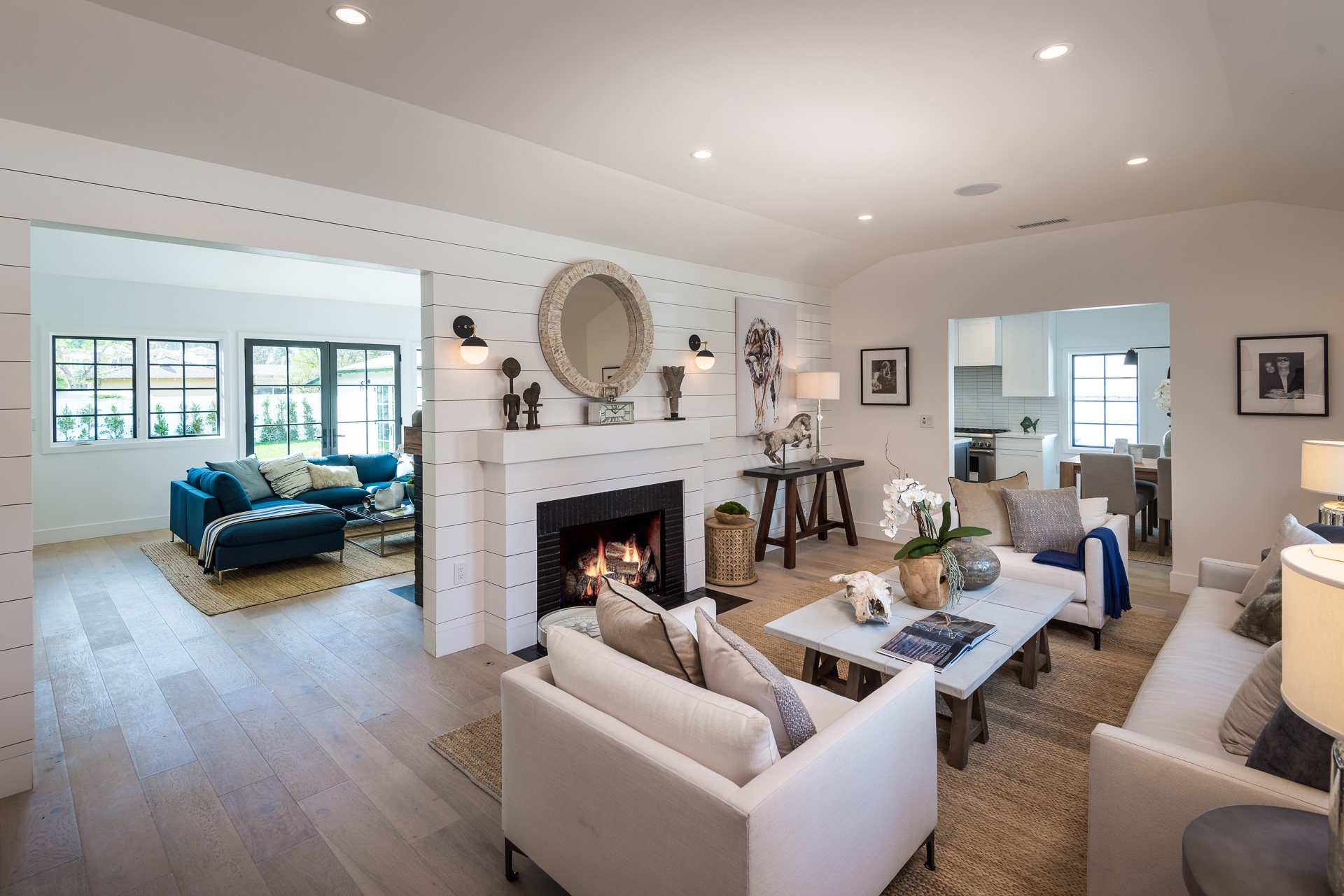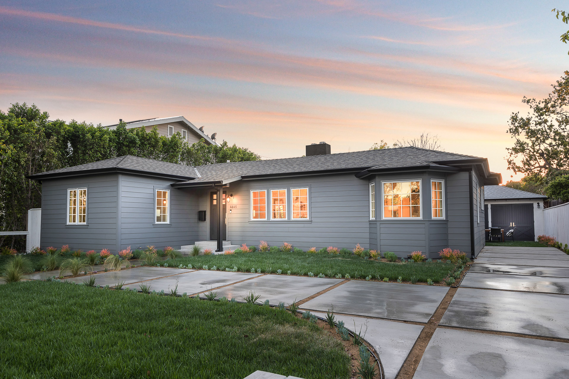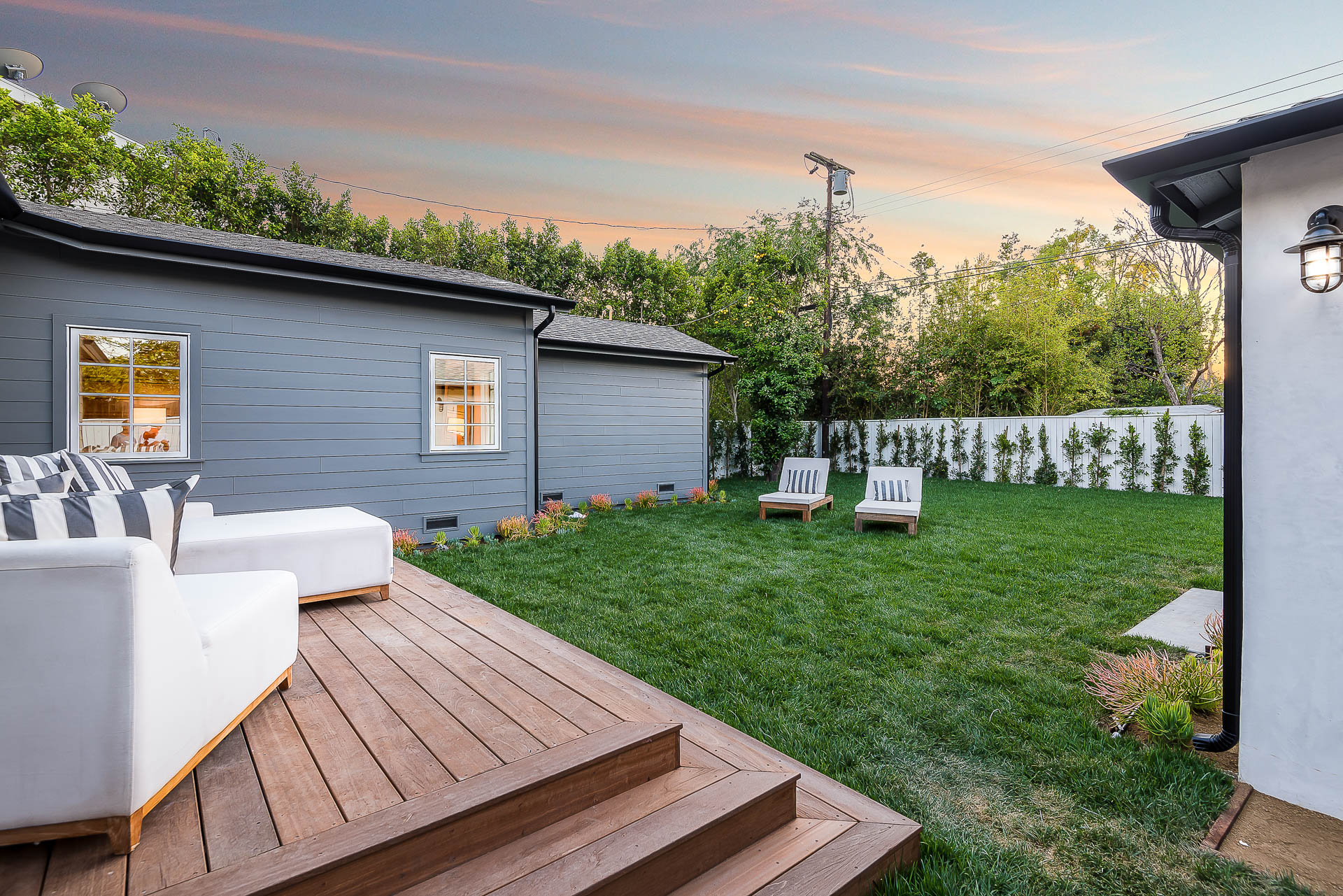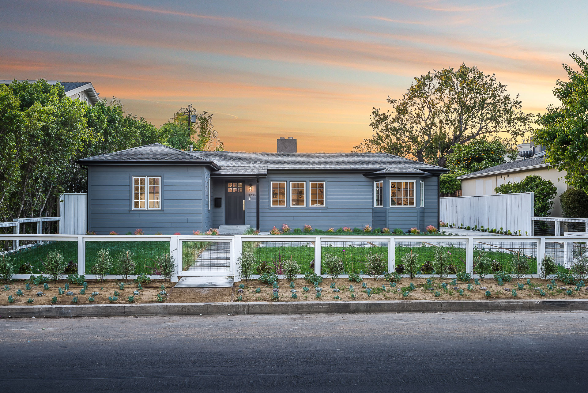 Completely rebuilt single-story farmhouse style home located in beautiful Sherman Oaks. This 3 bedroom, 3-bathroom home with nearly 2,100 sqft is the perfect family quarters. Stunning amenities throughout include spacious open floor plan with cozy dual fireplace. Elegant white kitchen is flooded with natural light, great for entertaining. Through the family room glass sliders you are greeted by a wooden deck, leading into the lush greens that surround the detached studio perfect for the coolest man cave, home office, or art studio. The master retreat lacks no details, from the barn door, to the master bath brimmed with gold details.