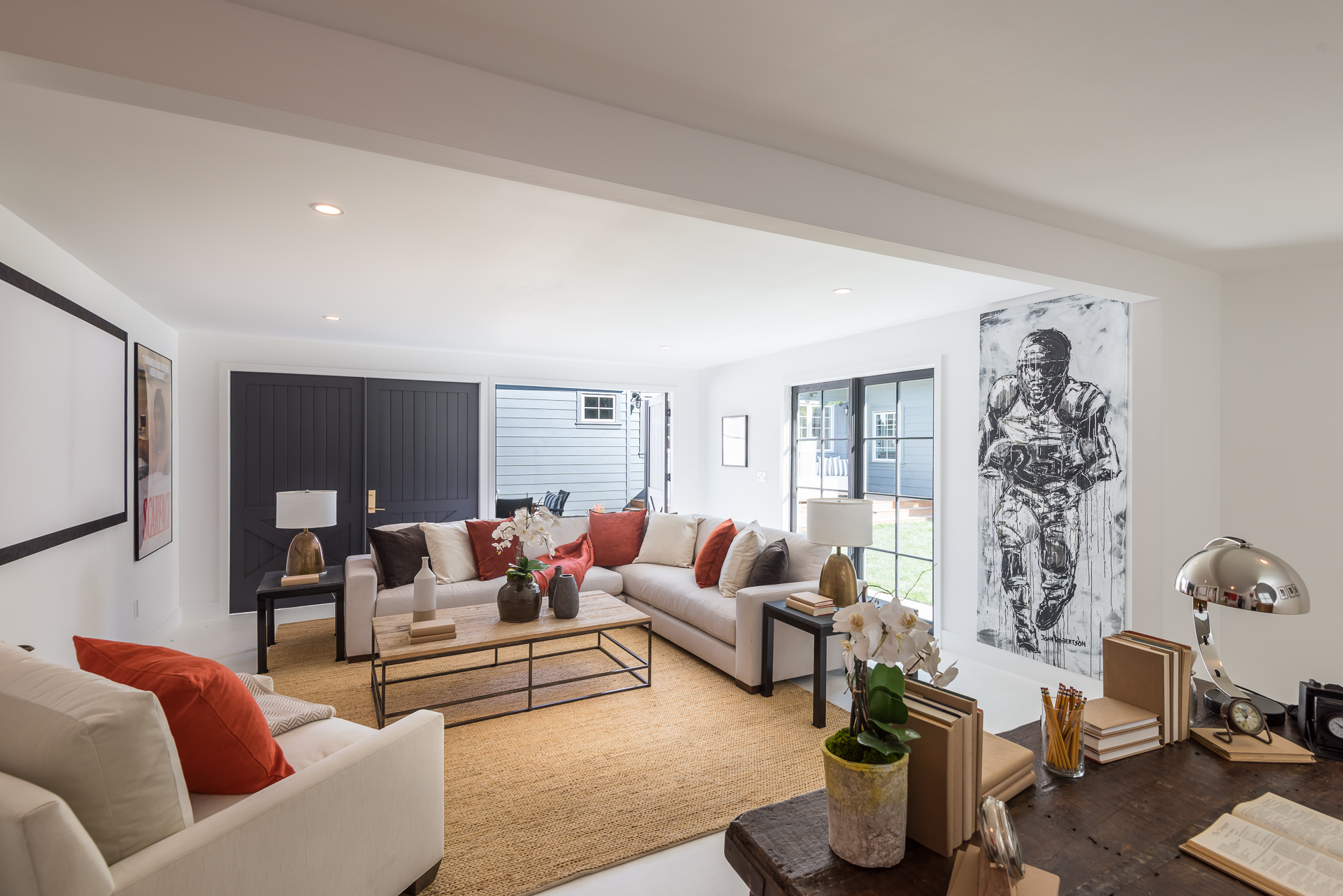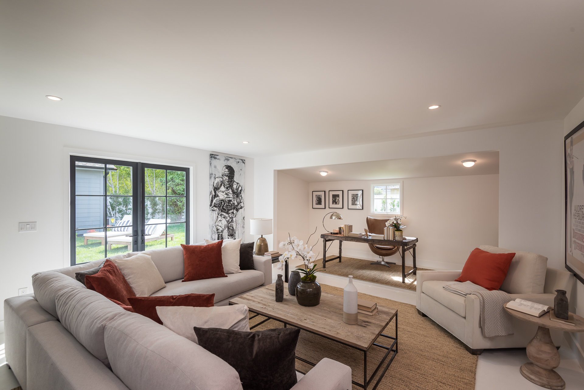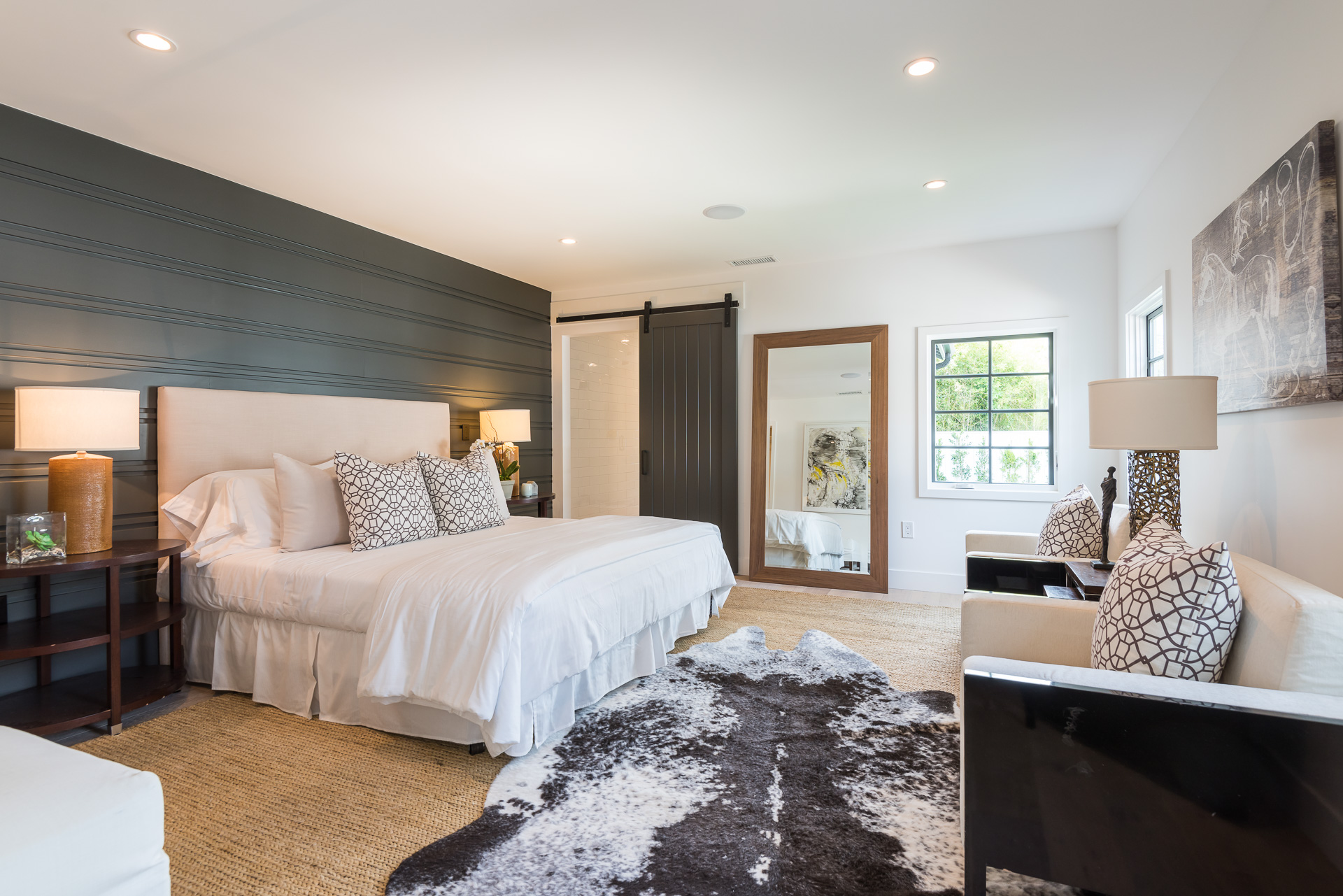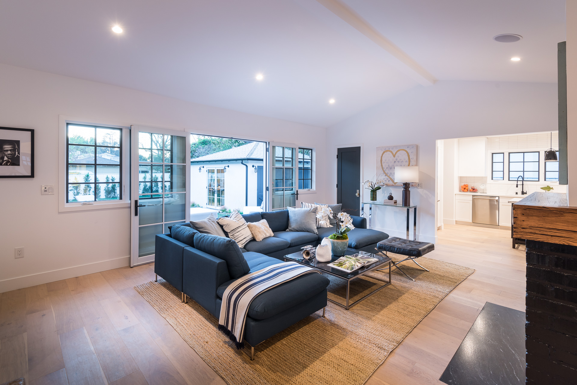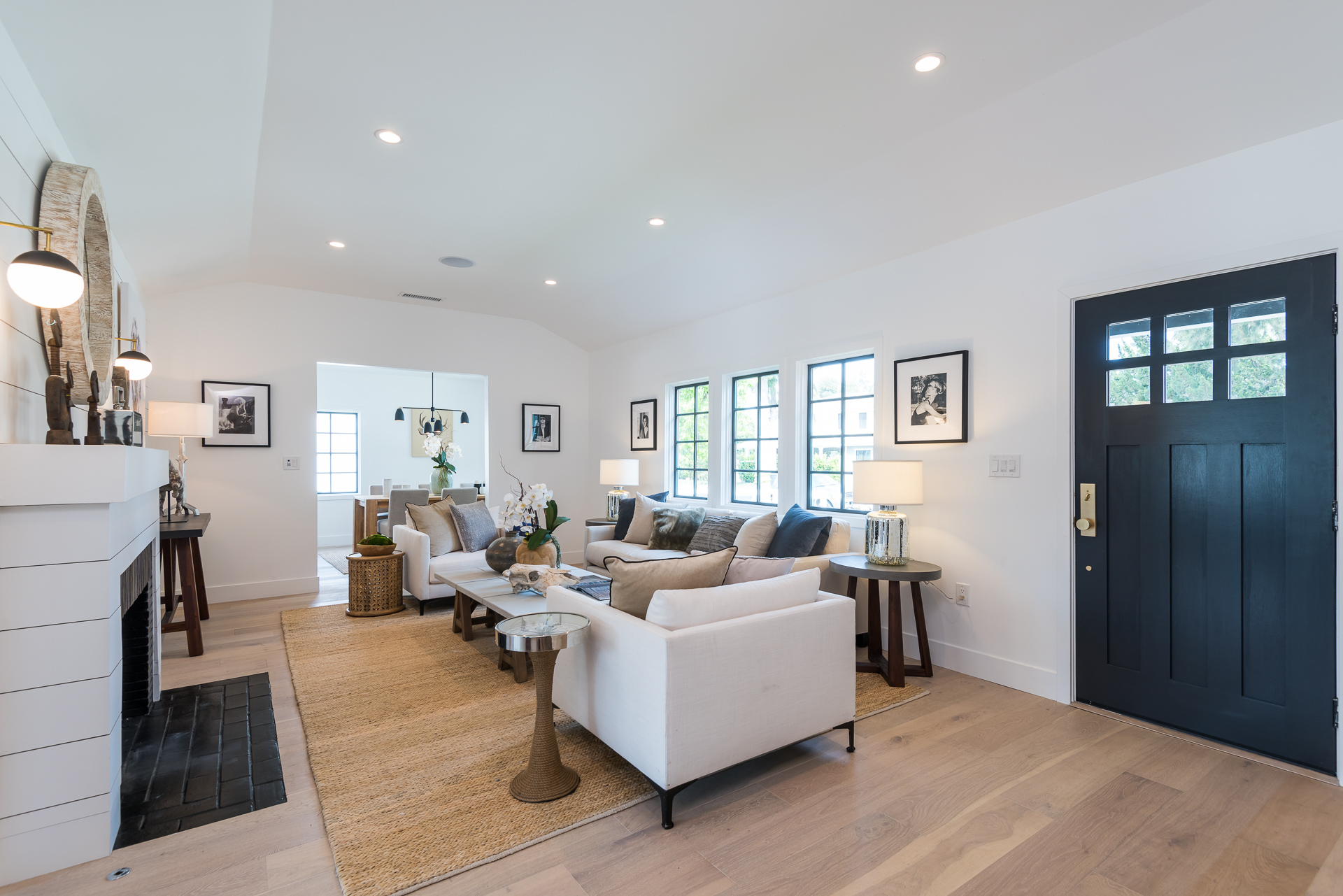 Completely rebuilt single-story farmhouse style home located in beautiful Sherman Oaks. This 3 bedroom, 3-bathroom home with nearly 2,100 sqft is the perfect family quarters. Stunning amenities throughout include spacious open floor plan with cozy dual fireplace. Elegant white kitchen is flooded with natural light, great for entertaining. Through the family room glass sliders you are greeted by a wooden deck, leading into the lush greens that surround the detached studio perfect for the coolest man cave, home office, or art studio. The master retreat lacks no details, from the barn door, to the master bath brimmed with gold details.