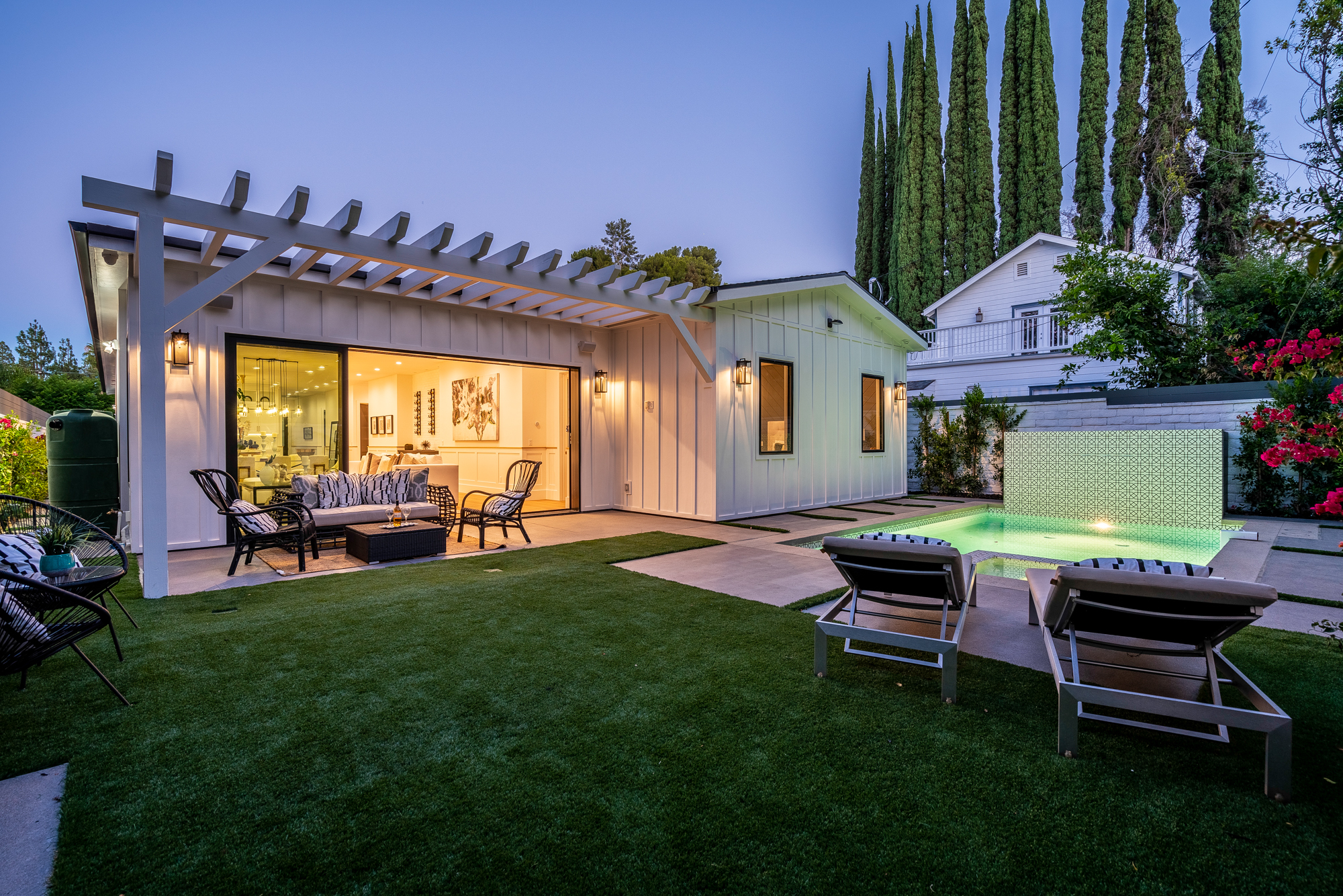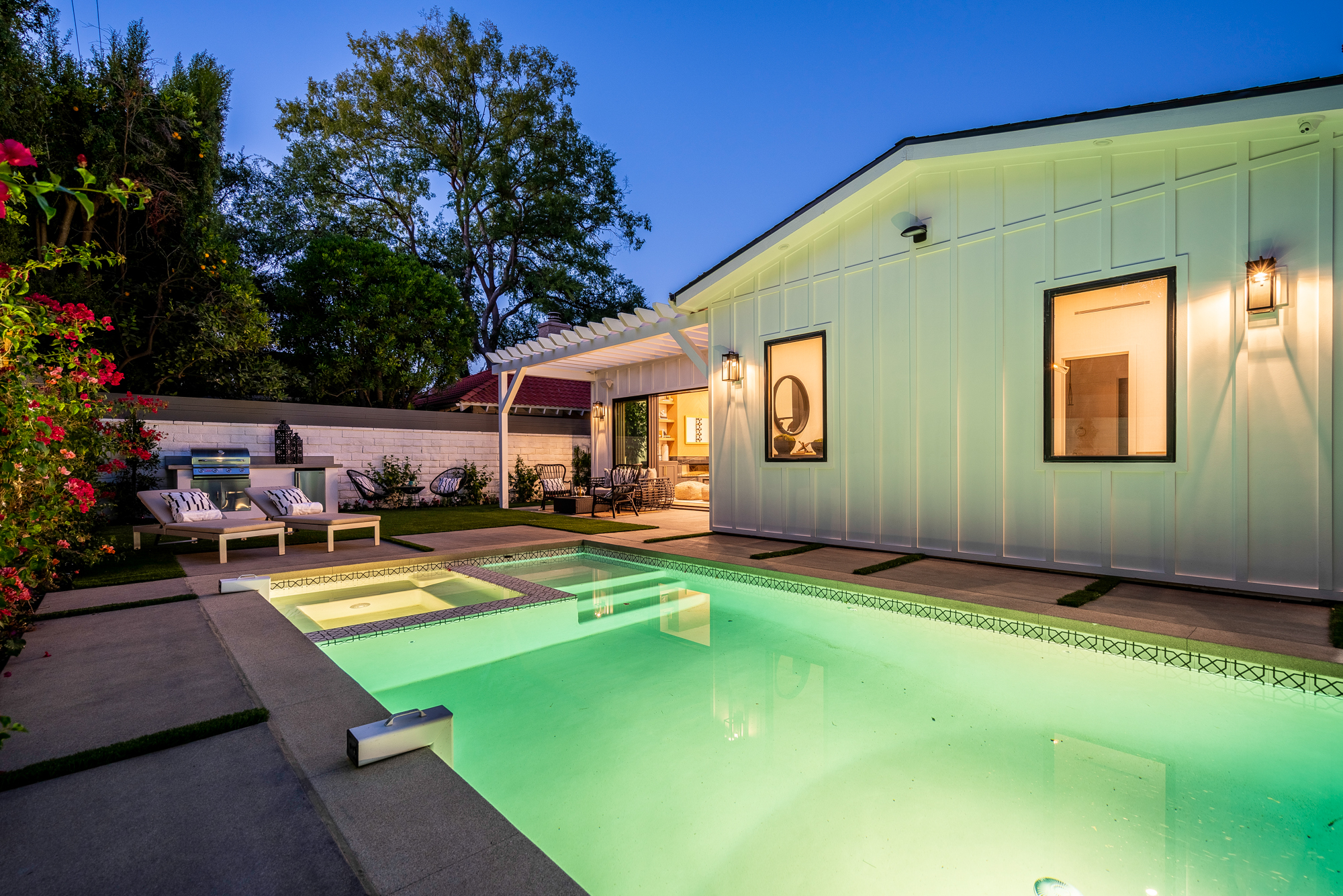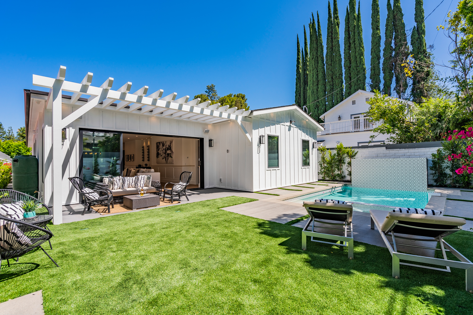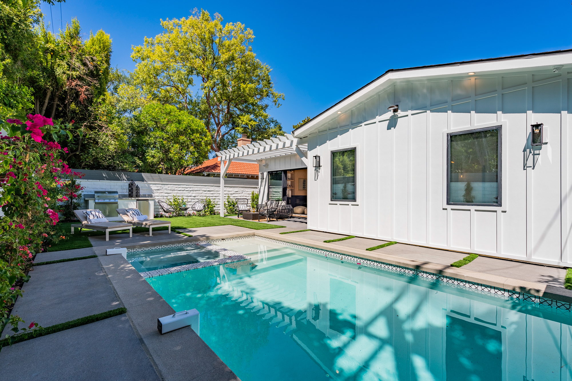 Welcome to your stunning single story newly developed home exceptionally located in Encino, South of the boulevard. Charming curb appeal welcomes you to this enchanting 4 bedroom, 5 bathroom beautifully built modern farmhouse designed for any family, big or small. Incredible and versatile open floor plan boasts over 3,000 sqft of spacious living. Tastefully designed, this home stands out with its light wood floors, gleaming light fixtures, custom built ins, trendy wall textures, and more. Open concept layout offers Chefs kitchen, formal dining space, and living area all naturally joined in one entertainers dream environment. Glamorous kitchen beholds a center island with room for seating and snacking, top of the line appliances, and a walk-in pantry. Large glass sliding doors flood in gorgeous natural light and also lead you directly out to the backyard retreat featuring a built in bbq, covered lounge area, and sparkling pool and spa. Master suite offers a grand walk-in closet and luxurious spa-like bathroom with soaking tub, massive walk-in shower, privacy door, and dual sinks. Additional 3 bedrooms offer ultimate privacy with each having their very own ensuite bathrooms. Unbeatable location, just a stroll to Ventura Blvds best shops and dining. Location & amenities galore await you!
