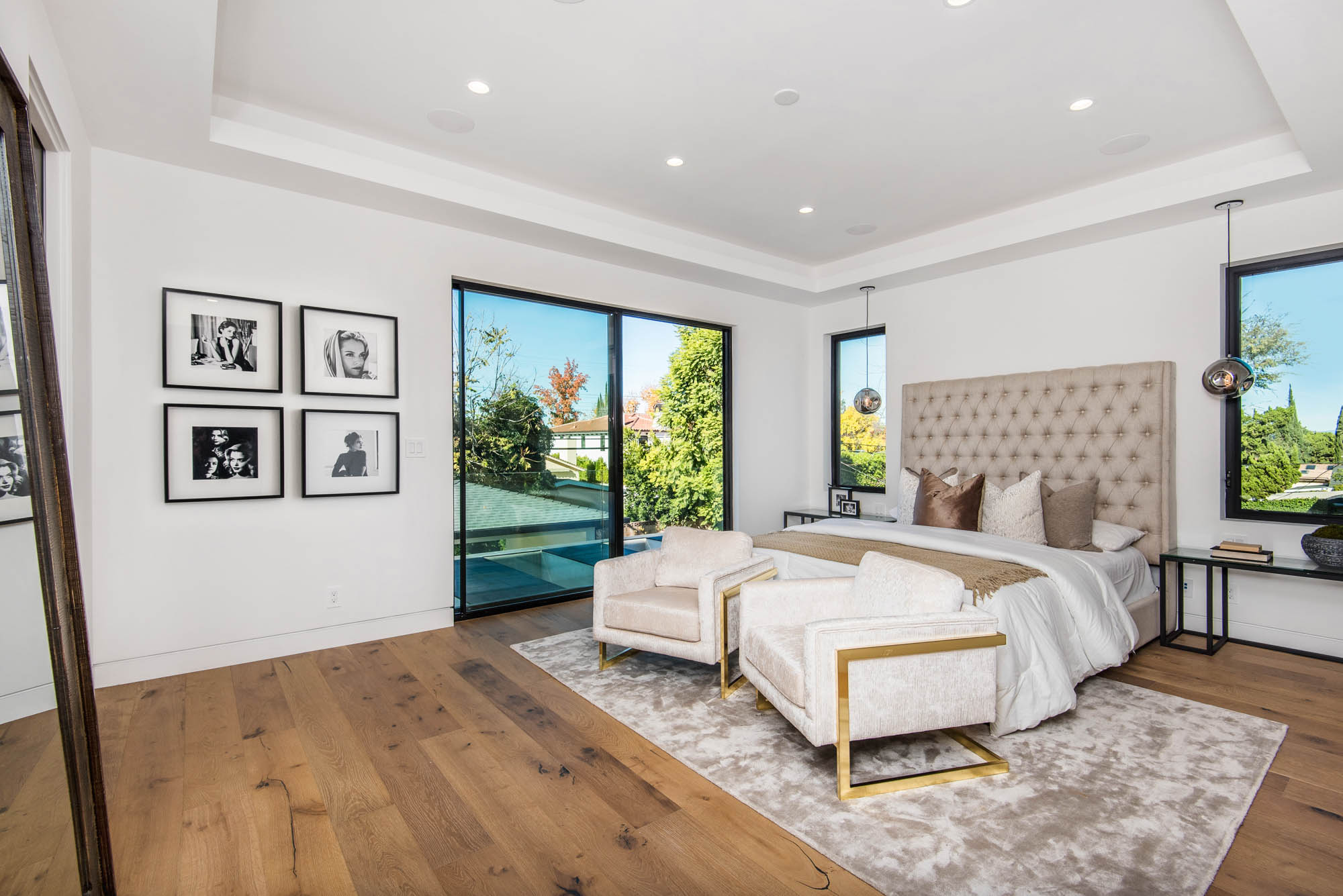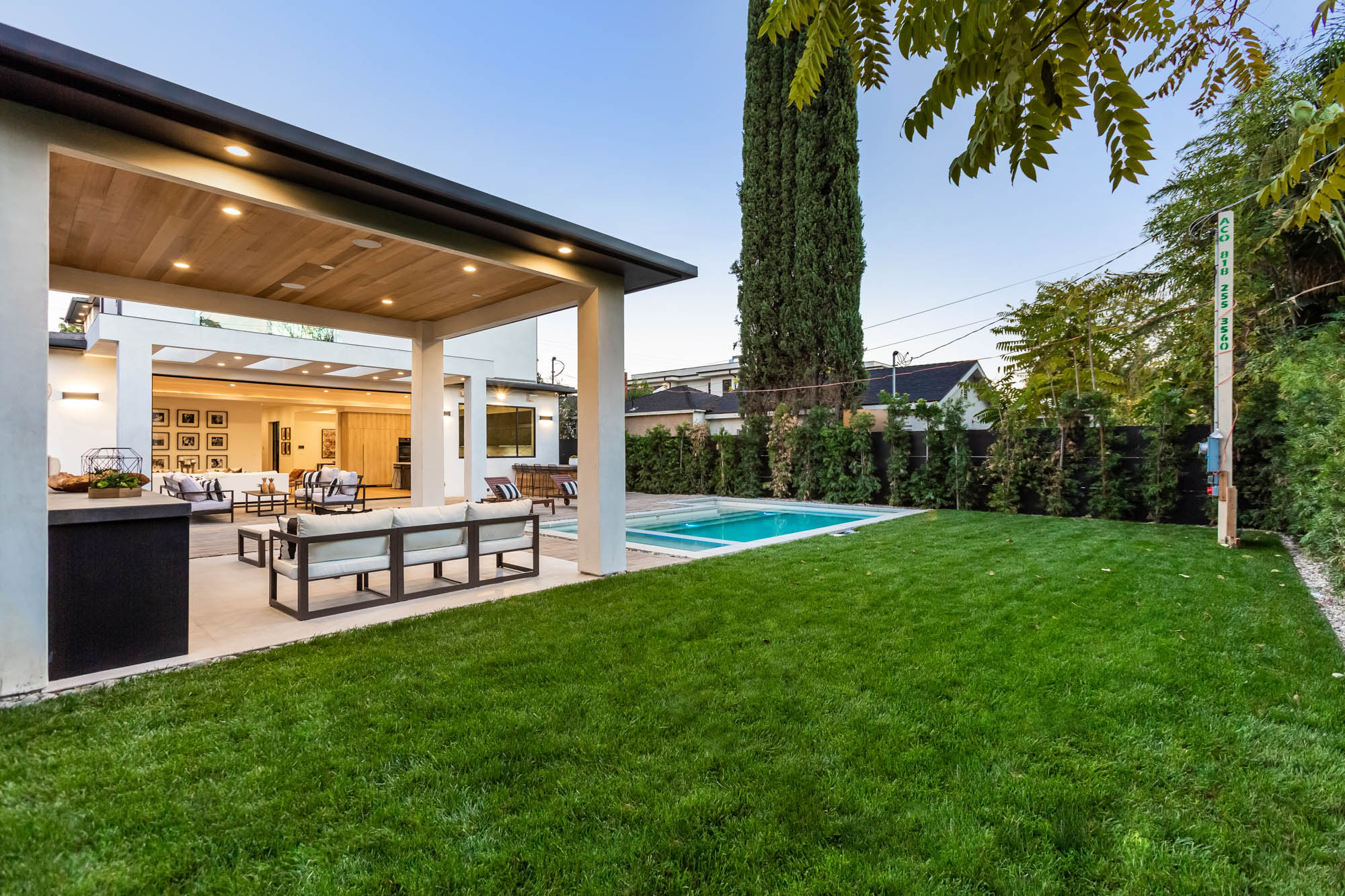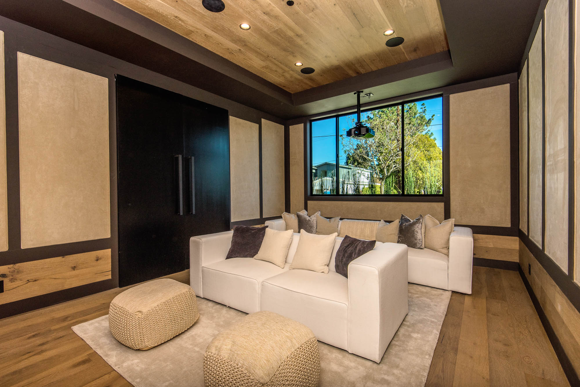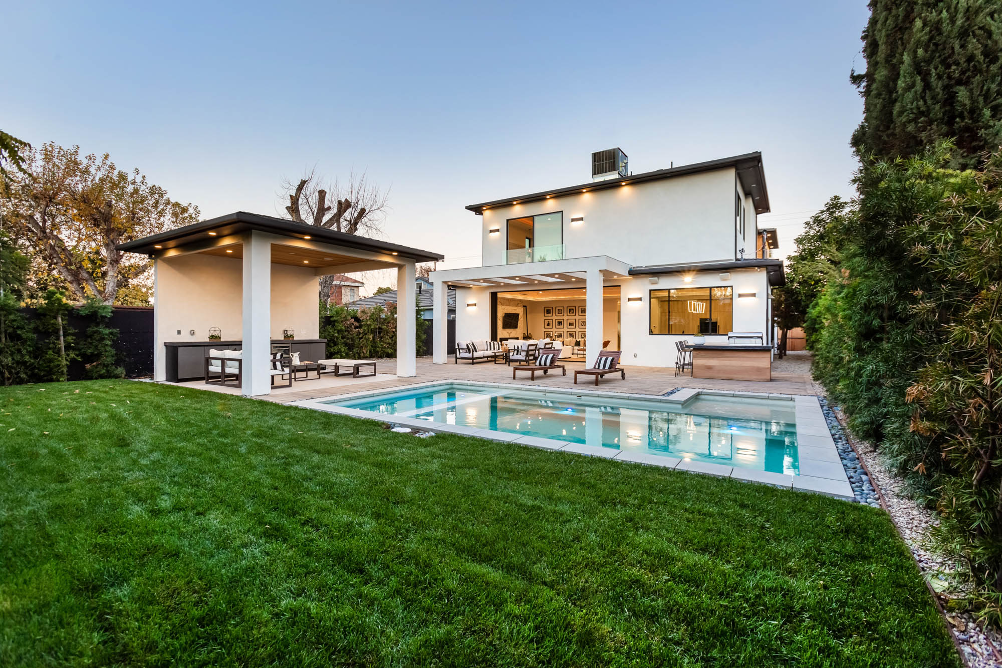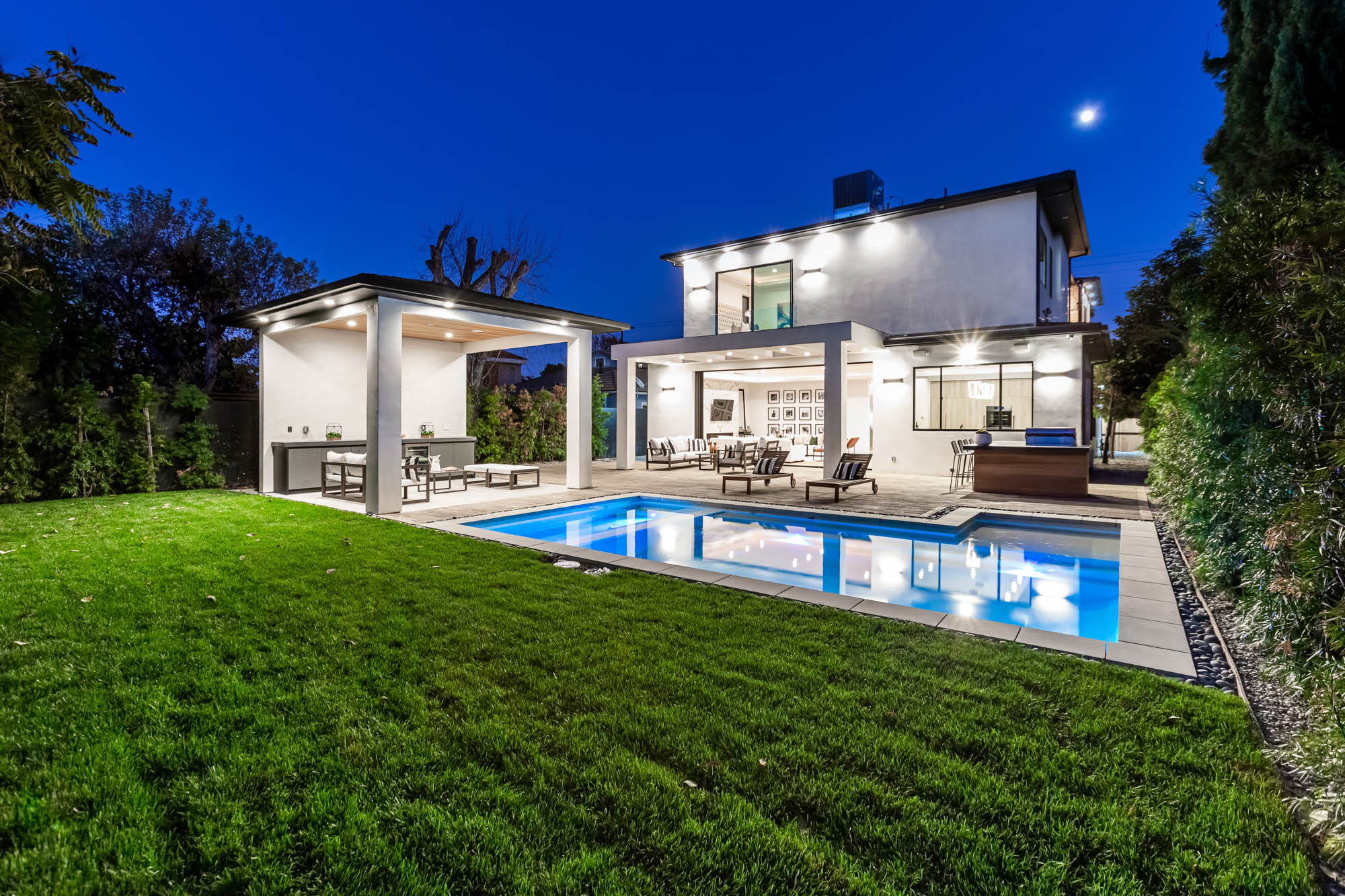 Exquisite soft modern in sought after Encino location. Walk through this open layout home with exceptional indoor-outdoor living all illuminated with immense natural light and custom designed light fixtures. First floor hosts a stunning dining room, complete with glass encased wine room directly across, modern light fixtures, Hardwood Flooring, Large living room w/ custom fireplace, ensuite bedroom, Home theater, and impressive Chefs Kitchen. Bold and contrasting kitchen features an abundance of cabinet/counter space, top of the line appliances,& large center Island. Through large pocket doors reveal an entertainers backyard that will awe w/resort like Pool & Spa, Cabana, Built-in BBQ, covered dining/entertaining space, and generous greenery for privacy. Just upstairs, large statement making light fixtures guides your way to the Master Suite and remaining ensuite bedrooms. Master bed features glass sliding doors, boutique like walk in closet, and modern bathroom. Incredible attention to detail is proven with all the fine fixtures and finishes of this home. Additional amenities include smart home capabilities, laundry room, home theater, wine room, 2 balconies, and so much more! A property of uncompromising quality and style! Location just seconds away from Ventura Blvd, shopping, dining. Must See!