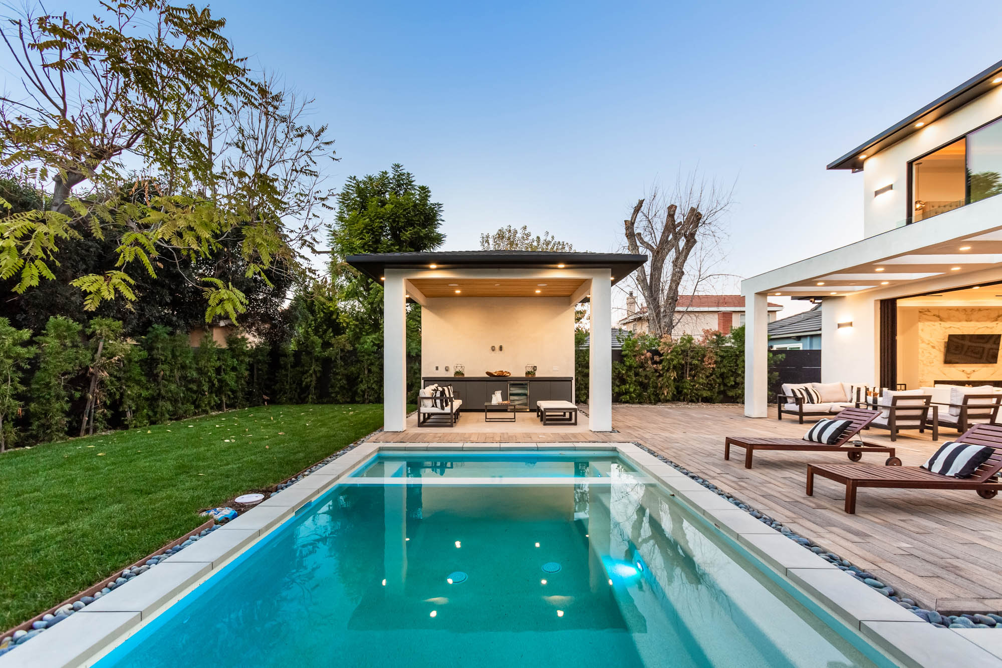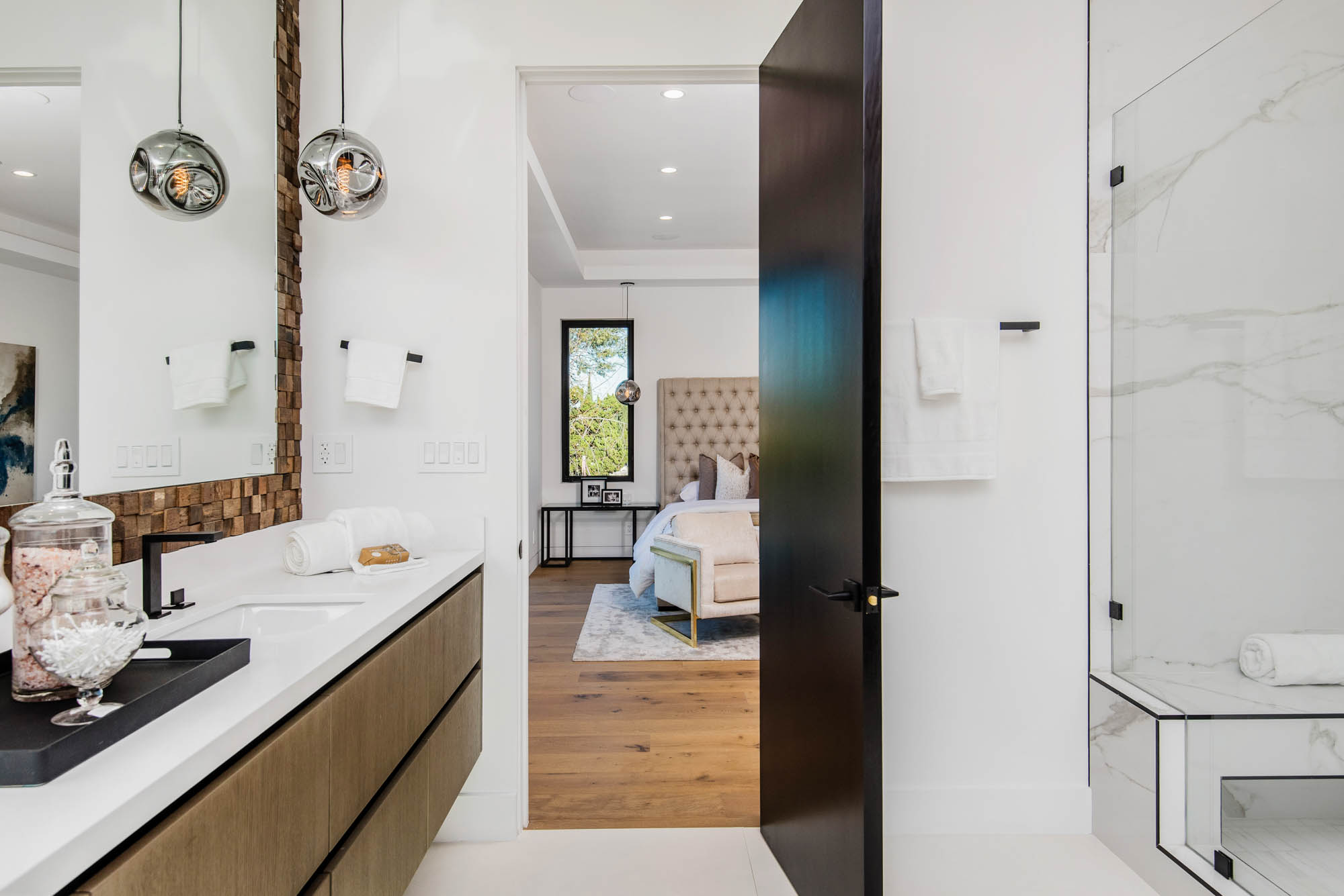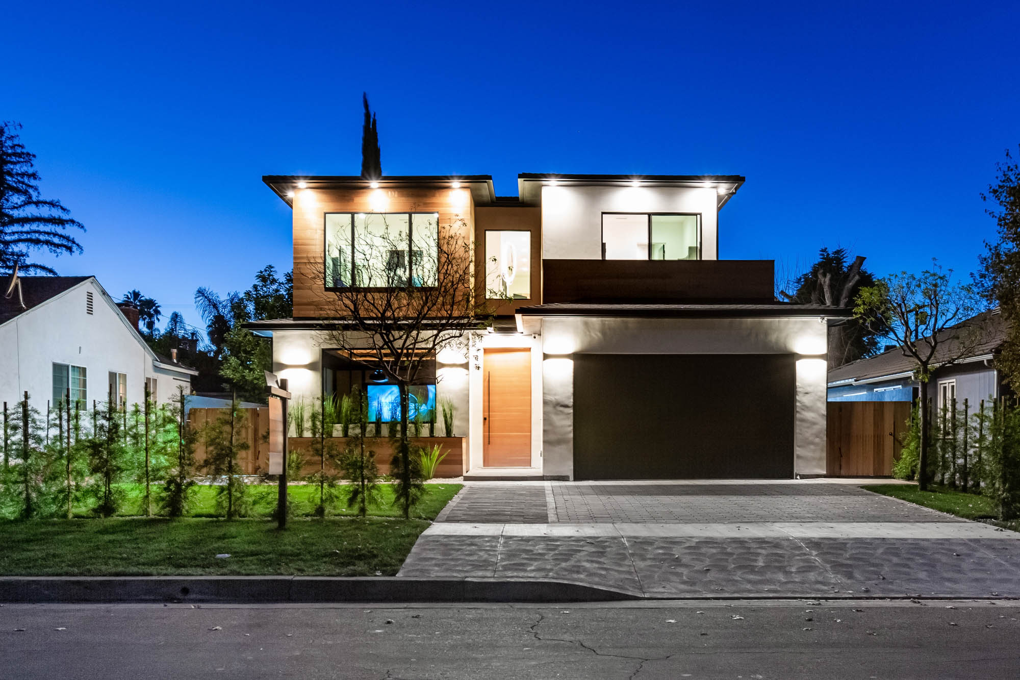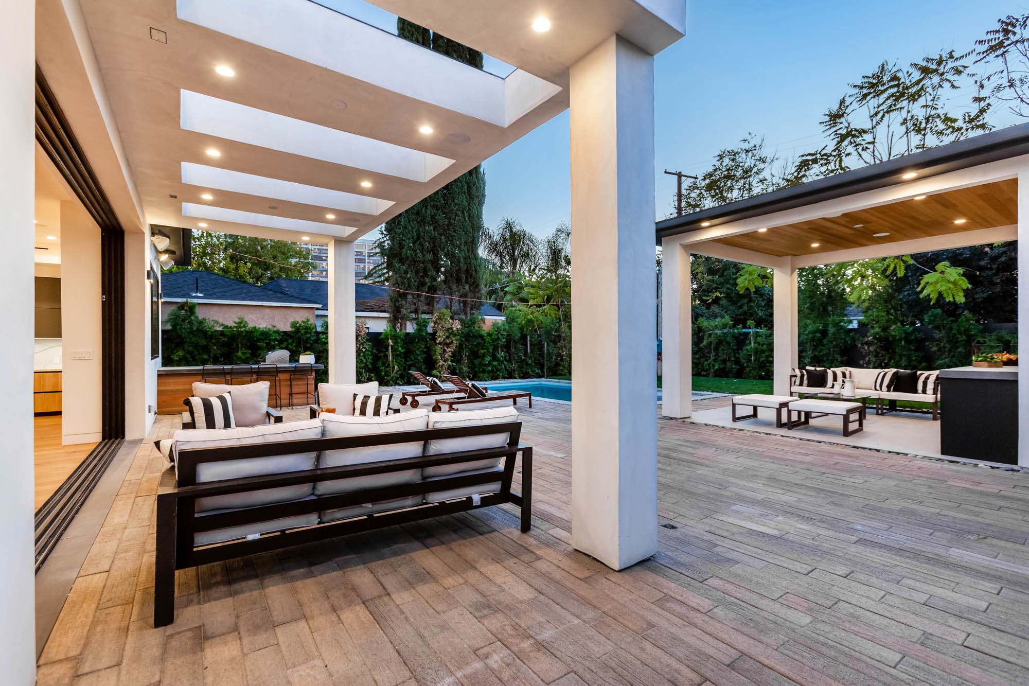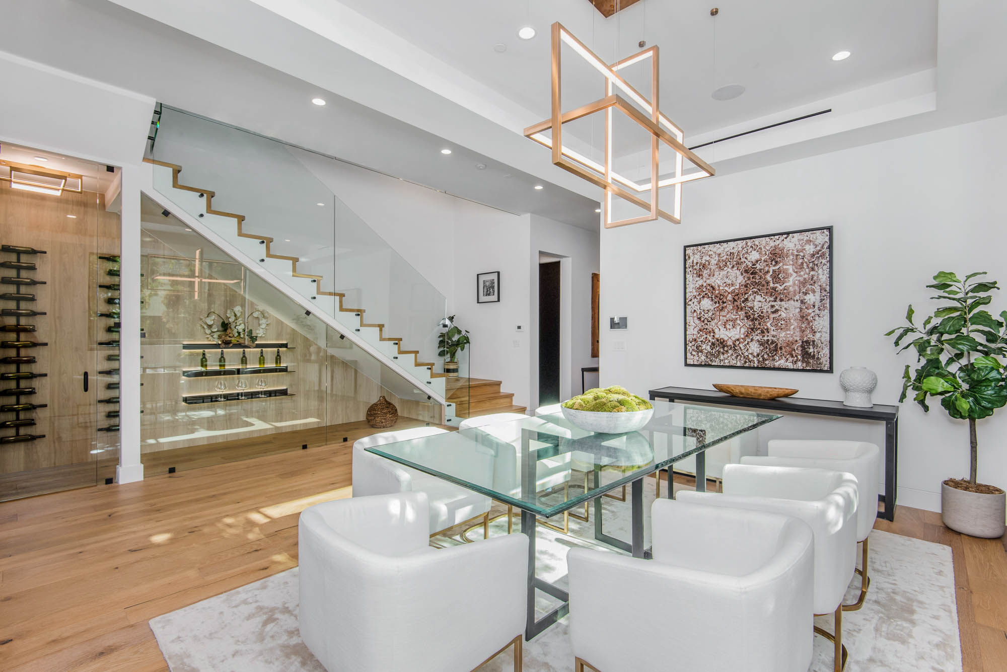 Exquisite soft modern in sought after Encino location. Walk through this open layout home with exceptional indoor-outdoor living all illuminated with immense natural light and custom designed light fixtures. First floor hosts a stunning dining room, complete with glass encased wine room directly across, modern light fixtures, Hardwood Flooring, Large living room w/ custom fireplace, ensuite bedroom, Home theater, and impressive Chefs Kitchen. Bold and contrasting kitchen features an abundance of cabinet/counter space, top of the line appliances,& large center Island. Through large pocket doors reveal an entertainers backyard that will awe w/resort like Pool & Spa, Cabana, Built-in BBQ, covered dining/entertaining space, and generous greenery for privacy. Just upstairs, large statement making light fixtures guides your way to the Master Suite and remaining ensuite bedrooms. Master bed features glass sliding doors, boutique like walk in closet, and modern bathroom. Incredible attention to detail is proven with all the fine fixtures and finishes of this home. Additional amenities include smart home capabilities, laundry room, home theater, wine room, 2 balconies, and so much more! A property of uncompromising quality and style! Location just seconds away from Ventura Blvd, shopping, dining. Must See!