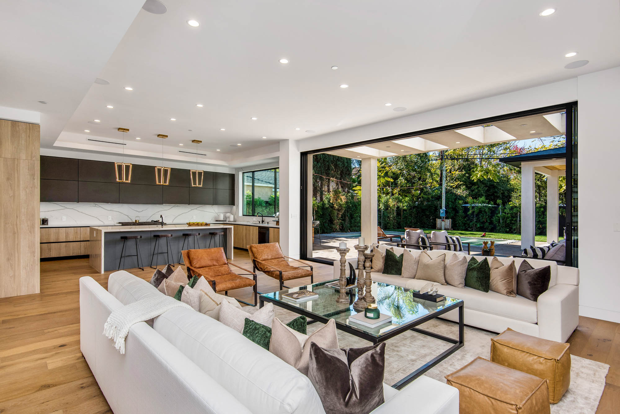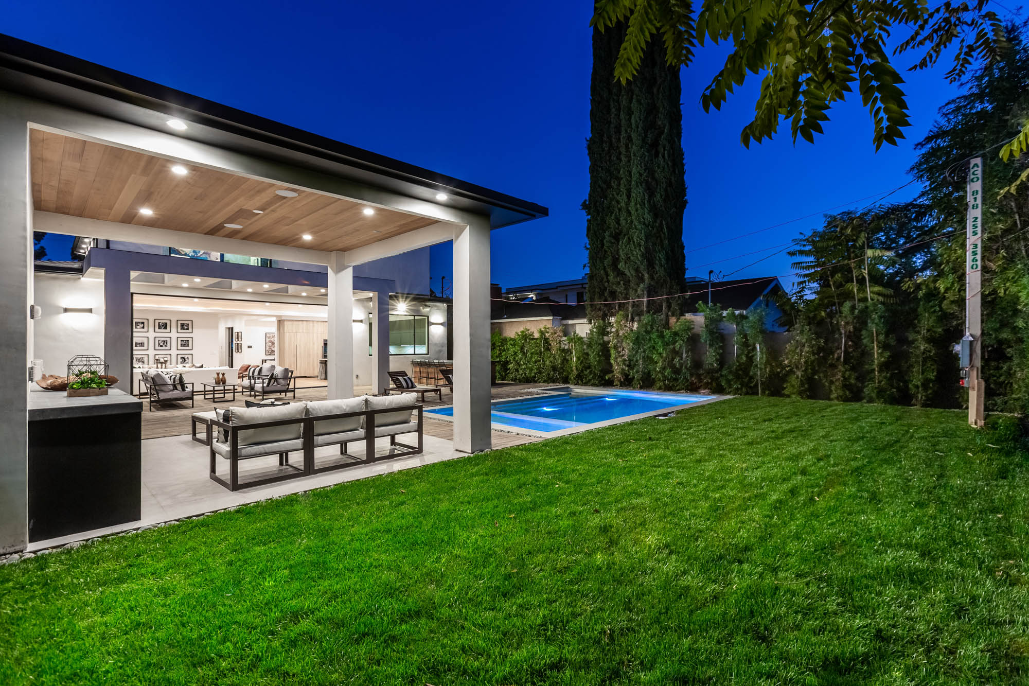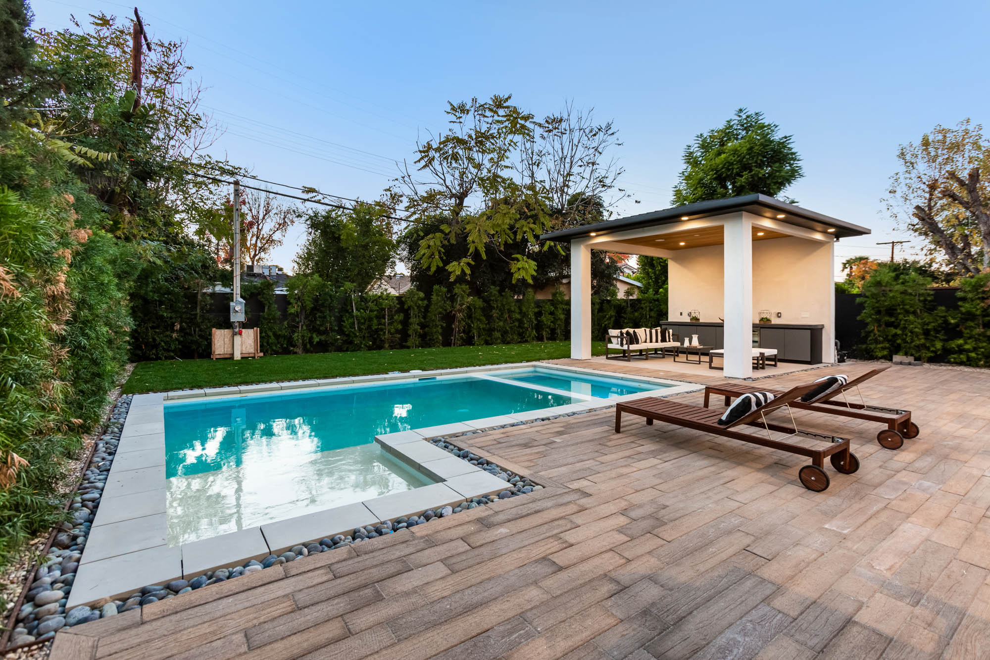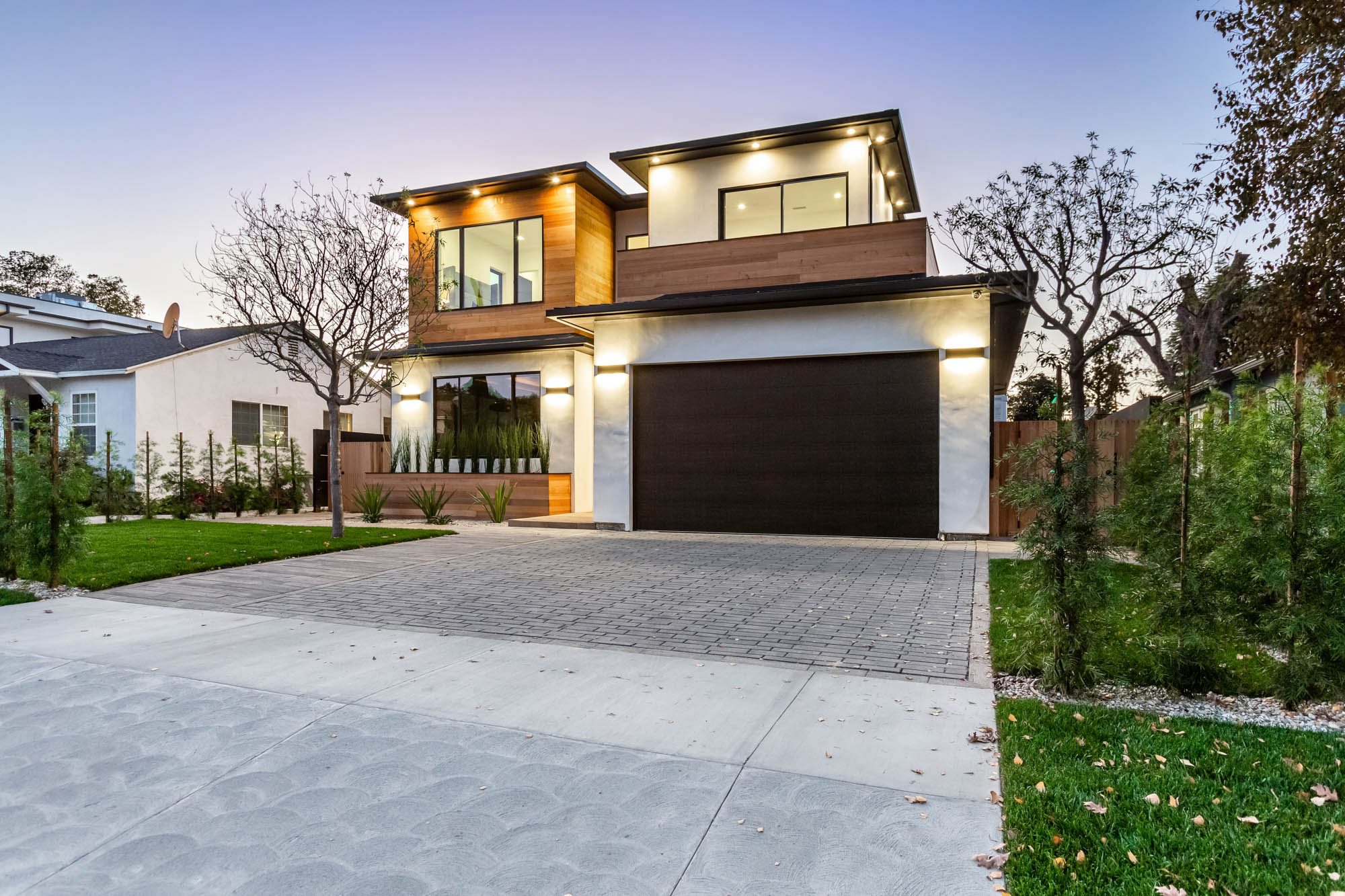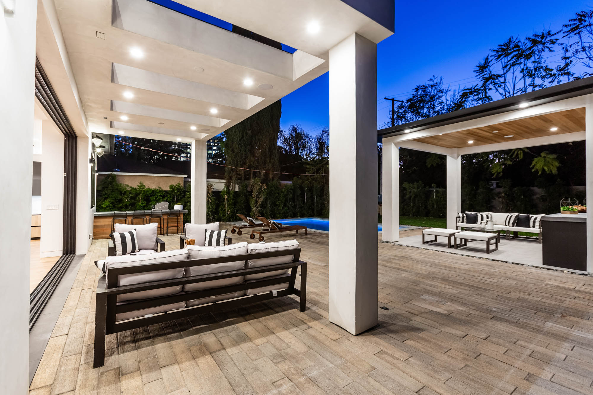 Exquisite soft modern in sought after Encino location. Walk through this open layout home with exceptional indoor-outdoor living all illuminated with immense natural light and custom designed light fixtures. First floor hosts a stunning dining room, complete with glass encased wine room directly across, modern light fixtures, Hardwood Flooring, Large living room w/ custom fireplace, ensuite bedroom, Home theater, and impressive Chefs Kitchen. Bold and contrasting kitchen features an abundance of cabinet/counter space, top of the line appliances,& large center Island. Through large pocket doors reveal an entertainers backyard that will awe w/resort like Pool & Spa, Cabana, Built-in BBQ, covered dining/entertaining space, and generous greenery for privacy. Just upstairs, large statement making light fixtures guides your way to the Master Suite and remaining ensuite bedrooms. Master bed features glass sliding doors, boutique like walk in closet, and modern bathroom. Incredible attention to detail is proven with all the fine fixtures and finishes of this home. Additional amenities include smart home capabilities, laundry room, home theater, wine room, 2 balconies, and so much more! A property of uncompromising quality and style! Location just seconds away from Ventura Blvd, shopping, dining. Must See!