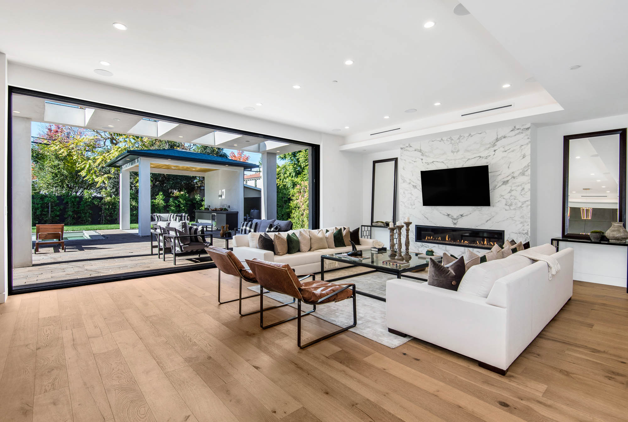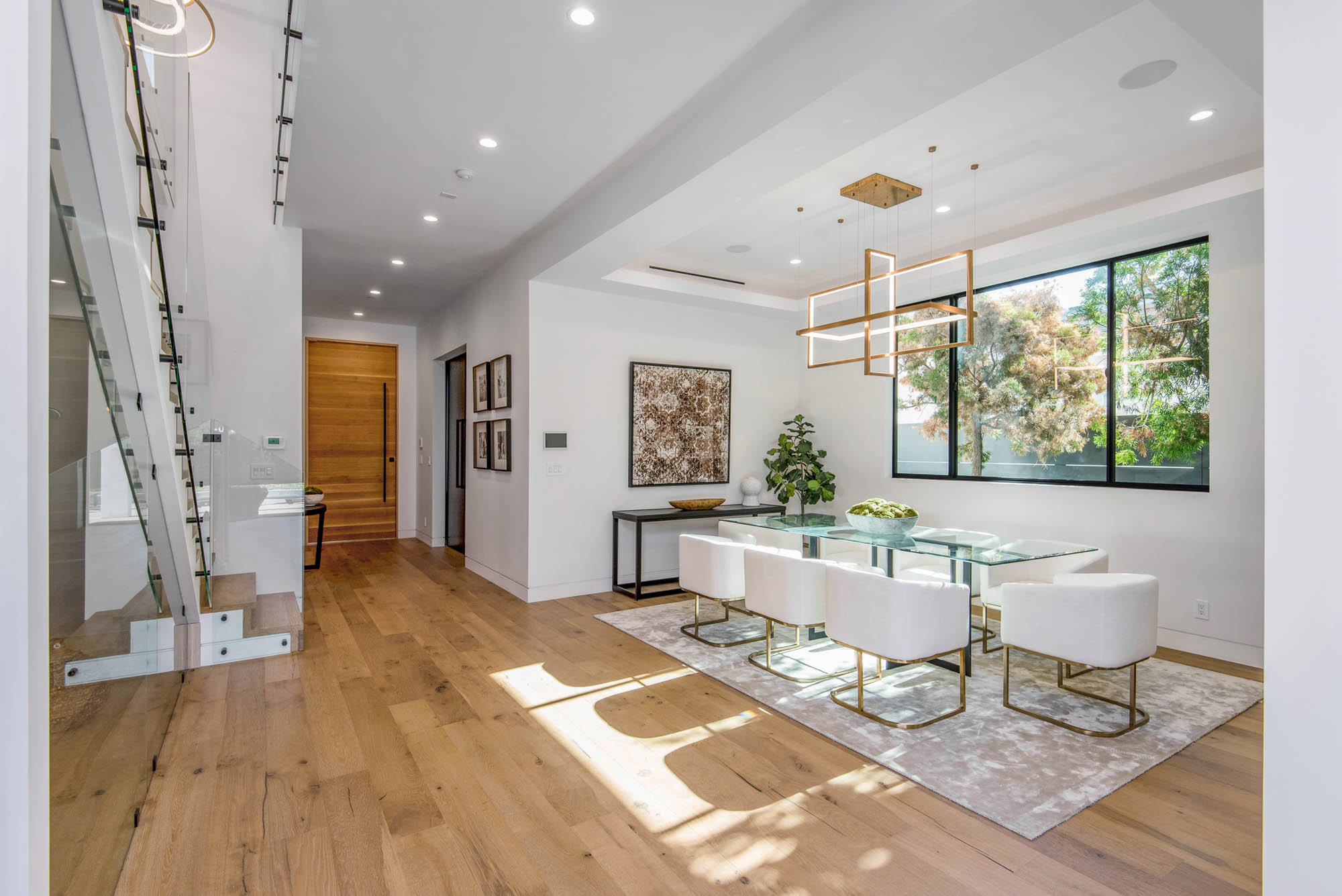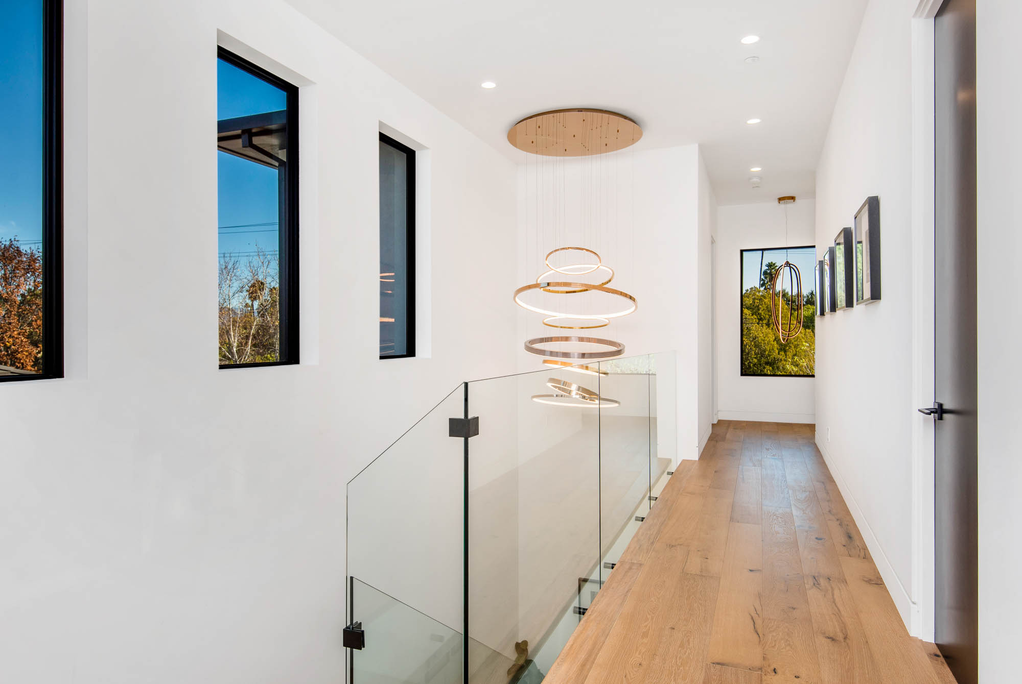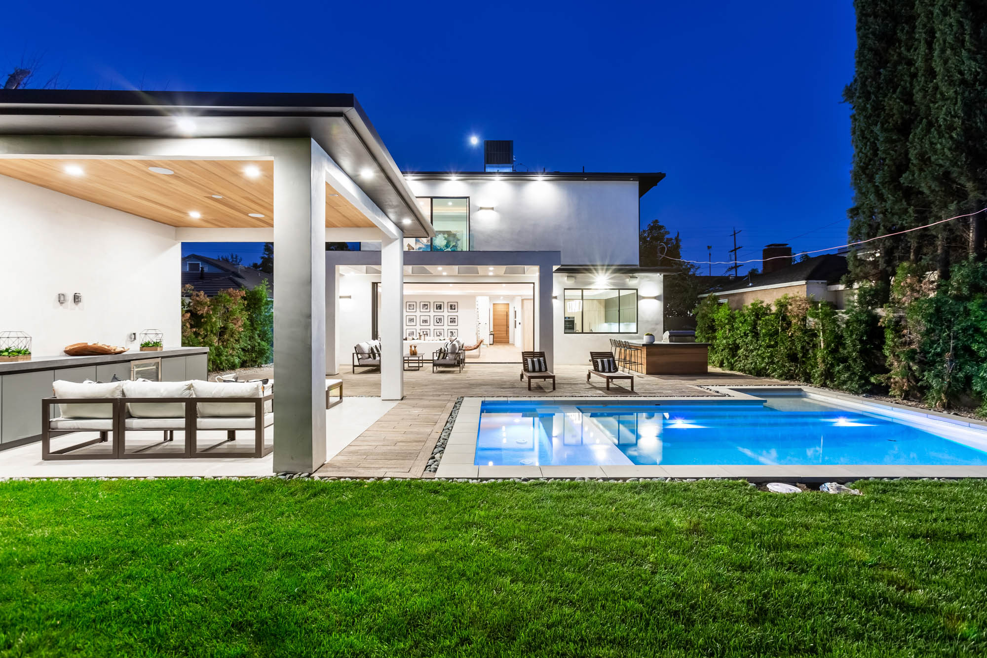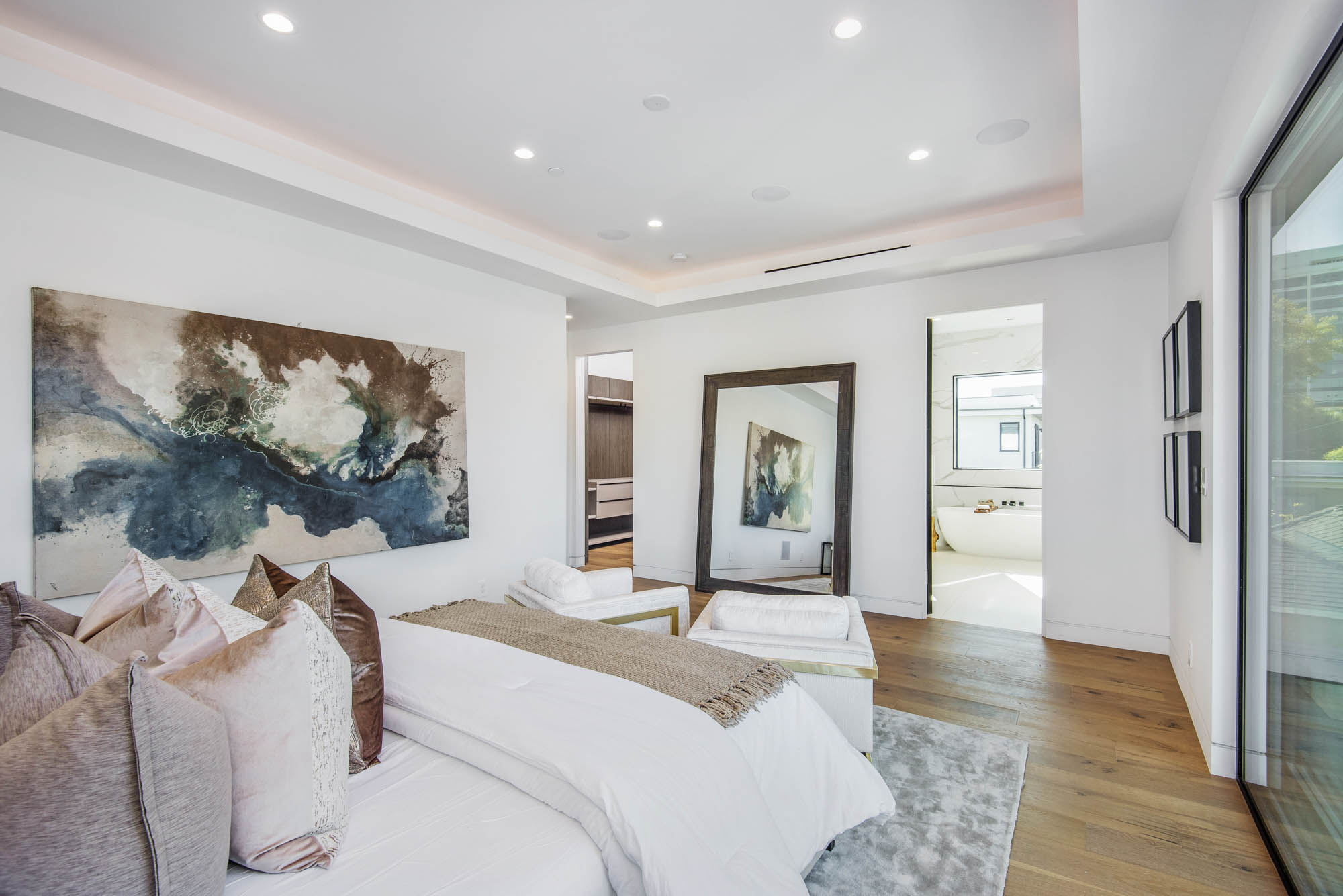 Exquisite soft modern in sought after Encino location. Walk through this open layout home with exceptional indoor-outdoor living all illuminated with immense natural light and custom designed light fixtures. First floor hosts a stunning dining room, complete with glass encased wine room directly across, modern light fixtures, Hardwood Flooring, Large living room w/ custom fireplace, ensuite bedroom, Home theater, and impressive Chefs Kitchen. Bold and contrasting kitchen features an abundance of cabinet/counter space, top of the line appliances,& large center Island. Through large pocket doors reveal an entertainers backyard that will awe w/resort like Pool & Spa, Cabana, Built-in BBQ, covered dining/entertaining space, and generous greenery for privacy. Just upstairs, large statement making light fixtures guides your way to the Master Suite and remaining ensuite bedrooms. Master bed features glass sliding doors, boutique like walk in closet, and modern bathroom. Incredible attention to detail is proven with all the fine fixtures and finishes of this home. Additional amenities include smart home capabilities, laundry room, home theater, wine room, 2 balconies, and so much more! A property of uncompromising quality and style! Location just seconds away from Ventura Blvd, shopping, dining. Must See!