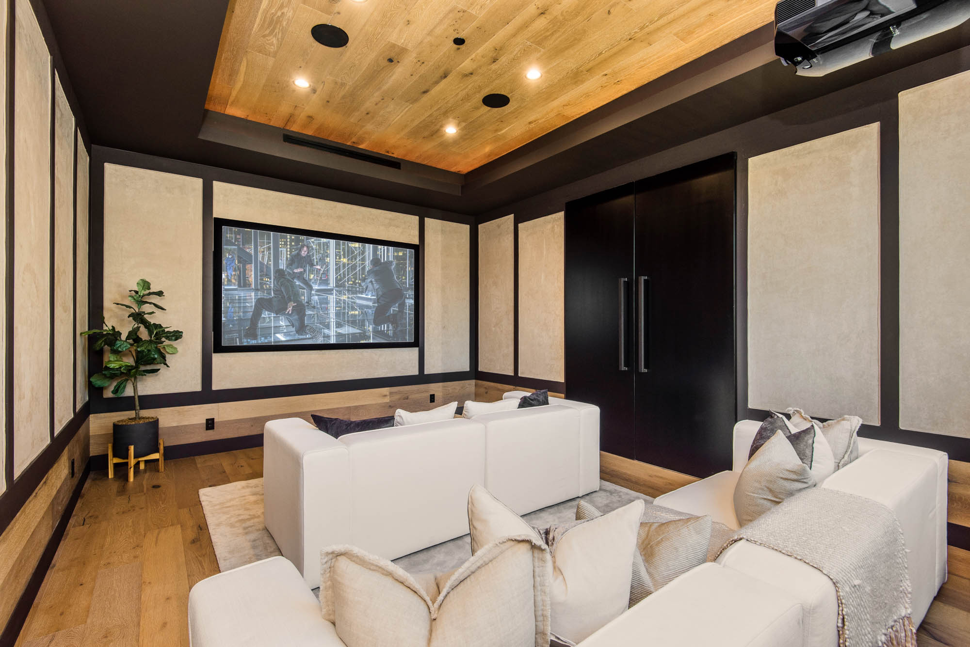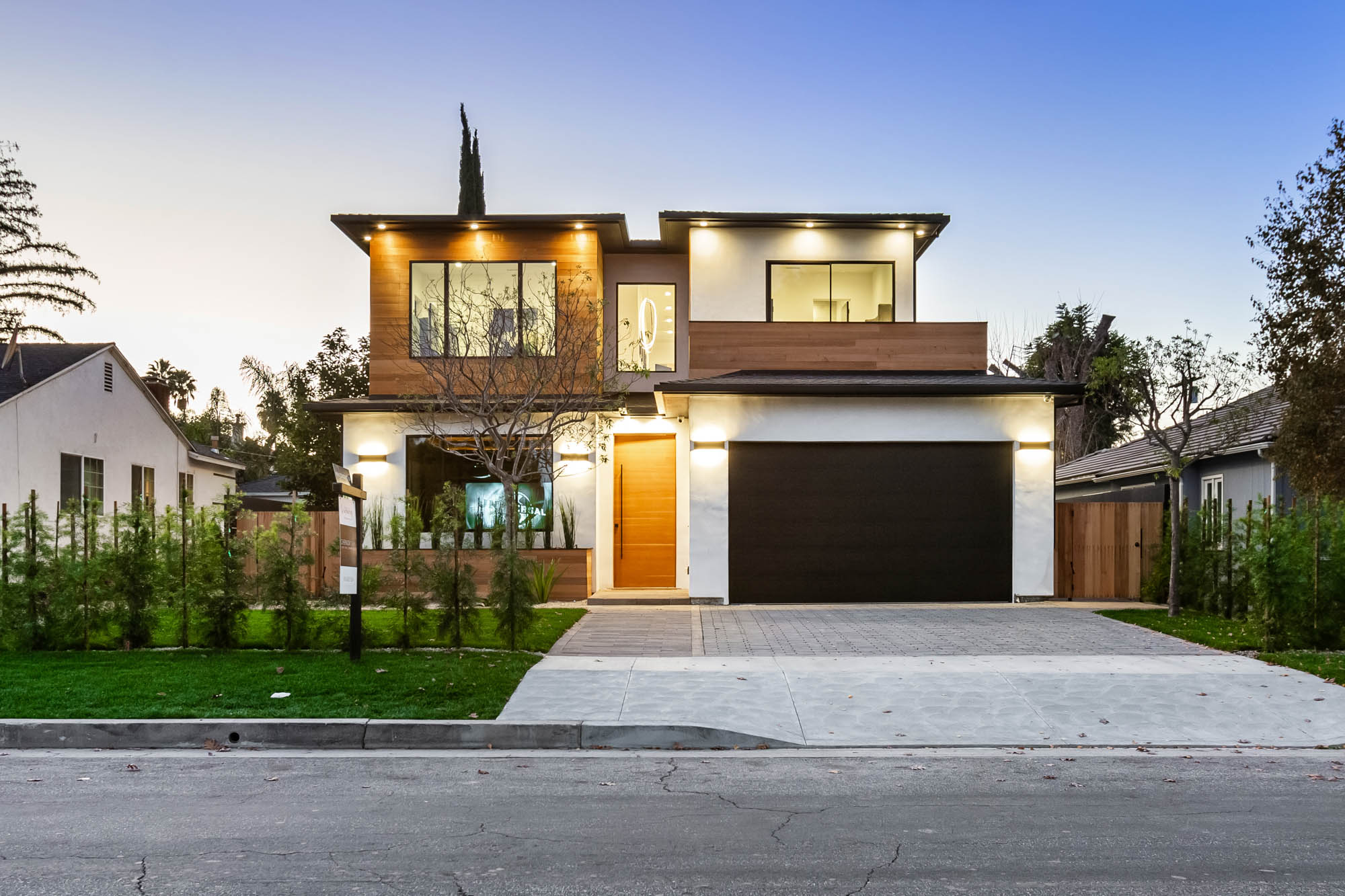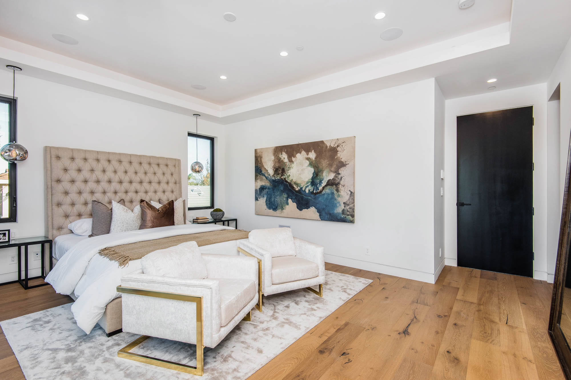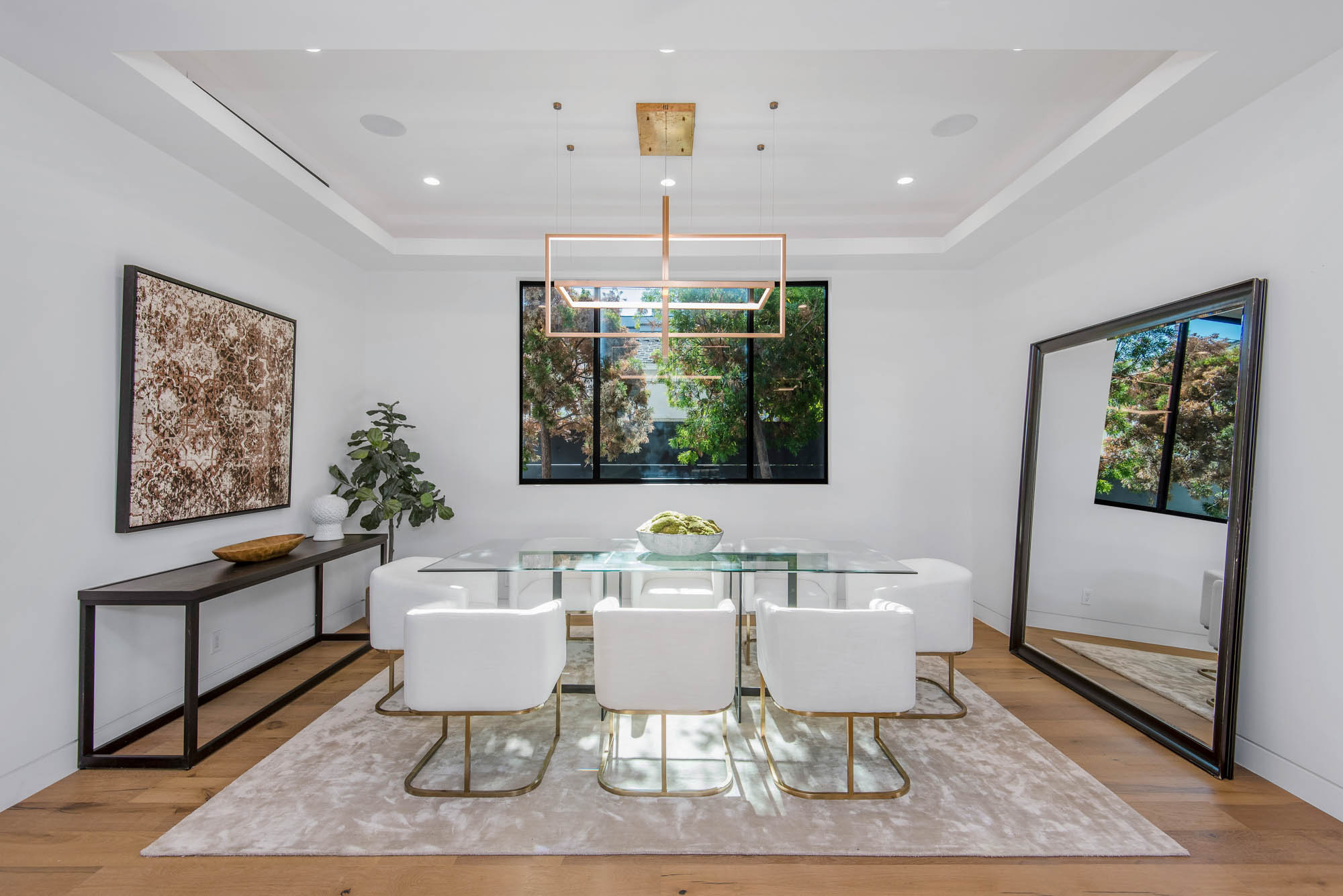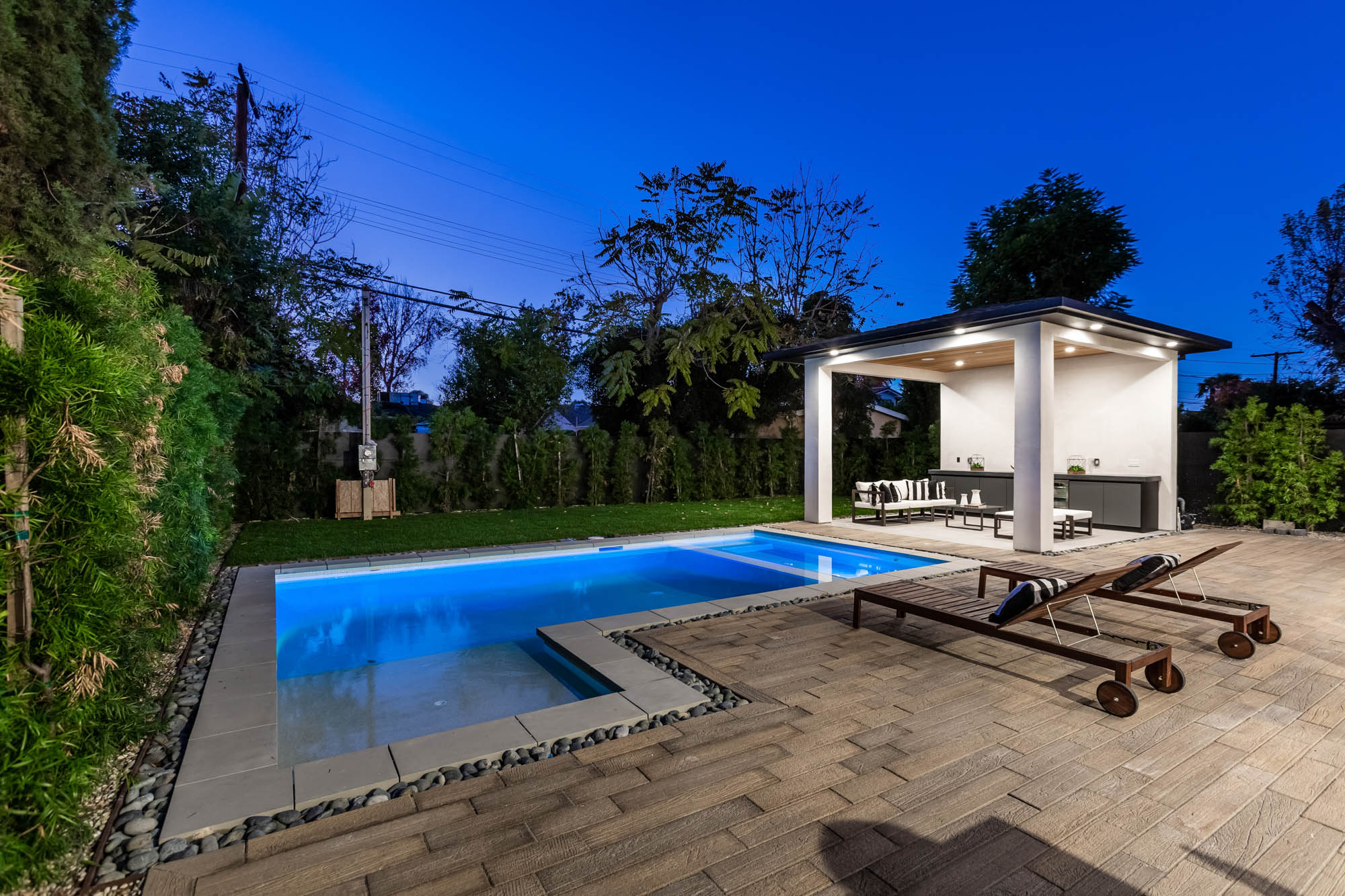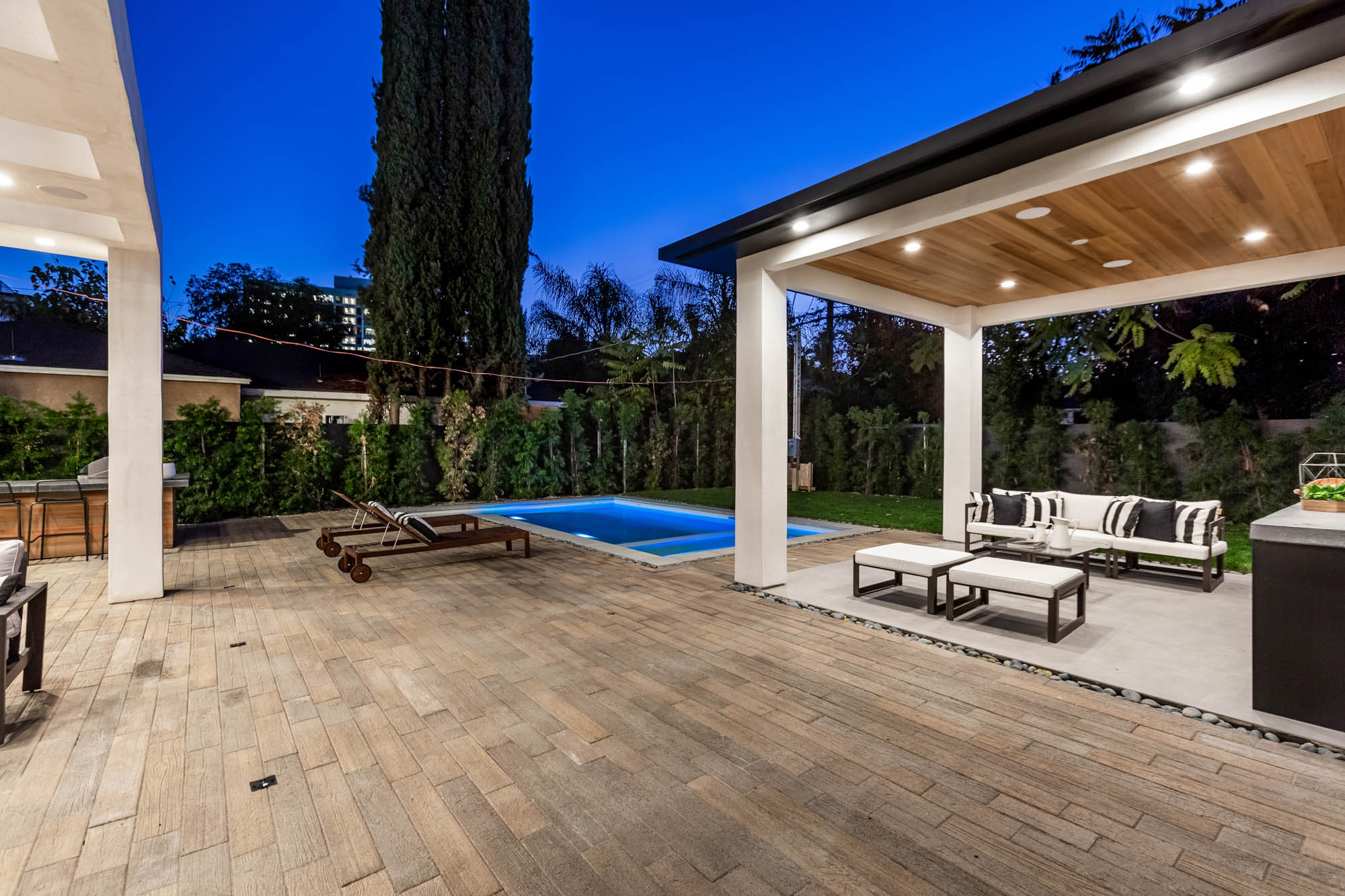 Exquisite soft modern in sought after Encino location. Walk through this open layout home with exceptional indoor-outdoor living all illuminated with immense natural light and custom designed light fixtures. First floor hosts a stunning dining room, complete with glass encased wine room directly across, modern light fixtures, Hardwood Flooring, Large living room w/ custom fireplace, ensuite bedroom, Home theater, and impressive Chefs Kitchen. Bold and contrasting kitchen features an abundance of cabinet/counter space, top of the line appliances,& large center Island. Through large pocket doors reveal an entertainers backyard that will awe w/resort like Pool & Spa, Cabana, Built-in BBQ, covered dining/entertaining space, and generous greenery for privacy. Just upstairs, large statement making light fixtures guides your way to the Master Suite and remaining ensuite bedrooms. Master bed features glass sliding doors, boutique like walk in closet, and modern bathroom. Incredible attention to detail is proven with all the fine fixtures and finishes of this home. Additional amenities include smart home capabilities, laundry room, home theater, wine room, 2 balconies, and so much more! A property of uncompromising quality and style! Location just seconds away from Ventura Blvd, shopping, dining. Must See!