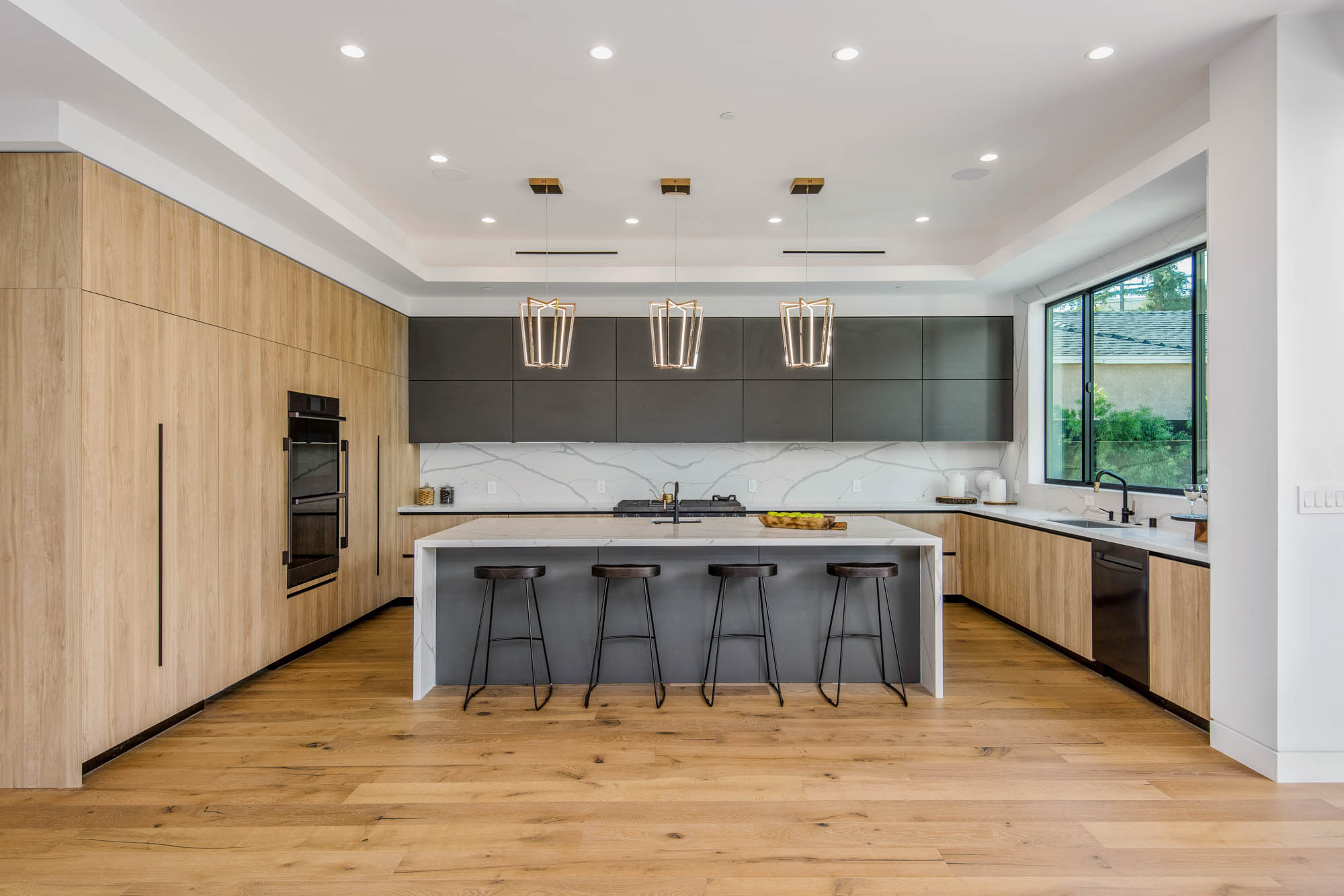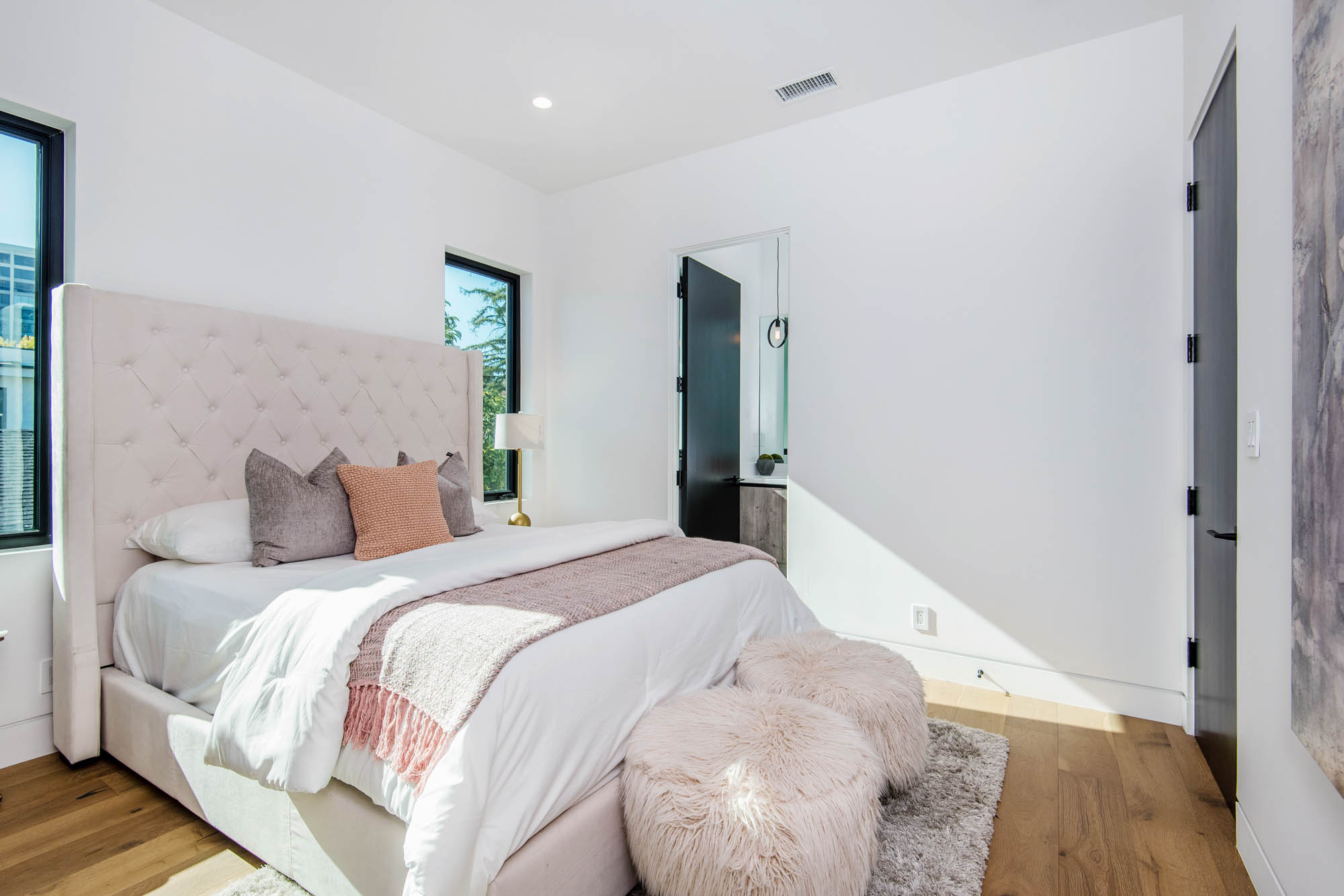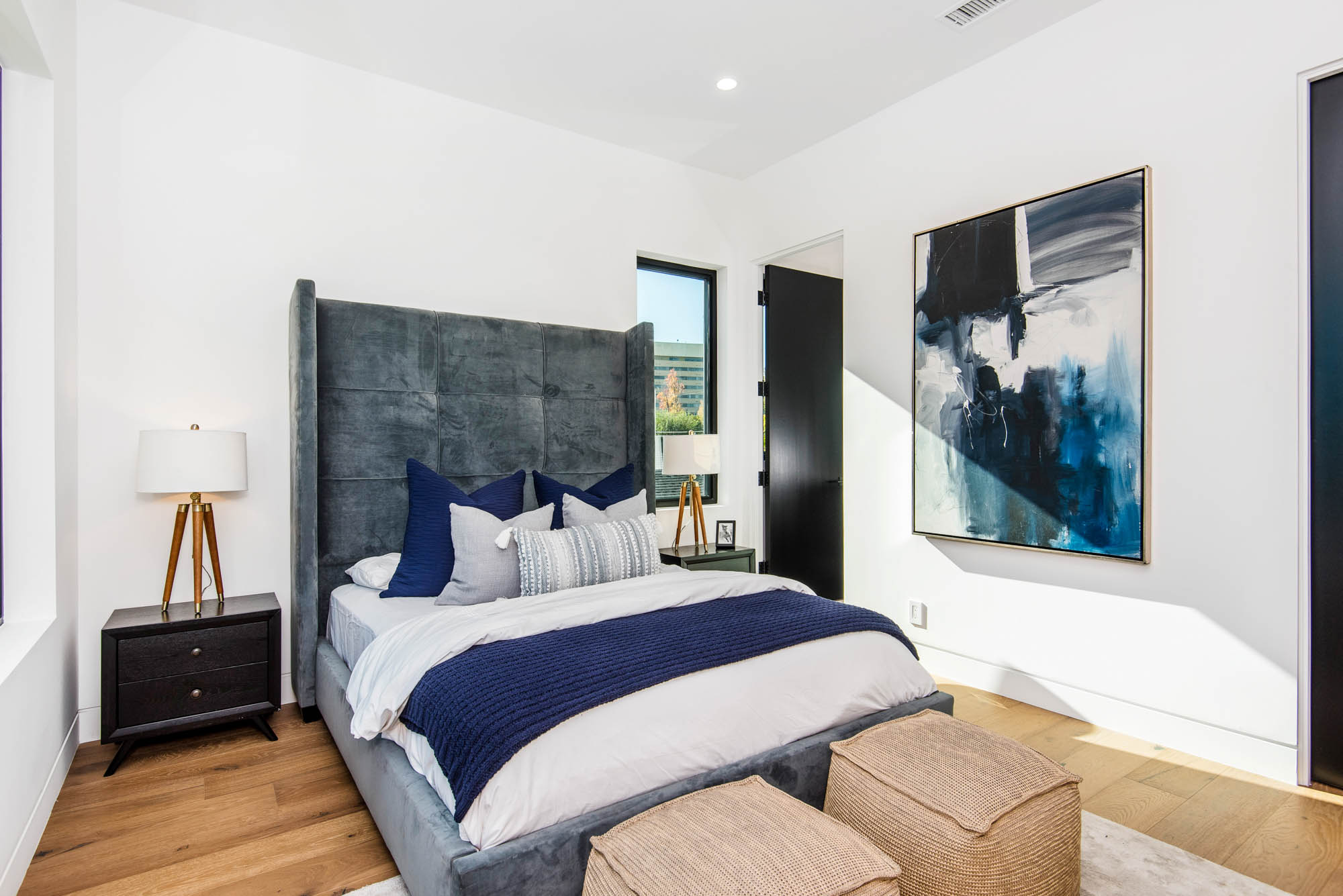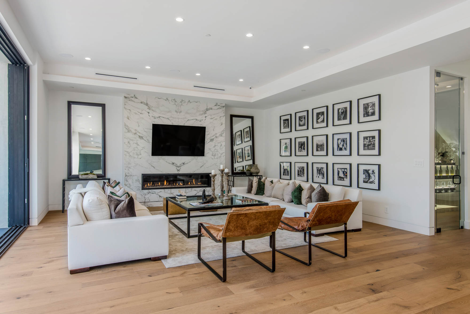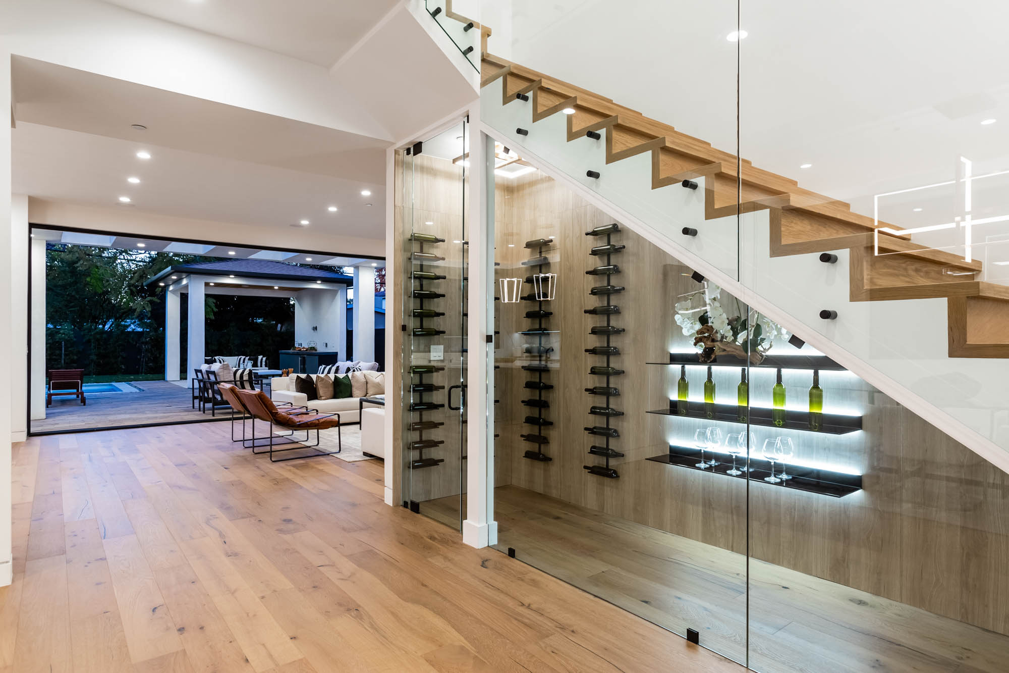 Exquisite soft modern in sought after Encino location. Walk through this open layout home with exceptional indoor-outdoor living all illuminated with immense natural light and custom designed light fixtures. First floor hosts a stunning dining room, complete with glass encased wine room directly across, modern light fixtures, Hardwood Flooring, Large living room w/ custom fireplace, ensuite bedroom, Home theater, and impressive Chefs Kitchen. Bold and contrasting kitchen features an abundance of cabinet/counter space, top of the line appliances,& large center Island. Through large pocket doors reveal an entertainers backyard that will awe w/resort like Pool & Spa, Cabana, Built-in BBQ, covered dining/entertaining space, and generous greenery for privacy. Just upstairs, large statement making light fixtures guides your way to the Master Suite and remaining ensuite bedrooms. Master bed features glass sliding doors, boutique like walk in closet, and modern bathroom. Incredible attention to detail is proven with all the fine fixtures and finishes of this home. Additional amenities include smart home capabilities, laundry room, home theater, wine room, 2 balconies, and so much more! A property of uncompromising quality and style! Location just seconds away from Ventura Blvd, shopping, dining. Must See!