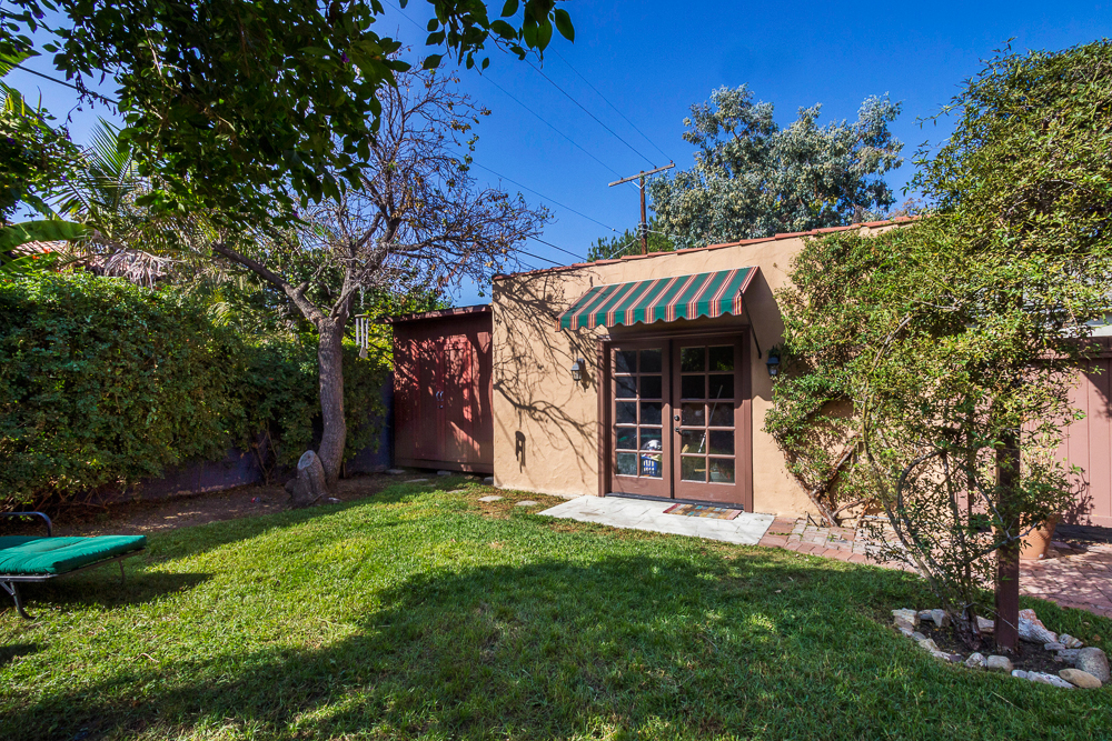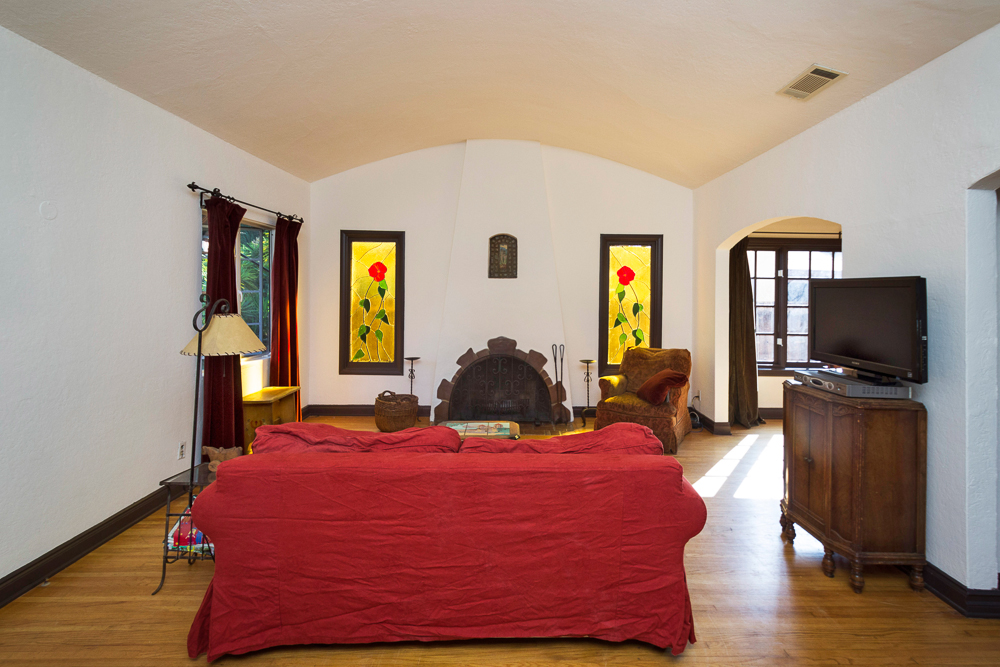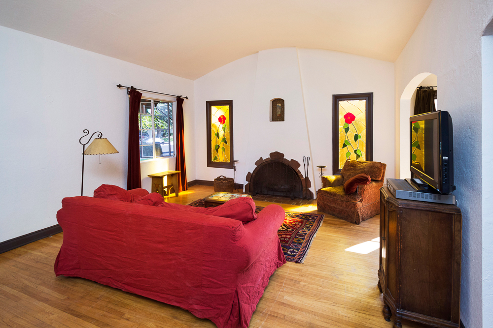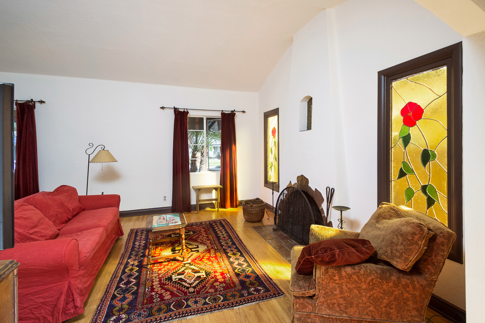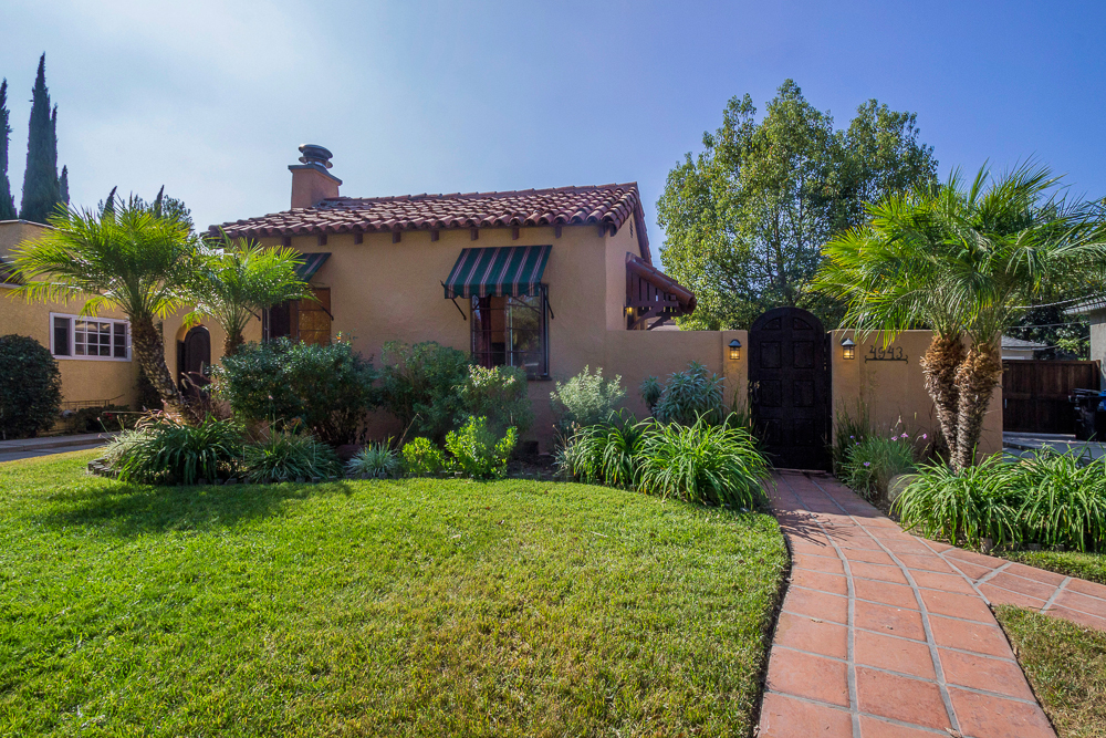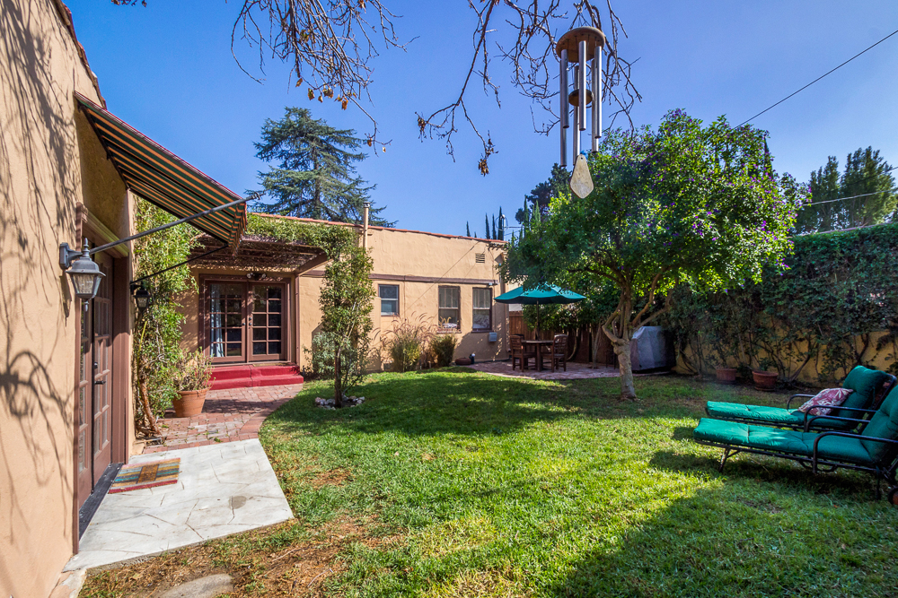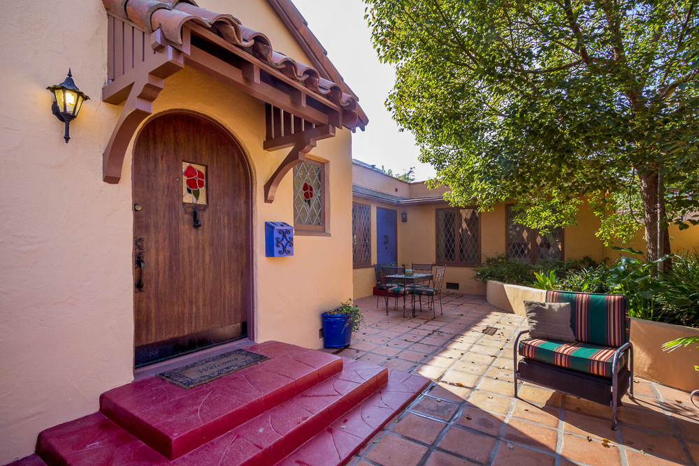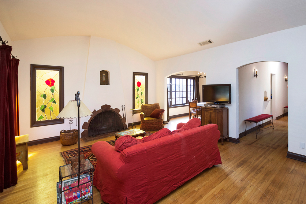 SOLD 1/31/14. Located on a quiet street, this authentic Spanish home was built in 1925 & retains all the character of that period. This 3 bedroom1.5 bathroom house is set back from the street, a large gated courtyard provides great privacy and additional space for entertainment. Front door leads into the living room with vaulted barrel ceilings, beautiful hardwood floors, Spanish style fireplace and stained glass windows that look out to the lush front yard. Good size formal dining room with large window that opens to the kitchen. Kitchen has been completely remodeled and upgraded with custom cabinets, stainless steel appliances and quartz like countertops. Open floor plan provides gracious transition from room to room. Hallway to the bedrooms and bathrooms has dramatic ceilings with soaring, sand blasted beams. The detached 2 car garage was converted in to a great bonus room that can be used as an office/ Den/workout room or media room. Deep grassy yard w/mature landscaping makes this a perfect home. Updated electrical, copper plumbing central Air/Heat. Top notch private schools, walking distance to restaurants, theater,& lively NoHo district,. W/a short drive to Hollywood Bowl, Staples Center & Studios within 5 miles, what else does one need?
