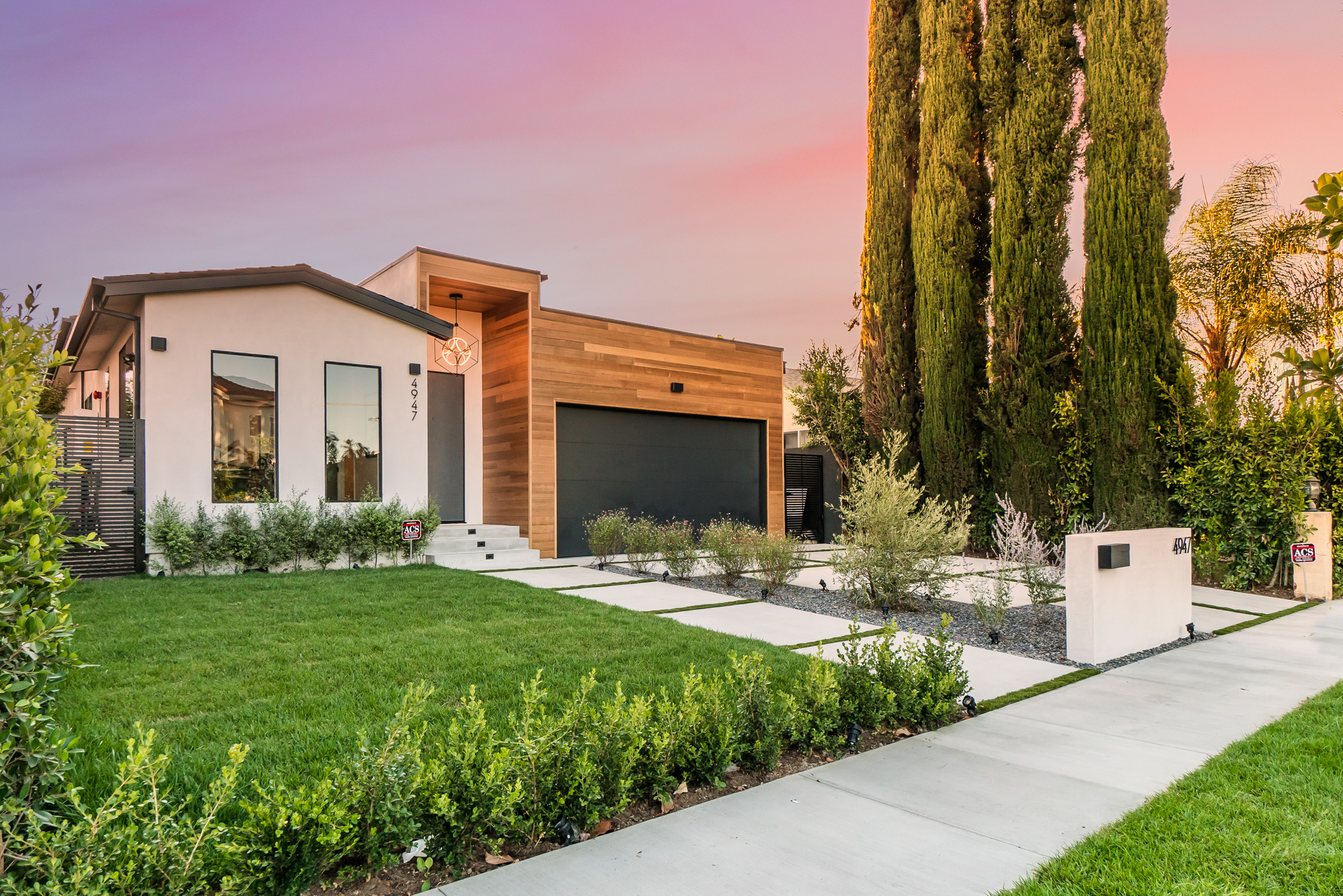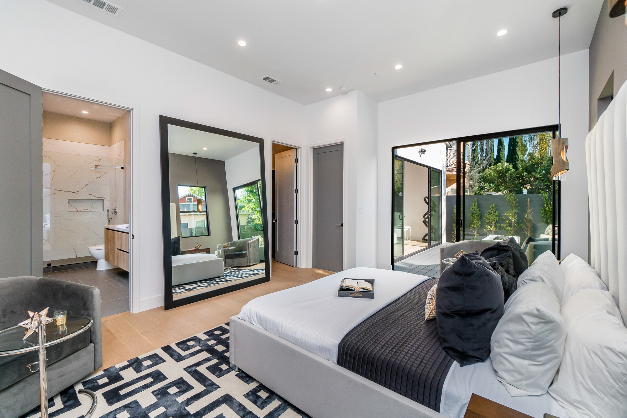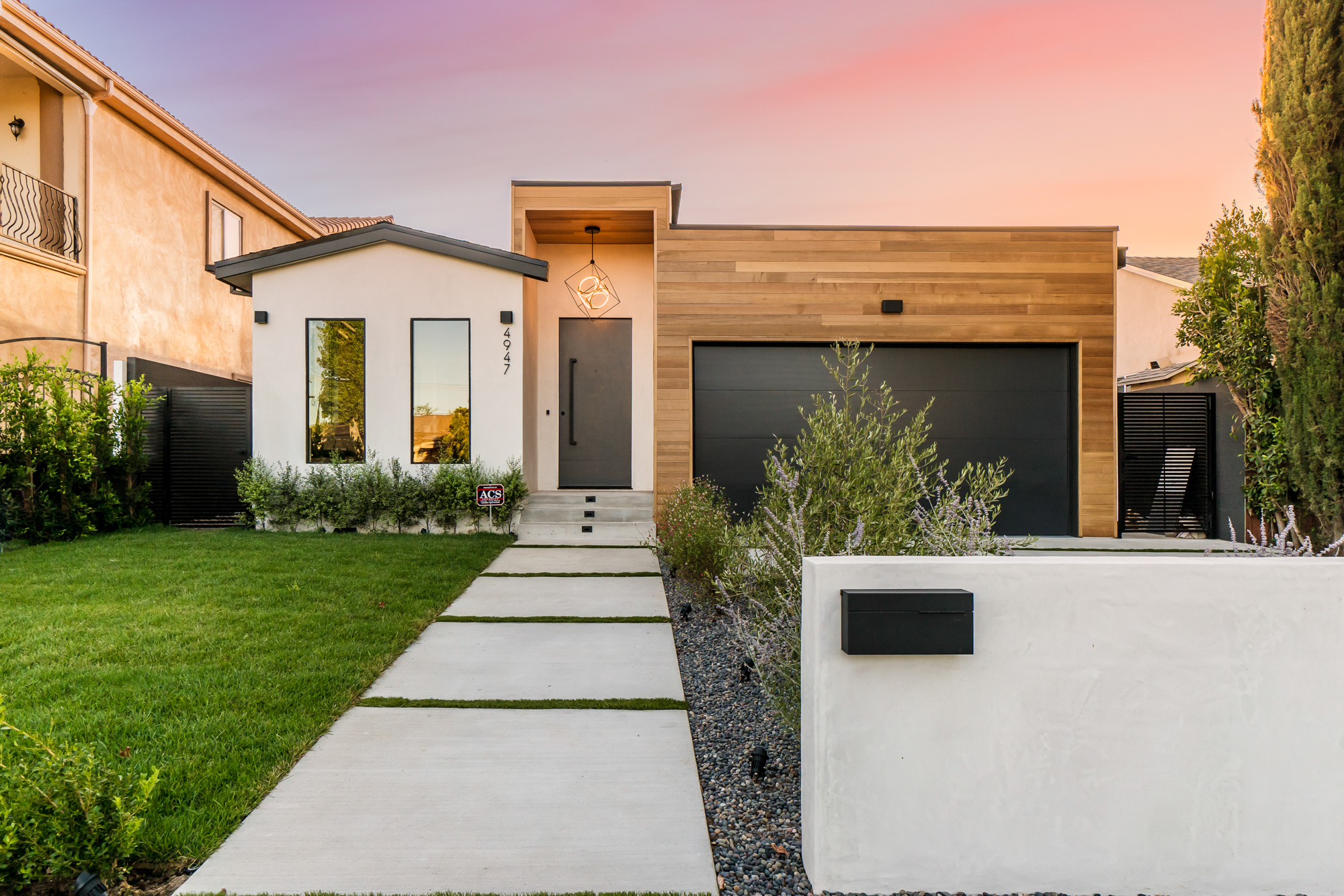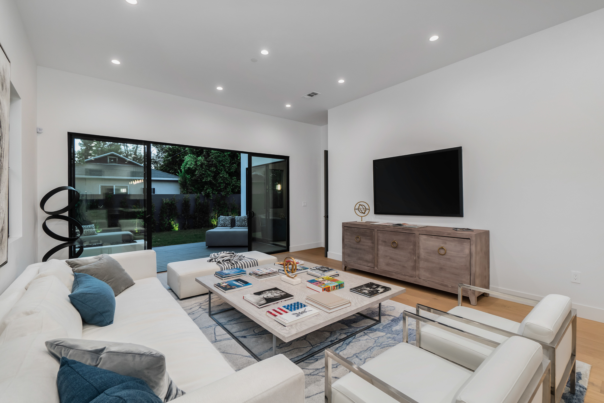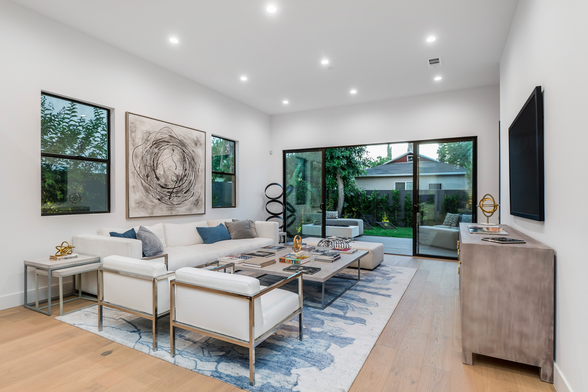 Welcome to your sleek single story modern masterpiece located in prime Encino, south of the boulevard. Completely brand new home, finished in summer of 2020. The natural wood and dark garage contrasted exterior creates a stunning, bold look that flows throughout the home. Striking curb appeal with pristine landscaping attracts all who enter. This extraordinary home was constructed with meticulous attention to detail from custom furnishings to gorgeous built ins and beautiful light fixtures. Upon entry, you are greeted with 11 ft soaring ceilings that extend throughout the home, light oak wood floors, and an incredibly open floor plan. Ambient lighting showcased inside and out elevates a luxury feel. The large and inviting formal living room adjacent to the dining room naturally flows into the glamorous chef’s kitchen. Featuring a custom gold plated backsplash, custom cabinetry, top of the line appliances, and a center island showcasing a stunning quartzite countertop with room for seating. Natural light pours in throughout the house from large sliding glass doors leading from the family room to the tranquil backyard. Backyard deck offers space for lounging around the cozy built in fire pit and leads out to the spacious and lush grassy yard, great for entertaining, playing, and relaxing. Majestic master suite provides private access to the backyard, boasting walk in closet, and grand master bath with soaking tub, walk in shower, and dual sinks. Additional amenities include laundry room, dry bar, 2 car garage, security system, Nest A/C thermostat, and so much more! Located just minutes from Ventura blvd’s trendy shops and and fine dining, this home is a must see and experience that can’t be beat!