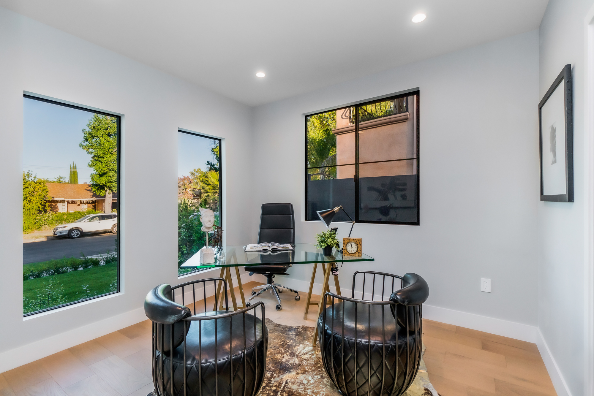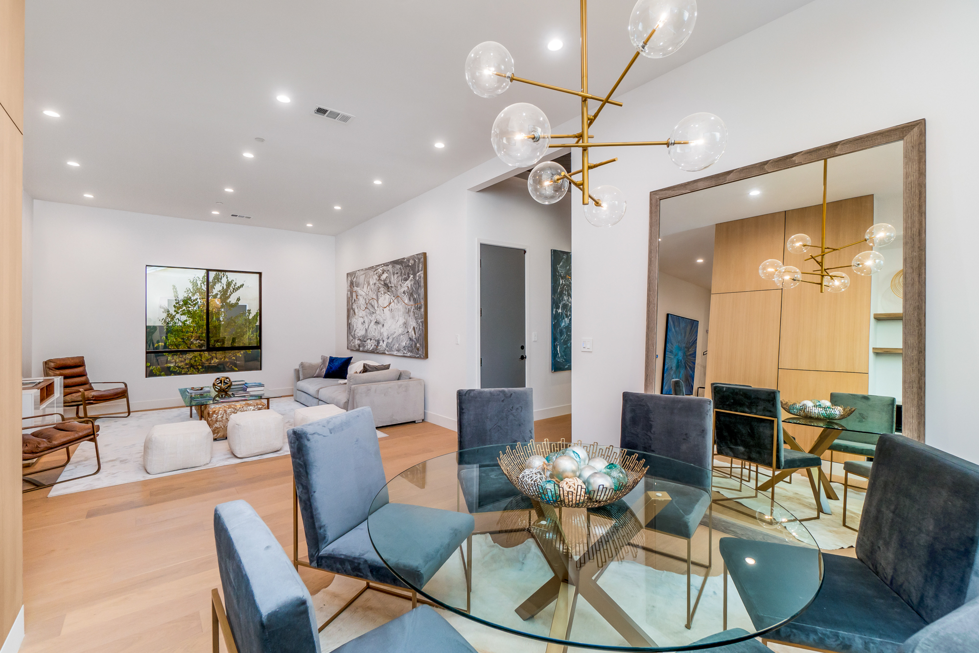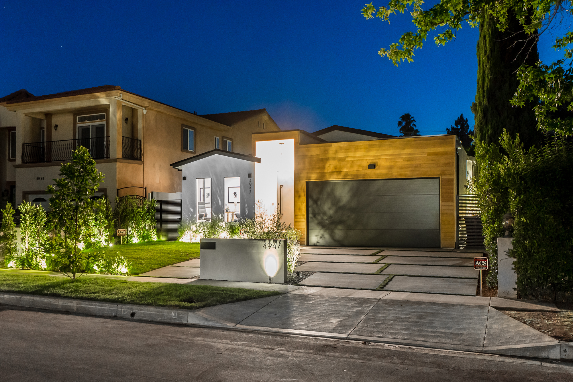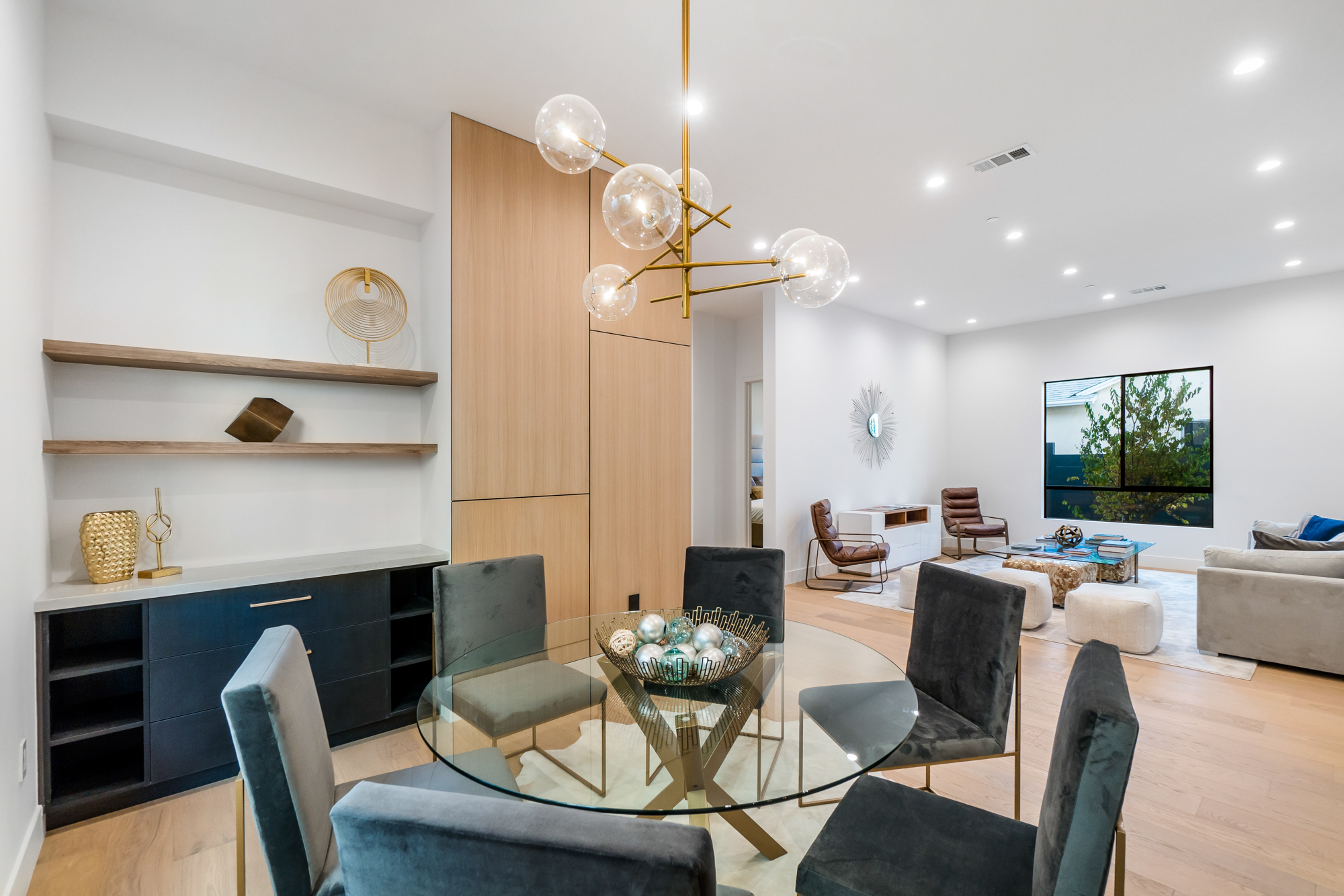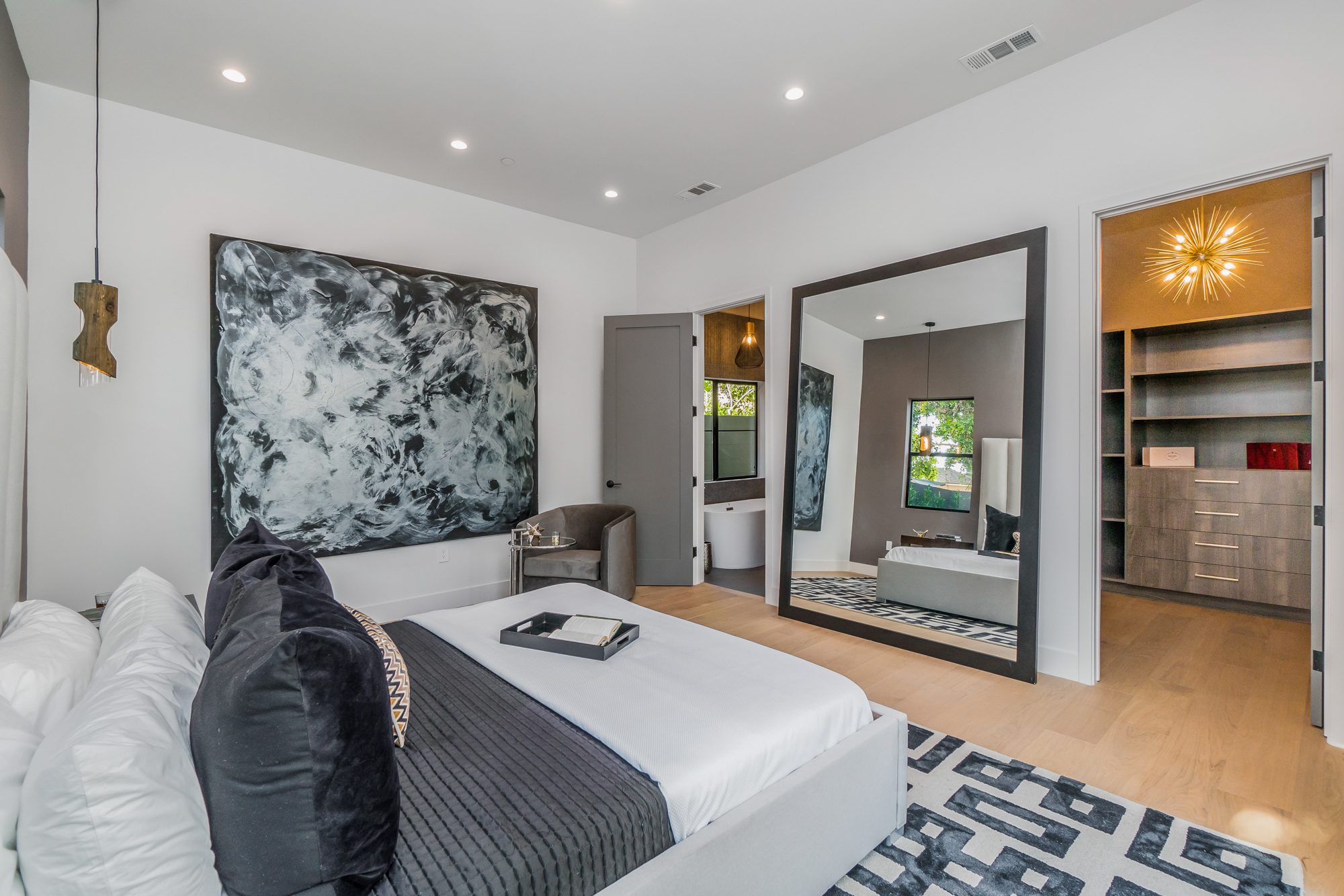 Welcome to your sleek single story modern masterpiece located in prime Encino, south of the boulevard. Completely brand new home, finished in summer of 2020. The natural wood and dark garage contrasted exterior creates a stunning, bold look that flows throughout the home. Striking curb appeal with pristine landscaping attracts all who enter. This extraordinary home was constructed with meticulous attention to detail from custom furnishings to gorgeous built ins and beautiful light fixtures. Upon entry, you are greeted with 11 ft soaring ceilings that extend throughout the home, light oak wood floors, and an incredibly open floor plan. Ambient lighting showcased inside and out elevates a luxury feel. The large and inviting formal living room adjacent to the dining room naturally flows into the glamorous chef’s kitchen. Featuring a custom gold plated backsplash, custom cabinetry, top of the line appliances, and a center island showcasing a stunning quartzite countertop with room for seating. Natural light pours in throughout the house from large sliding glass doors leading from the family room to the tranquil backyard. Backyard deck offers space for lounging around the cozy built in fire pit and leads out to the spacious and lush grassy yard, great for entertaining, playing, and relaxing. Majestic master suite provides private access to the backyard, boasting walk in closet, and grand master bath with soaking tub, walk in shower, and dual sinks. Additional amenities include laundry room, dry bar, 2 car garage, security system, Nest A/C thermostat, and so much more! Located just minutes from Ventura blvd’s trendy shops and and fine dining, this home is a must see and experience that can’t be beat!