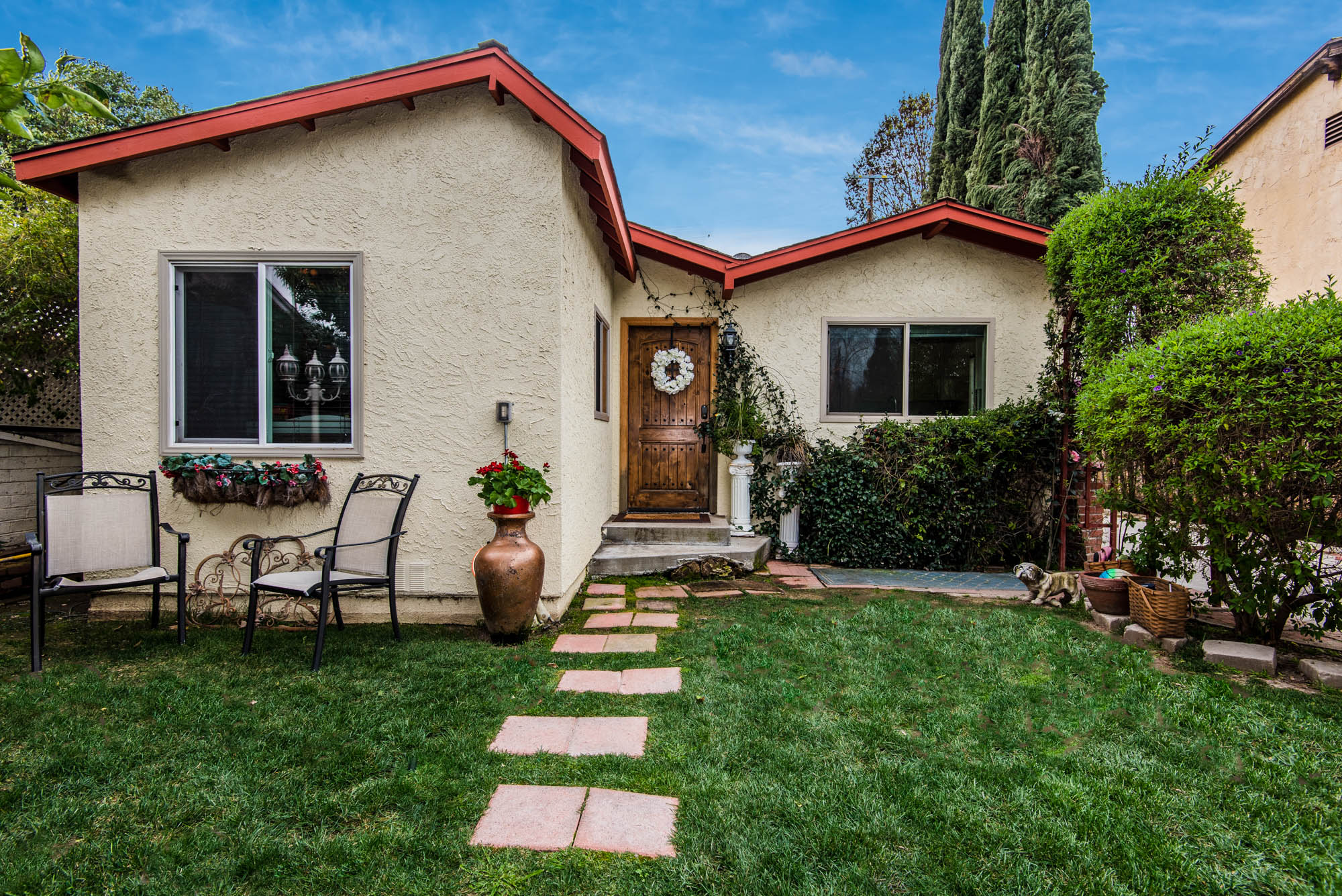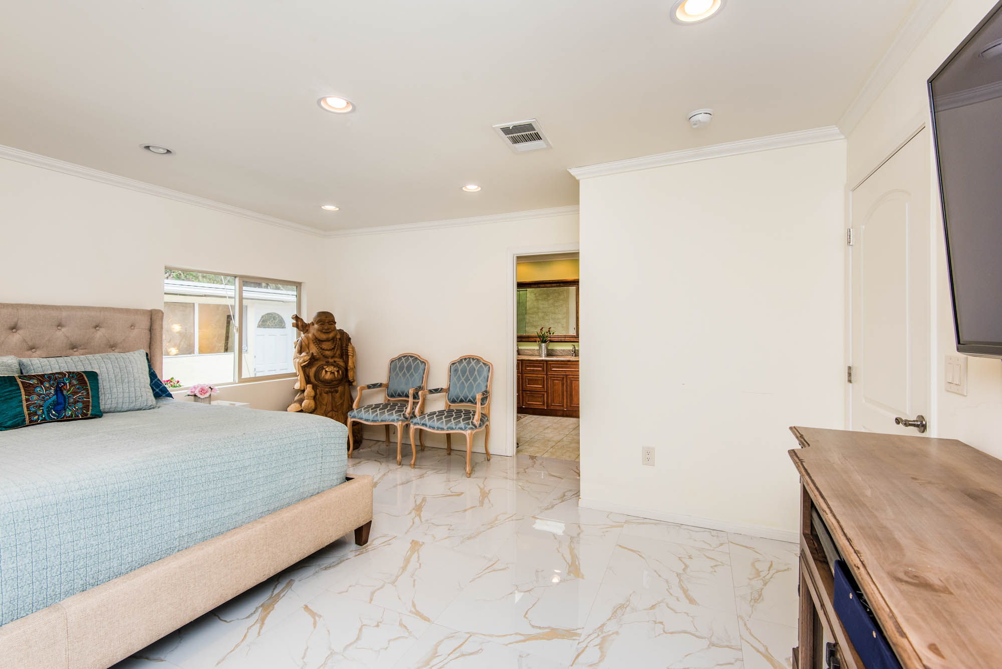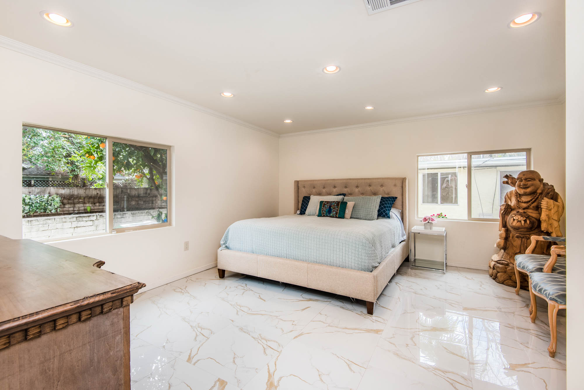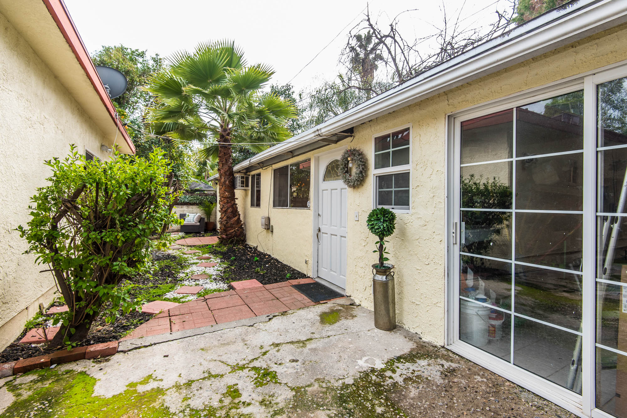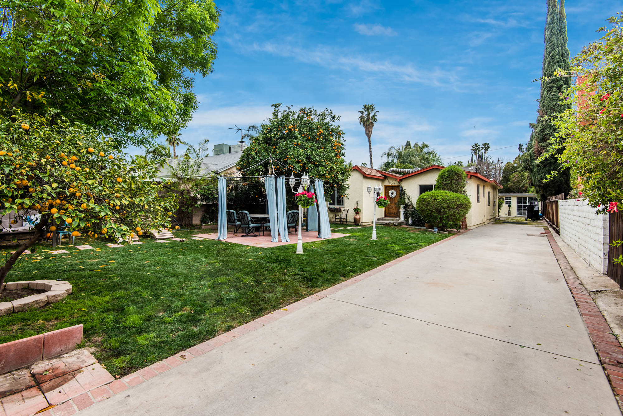 Sitting on a quiet street in Sherman Oaks lies this lovely 2 bed, 2.5 bath home with detached guest house, complete with kitchenette and full bathroom! Set far back behind a private gate, this home welcomes you with a generous lush lawn, beautiful fruit trees, and large tiled patio area perfect for al fresco dining. Upon entering, guests are greeted by an open floor plan and porcelain tiled floors that flow throughout the home. High ceilings, recessed lighting and an abundance of natural light from surrounding windows give off a light and airy feel. To the right is a grand dining area ideal for large gatherings! A breathtaking updated kitchen follows with bountiful light cabinetry, granite countertops, stainless steel appliances and views of the yard. The charming first bedroom includes crown moulding, recessed lighting, a full bathroom and spacious closet. Towards the back of the home lies the incredible master suite! This extensive retreat is the ultimate getaway and provides large windows, a vast walk-in closet and an immense, updated bathroom with luxury finishes like a stunning vanity, his and her sinks, spacious shower and a tub to soak in after a long day! Head outside with friends where there is ample outdoor seating to enjoy the California sun. If that wasn’t enough, the marvelous detached guest home is the icing on the cake. Located just behind the main home, this completely updated space has its own entrance. Featuring modern tile floors throughout, windows for lots of natural light, kitchenette, and separate bedroom with mirrored closet and full bathroom, it is optimal for renting, hosting guests, or even to use as a recording/art studio! Centrally located to the Sherman Oaks Galleria, 101 & 405 fwys, and distinguished Kester Elementary School, this home has it all!