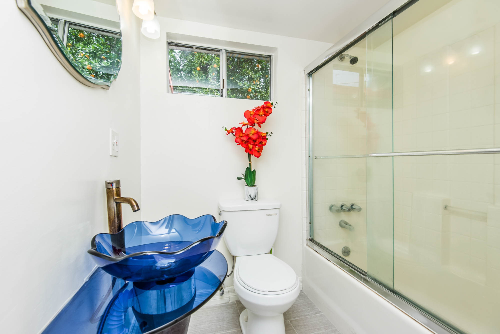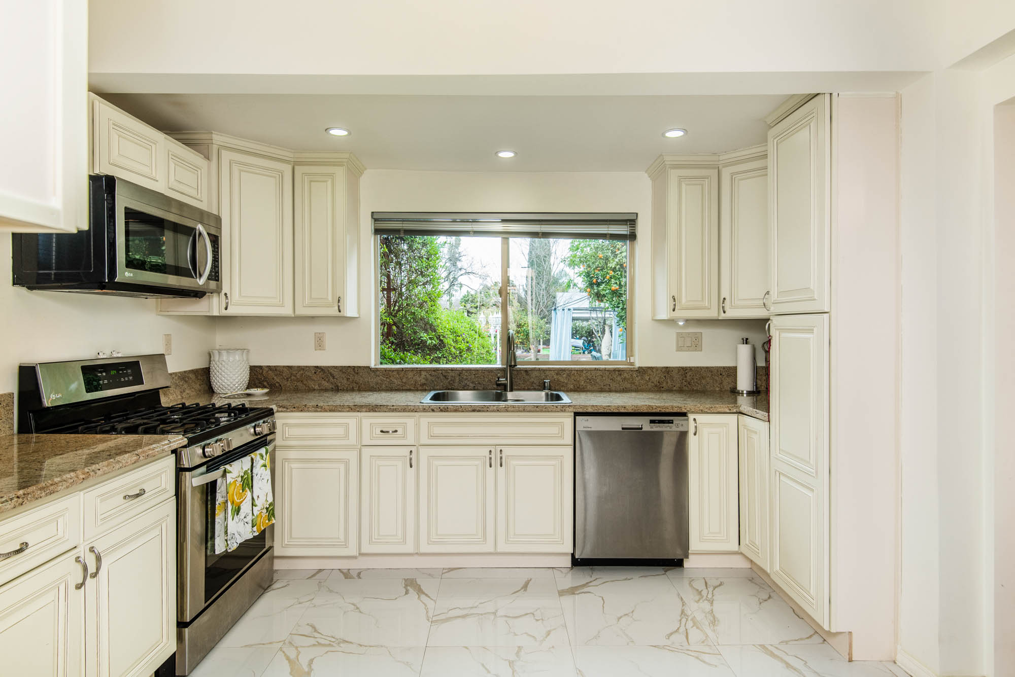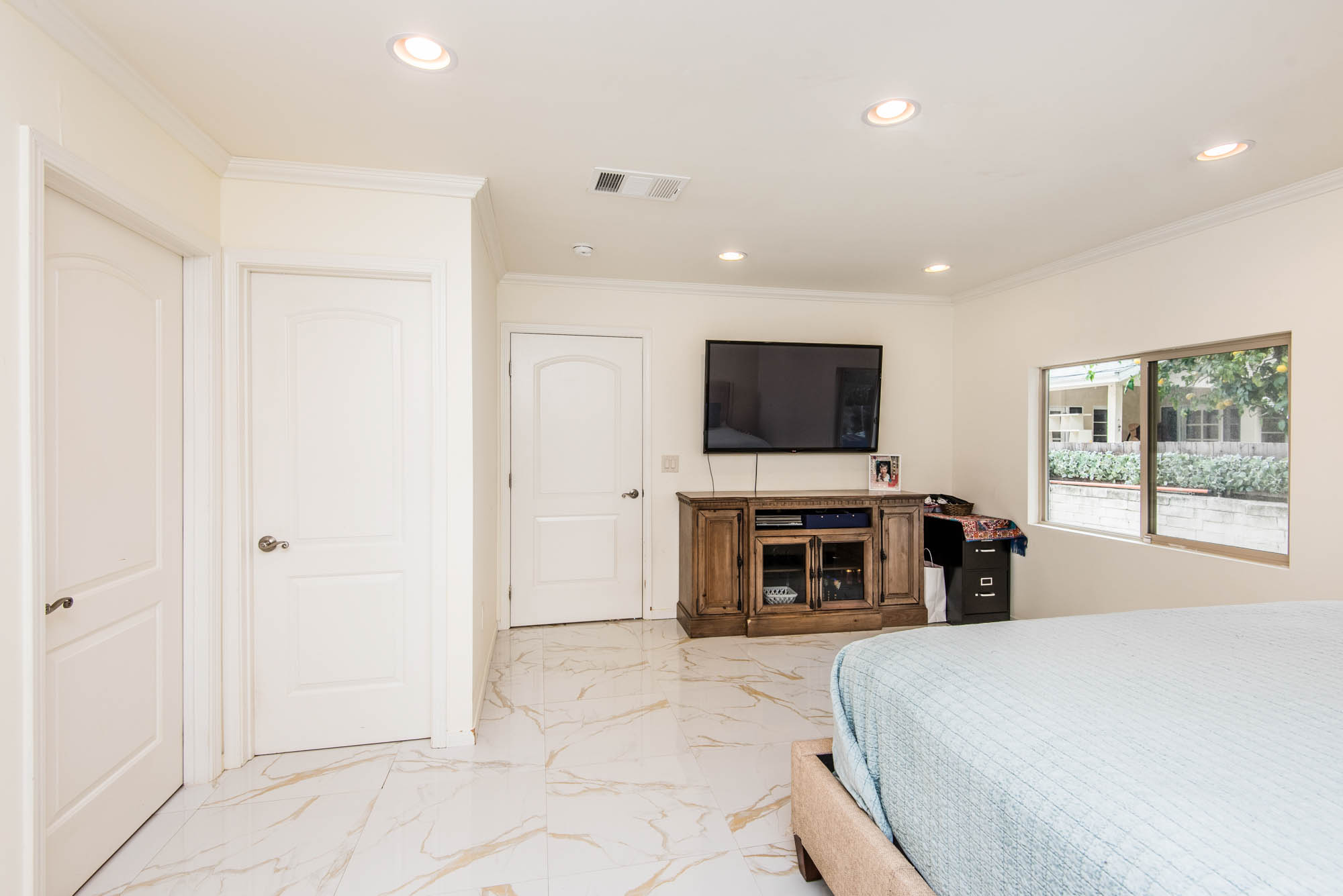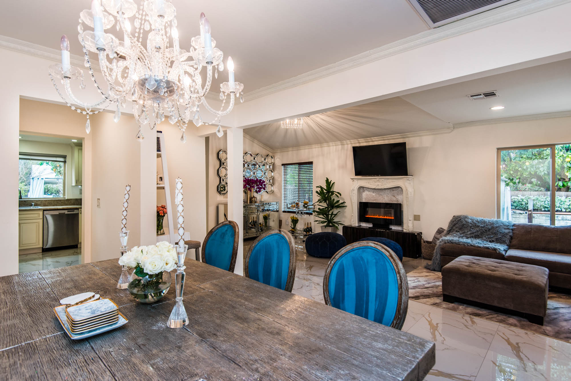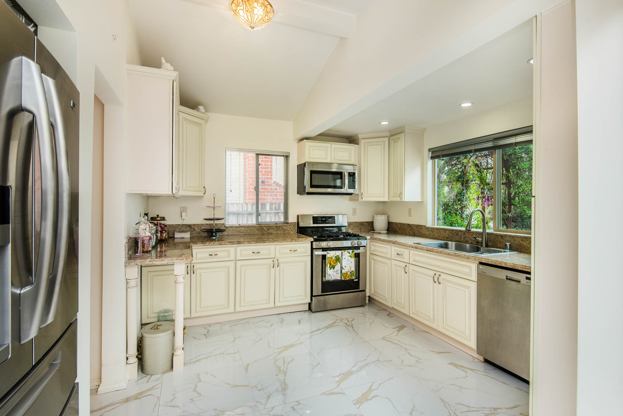 Sitting on a quiet street in Sherman Oaks lies this lovely 2 bed, 2.5 bath home with detached guest house, complete with kitchenette and full bathroom! Set far back behind a private gate, this home welcomes you with a generous lush lawn, beautiful fruit trees, and large tiled patio area perfect for al fresco dining. Upon entering, guests are greeted by an open floor plan and porcelain tiled floors that flow throughout the home. High ceilings, recessed lighting and an abundance of natural light from surrounding windows give off a light and airy feel. To the right is a grand dining area ideal for large gatherings! A breathtaking updated kitchen follows with bountiful light cabinetry, granite countertops, stainless steel appliances and views of the yard. The charming first bedroom includes crown moulding, recessed lighting, a full bathroom and spacious closet. Towards the back of the home lies the incredible master suite! This extensive retreat is the ultimate getaway and provides large windows, a vast walk-in closet and an immense, updated bathroom with luxury finishes like a stunning vanity, his and her sinks, spacious shower and a tub to soak in after a long day! Head outside with friends where there is ample outdoor seating to enjoy the California sun. If that wasn’t enough, the marvelous detached guest home is the icing on the cake. Located just behind the main home, this completely updated space has its own entrance. Featuring modern tile floors throughout, windows for lots of natural light, kitchenette, and separate bedroom with mirrored closet and full bathroom, it is optimal for renting, hosting guests, or even to use as a recording/art studio! Centrally located to the Sherman Oaks Galleria, 101 & 405 fwys, and distinguished Kester Elementary School, this home has it all!