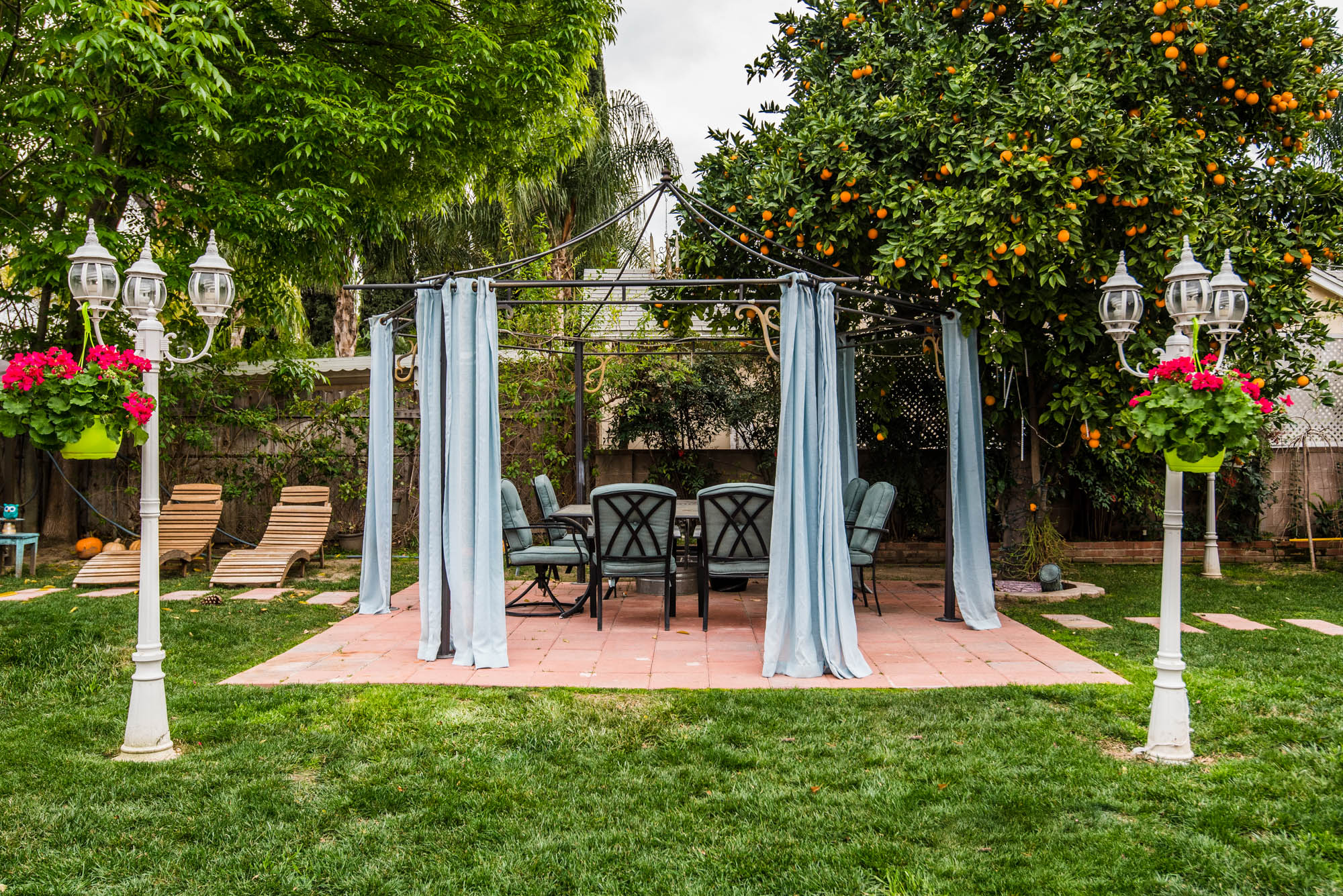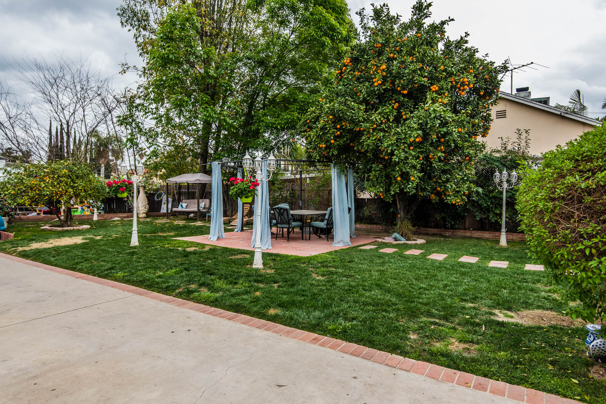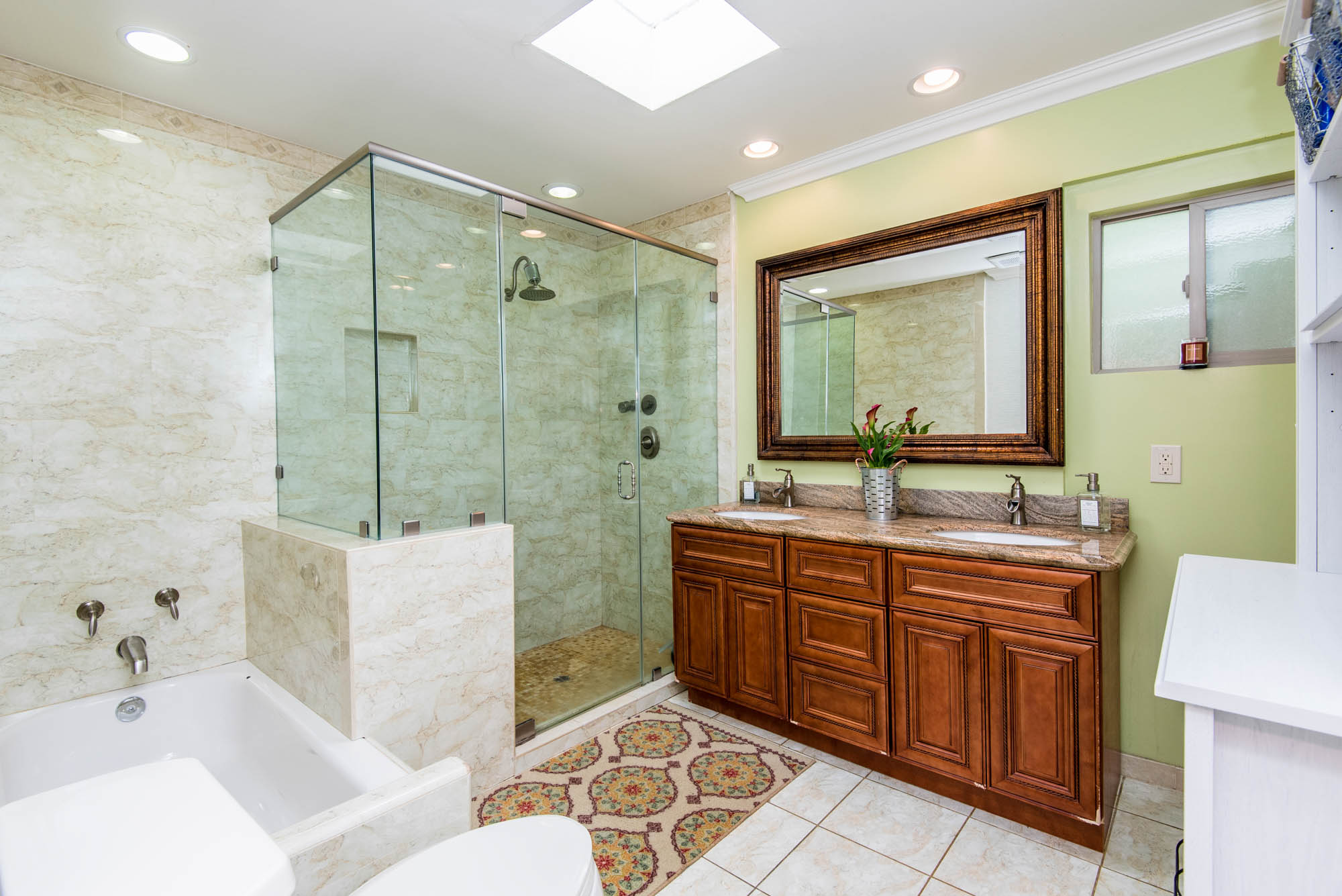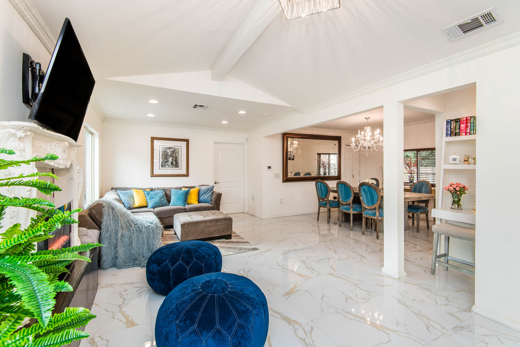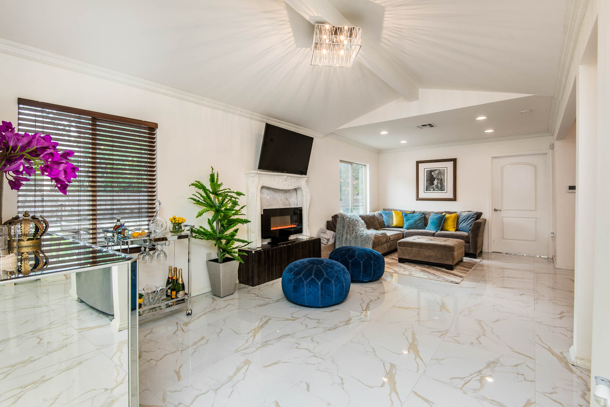 Sitting on a quiet street in Sherman Oaks lies this lovely 2 bed, 2.5 bath home with detached guest house, complete with kitchenette and full bathroom! Set far back behind a private gate, this home welcomes you with a generous lush lawn, beautiful fruit trees, and large tiled patio area perfect for al fresco dining. Upon entering, guests are greeted by an open floor plan and porcelain tiled floors that flow throughout the home. High ceilings, recessed lighting and an abundance of natural light from surrounding windows give off a light and airy feel. To the right is a grand dining area ideal for large gatherings! A breathtaking updated kitchen follows with bountiful light cabinetry, granite countertops, stainless steel appliances and views of the yard. The charming first bedroom includes crown moulding, recessed lighting, a full bathroom and spacious closet. Towards the back of the home lies the incredible master suite! This extensive retreat is the ultimate getaway and provides large windows, a vast walk-in closet and an immense, updated bathroom with luxury finishes like a stunning vanity, his and her sinks, spacious shower and a tub to soak in after a long day! Head outside with friends where there is ample outdoor seating to enjoy the California sun. If that wasn’t enough, the marvelous detached guest home is the icing on the cake. Located just behind the main home, this completely updated space has its own entrance. Featuring modern tile floors throughout, windows for lots of natural light, kitchenette, and separate bedroom with mirrored closet and full bathroom, it is optimal for renting, hosting guests, or even to use as a recording/art studio! Centrally located to the Sherman Oaks Galleria, 101 & 405 fwys, and distinguished Kester Elementary School, this home has it all!