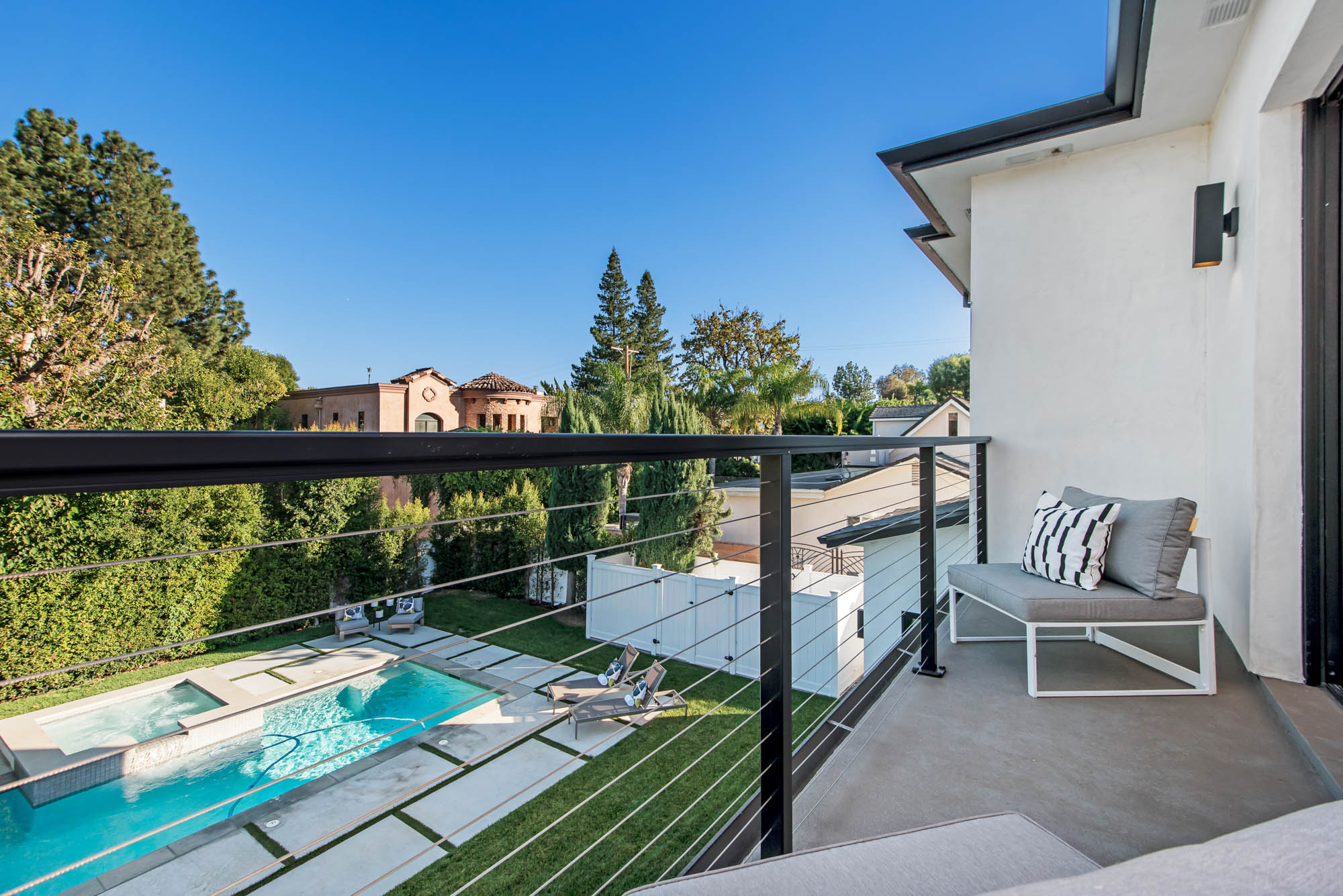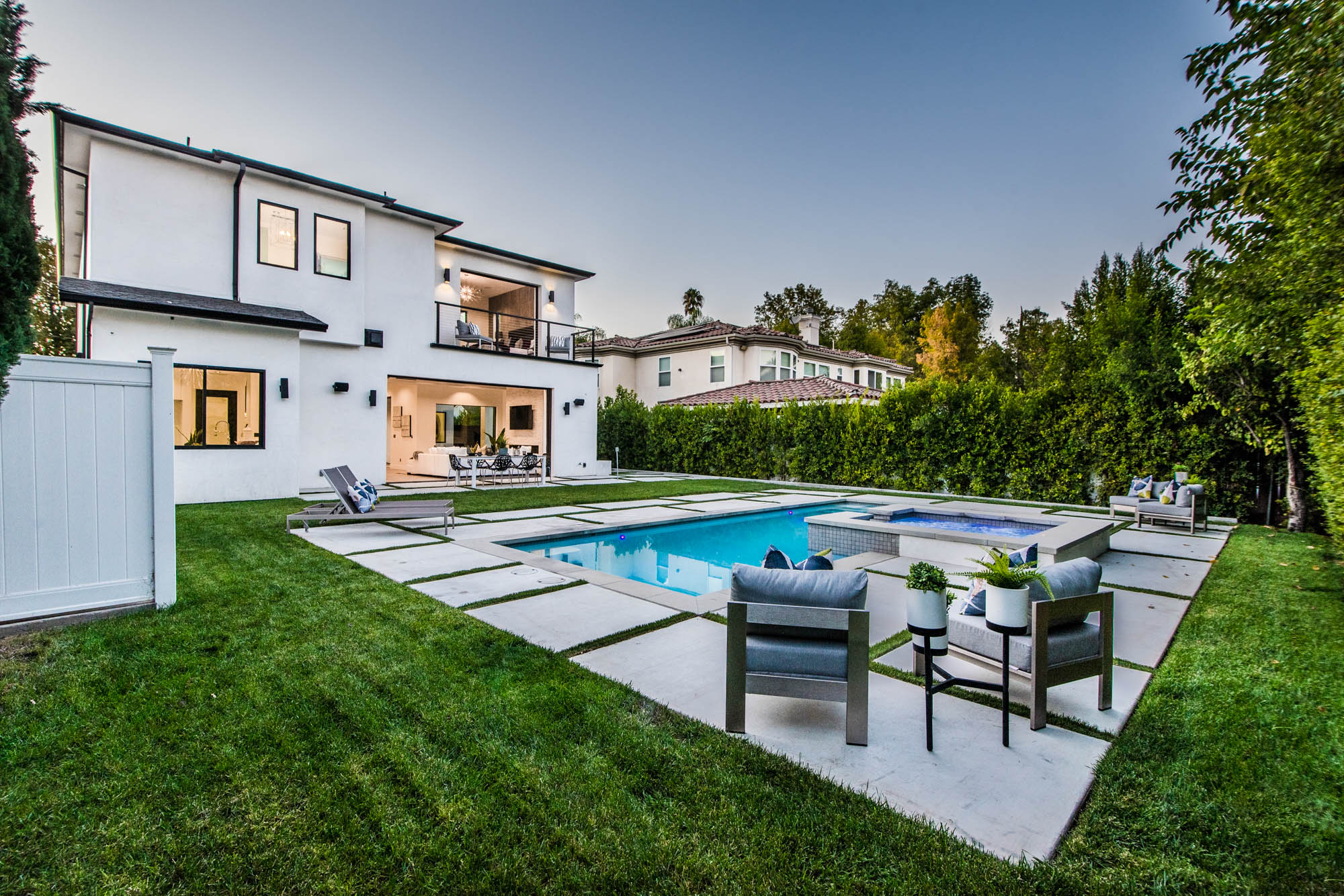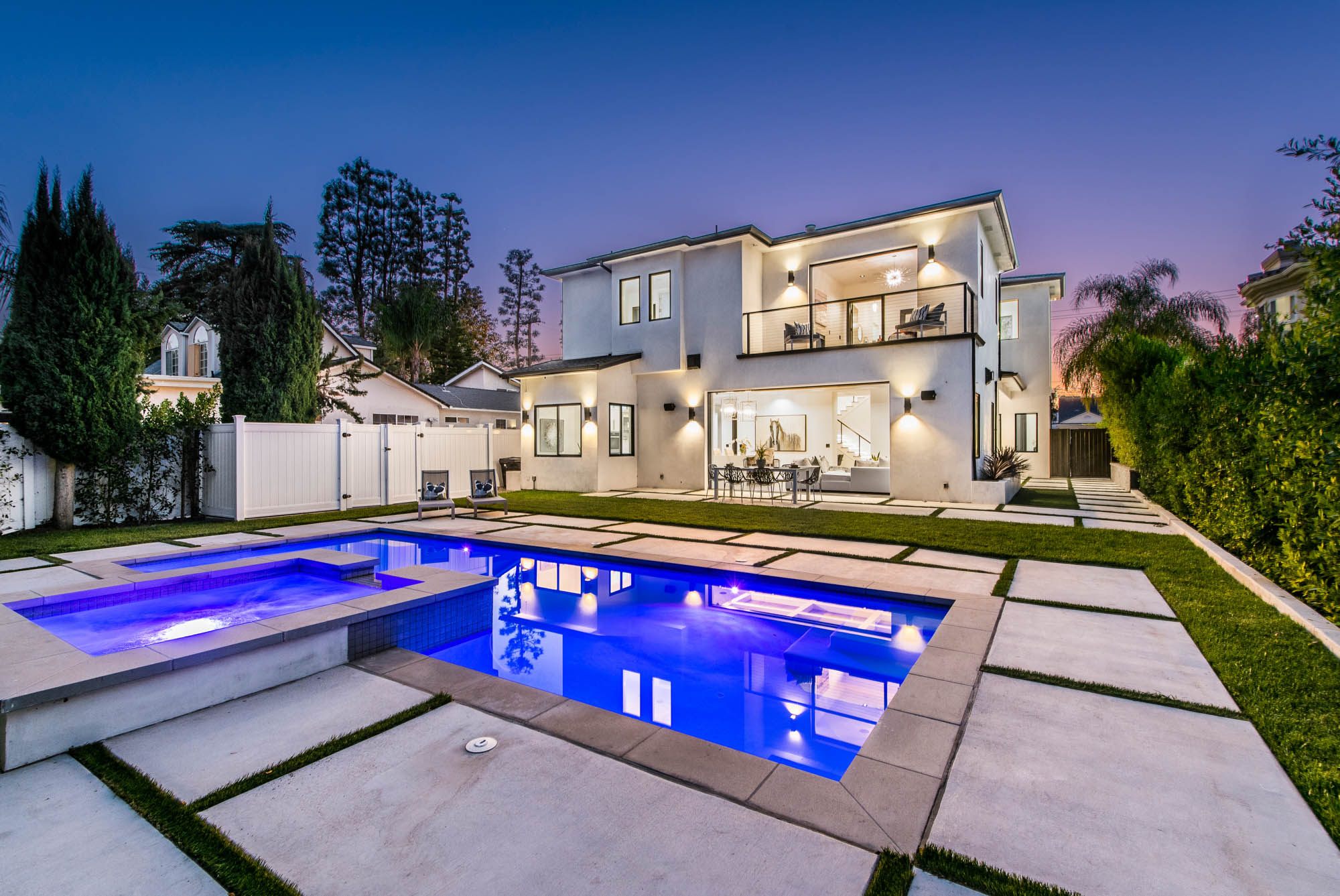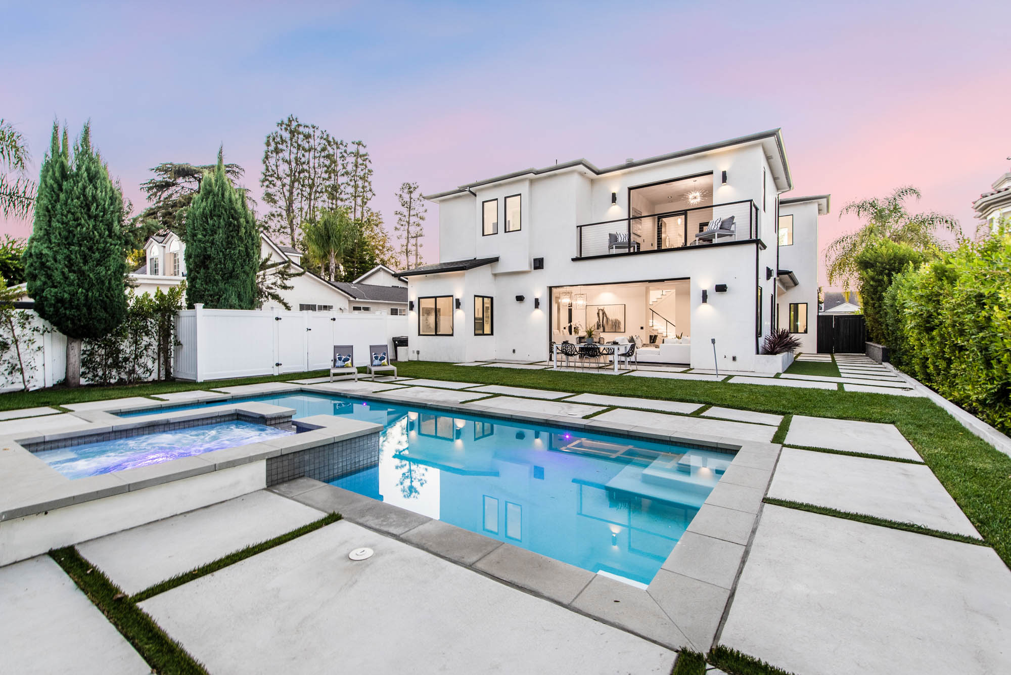 New Construction in prime Encino location! Soft Modern aesthetic in perfect harmony with luxurious fixtures and finishes result in the fineness of this home. Open floor plan illuminated by large windows and glass sliding pocket doors take you through every architectural expense and detail this home encompasses. Walking in, you are greeted by a 23’ high ceiling giving you a taste of the luxury that awaits. Formal living room, and dining room which lead to a private covered patio, later separated with a bold fireplace wall that leads you to a family room and Chefs kitchen with top of the line Miele appliances, two dishwashers, built-in double convection & steam ovens, 6 burner range with griddle, built-in coffee/latte maker, microwave, 2 large islands, one with a 36' Kohler, apron sink, and other w/ prep sink. The large second set of pocket doors lead you to an entertainers paradise of a backyard with a saltwater pool and spa, stunning hardscaping and an abundance of grass space. 5 Ensuite Bedrooms, with one being located on the first floor for convenience. Master suite replicated the indoor/outdoor environment the home perfects with sliding pocket doors that open to a large private deck. Master Bath holds dual sinks, makeup vanity, freestanding Kohler hydrotherapy tub, large walk-in marble shower, and walk-in closet. Additional amenities include dual CAT 6, security system, surround sound, LED lighting, smart home compatibilities and so much more. From coveted K-8 Hesby Oaks School District location to the endless luxurious features this home is a must-see!