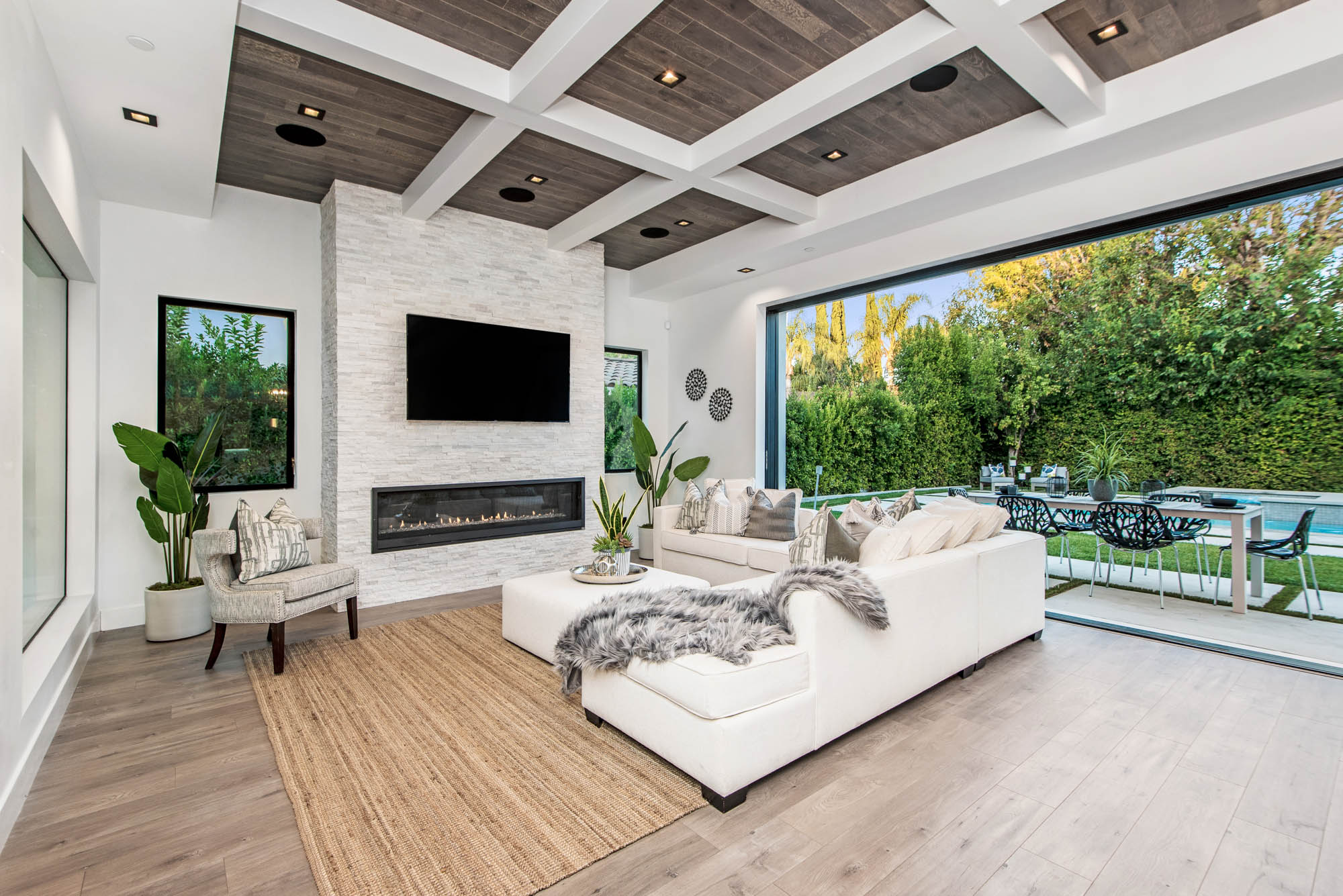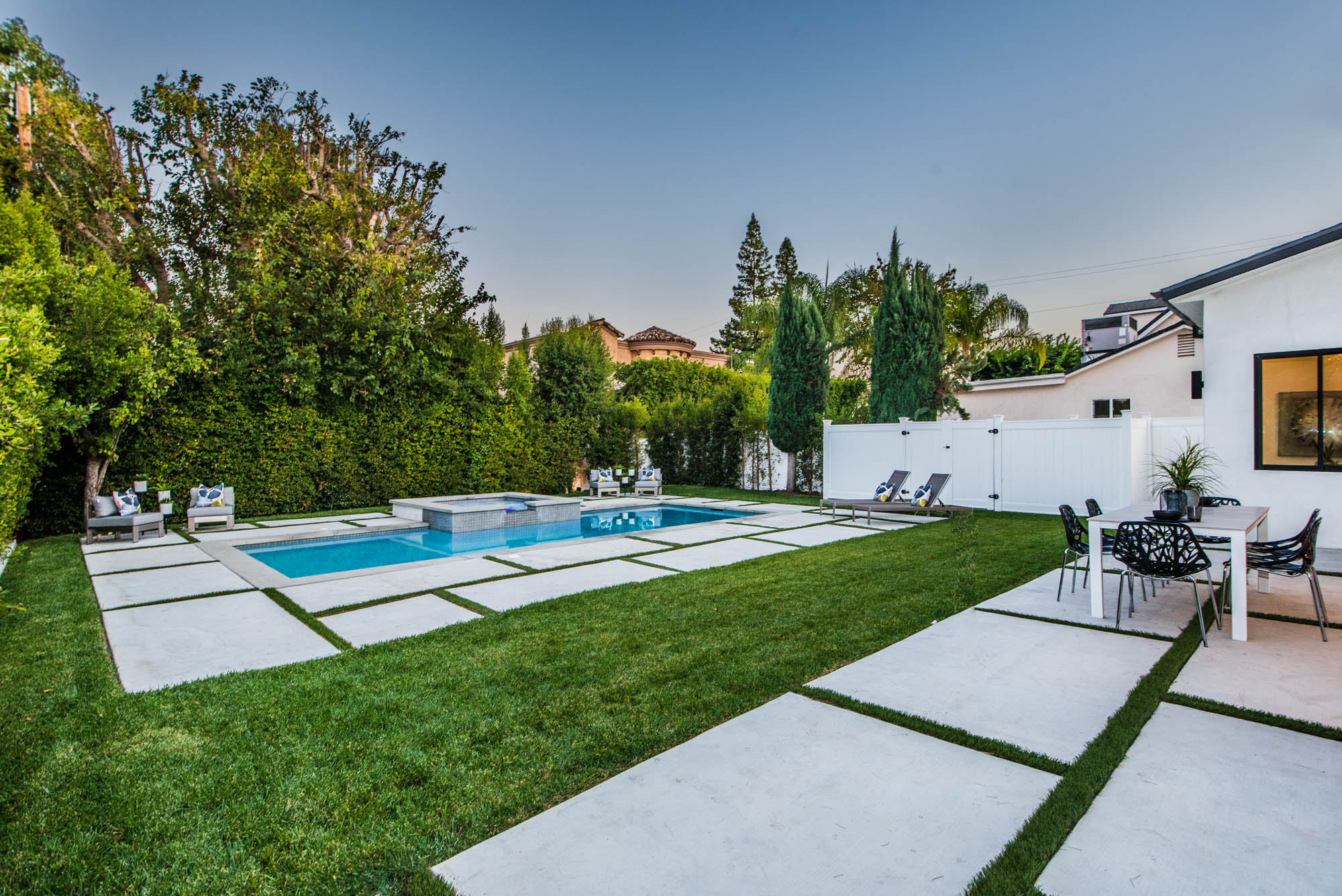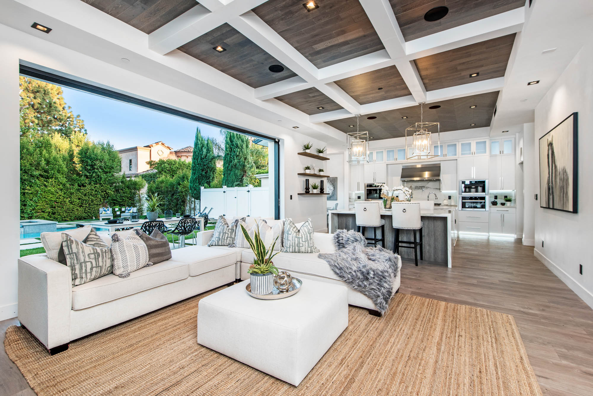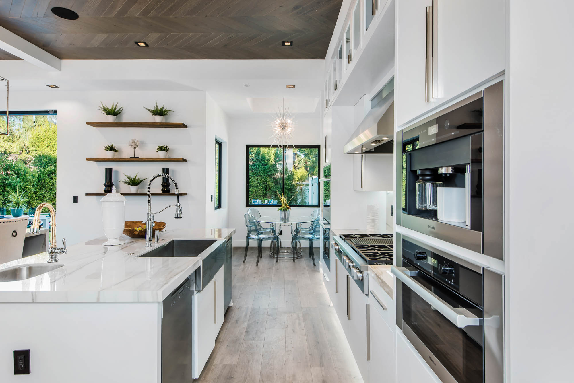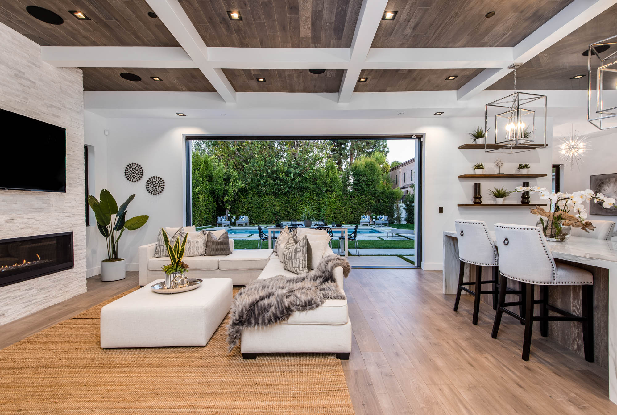 New Construction in prime Encino location! Soft Modern aesthetic in perfect harmony with luxurious fixtures and finishes result in the fineness of this home. Open floor plan illuminated by large windows and glass sliding pocket doors take you through every architectural expense and detail this home encompasses. Walking in, you are greeted by a 23’ high ceiling giving you a taste of the luxury that awaits. Formal living room, and dining room which lead to a private covered patio, later separated with a bold fireplace wall that leads you to a family room and Chefs kitchen with top of the line Miele appliances, two dishwashers, built-in double convection & steam ovens, 6 burner range with griddle, built-in coffee/latte maker, microwave, 2 large islands, one with a 36' Kohler, apron sink, and other w/ prep sink. The large second set of pocket doors lead you to an entertainers paradise of a backyard with a saltwater pool and spa, stunning hardscaping and an abundance of grass space. 5 Ensuite Bedrooms, with one being located on the first floor for convenience. Master suite replicated the indoor/outdoor environment the home perfects with sliding pocket doors that open to a large private deck. Master Bath holds dual sinks, makeup vanity, freestanding Kohler hydrotherapy tub, large walk-in marble shower, and walk-in closet. Additional amenities include dual CAT 6, security system, surround sound, LED lighting, smart home compatibilities and so much more. From coveted K-8 Hesby Oaks School District location to the endless luxurious features this home is a must-see!