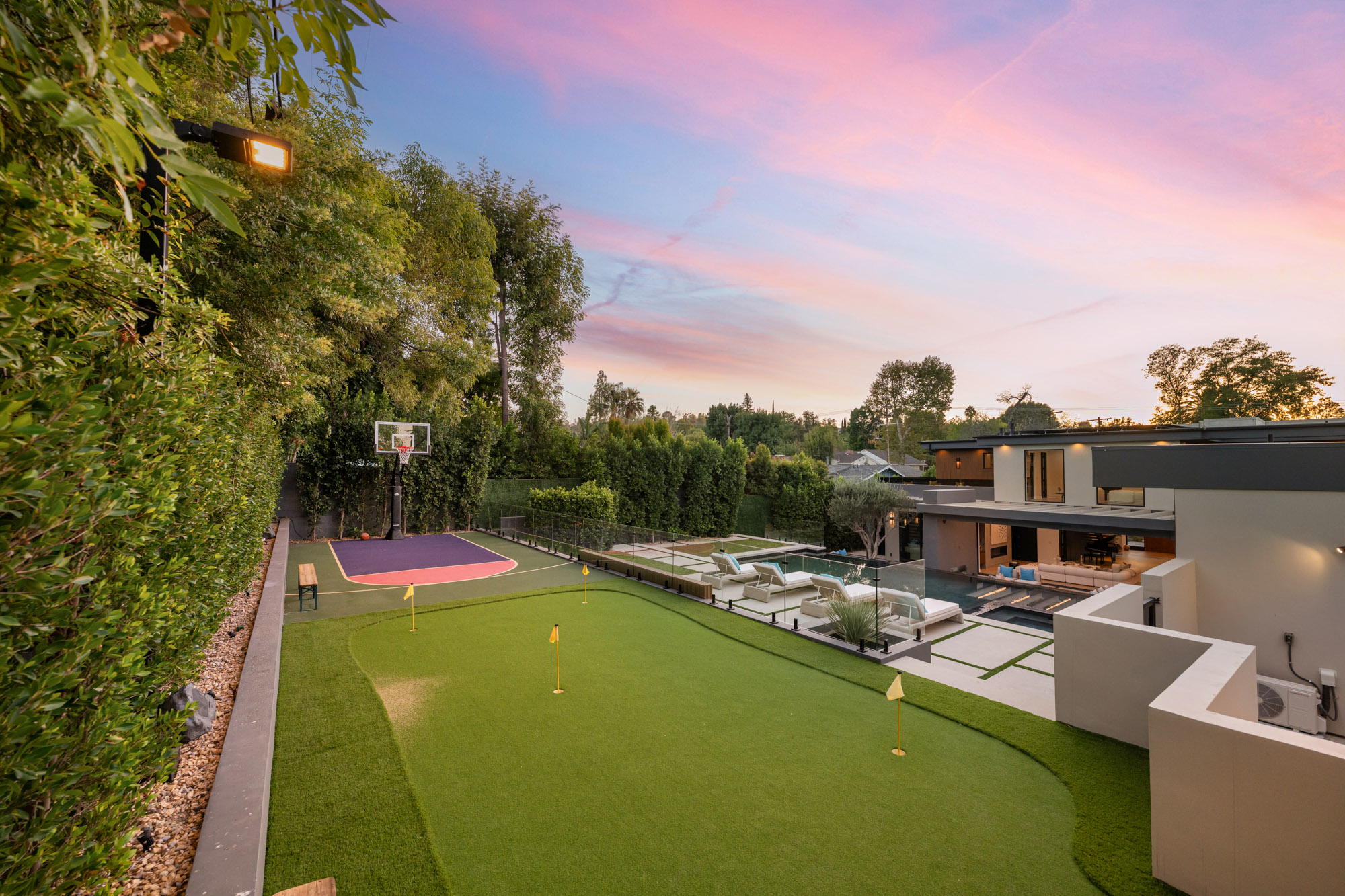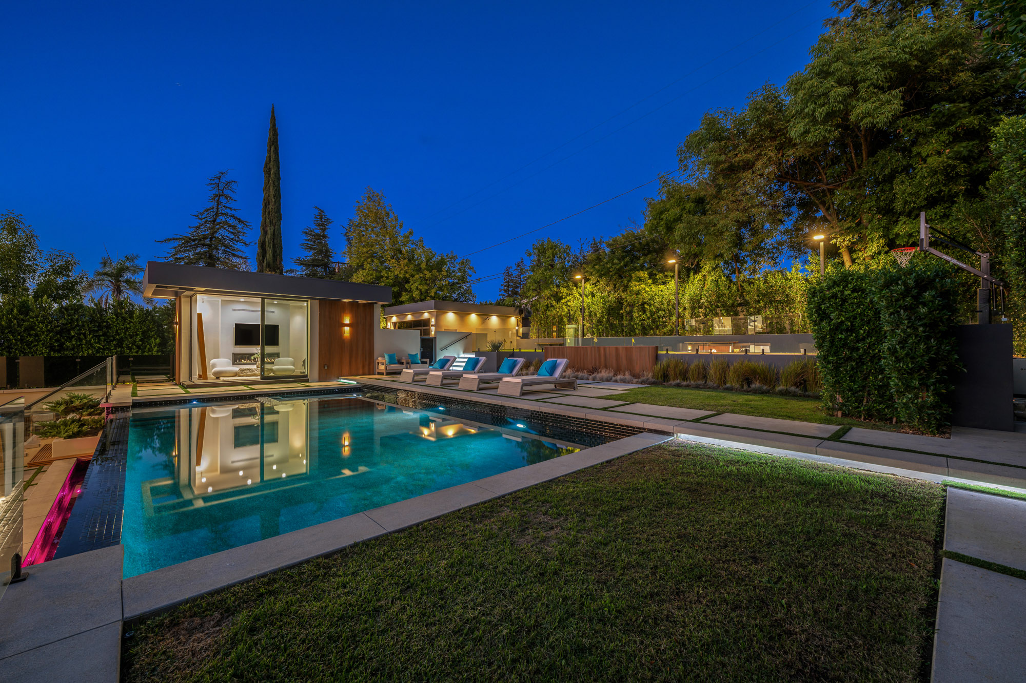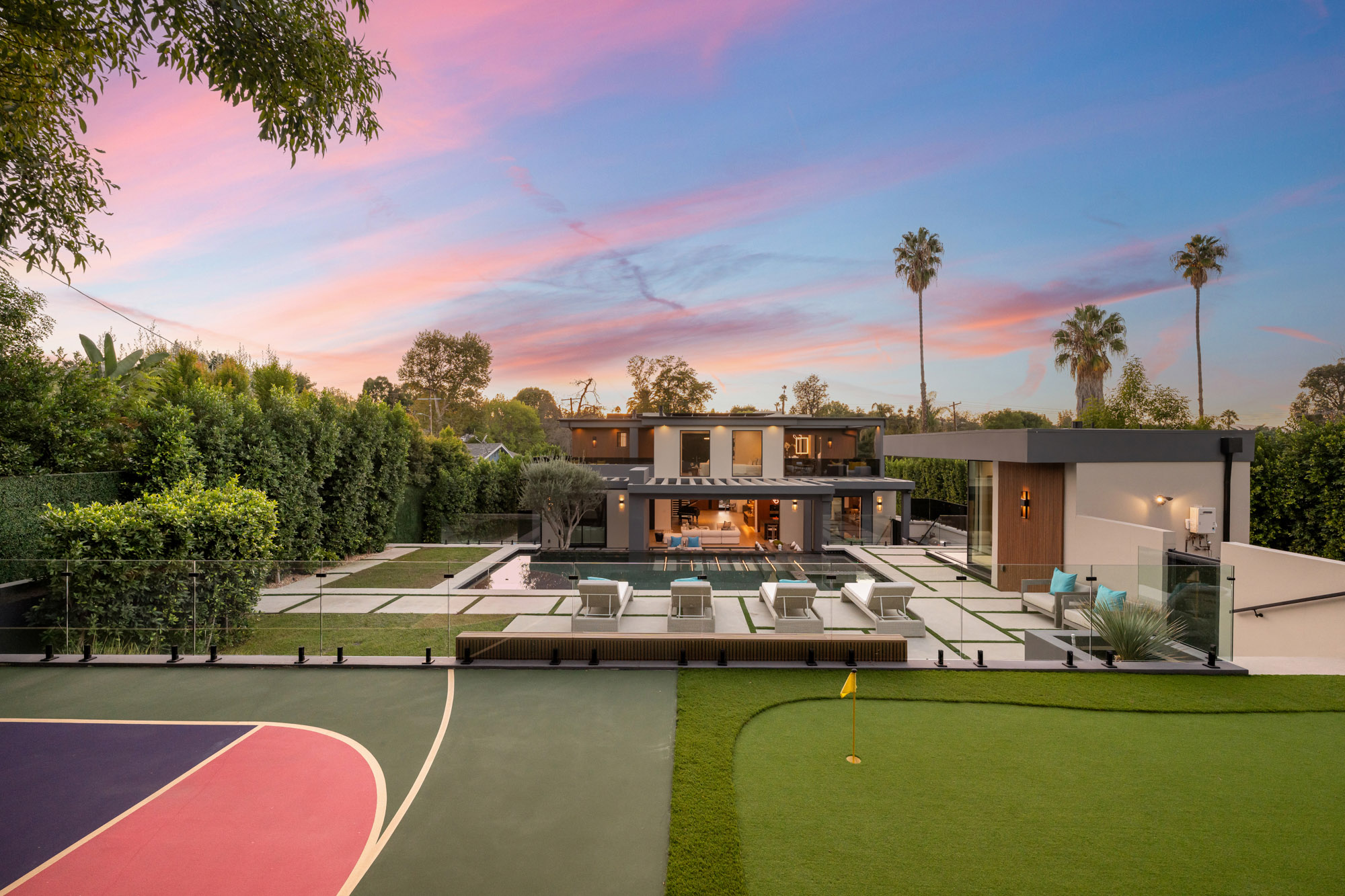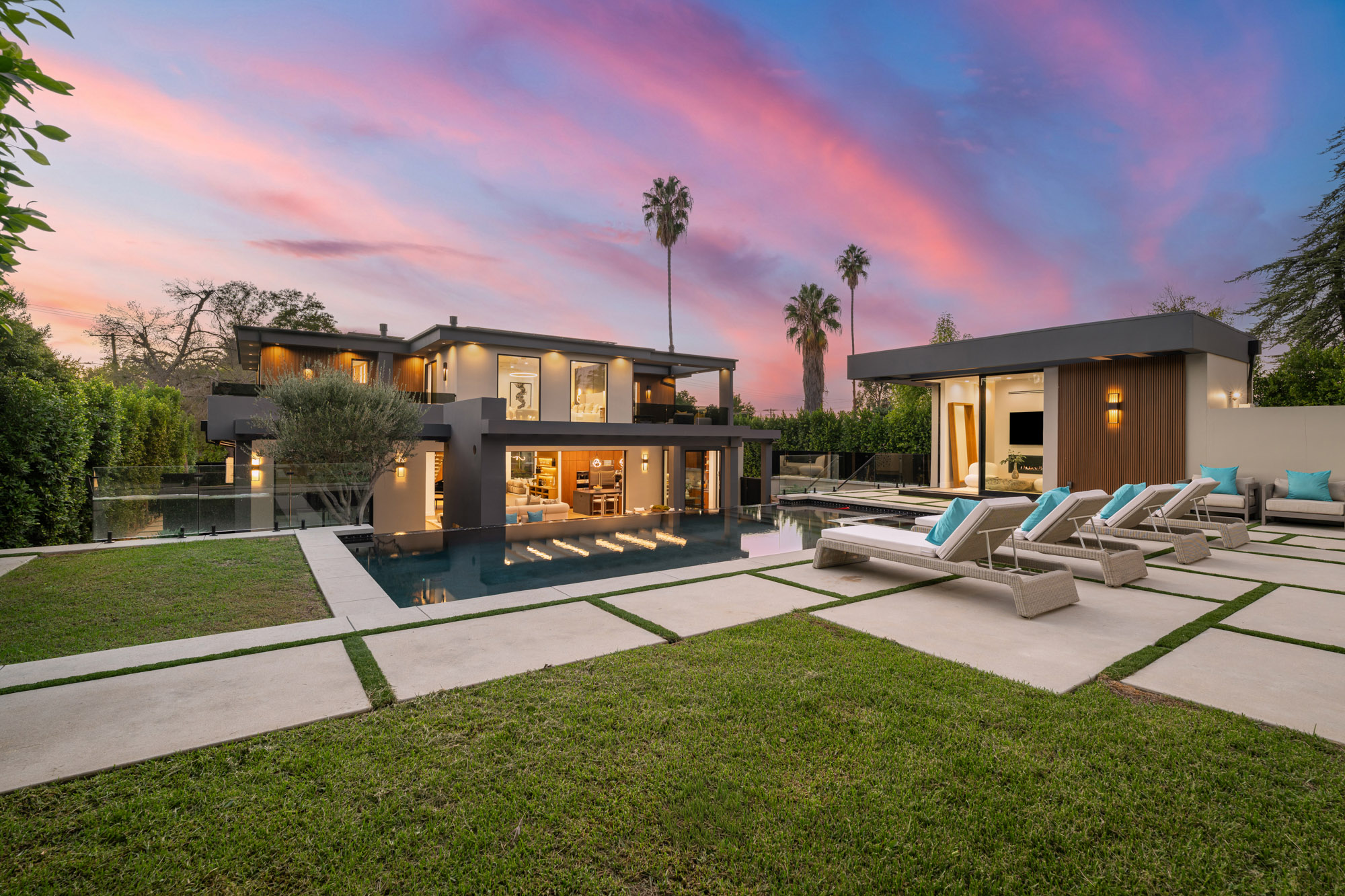 Stunning Private Estate South of the Boulevard located in one of the most desirable neighborhoods in Tarzana, this exceptional private gated estate offers the perfect blend of modern design and luxurious living. Set on beautifully landscaped grounds, the home boasts 5 bedrooms, 7 bathrooms, a study, a media room, and an array of high-end amenities that make it an entertainer's dream. The open floor plan creates a seamless flow between the living spaces, making it ideal for both intimate gatherings and large-scale entertaining. The chef’s kitchen is a culinary masterpiece, featuring Wolf and Sub-Zero appliances, a large center island, quartz countertops, a breakfast area, and a Miele coffee maker. The romantic primary suite serves as a serene retreat with a cozy fireplace, a spa-like bathroom, a large walk-in closet, and two private balconies. Additional highlights include 6 fireplaces throughout the home, a Crestron smart home system, Fleetwood pocket doors, integrated indoor and outdoor speaker systems, and security cameras. The exterior is just as impressive, with lush landscaping, a large reverse infinity pool and spa, a pool house, and a fully equipped outdoor kitchen with a 5-burner stove, BBQ, and beverage refrigerator. A covered patio with dual fireplaces is perfect for year-round entertaining and relaxation. For active pursuits, there’s a lighted sport court and a putting green, ensuring there’s something for everyone. Other standout features include a detached garage with ample parking space for luxury vehicles, RVs, and tour buses, as well as room for 10+ additional cars. The property is fully equipped with solar panels and underground utilities for enhanced sustainability. This home offers unparalleled privacy, comfort, and style, making it an ideal sanctuary for those seeking the ultimate in luxury living.