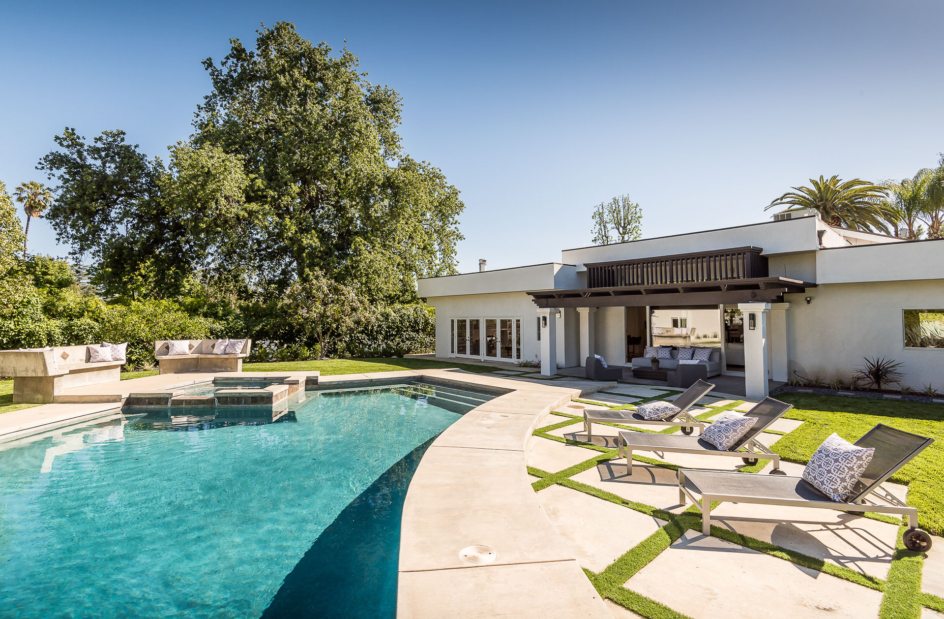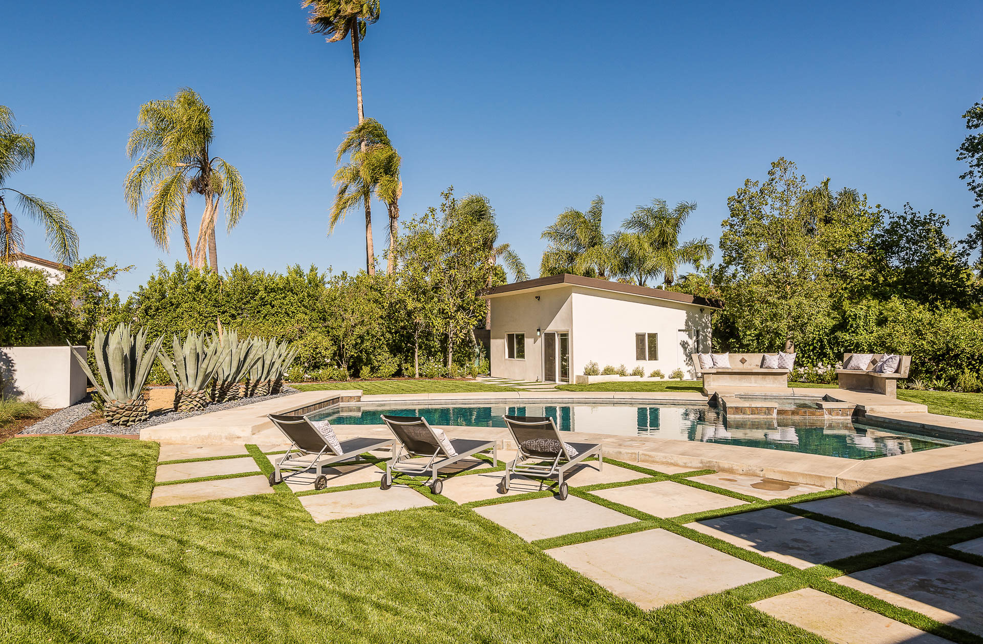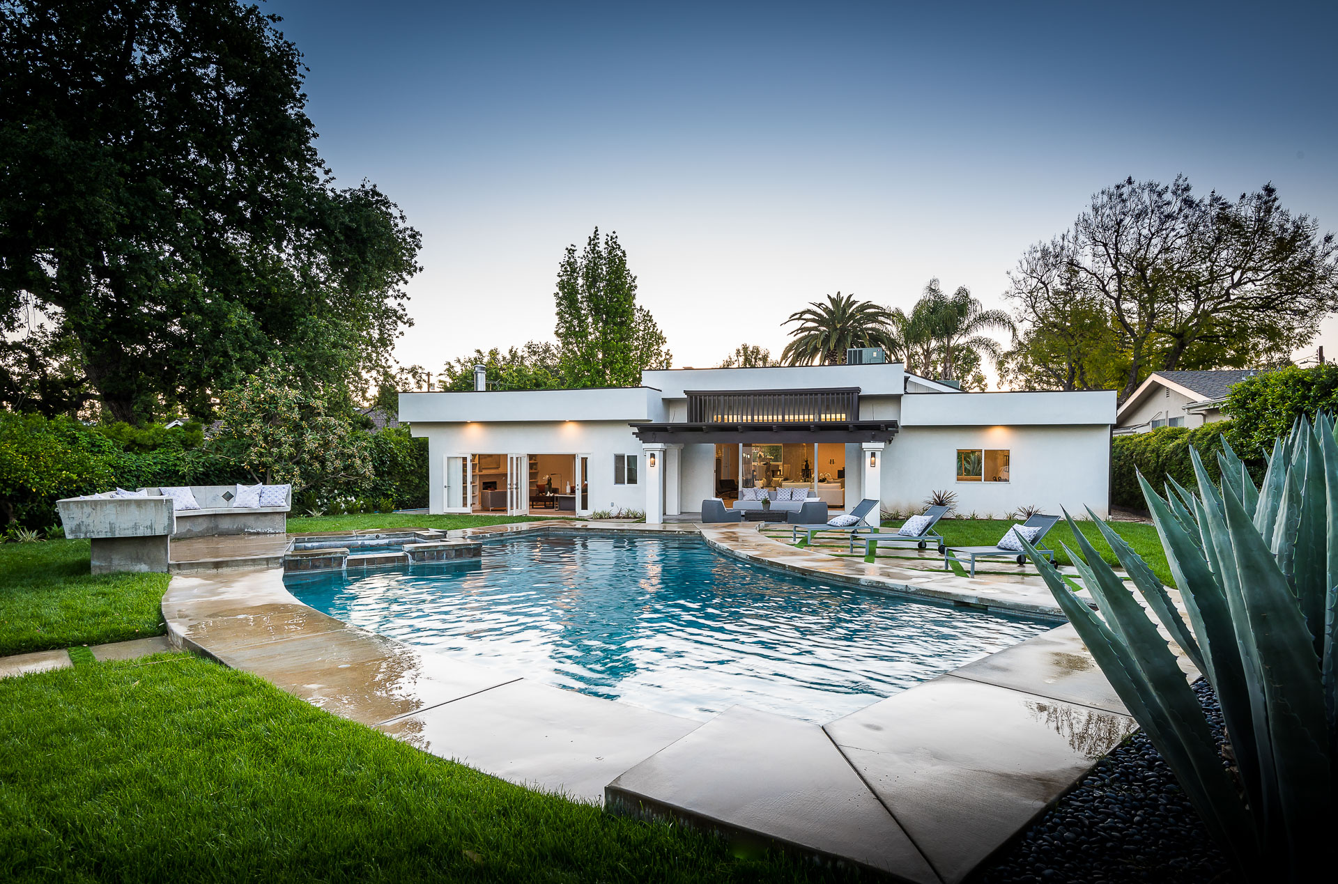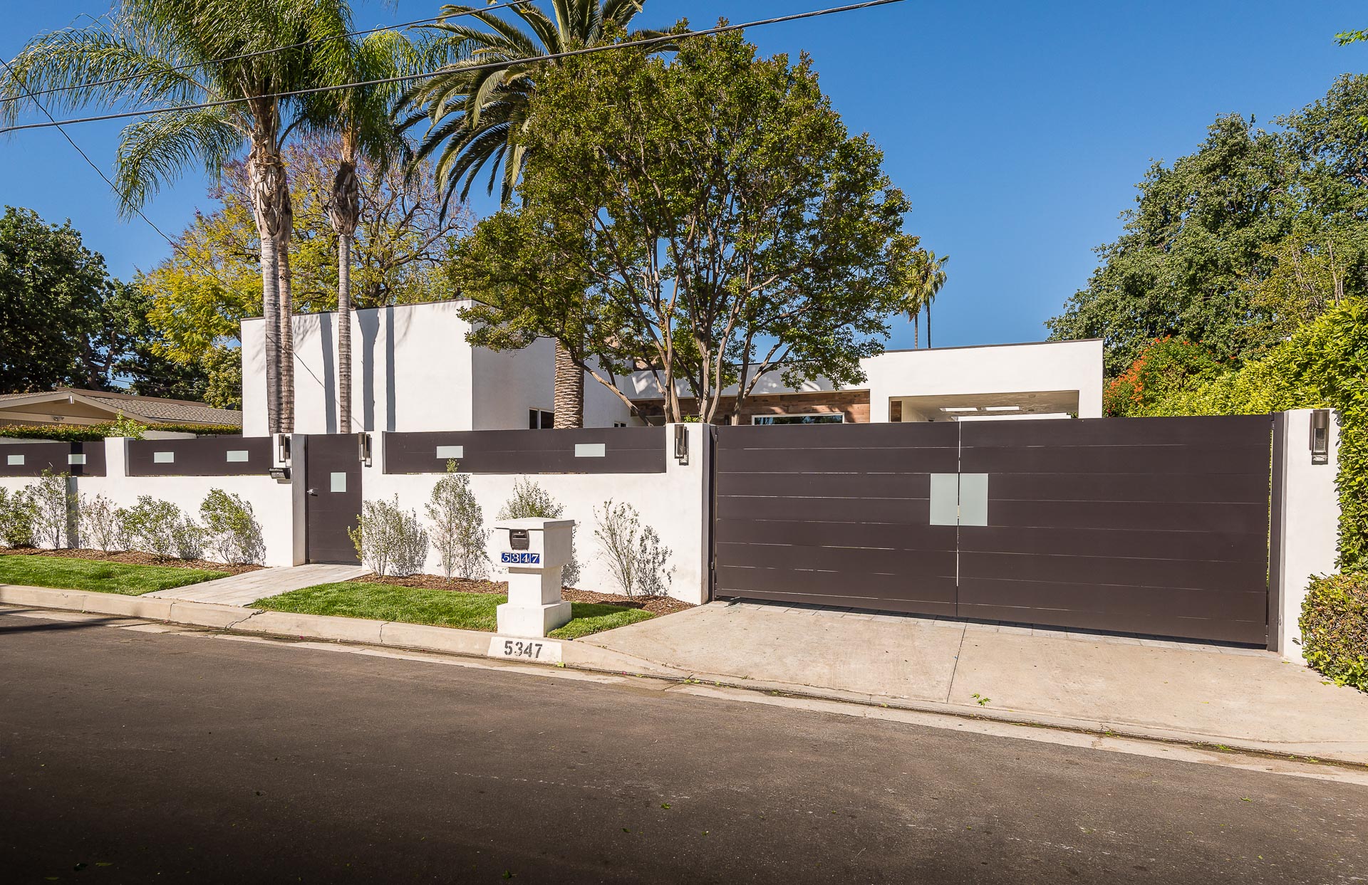 5347 Aldea is modern luxury at it’s best! This sprawling one level 5 bedroom, 5 ½ bath property is distinctly designed and fitting for the “Modern Entertainer” who enjoys style and class w/ the exclusivity of living in Amestoy Estates. The stylish front gates open up to an exquisite palm tree entrance into this magnificent oasis. Immediately you are captivated by the expansive formal living room, light hardwood floors, designer fireplace, a full 8-seater bar area; step down living room and floor to ceiling windows showcasing a sleek pool & spa.The bedrooms and bathrooms are elegantly designed while the kitchen is crafted with a Carerra marble island countertops, large windows & Thermador branded appliances. The backyard is surrounded by manicured bushes highlighted by 5 perfectly landscaped aloe-vera trees adding to the resort feel, a built in sitting area, an open-air patio, & a detached 400 square foot pool house w/ bathroom.