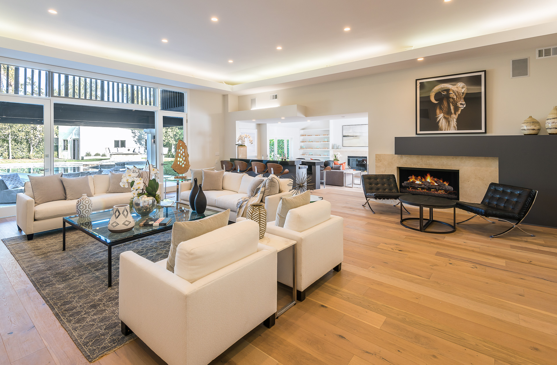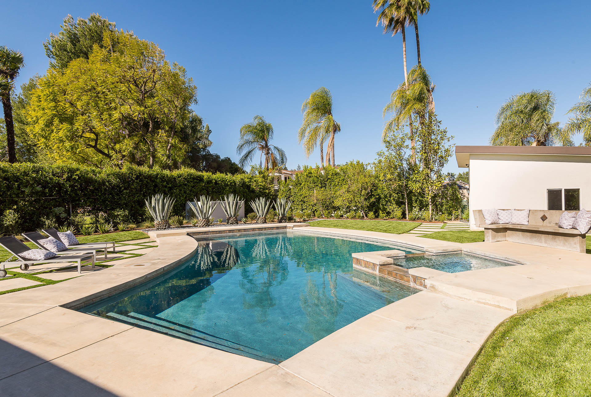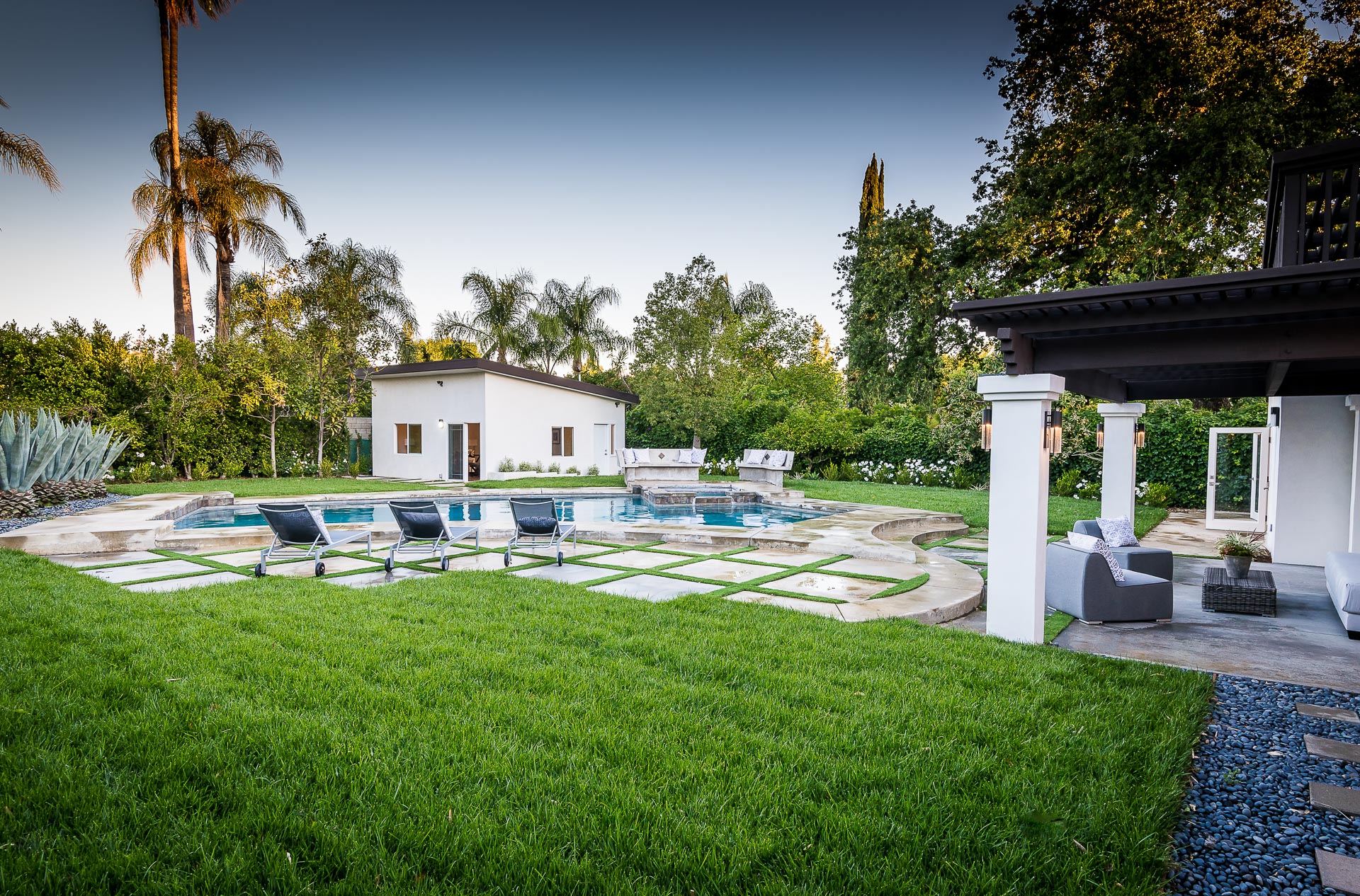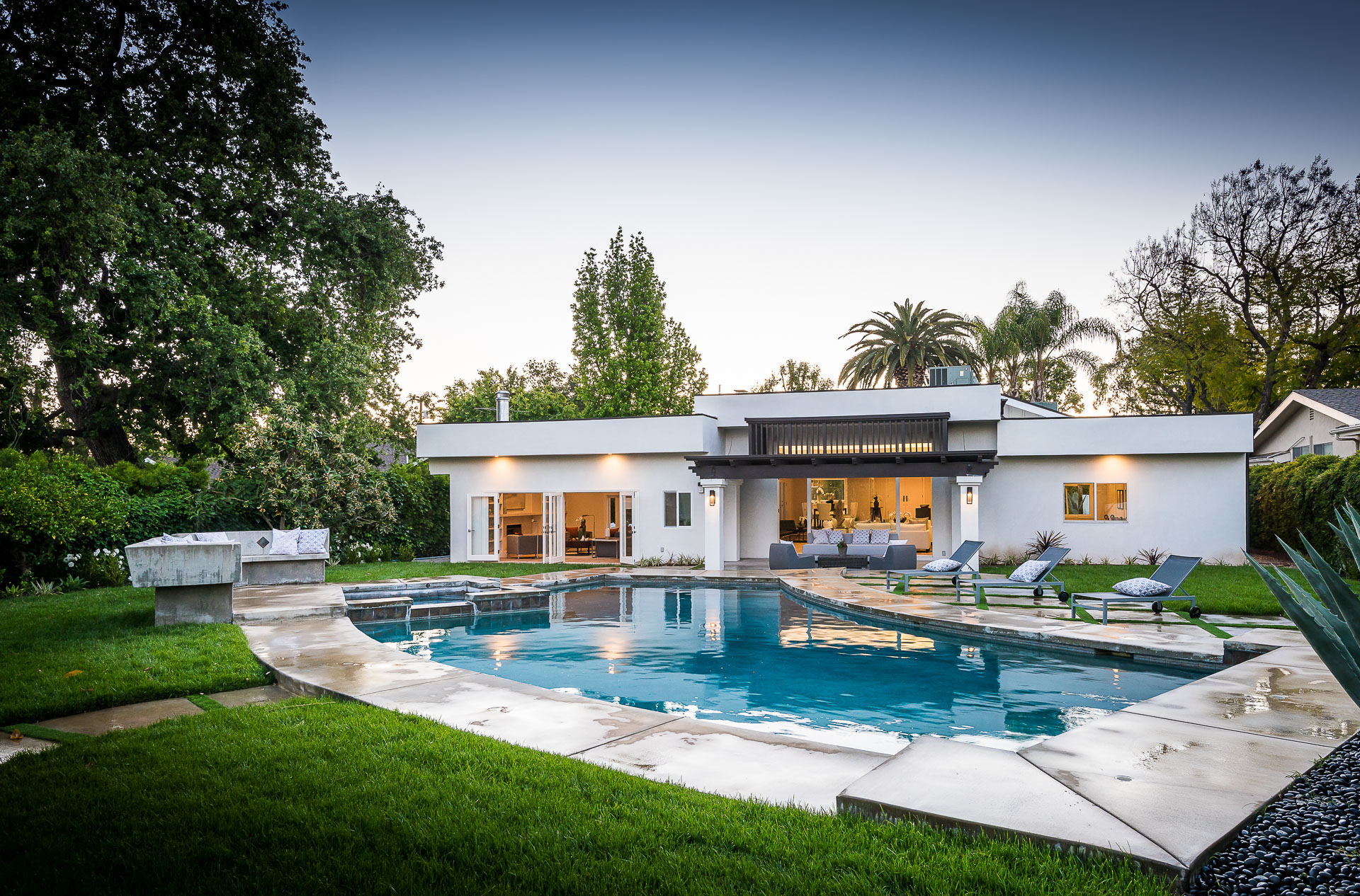 5347 Aldea is modern luxury at it’s best! This sprawling one level 5 bedroom, 5 ½ bath property is distinctly designed and fitting for the “Modern Entertainer” who enjoys style and class w/ the exclusivity of living in Amestoy Estates. The stylish front gates open up to an exquisite palm tree entrance into this magnificent oasis. Immediately you are captivated by the expansive formal living room, light hardwood floors, designer fireplace, a full 8-seater bar area; step down living room and floor to ceiling windows showcasing a sleek pool & spa.The bedrooms and bathrooms are elegantly designed while the kitchen is crafted with a Carerra marble island countertops, large windows & Thermador branded appliances. The backyard is surrounded by manicured bushes highlighted by 5 perfectly landscaped aloe-vera trees adding to the resort feel, a built in sitting area, an open-air patio, & a detached 400 square foot pool house w/ bathroom.