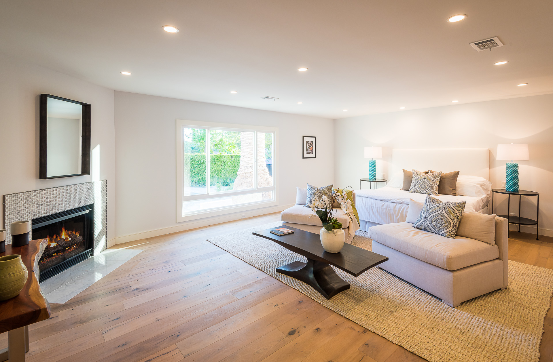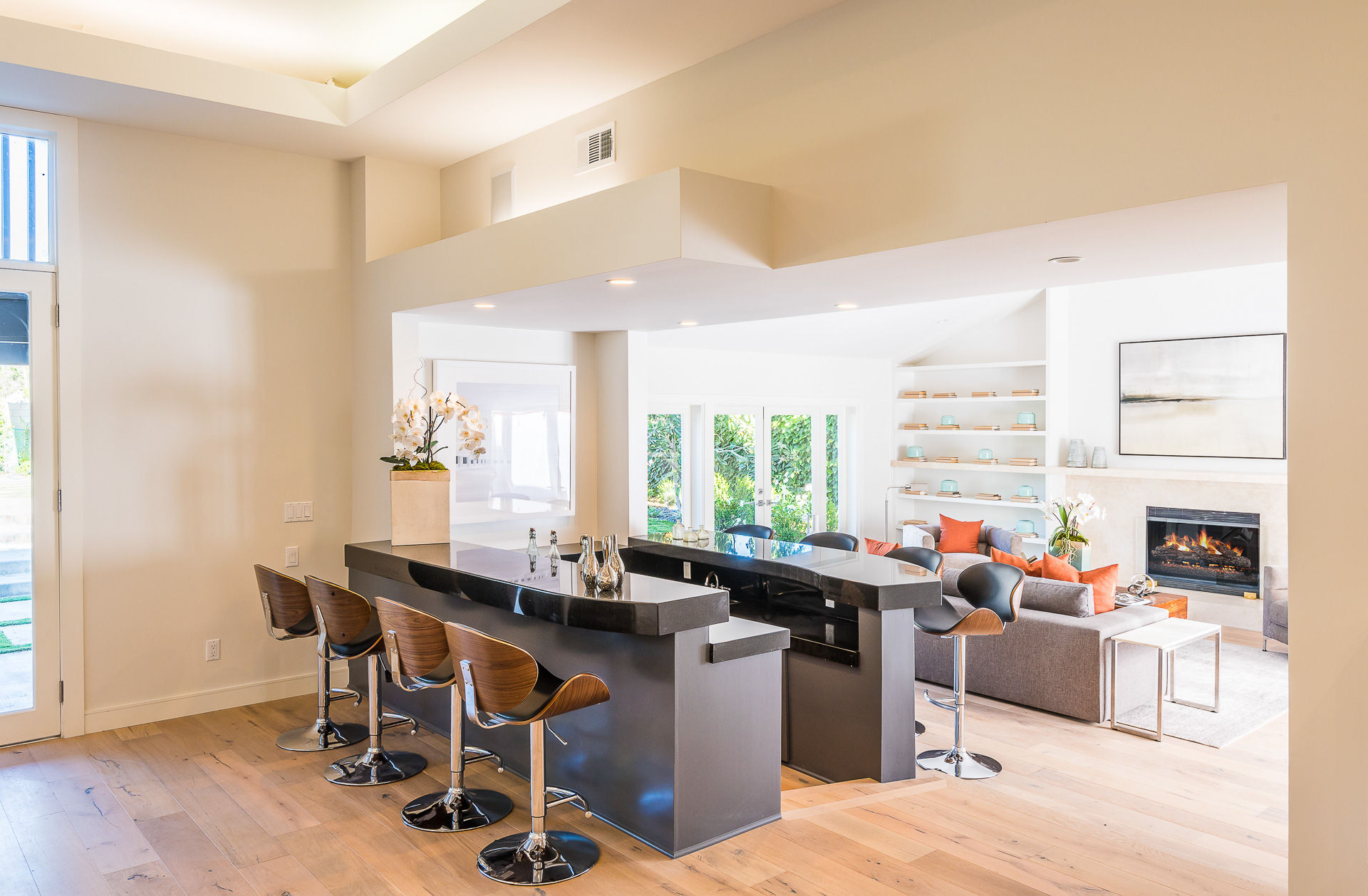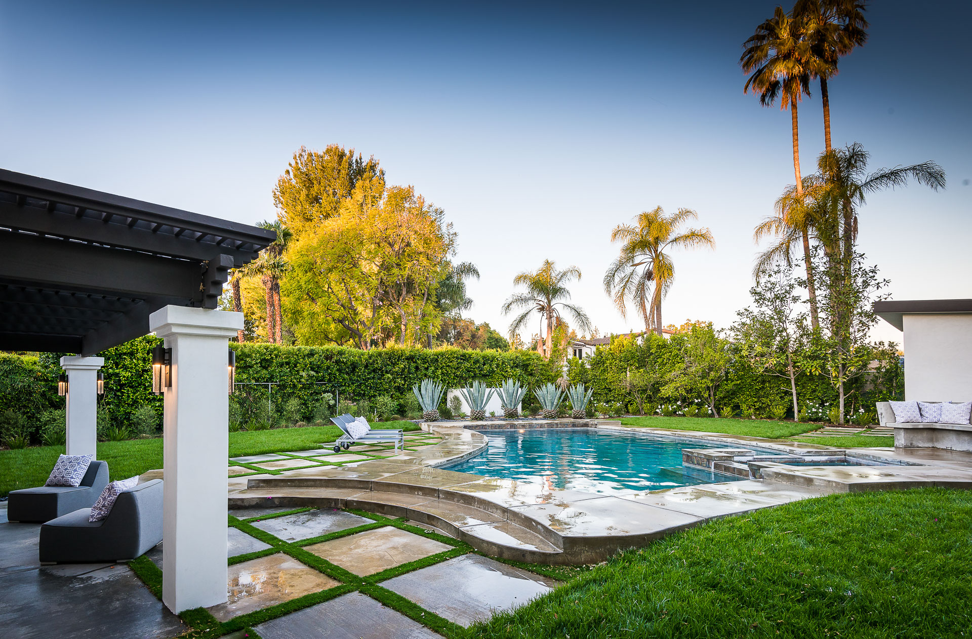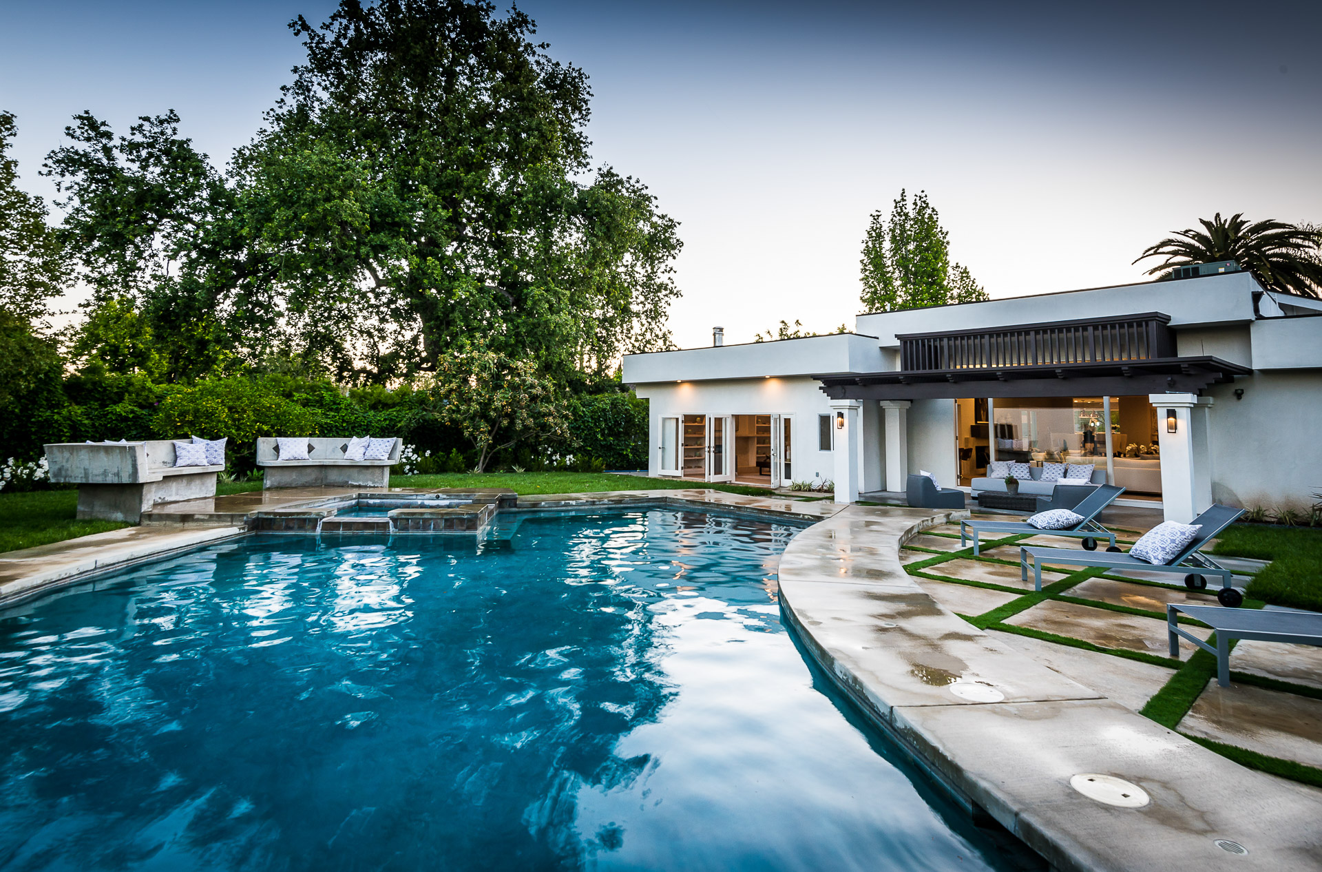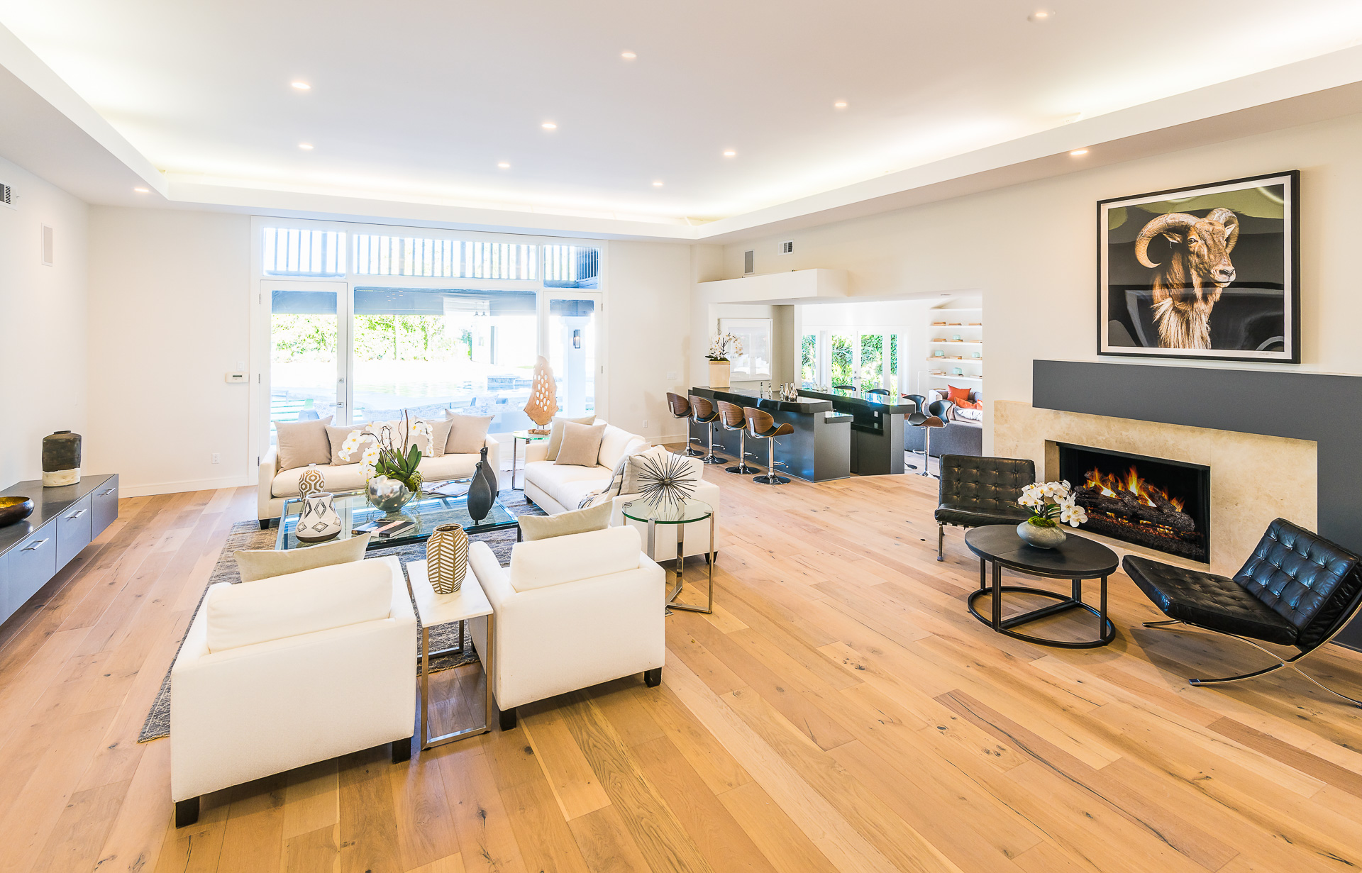 5347 Aldea is modern luxury at it’s best! This sprawling one level 5 bedroom, 5 ½ bath property is distinctly designed and fitting for the “Modern Entertainer” who enjoys style and class w/ the exclusivity of living in Amestoy Estates. The stylish front gates open up to an exquisite palm tree entrance into this magnificent oasis. Immediately you are captivated by the expansive formal living room, light hardwood floors, designer fireplace, a full 8-seater bar area; step down living room and floor to ceiling windows showcasing a sleek pool & spa.The bedrooms and bathrooms are elegantly designed while the kitchen is crafted with a Carerra marble island countertops, large windows & Thermador branded appliances. The backyard is surrounded by manicured bushes highlighted by 5 perfectly landscaped aloe-vera trees adding to the resort feel, a built in sitting area, an open-air patio, & a detached 400 square foot pool house w/ bathroom.