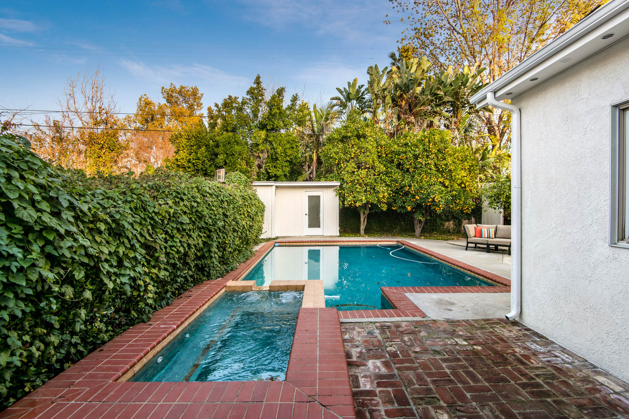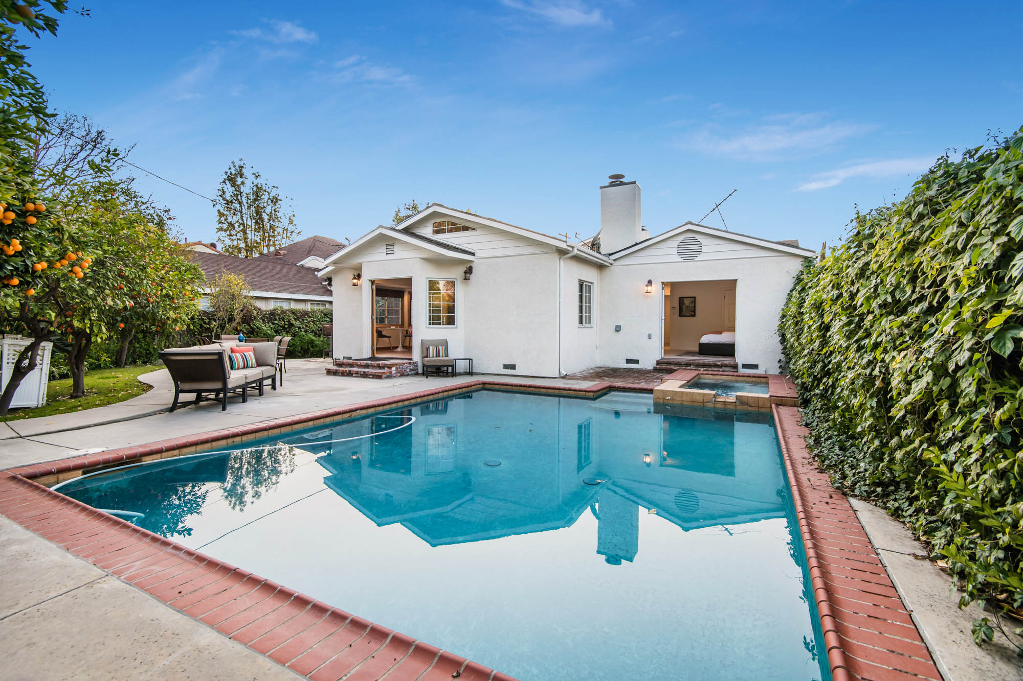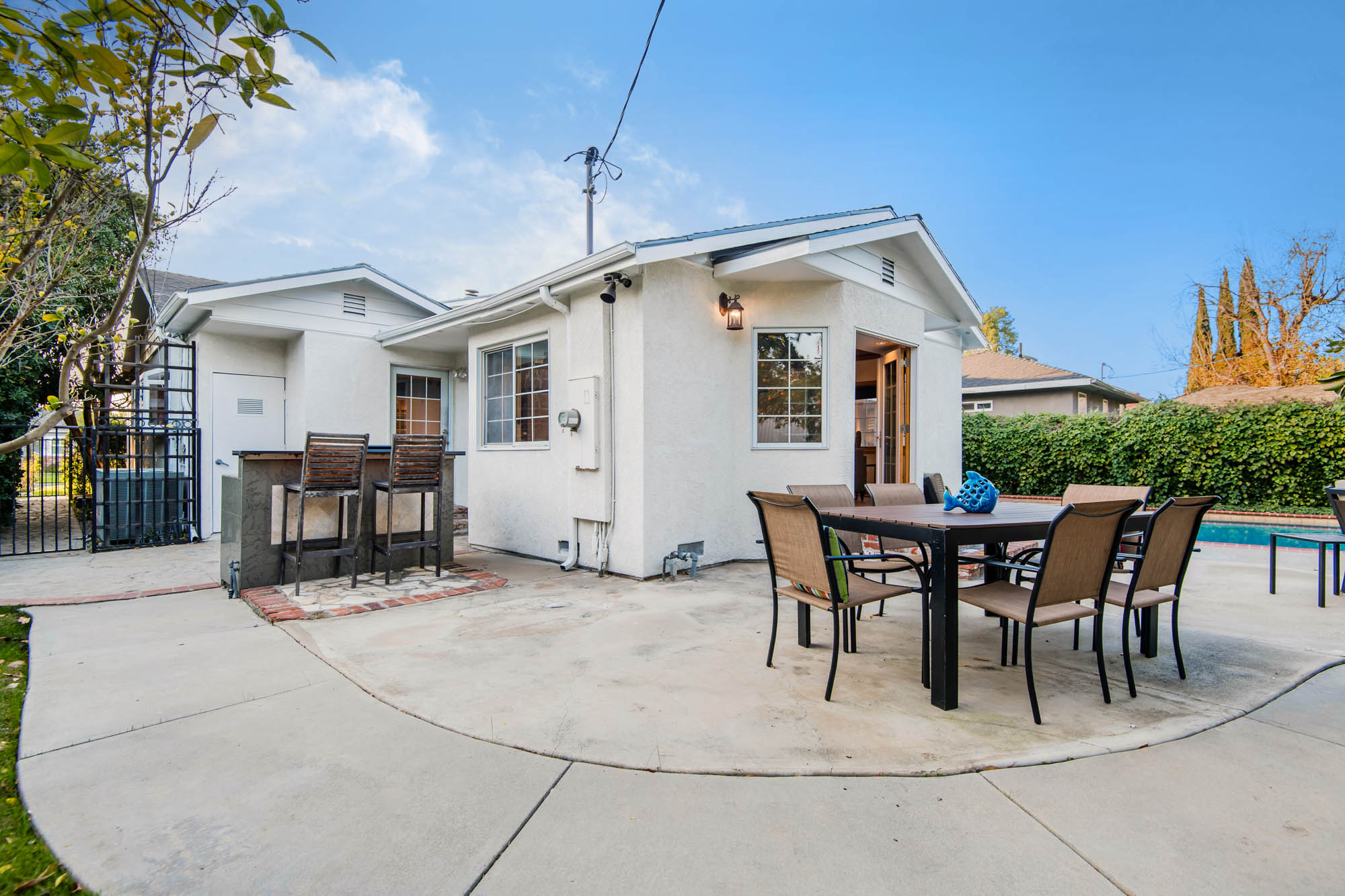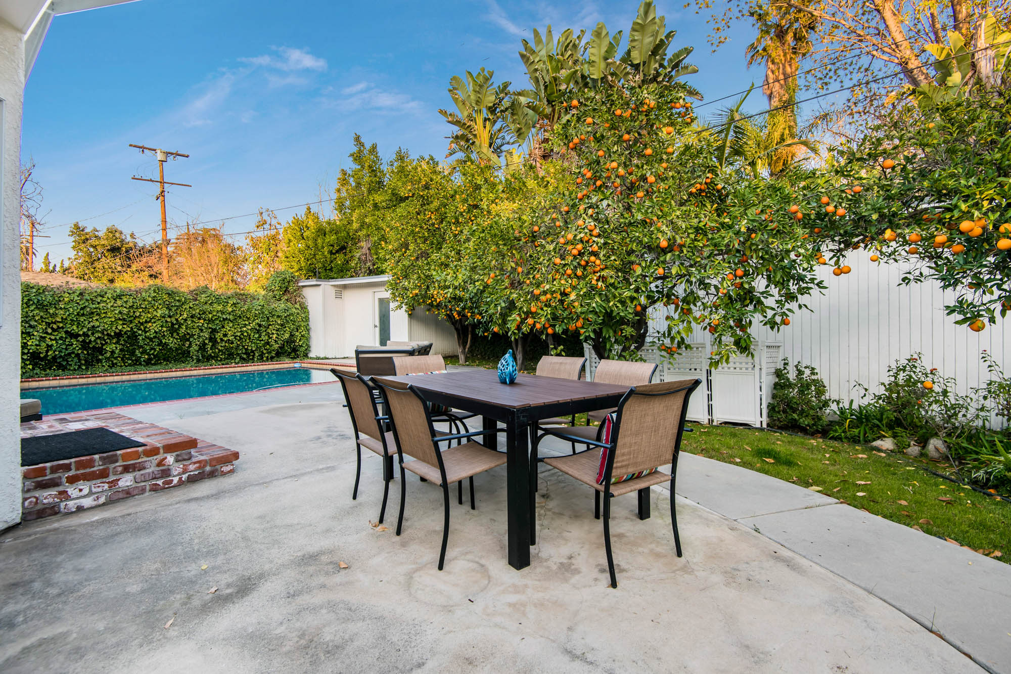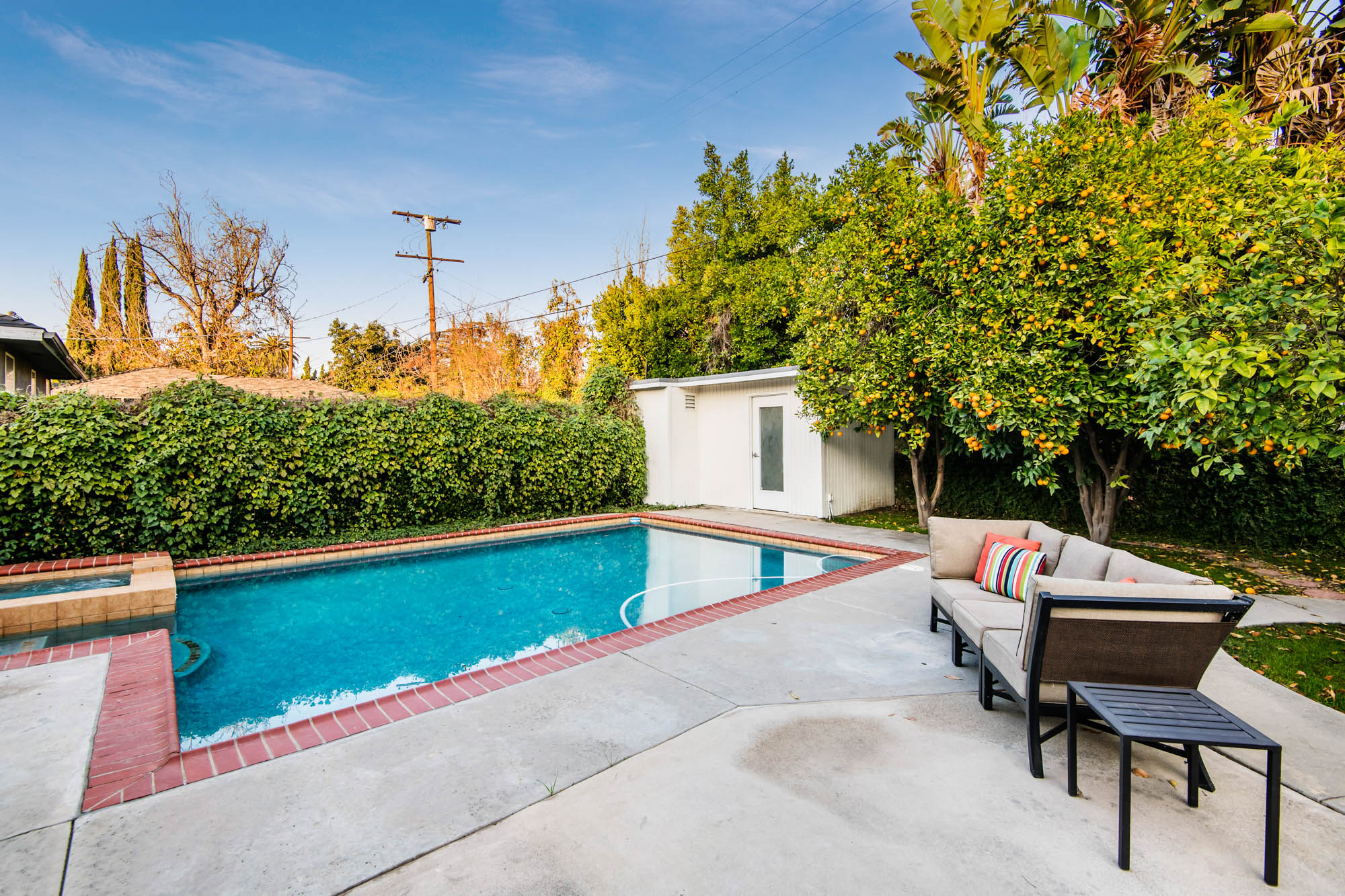 Welcome home to your 4 bedroom, 3 bathroom house in Valley Glen. Upon entering you’re greeted by a formal living room with floor to ceiling built-ins surrounding the stone fireplace. High ceilings and custom window treatments bring in an abundance of natural light. Down the hall from the living room, you’ll pass the first bedroom, bathroom, and enter into your spacious kitchen. With plenty of cabinetry, a pantry, and a large center island, this kitchen is perfect for all of your meal preparations. Off of the kitchen is the large family room. Beamed ceilings, windows, and french doors to the backyard make this a great open space for entertaining. The high ceilings continue into the formal dining room which also features a skylight and french doors. The master suite encompasses his and hers closets, a fireplace, and a private bathroom with a walk in shower. French doors in your master suite open to the backyard and provide amazing morning views of the pool. The home is complete with two more bedrooms and an additional bathroom. The backyard is a great place to gather friends and family for celebrations by the pool. A large patio with a built-in bbq completes the outdoor living experience. Two detached structures in the backyard provide extra storage and could be transformed into an office or hang out space. Additional features include mature fruit trees, control over the pool and spa from your phone or tablet, two car garage, and side by side washer and dryer.