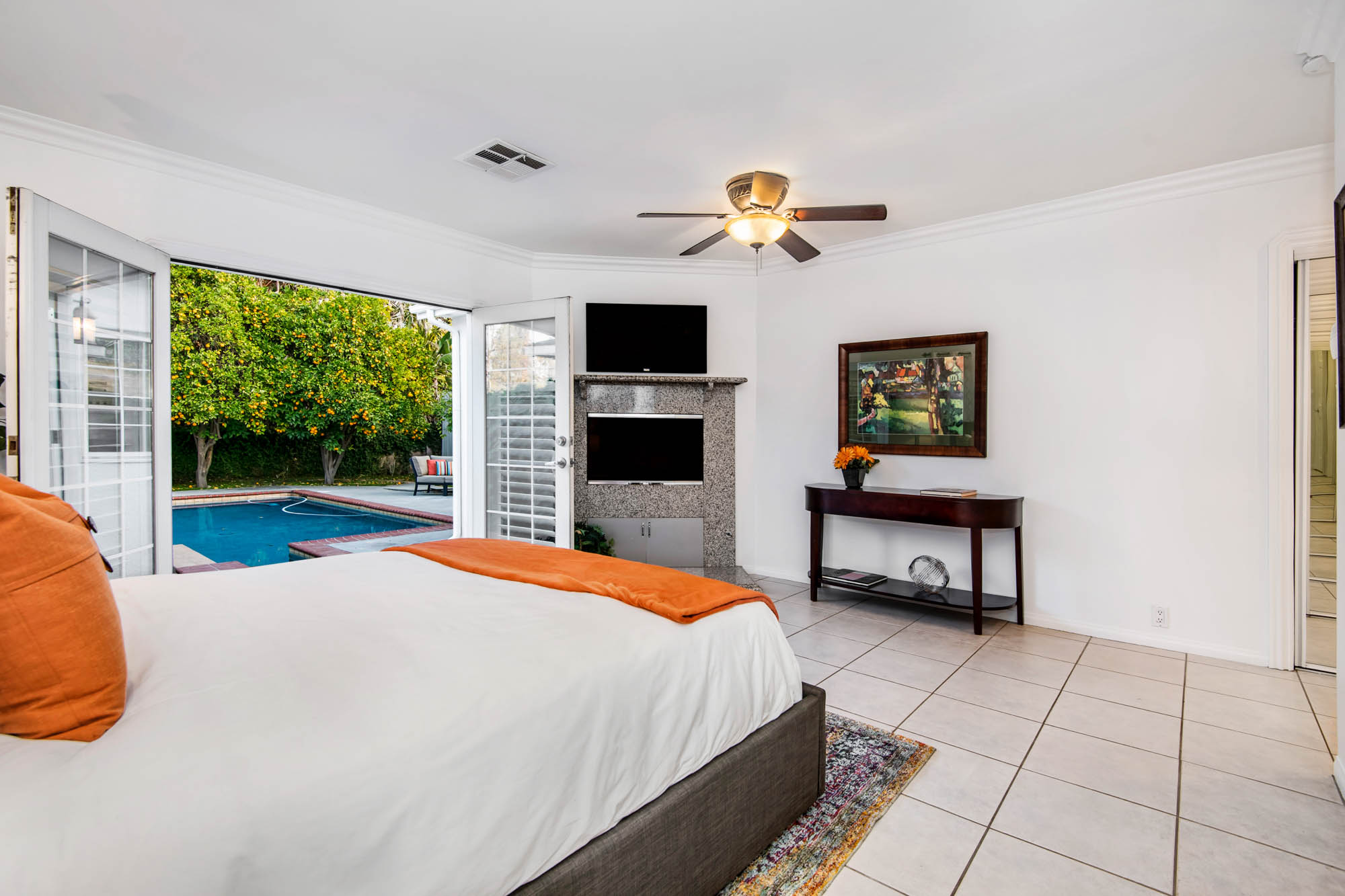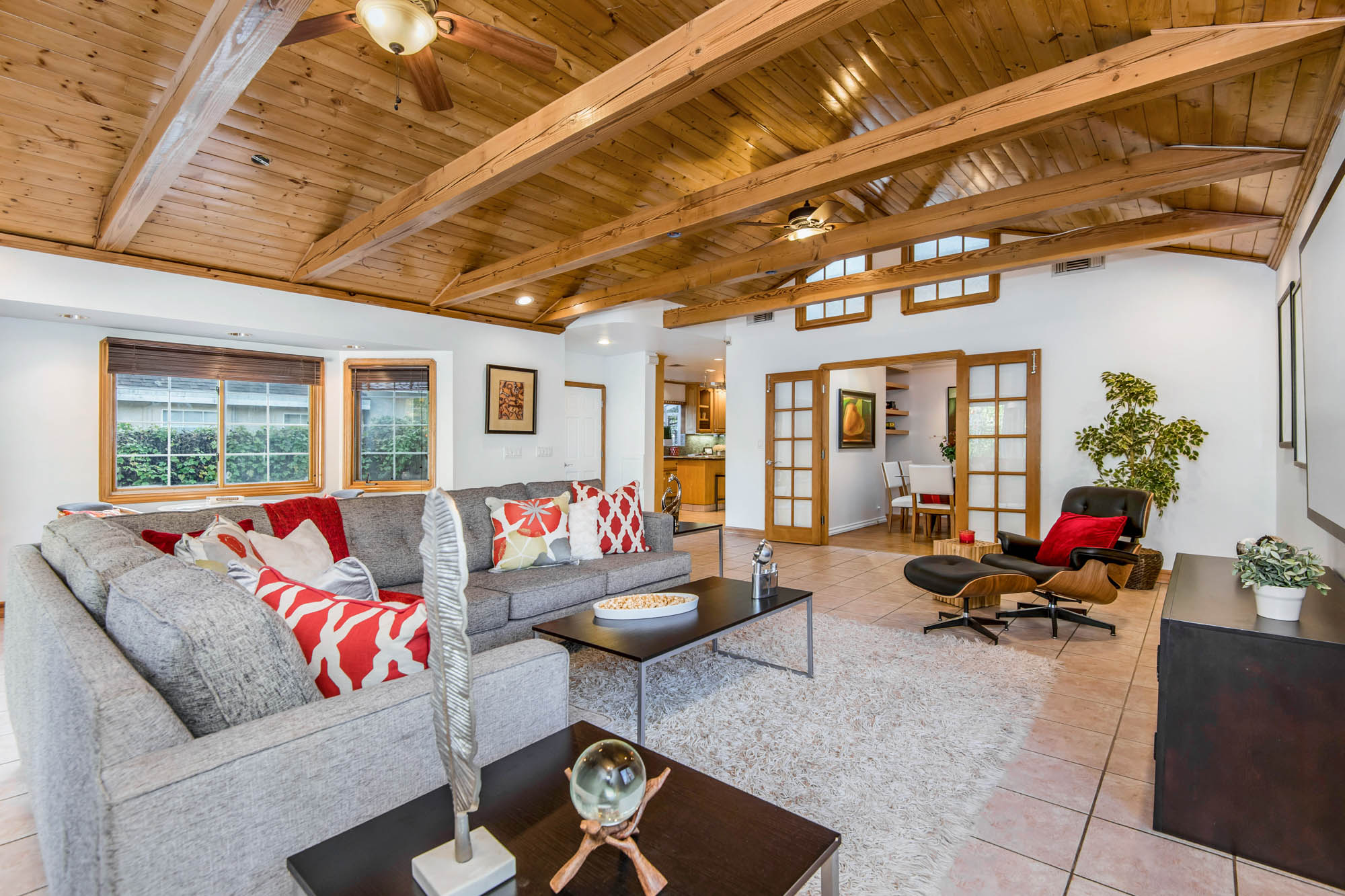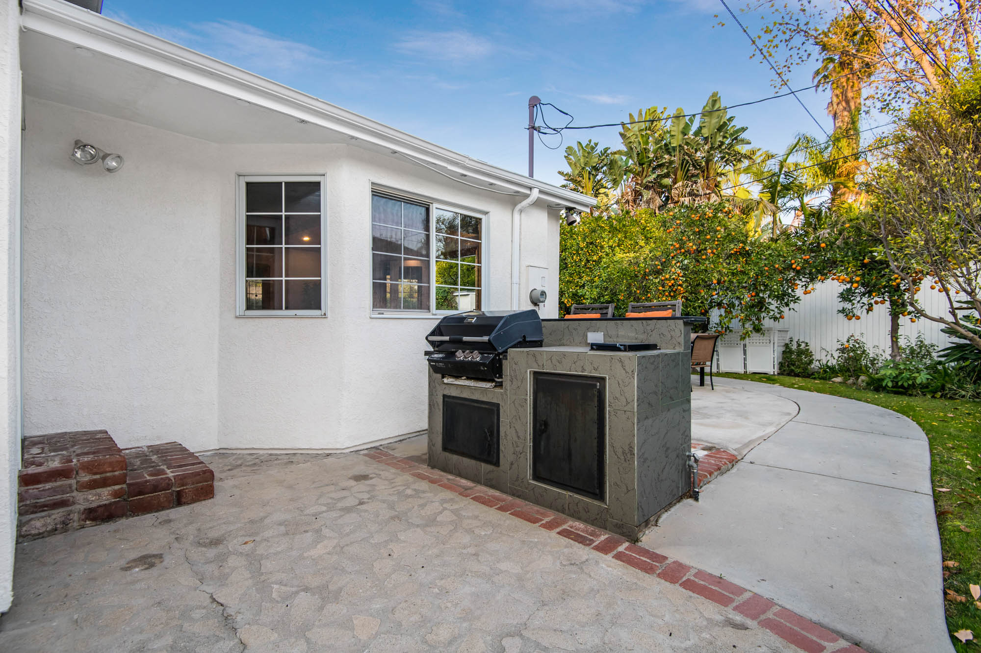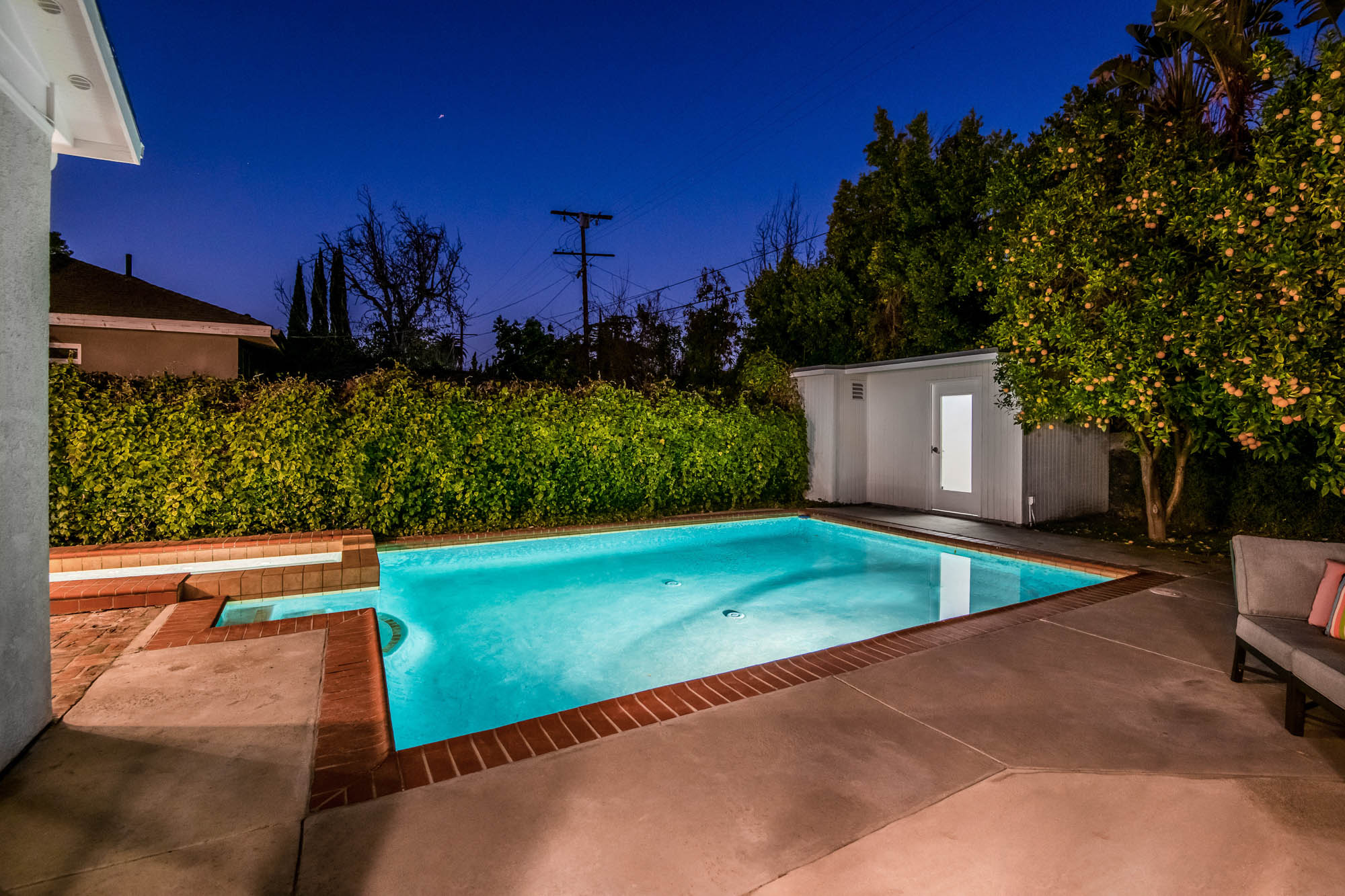 Welcome home to your 4 bedroom, 3 bathroom house in Valley Glen. Upon entering you’re greeted by a formal living room with floor to ceiling built-ins surrounding the stone fireplace. High ceilings and custom window treatments bring in an abundance of natural light. Down the hall from the living room, you’ll pass the first bedroom, bathroom, and enter into your spacious kitchen. With plenty of cabinetry, a pantry, and a large center island, this kitchen is perfect for all of your meal preparations. Off of the kitchen is the large family room. Beamed ceilings, windows, and french doors to the backyard make this a great open space for entertaining. The high ceilings continue into the formal dining room which also features a skylight and french doors. The master suite encompasses his and hers closets, a fireplace, and a private bathroom with a walk in shower. French doors in your master suite open to the backyard and provide amazing morning views of the pool. The home is complete with two more bedrooms and an additional bathroom. The backyard is a great place to gather friends and family for celebrations by the pool. A large patio with a built-in bbq completes the outdoor living experience. Two detached structures in the backyard provide extra storage and could be transformed into an office or hang out space. Additional features include mature fruit trees, control over the pool and spa from your phone or tablet, two car garage, and side by side washer and dryer.